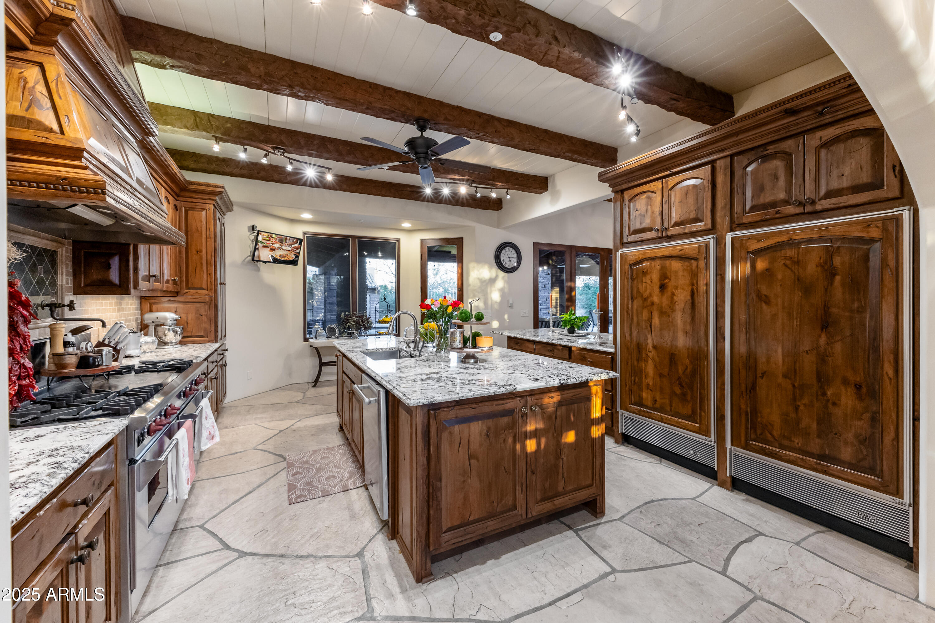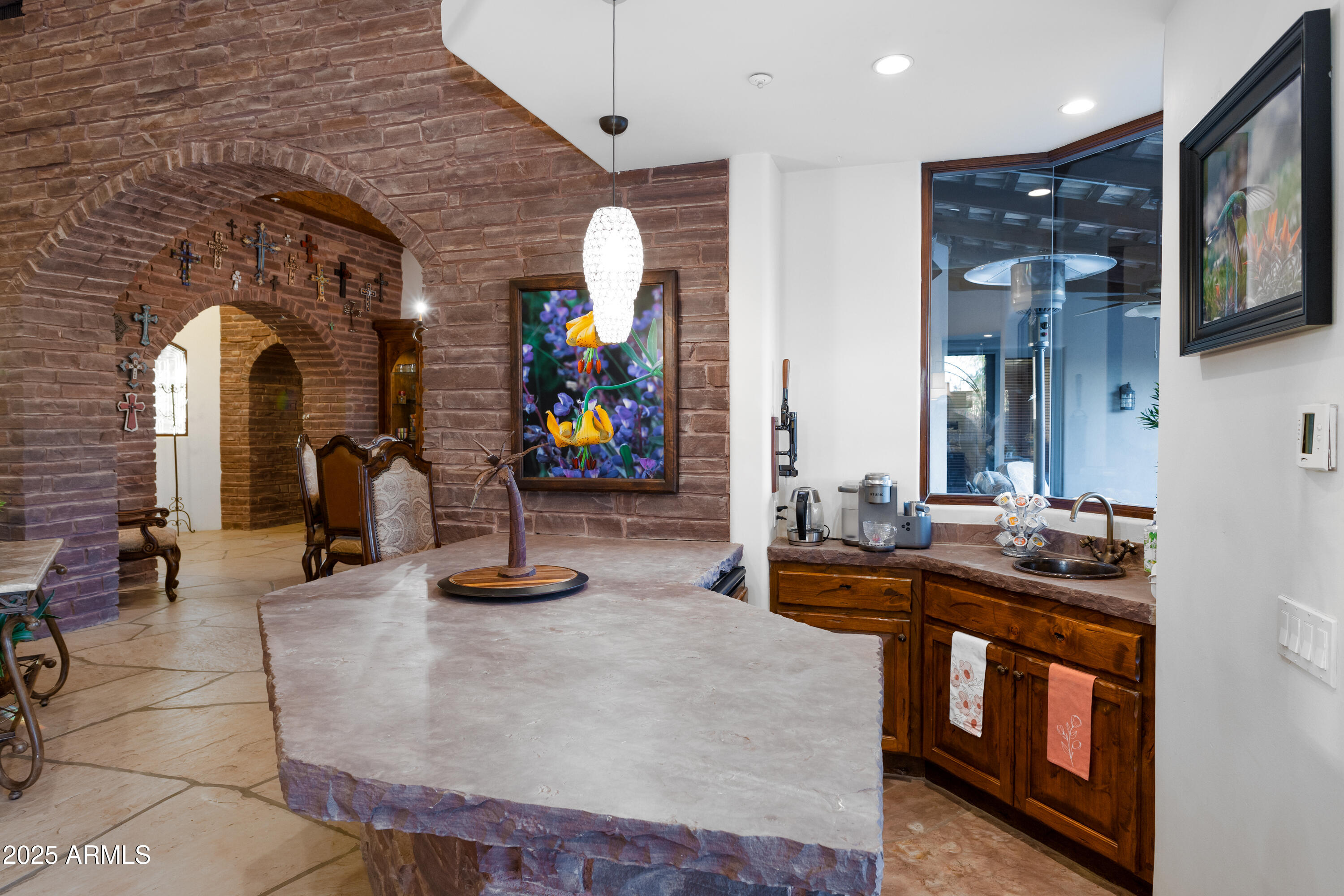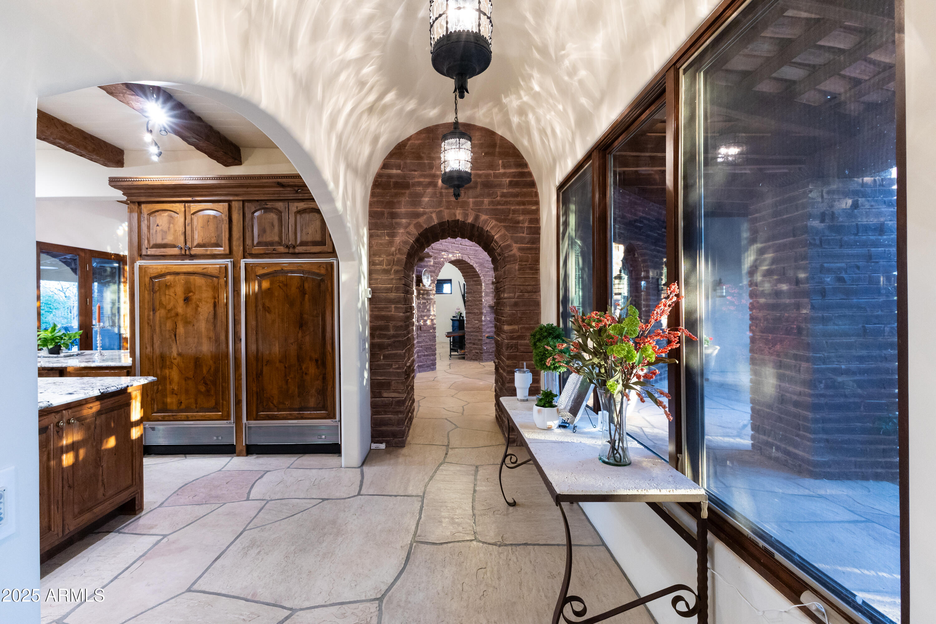 Set on over 1.5 acres of peaceful Sonoran beauty, this custom-built home blends authentic brickwork, rich wood beams, and graceful architectural arches to create a feeling of warmth the moment you arrive. Every space tells a story -- from the inviting great room that opens to the covered patio, to the resort-style backyard that glows under string lights and sunset skies.