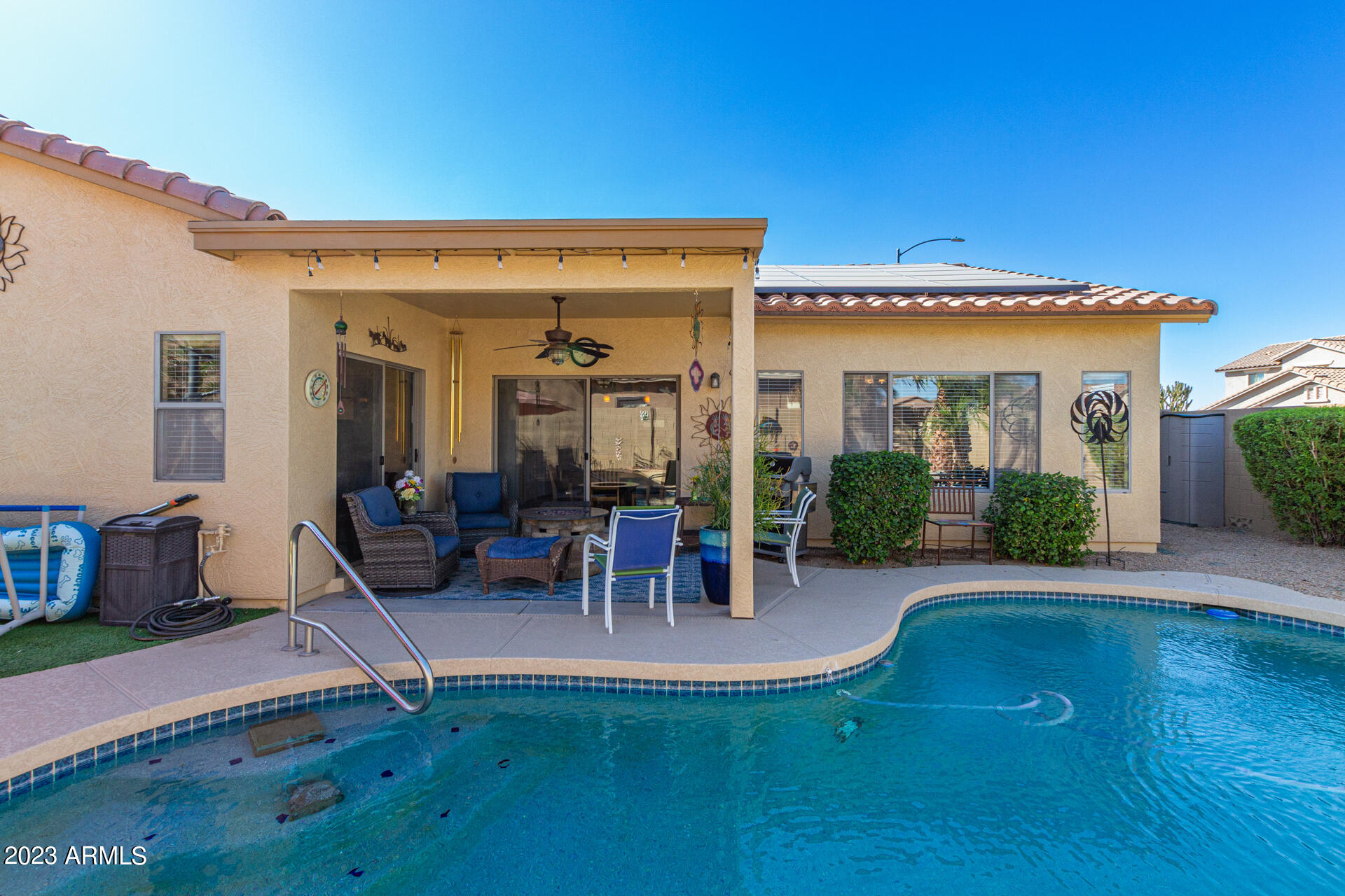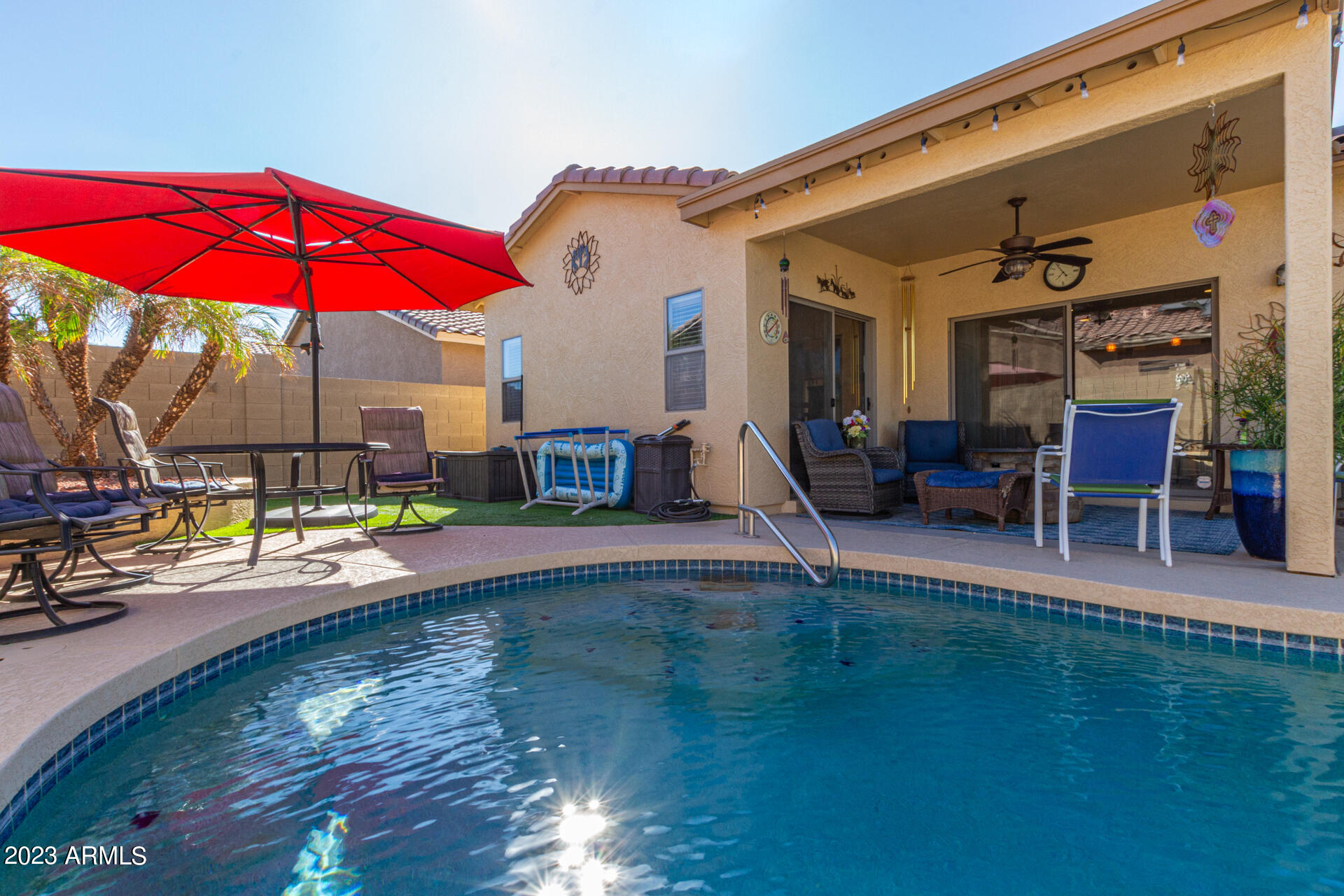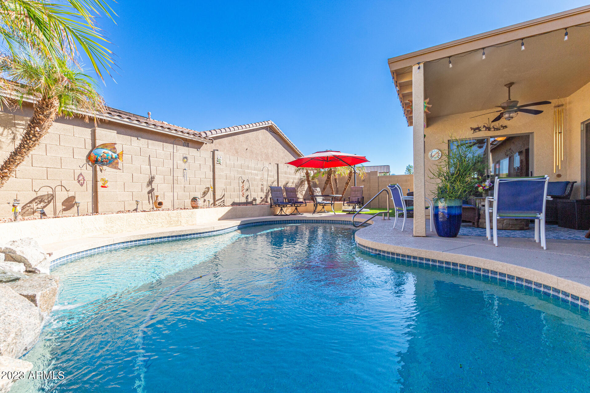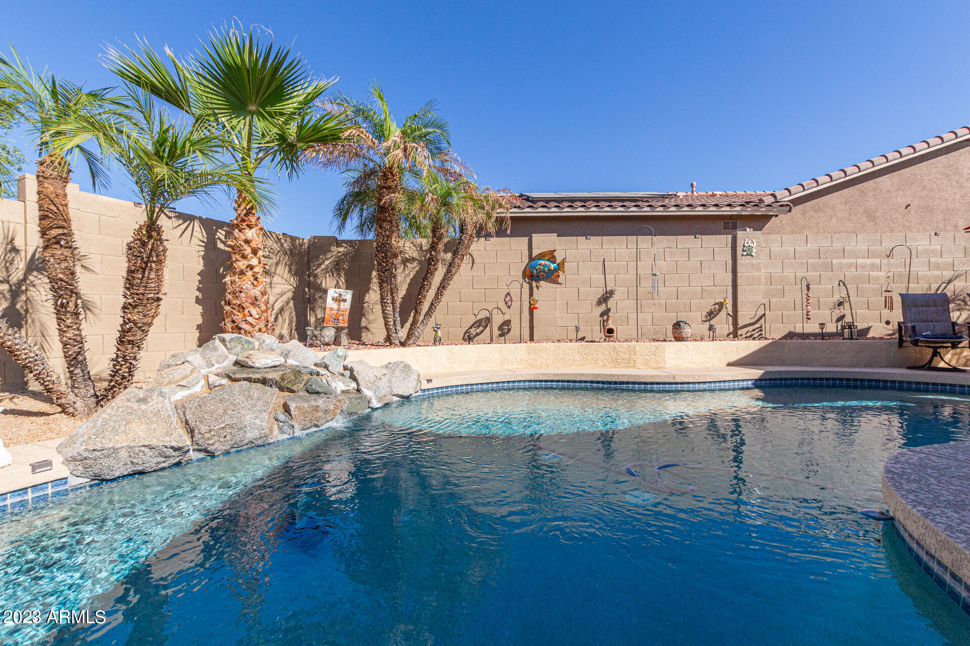 Located on a serene corner lot, this stunning home overlooks a park-like common space. Inside, the residence showcases extensive diagonal-set ceramic tile floors, a spacious open-concept kitchen with a breakfast bar highlighted by recessed and accent lighting, and a formal dining space. The primary bedroom offers direct access to the pool area. Benefit from a generously-sized laundry room equipped with upgraded storage solutions. The backyard is a haven of relaxation, with shaded patio and a pristine pool crowned with a sparkling rock waterfall. Additionally, the home provides ample parking and storage in a spacious 3-car garage.