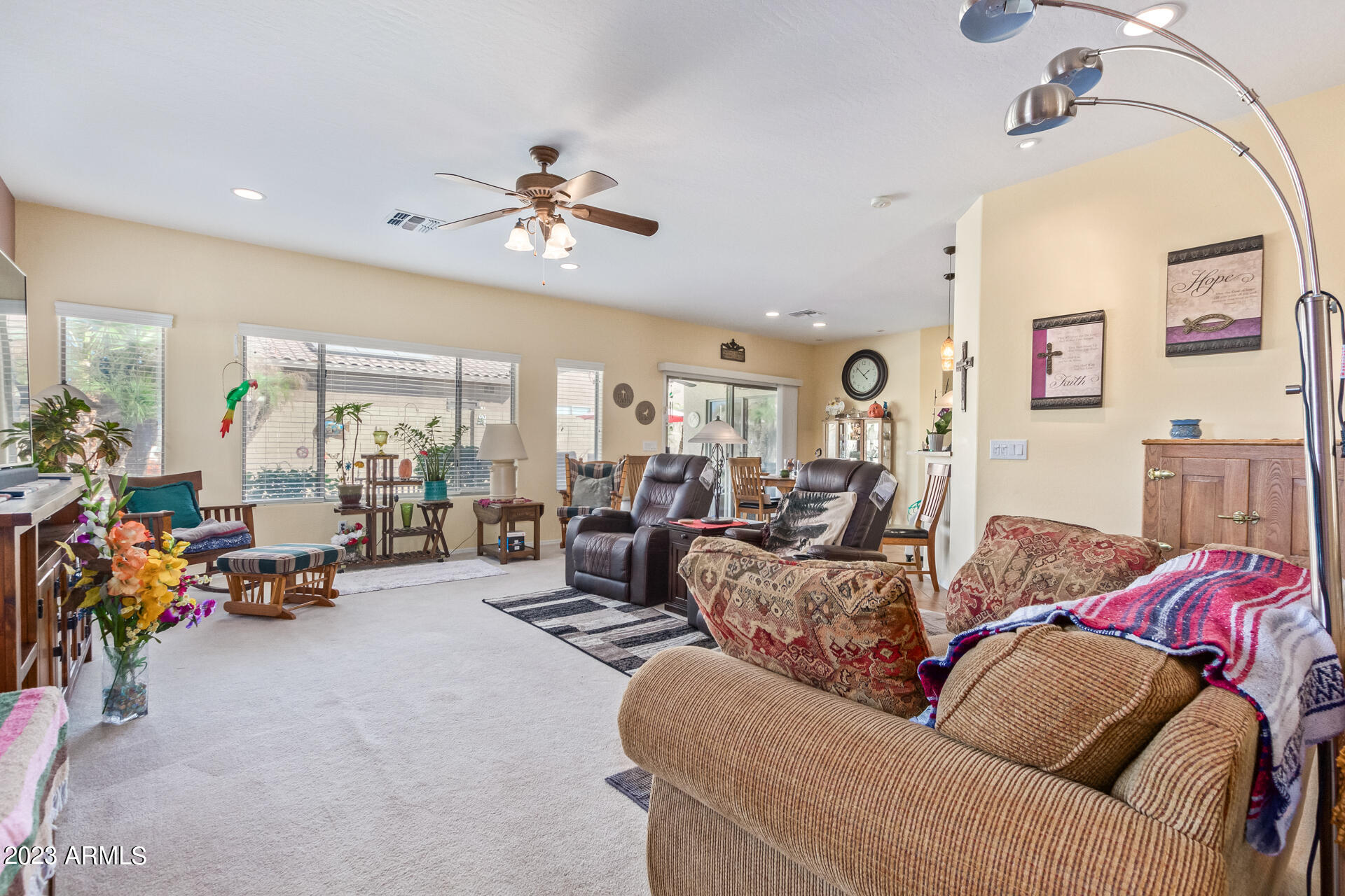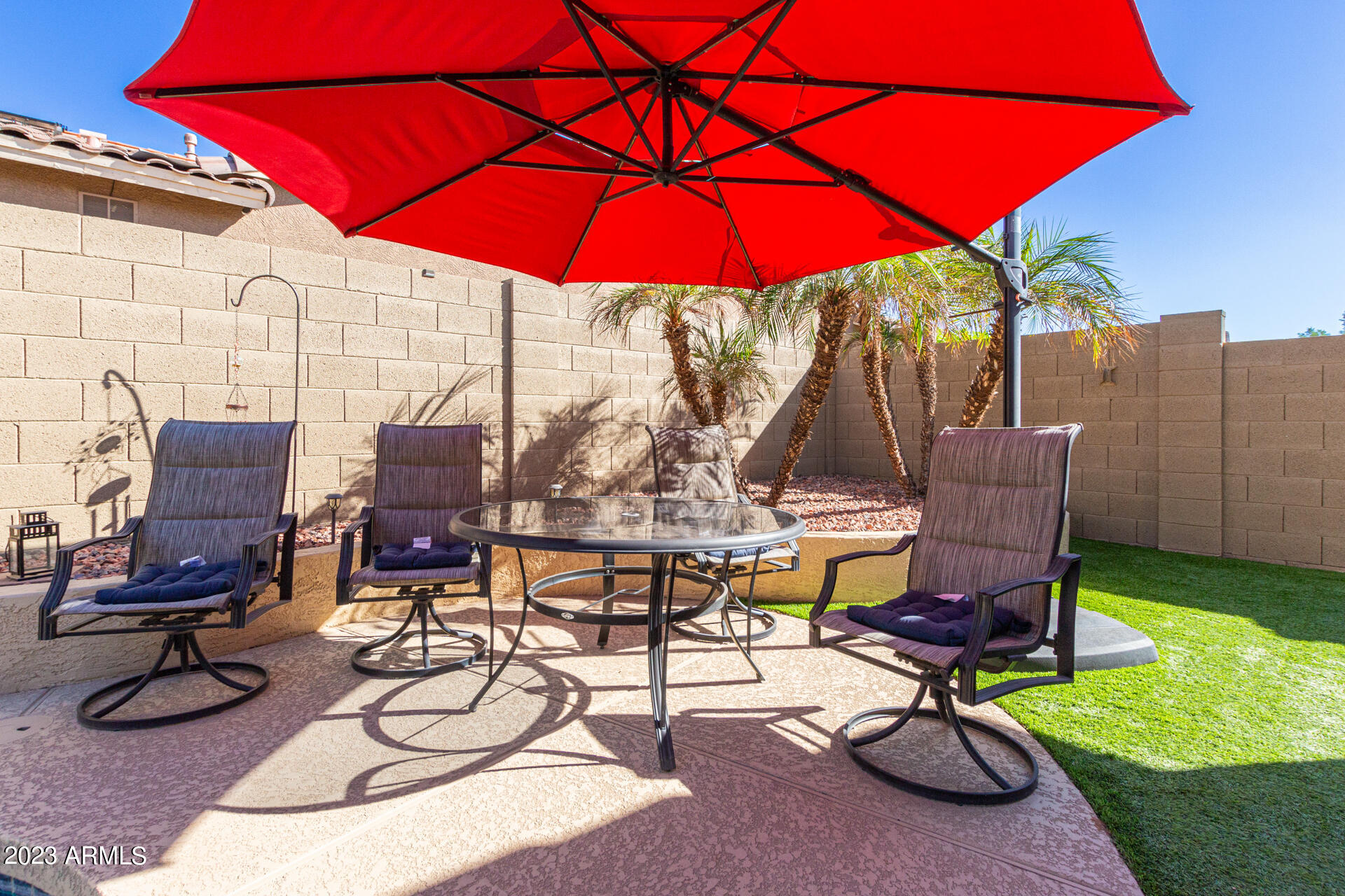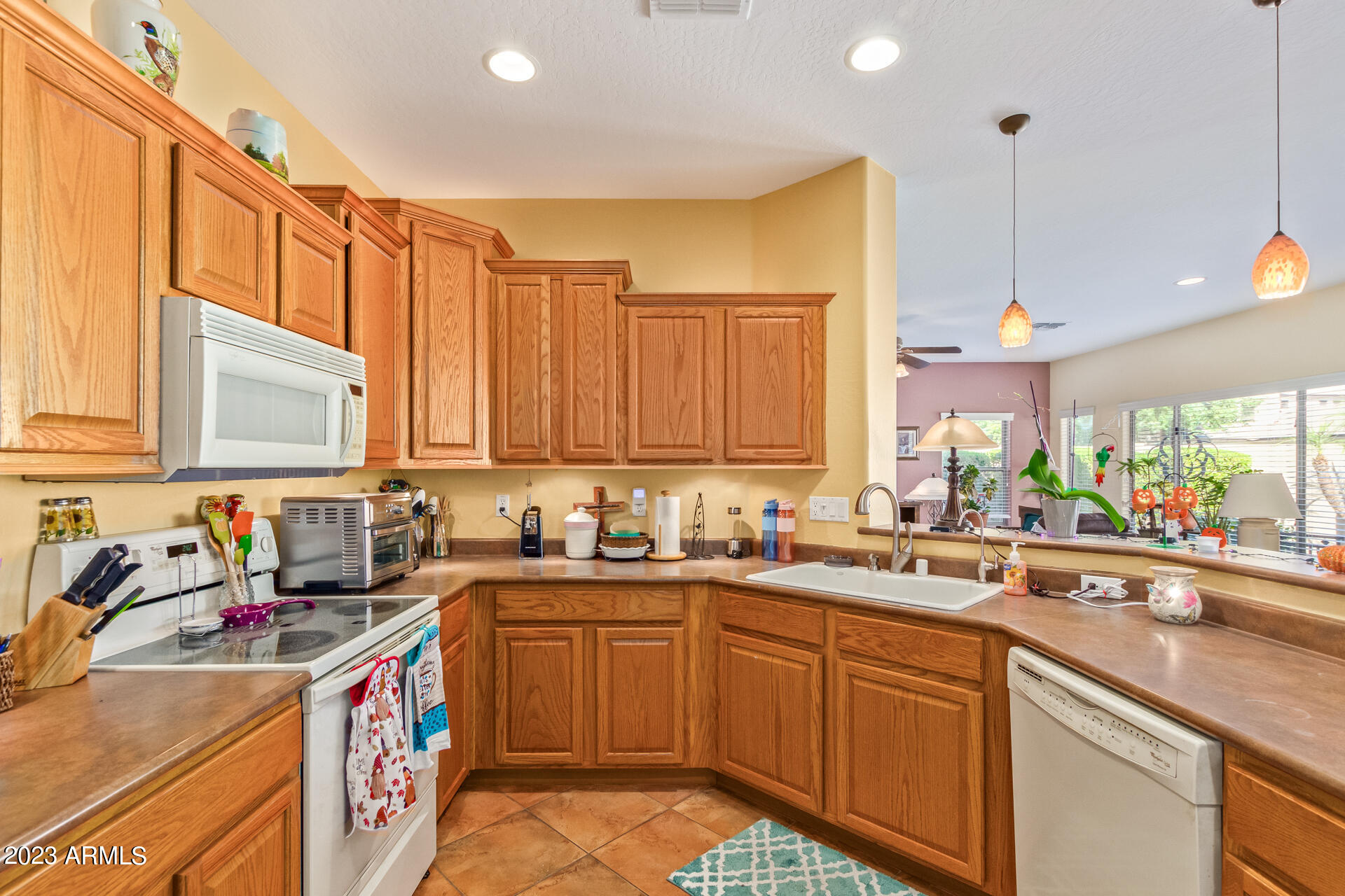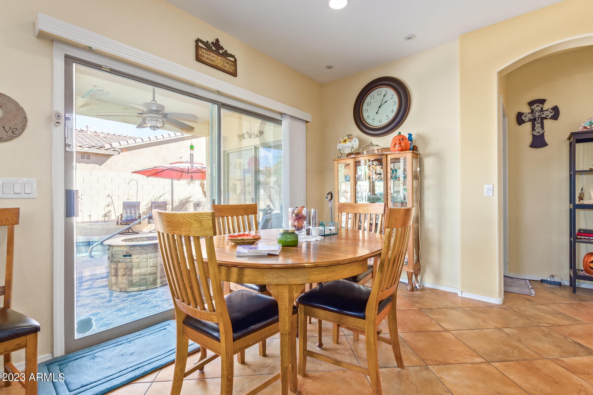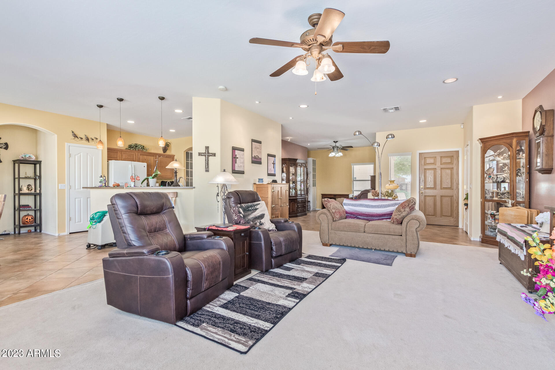 Located on a serene corner lot, this stunning home overlooks a park-like common space. Inside, the residence showcases extensive diagonal-set ceramic tile floors, a spacious open-concept kitchen with a breakfast bar highlighted by recessed and accent lighting, and a formal dining space. The primary bedroom offers direct access to the pool area. Benefit from a generously-sized laundry room equipped with upgraded storage solutions. The backyard is a haven of relaxation, with shaded patio and a pristine pool crowned with a sparkling rock waterfall. Additionally, the home provides ample parking and storage in a spacious 3-car garage.