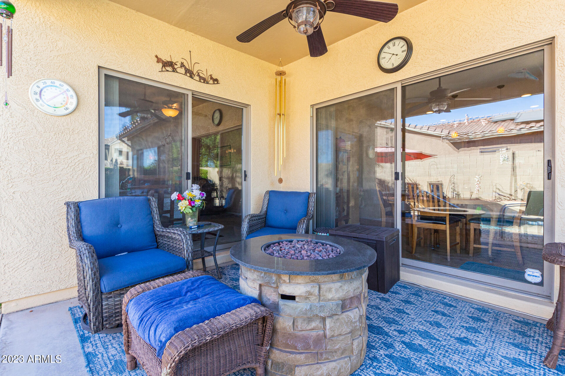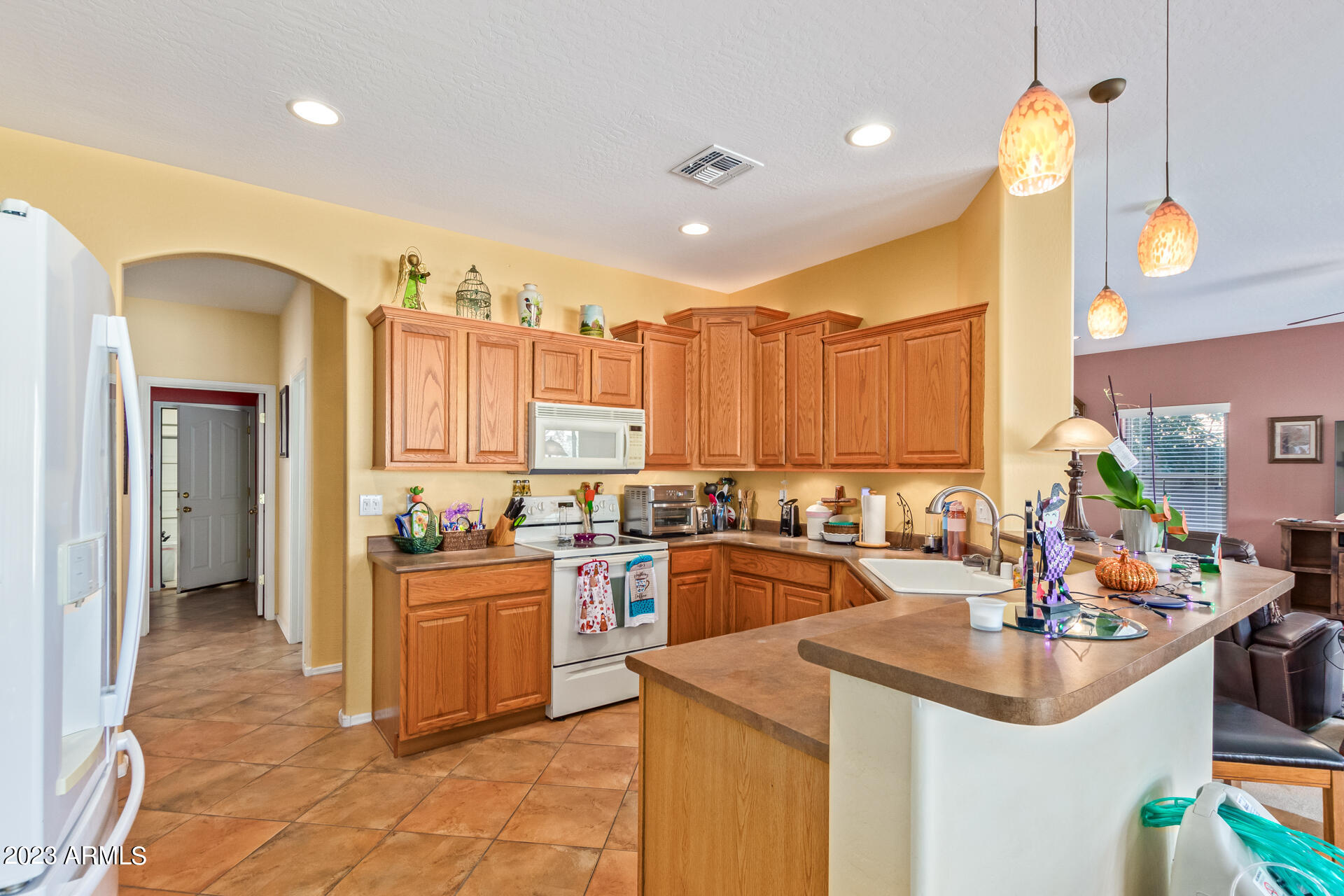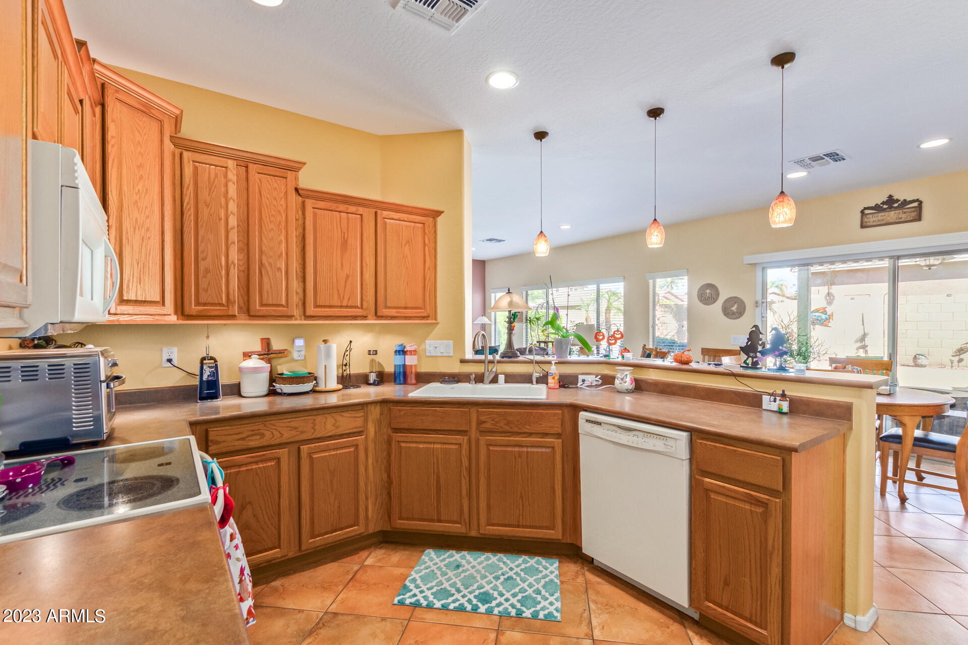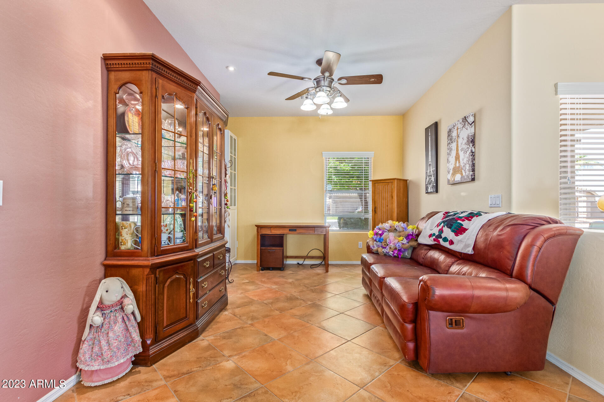 Located on a serene corner lot, this stunning home overlooks a park-like common space. Inside, the residence showcases extensive diagonal-set ceramic tile floors, a spacious open-concept kitchen with a breakfast bar highlighted by recessed and accent lighting, and a formal dining space. The primary bedroom offers direct access to the pool area. Benefit from a generously-sized laundry room equipped with upgraded storage solutions. The backyard is a haven of relaxation, with shaded patio and a pristine pool crowned with a sparkling rock waterfall. Additionally, the home provides ample parking and storage in a spacious 3-car garage.