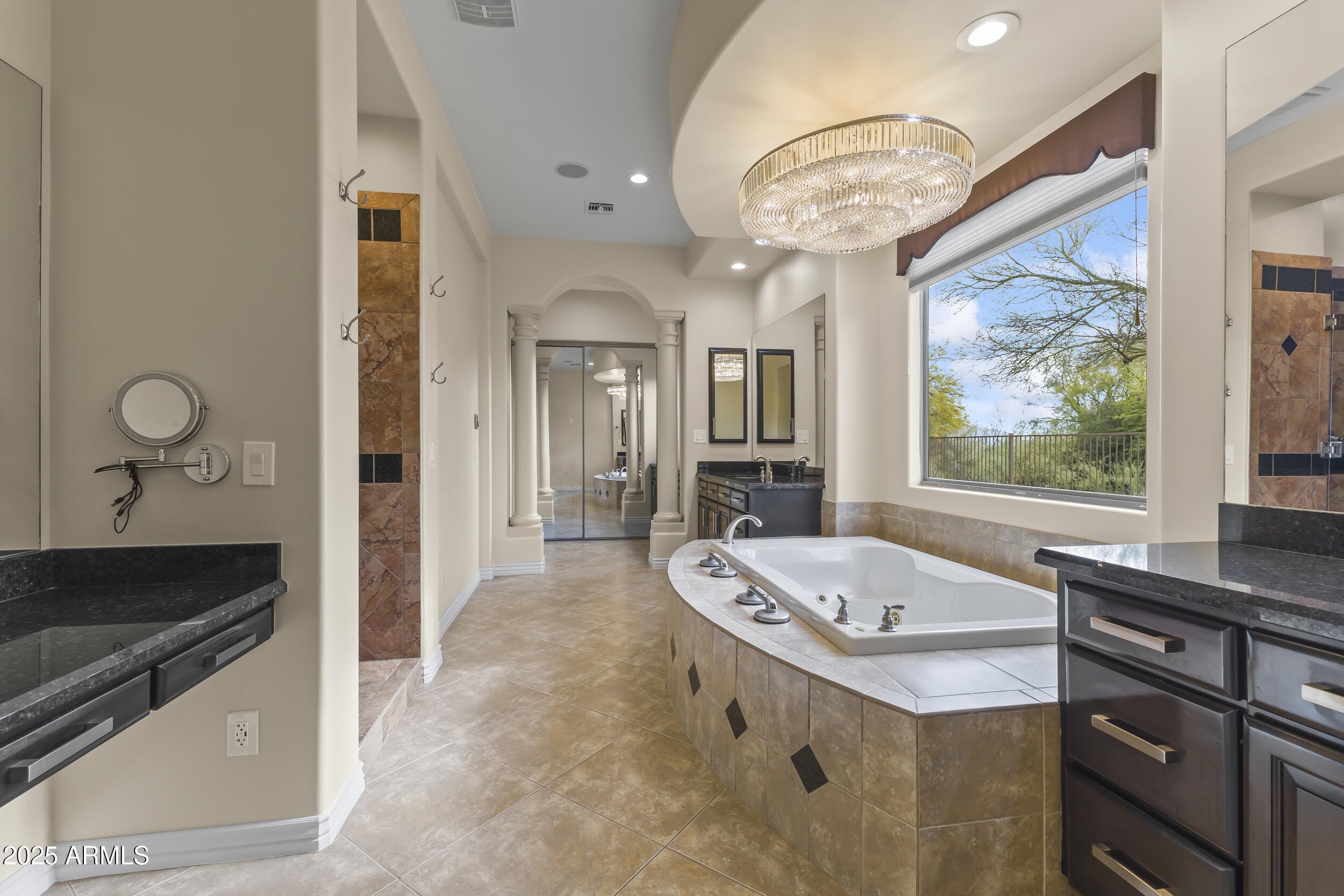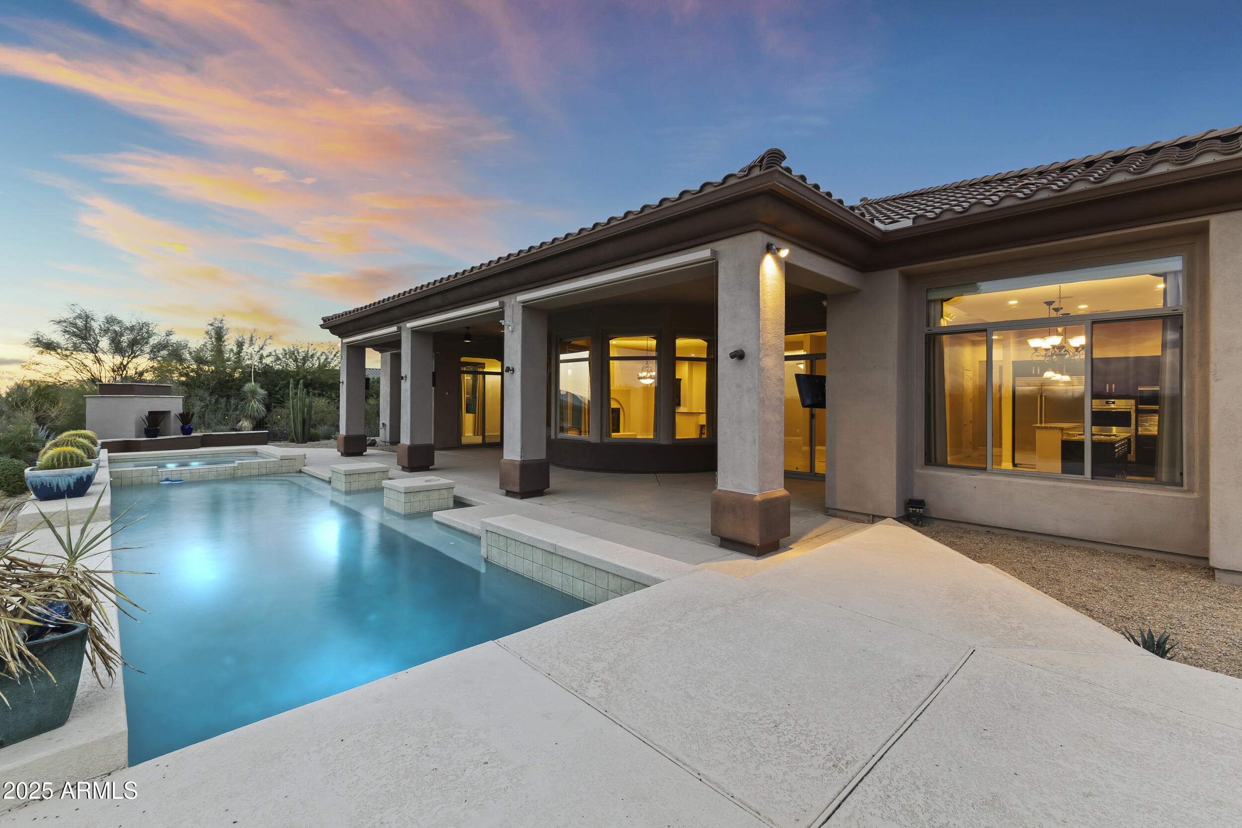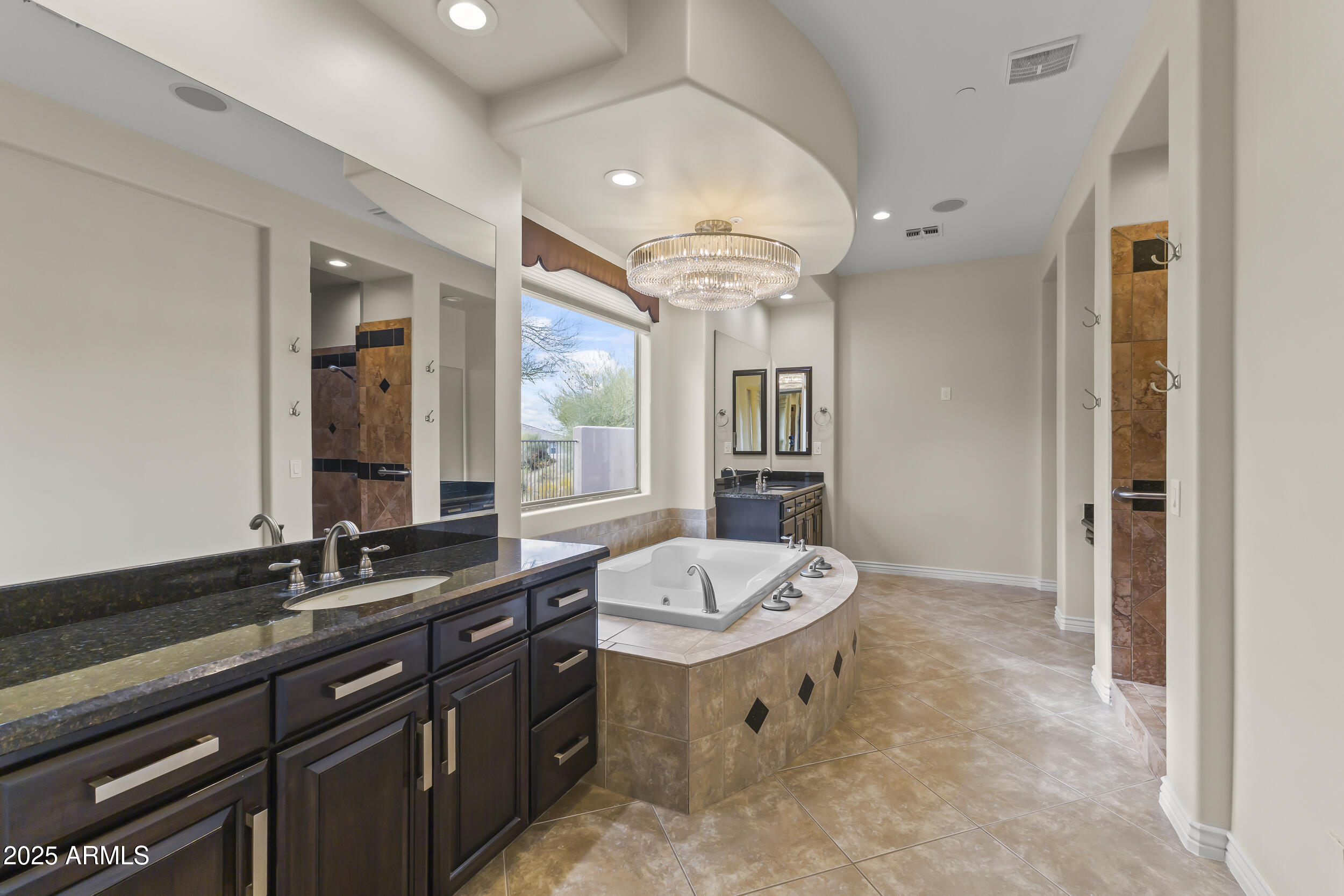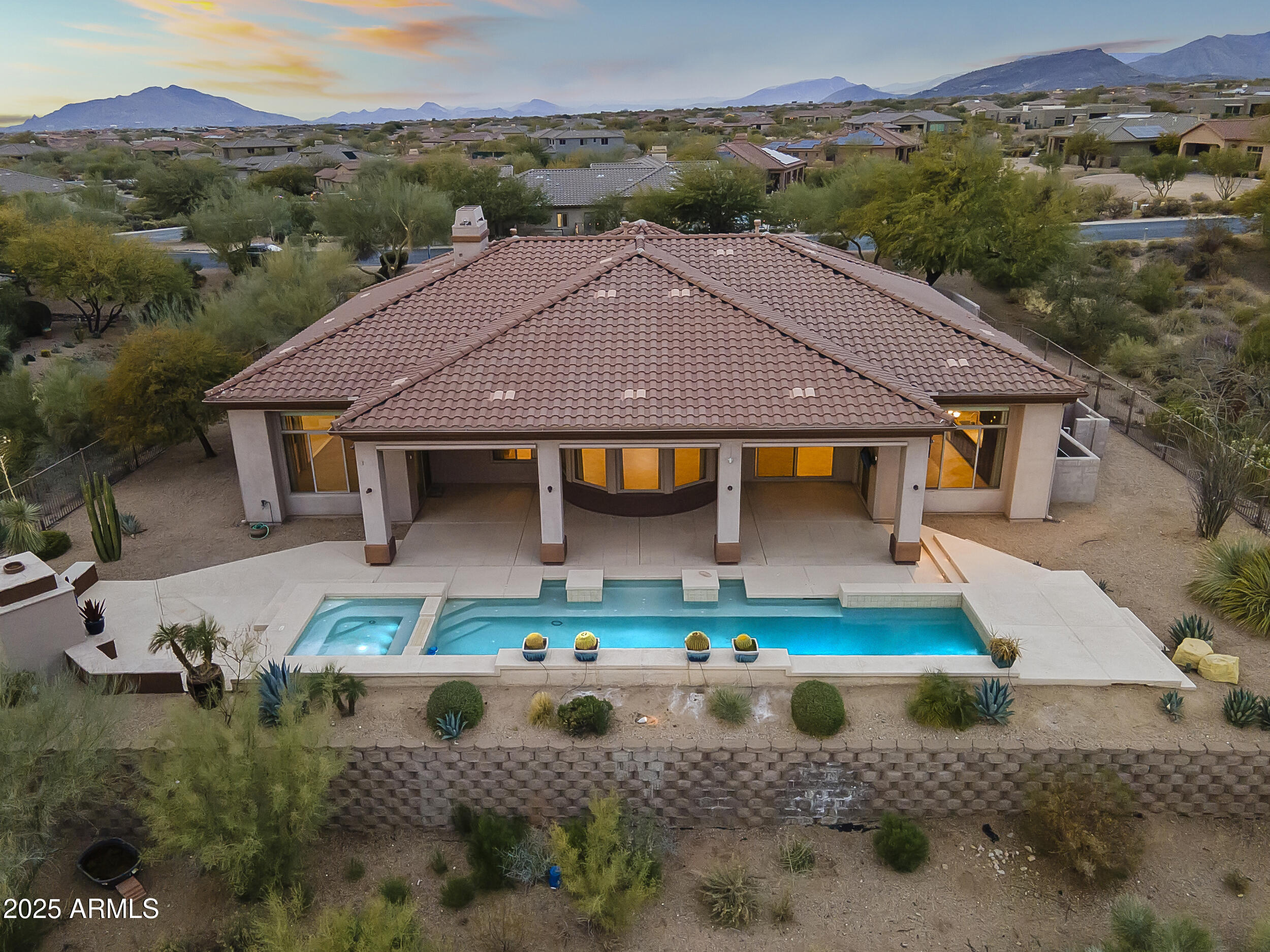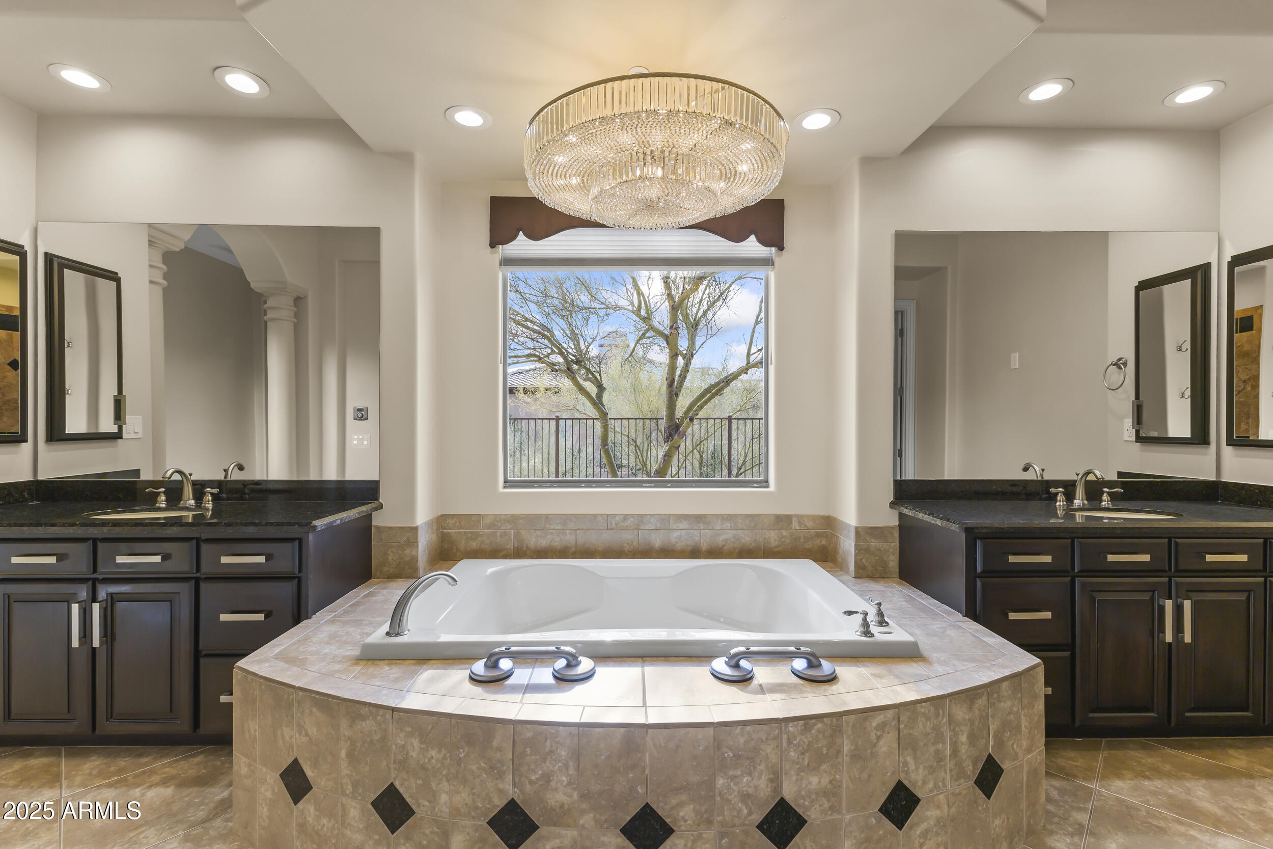Discover luxury living with priceless views in this exquisite single-level home set on a sprawling 1.8-acre lot in Treviso East, a Toll Brothers community. Thoughtfully designed with attention to detail and showcasing numerous upgrades, this residence is filled with natural light, featuring expansive windows that perfectly frame breathtaking views. The gourmet kitchen is the showpiece, featuring a Dual Wolf range, Sub-Zero refrigerator, pull-out cabinetry, a large island, walk-in pantry, formal dining room, and a cozy breakfast nook. Kitchen opens up to the spacious living area that faces the views and features towering ceilings, entrance to the patio, fireplace as well as wet bar! The split floor plan offers an oversized primary suite with a sitting area, fireplace, and two luxurious custom closets with thousands spent on creating a truly organized masterpiece. A sizable office with extensive cabinetry and French doors that could be turned into a fourth bedroom enhances functionality, while each additional bedroom includes an en-suite bath. Additional upgrades include custom chandeliers, expansive closet built-ins, new pool equipment, new pool upgrades, and fresh interior paint, enhancing the overall appeal of this remarkable property. Perfect for guests, the attached casita features a private entrance, walk-in closet, and full bath. Step outside to an entertainer's dream, complete with a newly renovated heated lap pool, heated spa, expansive covered patio, outdoor fireplace, and unparalleled panoramic views. For car enthusiasts, the garage is equipped with a mini-split system to keep exotic cars cool and protected from the heat. Additional organized closet space can be found in the office/bedroom and garage, ensuring storage is effortless and well-structured. Other features include exterior cameras, a full-house alarm system, and new blinds and drapes. Treviso offers not just a home but an exclusive lifestyle. The community is family-oriented and currently expanding its recreational facilities with the addition of bocce and pickleball courts. Residents also enjoy access to tennis courts, a ramada, and a playground, making it the ideal setting for both relaxation and activity.