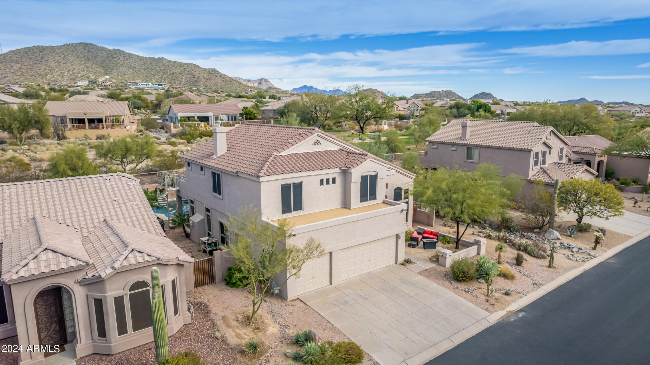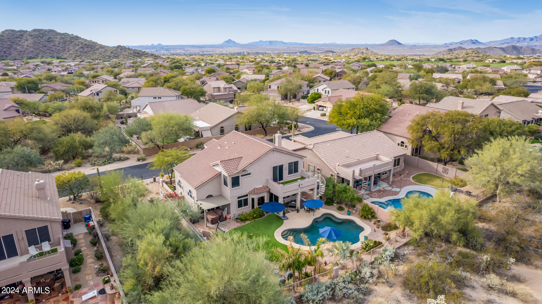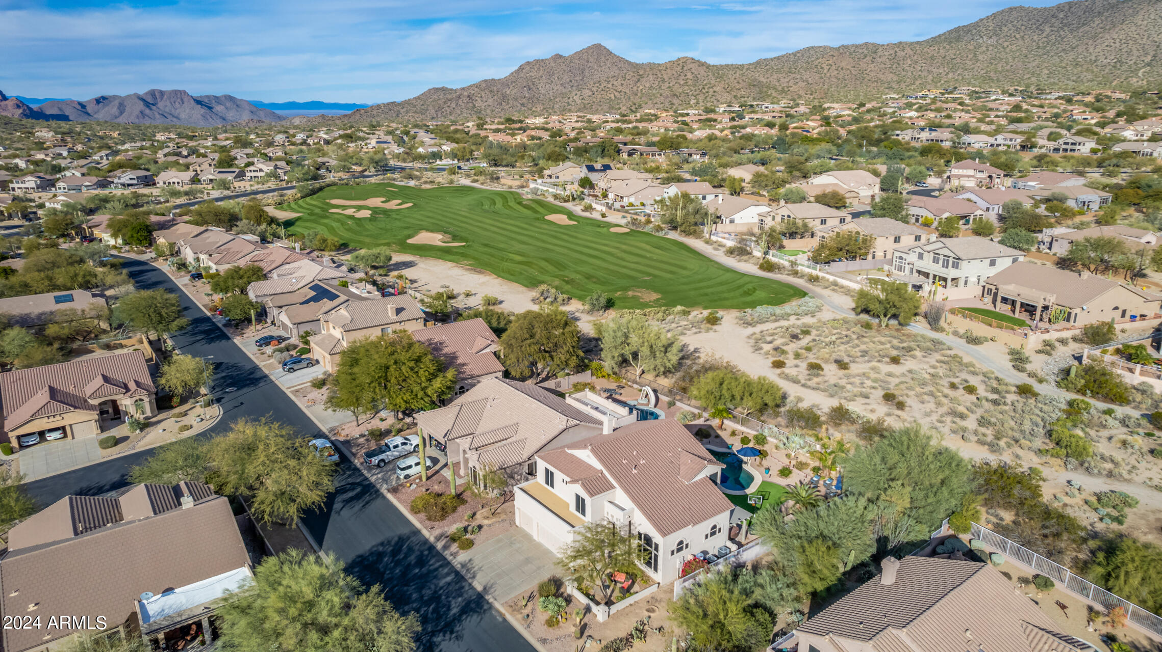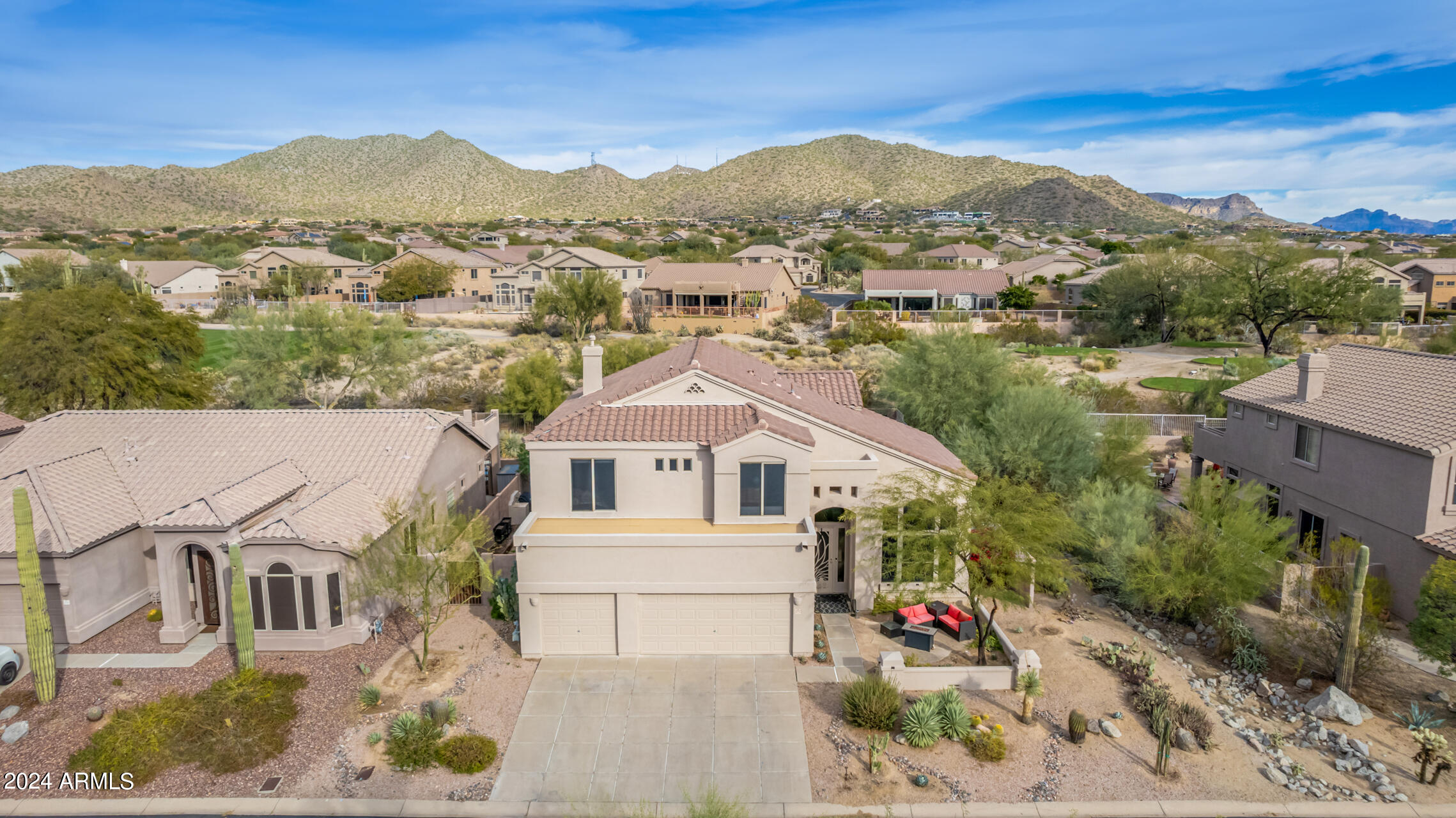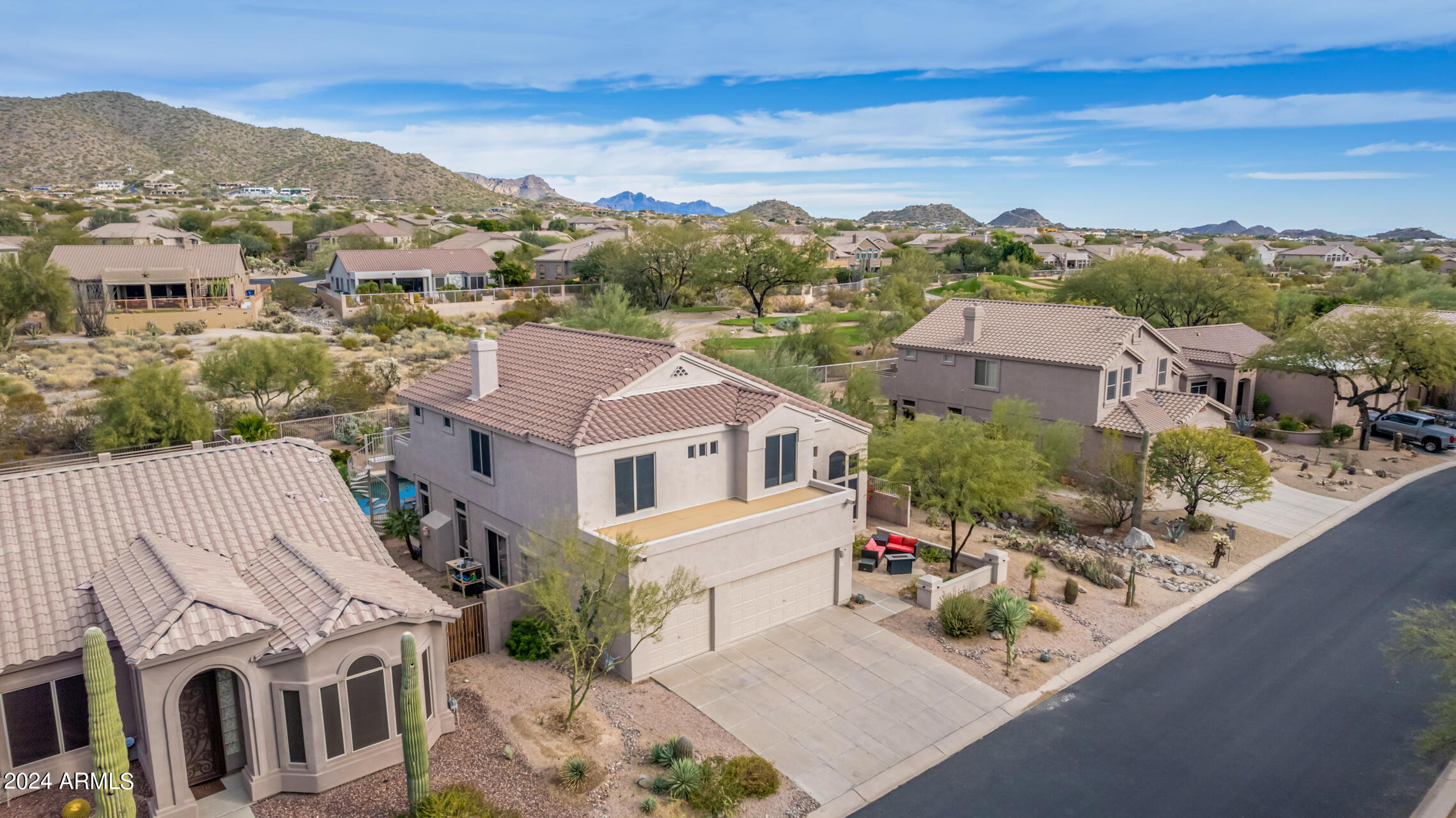 Stunning 4 bed + den, 3 bath, 3 car garage Blandford home in Las Sendas, in a gated community, situated on the 17th tee of the golf course is a dream come true! This move-in ready home has been lovingly upgraded with over $130,000 invested within the last two years, both inside the home and on the property grounds. Upgrades include 2 new HVAC units, new flooring, fresh interior paint, new appliances, new pool equipment, landscaping and so much more--ask your agent for the detailed upgrades list! Prepare to be impressed by an exquisite interior offering gleaming wood-look floor, high ceilings, soothing color palette, charming arched doorways, & dazzling light fixtures. Downstairs you'll find a bedroom AND full bath, and multiple entertainment spaces! (See more...) The impressive kitchen is the heart of the home, with plenty of counter space, granite counters, a center island complete w/ breakfast bar, a convenient built-in desk, multiple pantries, SS appliances, and fantastic views to your resort like backyard. The remarkable main retreat showcases soft carpet throughout, an adjoining office/bonus area (which could be converted to a fifth bedroom with a closet by it's future owner), private outdoor access with a spacious balcony and impressive views, a delightful two-way fireplace, & an immaculate ensuite with dual vanities. Two additional spacious bedrooms, one with a walk-in closet, and a full bath upstairs complete the indoor space. The spectacular backyard includes a sparkling pebble finish swimming pool, all new landscaping in front & back (under warranty) & a lovely deck displaying mountain views, complete the picture of this oasis! Homes and neighborhoods like this one are hard to come by. Minutes away from Saguaro Lake, Salt River and Tonto National Forest. Las Sendas features two community pools, spas, splash pad, multiple parks, tennis, pickleball, and bocce ball courts, walking/biking paths & groups/clubs for everyone!