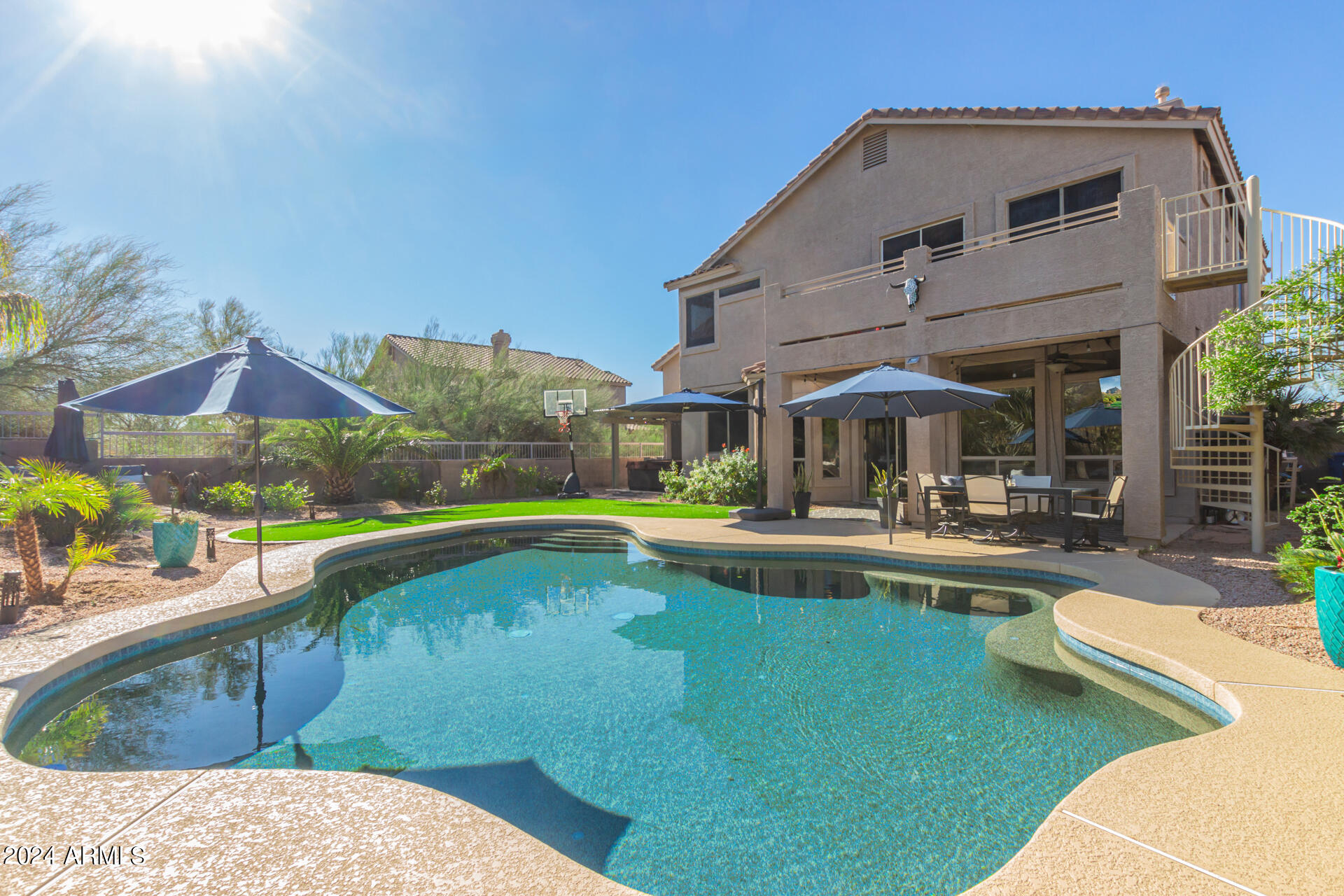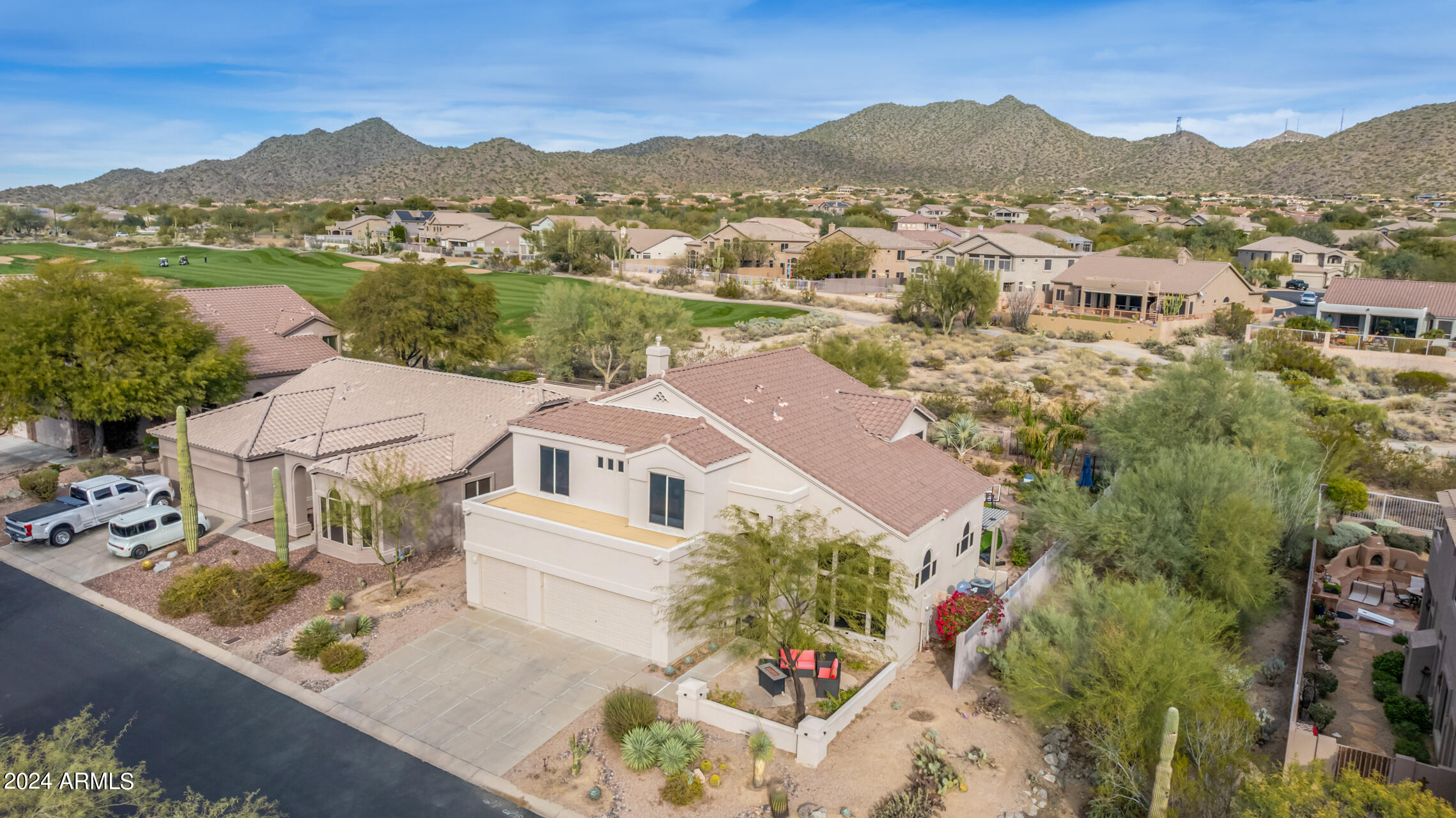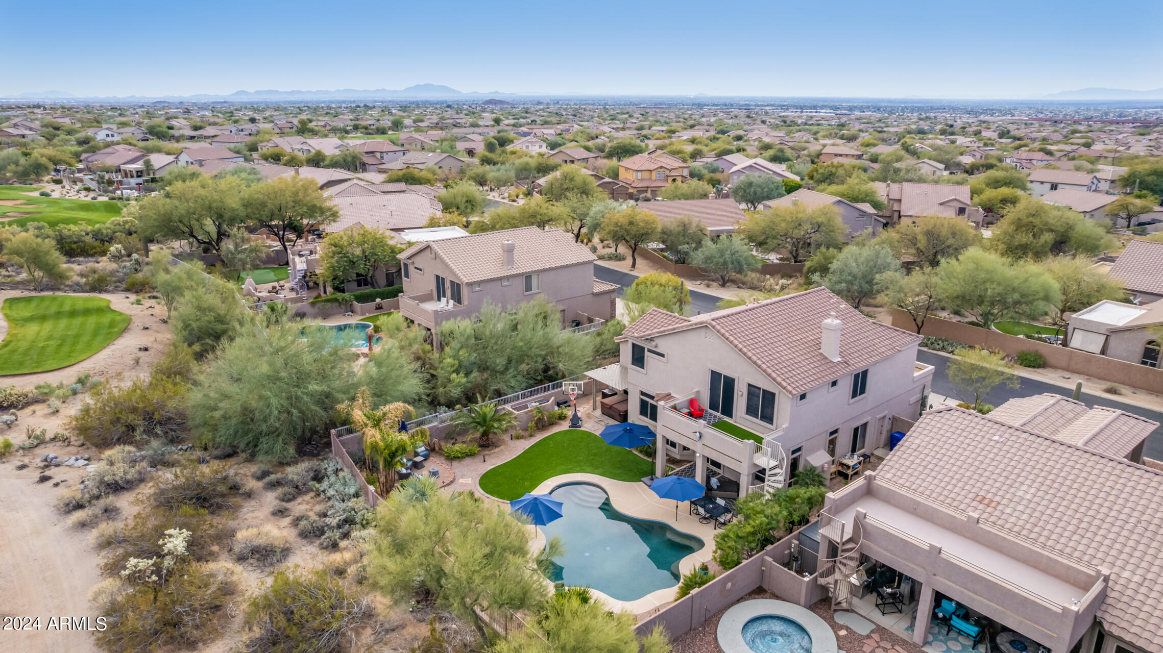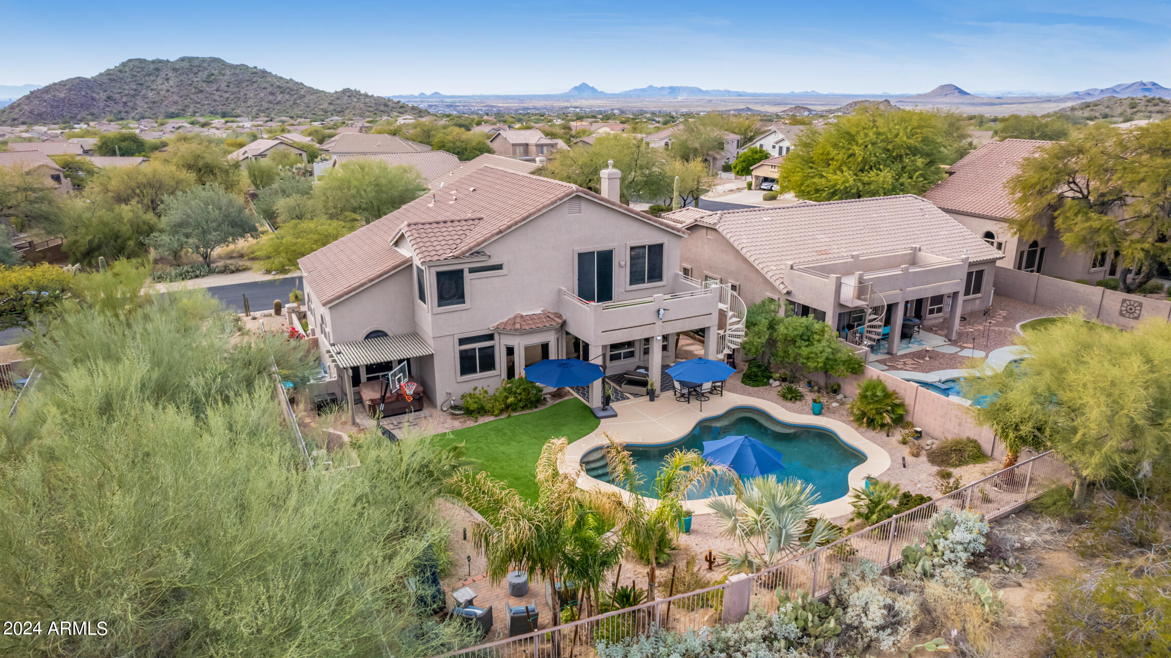 Stunning 4 bed + den, 3 bath, 3 car garage Blandford home in Las Sendas, in a gated community, situated on the 17th tee of the golf course is a dream come true! This move-in ready home has been lovingly upgraded with over $130,000 invested within the last two years, both inside the home and on the property grounds. Upgrades include 2 new HVAC units, new flooring, fresh interior paint, new appliances, new pool equipment, landscaping and so much more--ask your agent for the detailed upgrades list! Prepare to be impressed by an exquisite interior offering gleaming wood-look floor, high ceilings, soothing color palette, charming arched doorways, & dazzling light fixtures. Downstairs you'll find a bedroom AND full bath, and multiple entertainment spaces! (See more...) The impressive kitchen is the heart of the home, with plenty of counter space, granite counters, a center island complete w/ breakfast bar, a convenient built-in desk, multiple pantries, SS appliances, and fantastic views to your resort like backyard. The remarkable main retreat showcases soft carpet throughout, an adjoining office/bonus area (which could be converted to a fifth bedroom with a closet by it's future owner), private outdoor access with a spacious balcony and impressive views, a delightful two-way fireplace, & an immaculate ensuite with dual vanities. Two additional spacious bedrooms, one with a walk-in closet, and a full bath upstairs complete the indoor space. The spectacular backyard includes a sparkling pebble finish swimming pool, all new landscaping in front & back (under warranty) & a lovely deck displaying mountain views, complete the picture of this oasis! Homes and neighborhoods like this one are hard to come by. Minutes away from Saguaro Lake, Salt River and Tonto National Forest. Las Sendas features two community pools, spas, splash pad, multiple parks, tennis, pickleball, and bocce ball courts, walking/biking paths & groups/clubs for everyone!