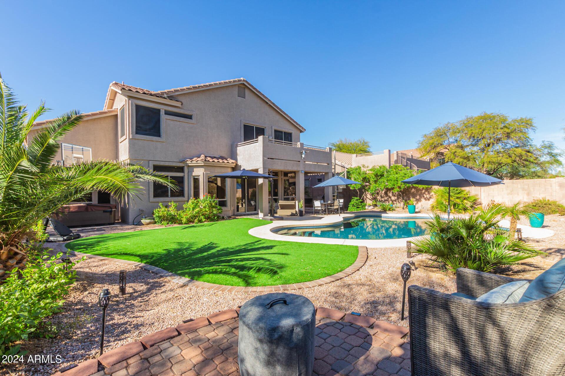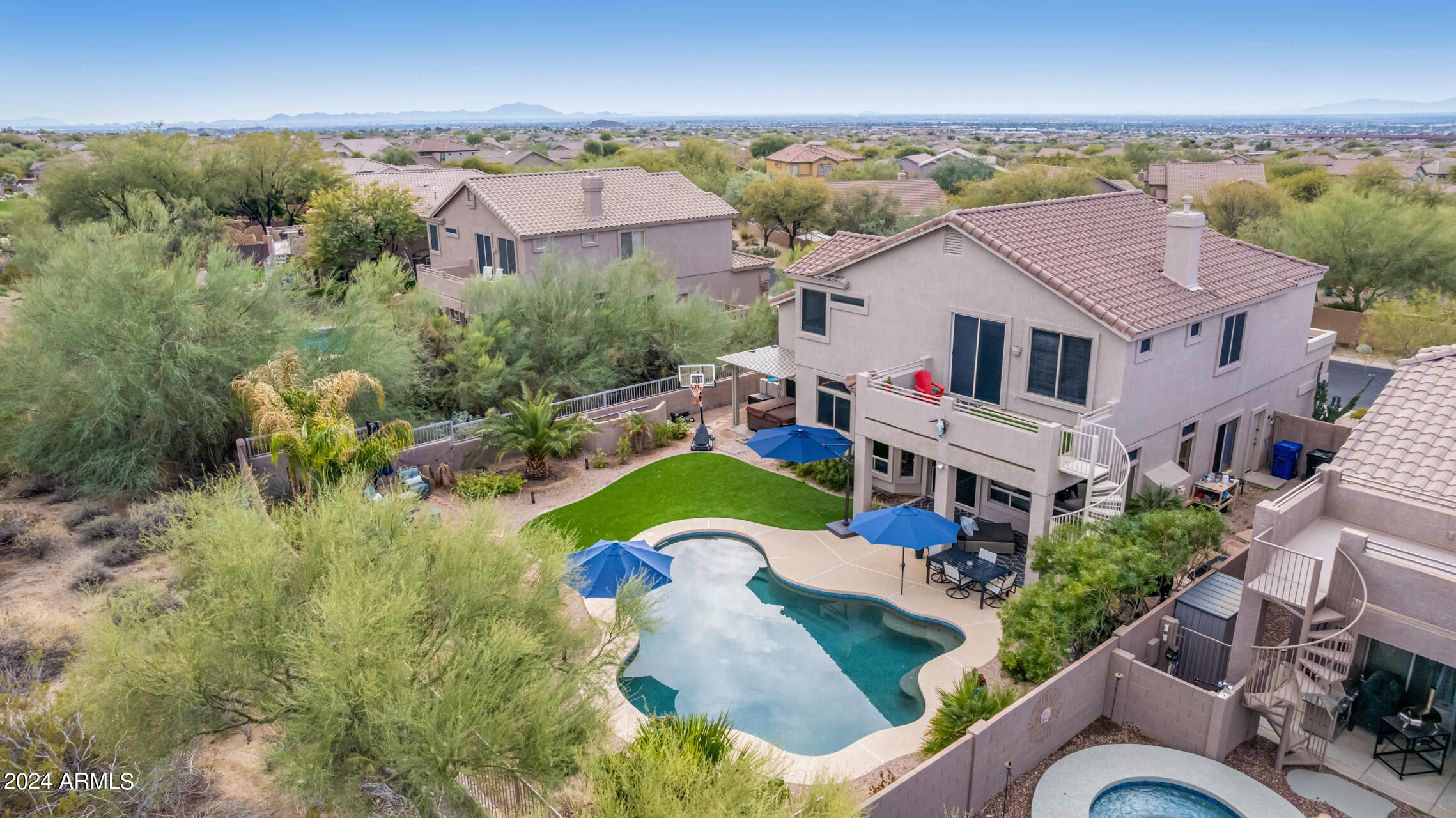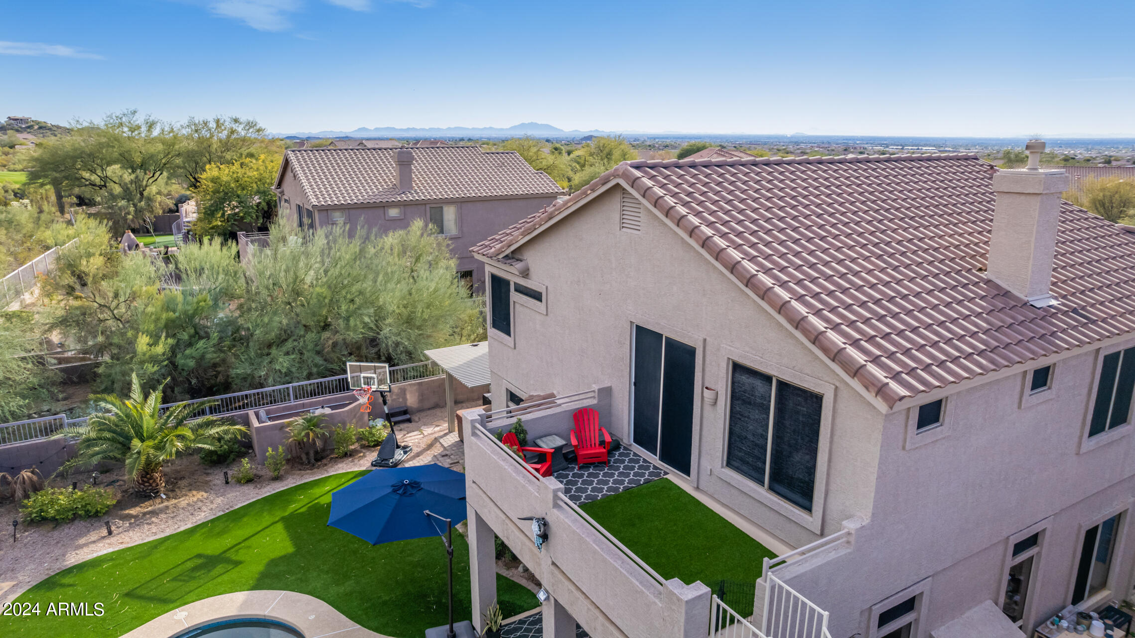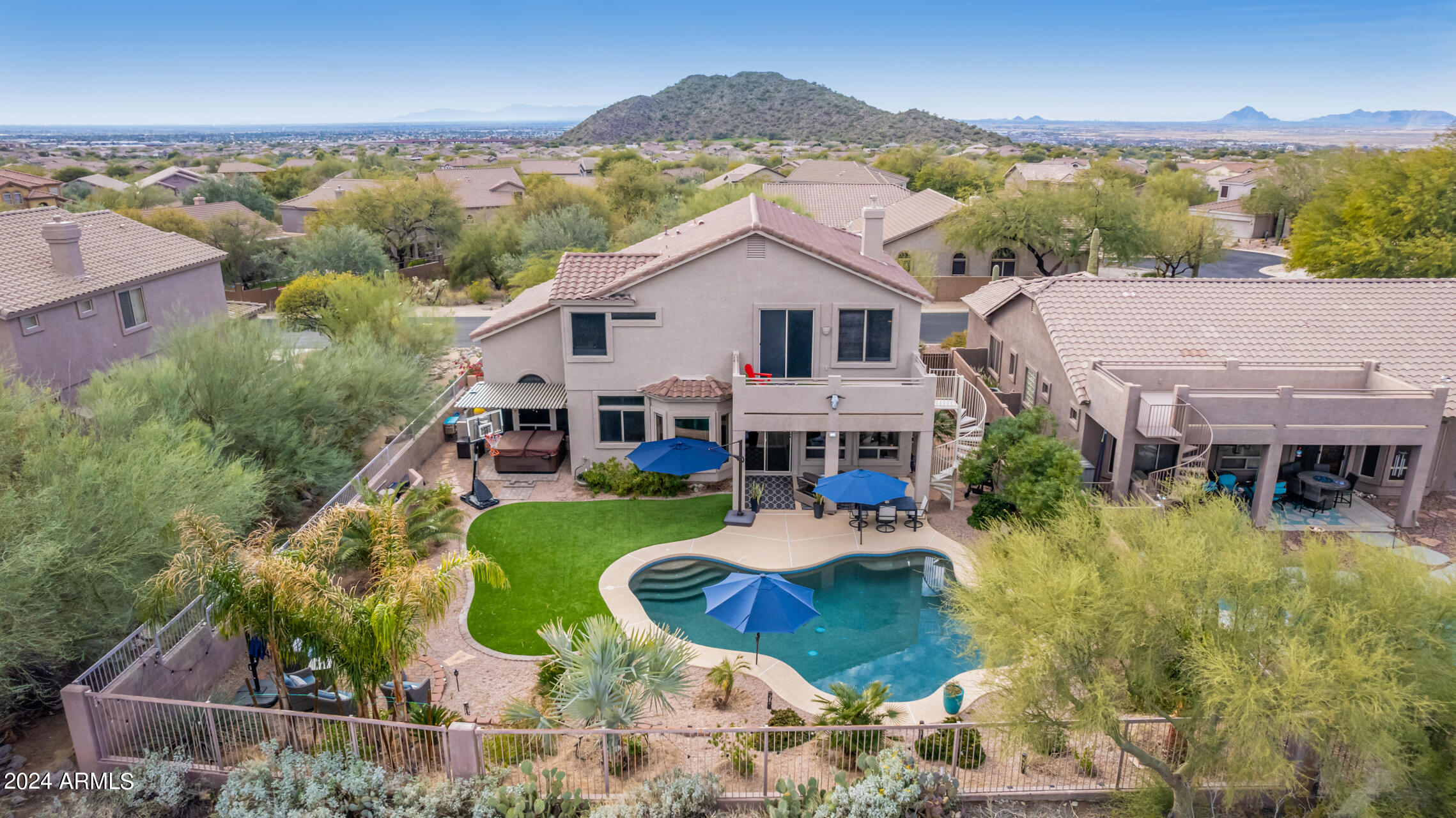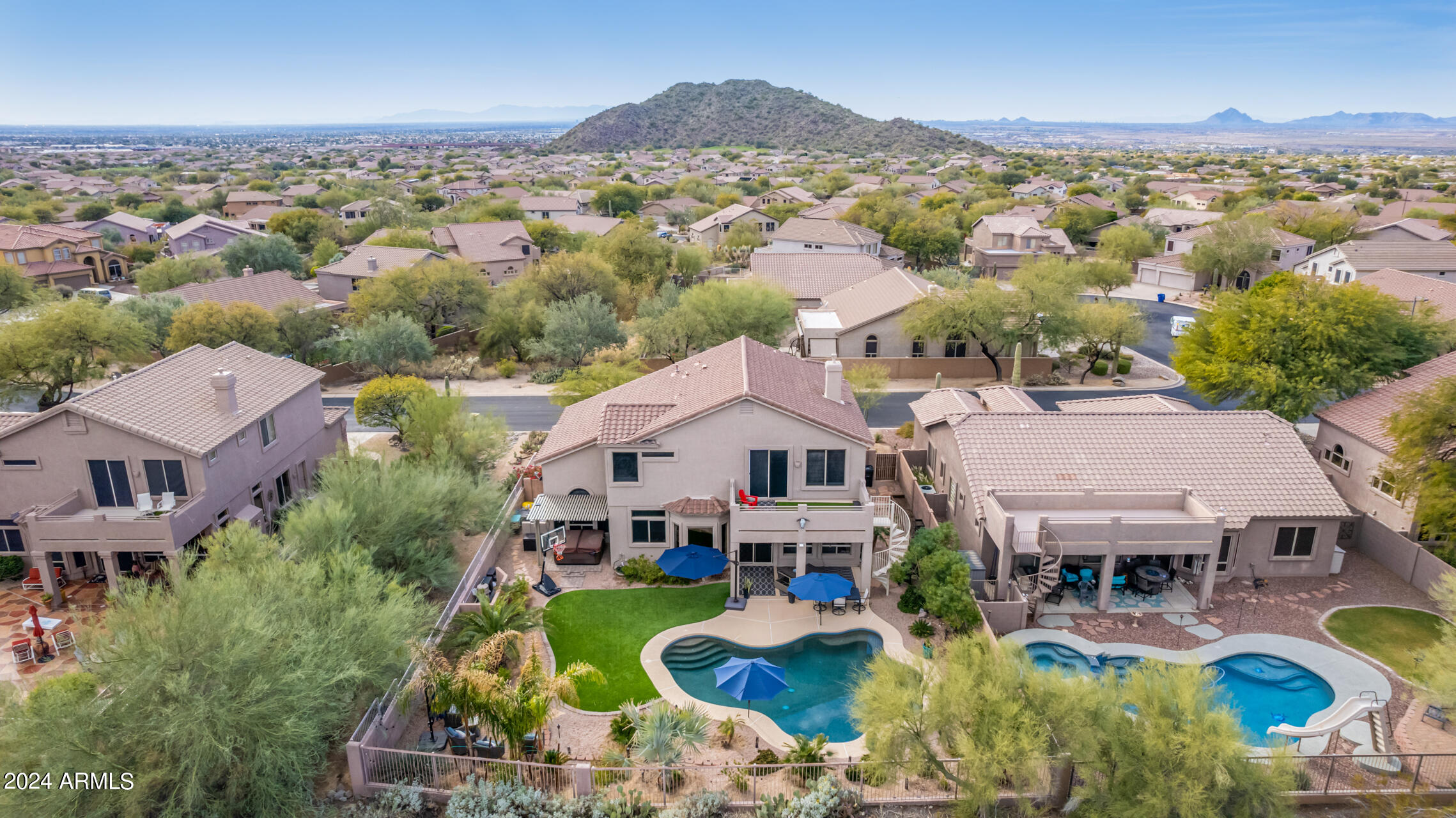 Stunning 4 bed + den, 3 bath, 3 car garage Blandford home in Las Sendas, in a gated community, situated on the 17th tee of the golf course is a dream come true! This move-in ready home has been lovingly upgraded with over $130,000 invested within the last two years, both inside the home and on the property grounds. Upgrades include 2 new HVAC units, new flooring, fresh interior paint, new appliances, new pool equipment, landscaping and so much more--ask your agent for the detailed upgrades list! Prepare to be impressed by an exquisite interior offering gleaming wood-look floor, high ceilings, soothing color palette, charming arched doorways, & dazzling light fixtures. Downstairs you'll find a bedroom AND full bath, and multiple entertainment spaces! (See more...) The impressive kitchen is the heart of the home, with plenty of counter space, granite counters, a center island complete w/ breakfast bar, a convenient built-in desk, multiple pantries, SS appliances, and fantastic views to your resort like backyard. The remarkable main retreat showcases soft carpet throughout, an adjoining office/bonus area (which could be converted to a fifth bedroom with a closet by it's future owner), private outdoor access with a spacious balcony and impressive views, a delightful two-way fireplace, & an immaculate ensuite with dual vanities. Two additional spacious bedrooms, one with a walk-in closet, and a full bath upstairs complete the indoor space. The spectacular backyard includes a sparkling pebble finish swimming pool, all new landscaping in front & back (under warranty) & a lovely deck displaying mountain views, complete the picture of this oasis! Homes and neighborhoods like this one are hard to come by. Minutes away from Saguaro Lake, Salt River and Tonto National Forest. Las Sendas features two community pools, spas, splash pad, multiple parks, tennis, pickleball, and bocce ball courts, walking/biking paths & groups/clubs for everyone!