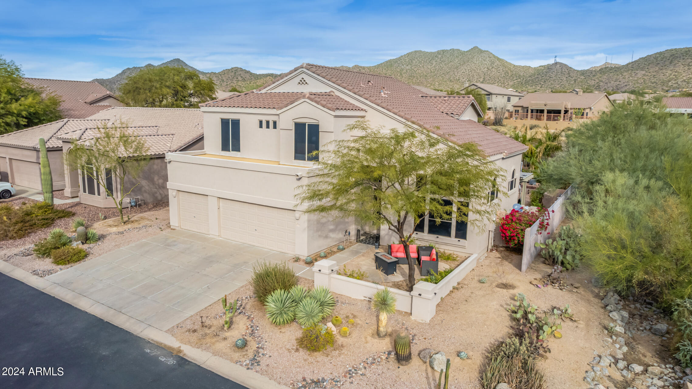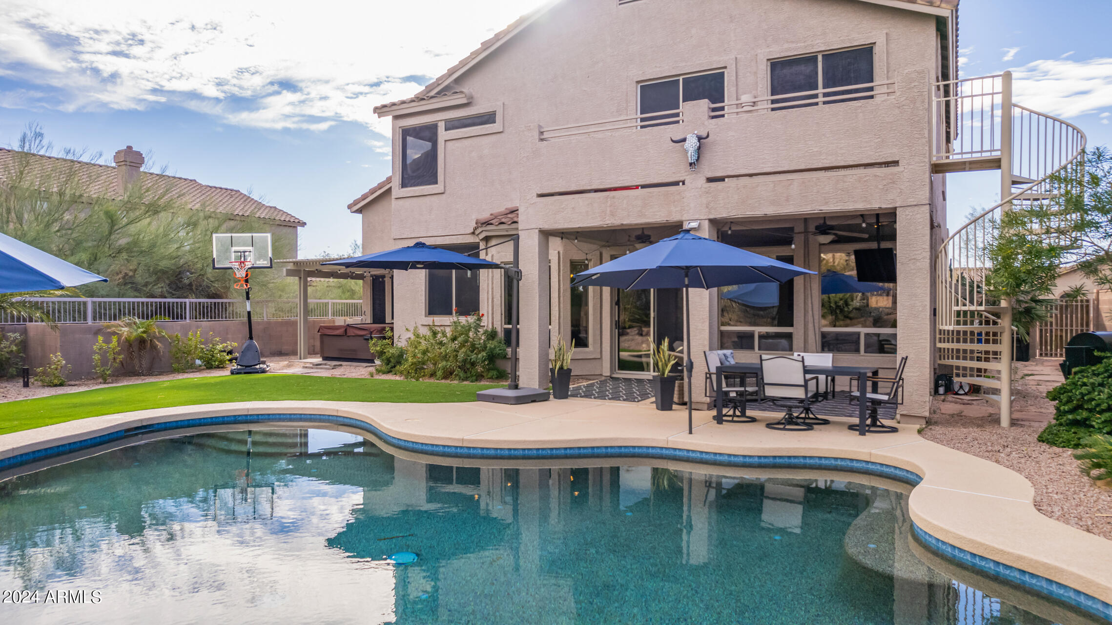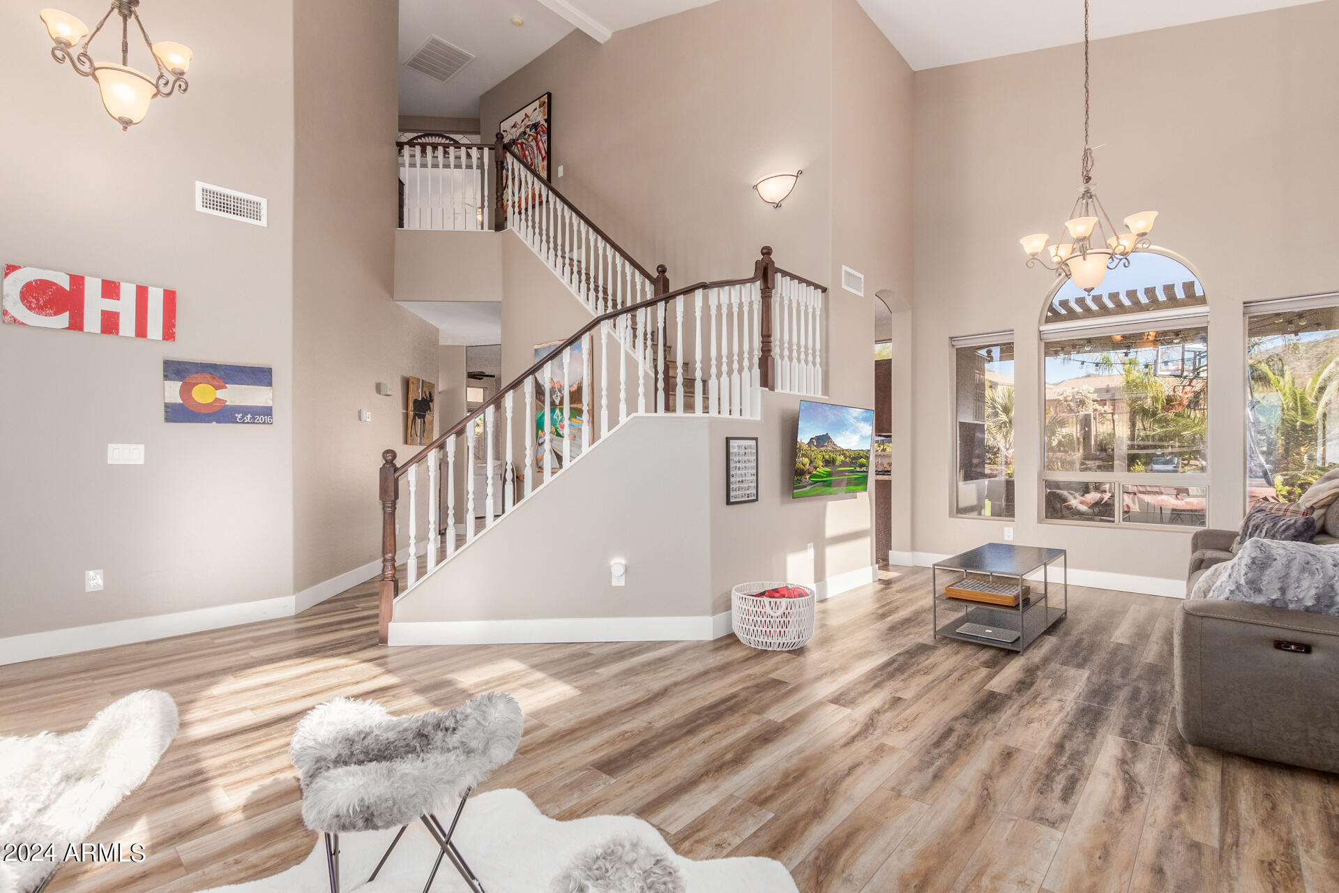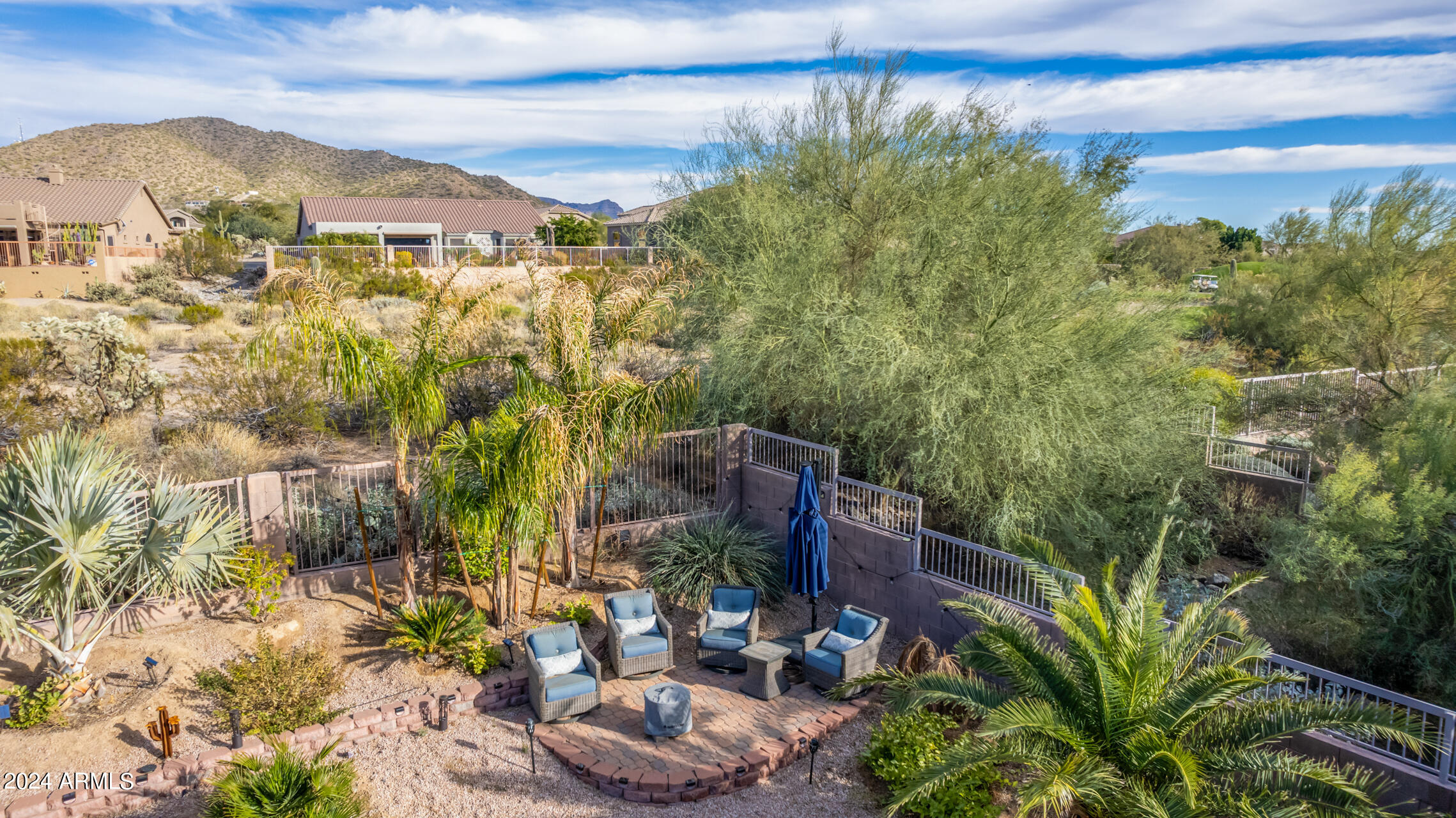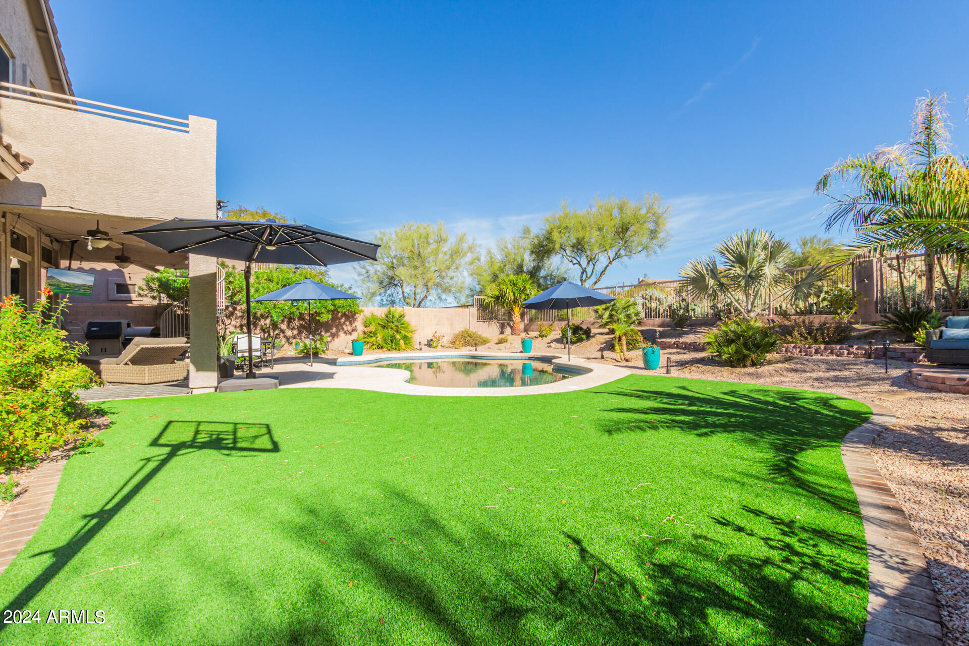 Stunning 4 bed + den, 3 bath, 3 car garage Blandford home in Las Sendas, in a gated community, situated on the 17th tee of the golf course is a dream come true! This move-in ready home has been lovingly upgraded with over $130,000 invested within the last two years, both inside the home and on the property grounds. Upgrades include 2 new HVAC units, new flooring, fresh interior paint, new appliances, new pool equipment, landscaping and so much more--ask your agent for the detailed upgrades list! Prepare to be impressed by an exquisite interior offering gleaming wood-look floor, high ceilings, soothing color palette, charming arched doorways, & dazzling light fixtures. Downstairs you'll find a bedroom AND full bath, and multiple entertainment spaces! (See more...) The impressive kitchen is the heart of the home, with plenty of counter space, granite counters, a center island complete w/ breakfast bar, a convenient built-in desk, multiple pantries, SS appliances, and fantastic views to your resort like backyard. The remarkable main retreat showcases soft carpet throughout, an adjoining office/bonus area (which could be converted to a fifth bedroom with a closet by it's future owner), private outdoor access with a spacious balcony and impressive views, a delightful two-way fireplace, & an immaculate ensuite with dual vanities. Two additional spacious bedrooms, one with a walk-in closet, and a full bath upstairs complete the indoor space. The spectacular backyard includes a sparkling pebble finish swimming pool, all new landscaping in front & back (under warranty) & a lovely deck displaying mountain views, complete the picture of this oasis! Homes and neighborhoods like this one are hard to come by. Minutes away from Saguaro Lake, Salt River and Tonto National Forest. Las Sendas features two community pools, spas, splash pad, multiple parks, tennis, pickleball, and bocce ball courts, walking/biking paths & groups/clubs for everyone!