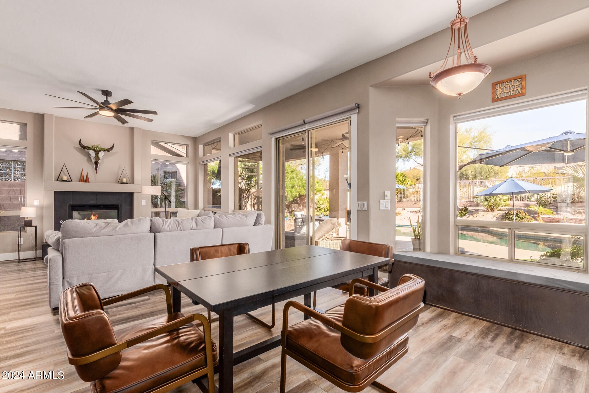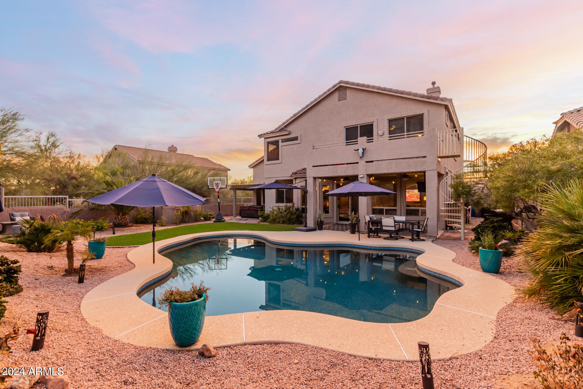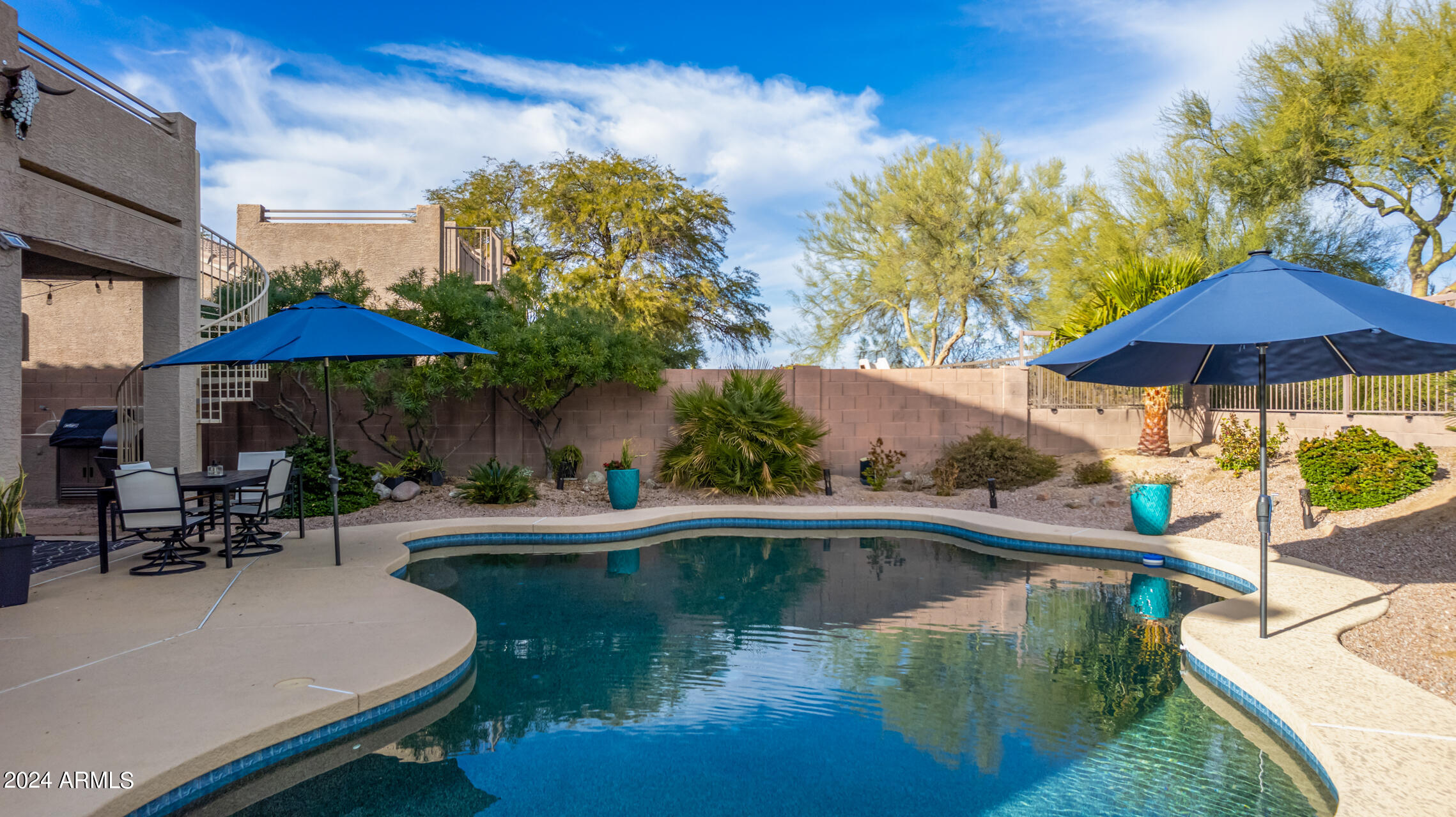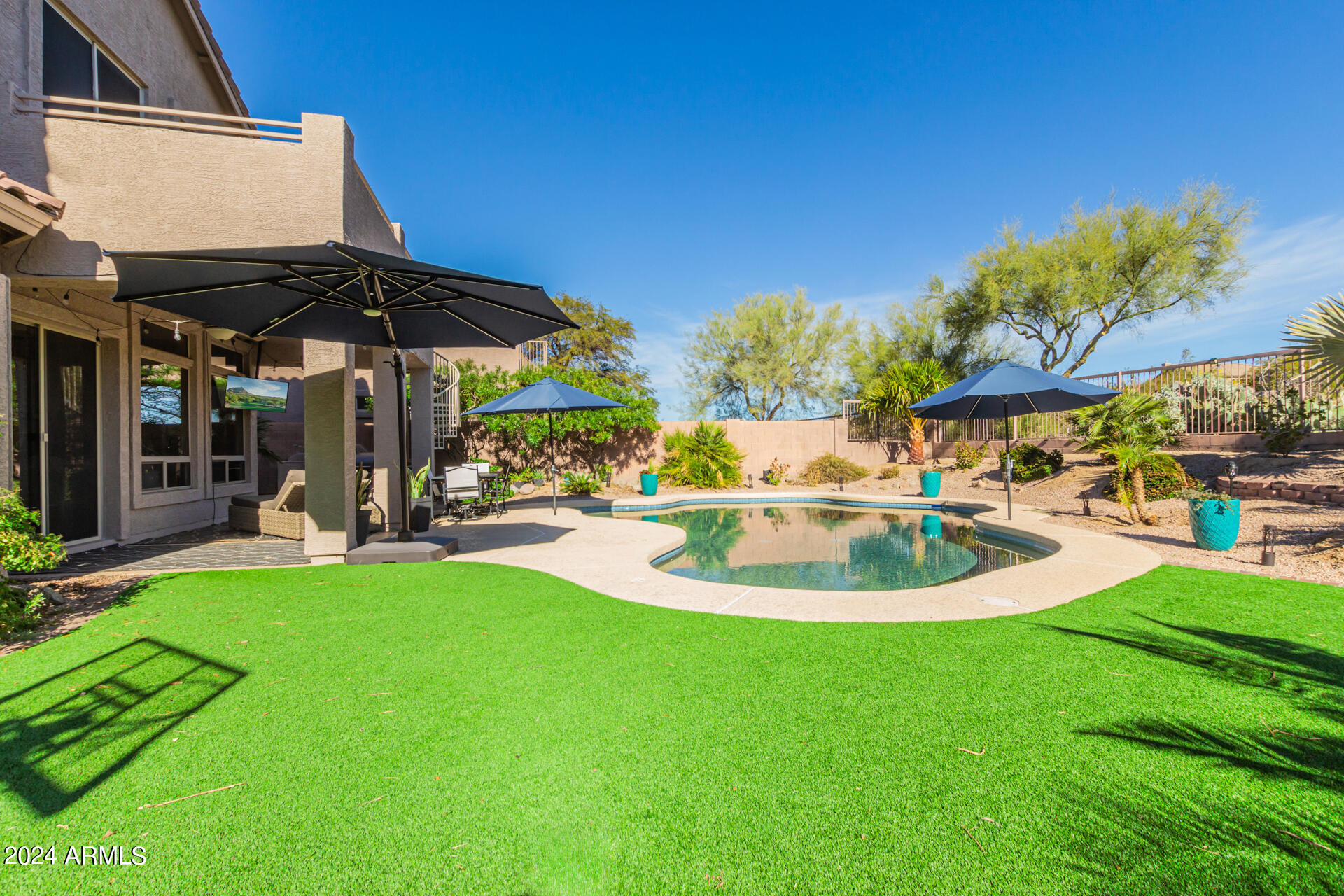 Stunning 4 bed + den, 3 bath, 3 car garage Blandford home in Las Sendas, in a gated community, situated on the 17th tee of the golf course is a dream come true! This move-in ready home has been lovingly upgraded with over $130,000 invested within the last two years, both inside the home and on the property grounds. Upgrades include 2 new HVAC units, new flooring, fresh interior paint, new appliances, new pool equipment, landscaping and so much more--ask your agent for the detailed upgrades list! Prepare to be impressed by an exquisite interior offering gleaming wood-look floor, high ceilings, soothing color palette, charming arched doorways, & dazzling light fixtures. Downstairs you'll find a bedroom AND full bath, and multiple entertainment spaces! (See more...) The impressive kitchen is the heart of the home, with plenty of counter space, granite counters, a center island complete w/ breakfast bar, a convenient built-in desk, multiple pantries, SS appliances, and fantastic views to your resort like backyard. The remarkable main retreat showcases soft carpet throughout, an adjoining office/bonus area (which could be converted to a fifth bedroom with a closet by it's future owner), private outdoor access with a spacious balcony and impressive views, a delightful two-way fireplace, & an immaculate ensuite with dual vanities. Two additional spacious bedrooms, one with a walk-in closet, and a full bath upstairs complete the indoor space. The spectacular backyard includes a sparkling pebble finish swimming pool, all new landscaping in front & back (under warranty) & a lovely deck displaying mountain views, complete the picture of this oasis! Homes and neighborhoods like this one are hard to come by. Minutes away from Saguaro Lake, Salt River and Tonto National Forest. Las Sendas features two community pools, spas, splash pad, multiple parks, tennis, pickleball, and bocce ball courts, walking/biking paths & groups/clubs for everyone!