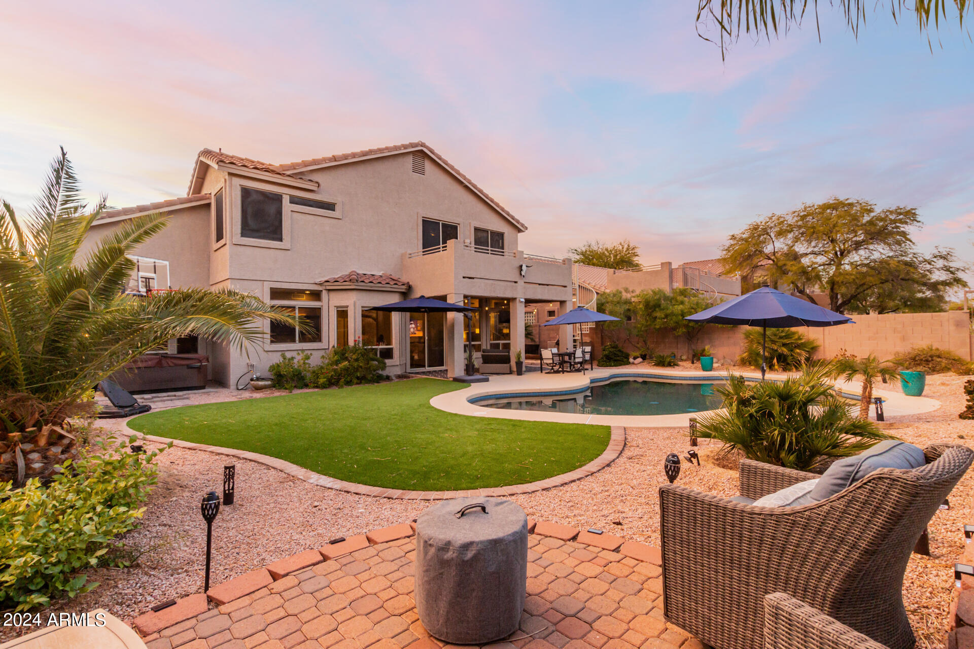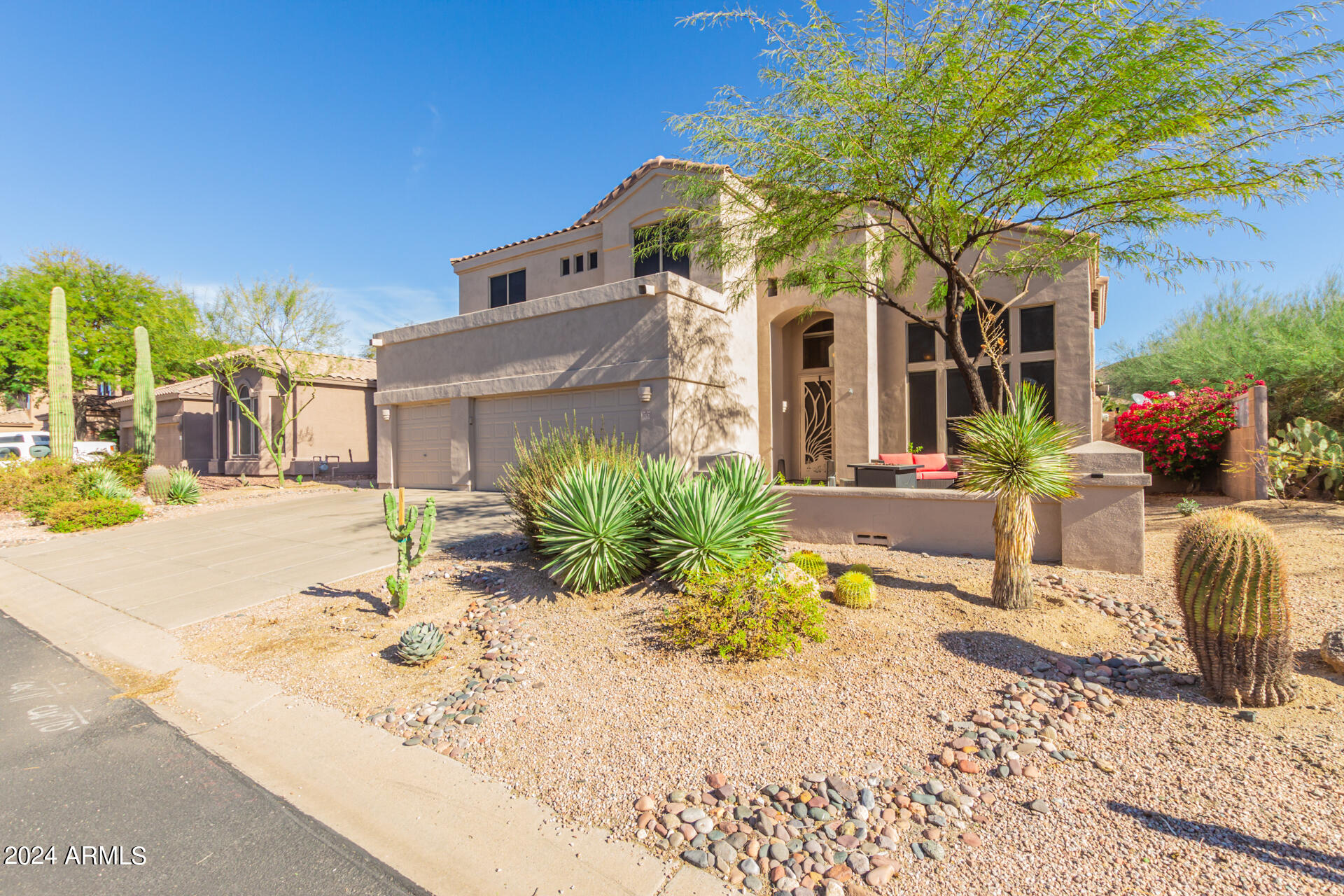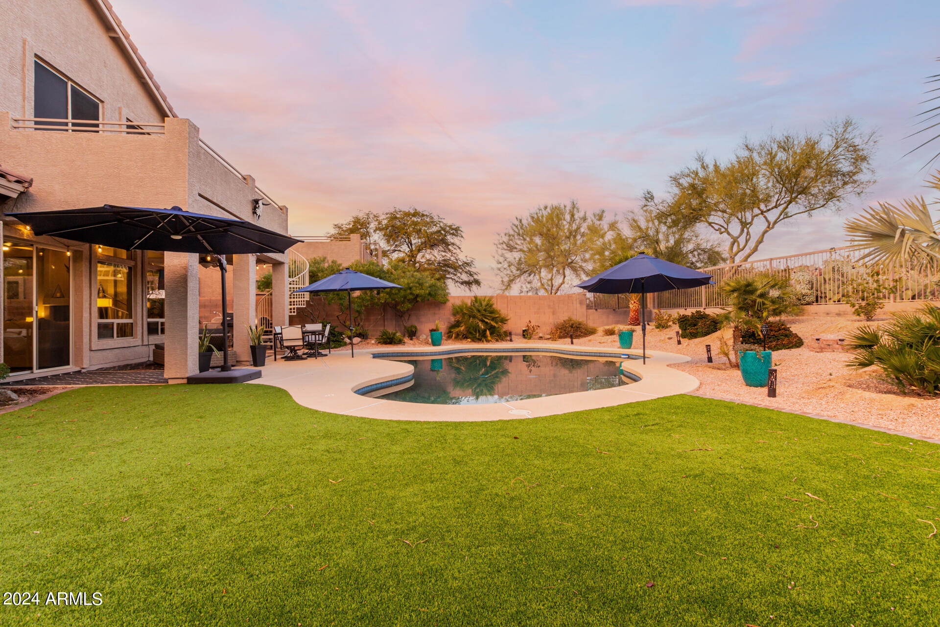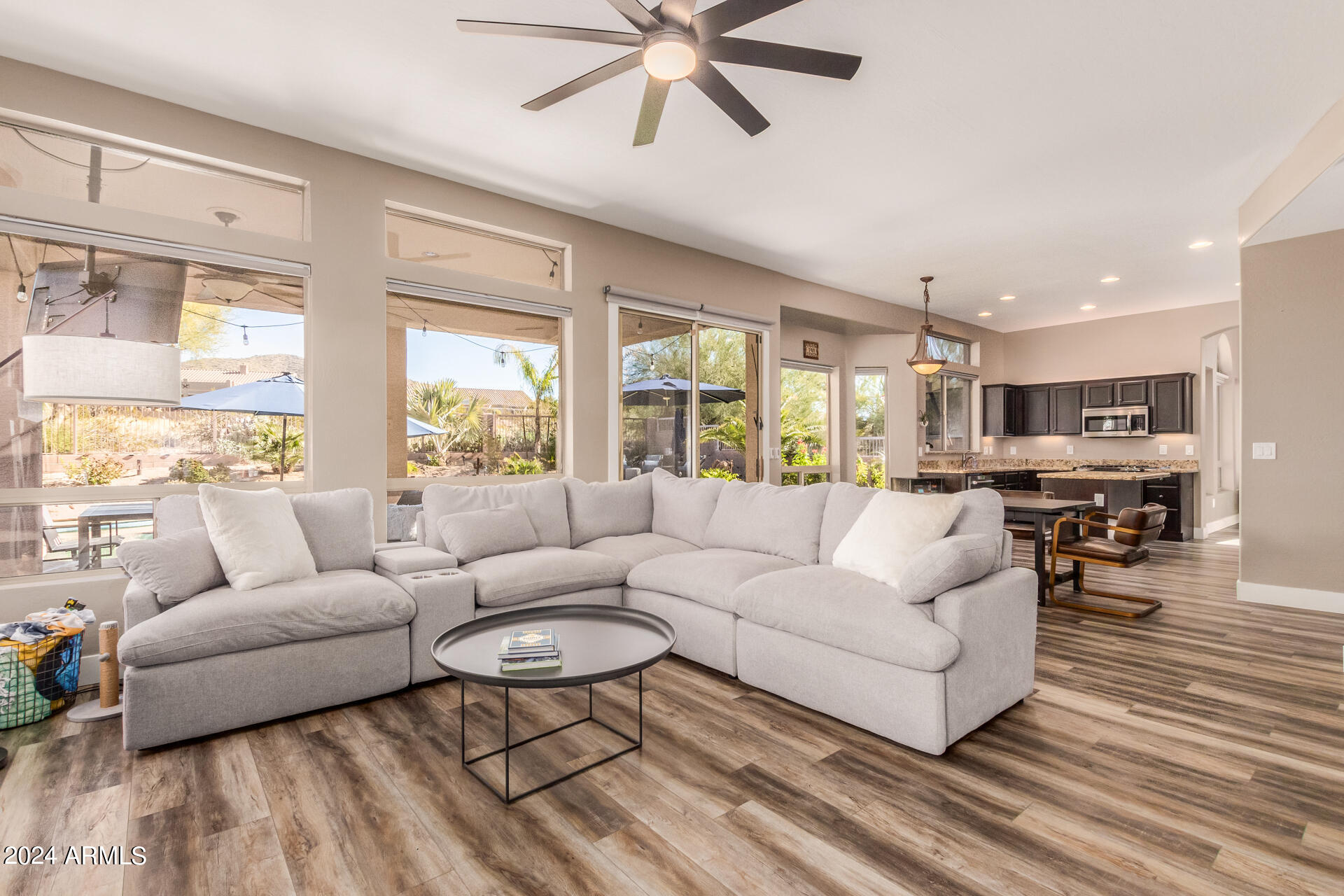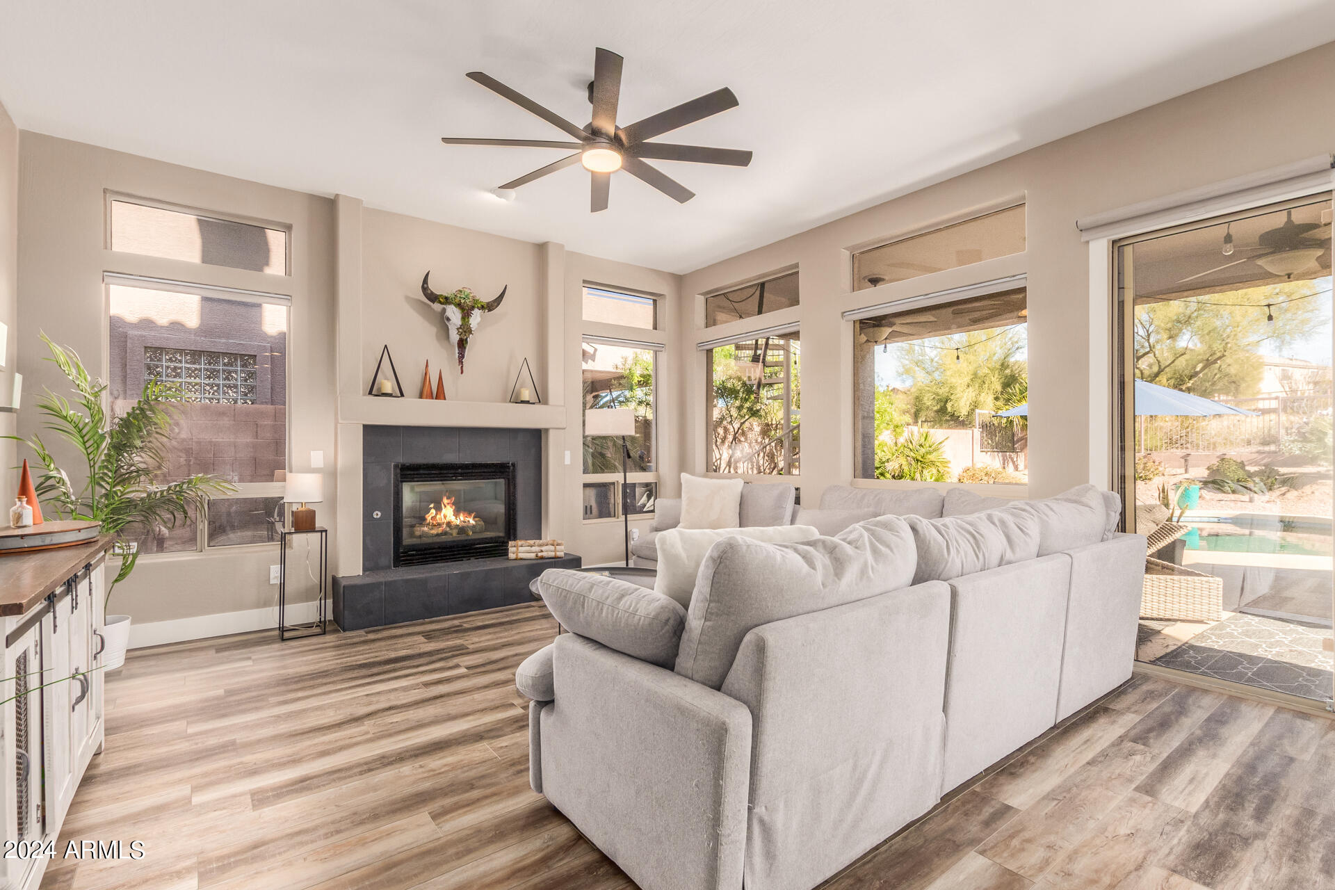 Stunning 4 bed + den, 3 bath, 3 car garage Blandford home in Las Sendas, in a gated community, situated on the 17th tee of the golf course is a dream come true! This move-in ready home has been lovingly upgraded with over $130,000 invested within the last two years, both inside the home and on the property grounds. Upgrades include 2 new HVAC units, new flooring, fresh interior paint, new appliances, new pool equipment, landscaping and so much more--ask your agent for the detailed upgrades list! Prepare to be impressed by an exquisite interior offering gleaming wood-look floor, high ceilings, soothing color palette, charming arched doorways, & dazzling light fixtures. Downstairs you'll find a bedroom AND full bath, and multiple entertainment spaces! (See more...) The impressive kitchen is the heart of the home, with plenty of counter space, granite counters, a center island complete w/ breakfast bar, a convenient built-in desk, multiple pantries, SS appliances, and fantastic views to your resort like backyard. The remarkable main retreat showcases soft carpet throughout, an adjoining office/bonus area (which could be converted to a fifth bedroom with a closet by it's future owner), private outdoor access with a spacious balcony and impressive views, a delightful two-way fireplace, & an immaculate ensuite with dual vanities. Two additional spacious bedrooms, one with a walk-in closet, and a full bath upstairs complete the indoor space. The spectacular backyard includes a sparkling pebble finish swimming pool, all new landscaping in front & back (under warranty) & a lovely deck displaying mountain views, complete the picture of this oasis! Homes and neighborhoods like this one are hard to come by. Minutes away from Saguaro Lake, Salt River and Tonto National Forest. Las Sendas features two community pools, spas, splash pad, multiple parks, tennis, pickleball, and bocce ball courts, walking/biking paths & groups/clubs for everyone!