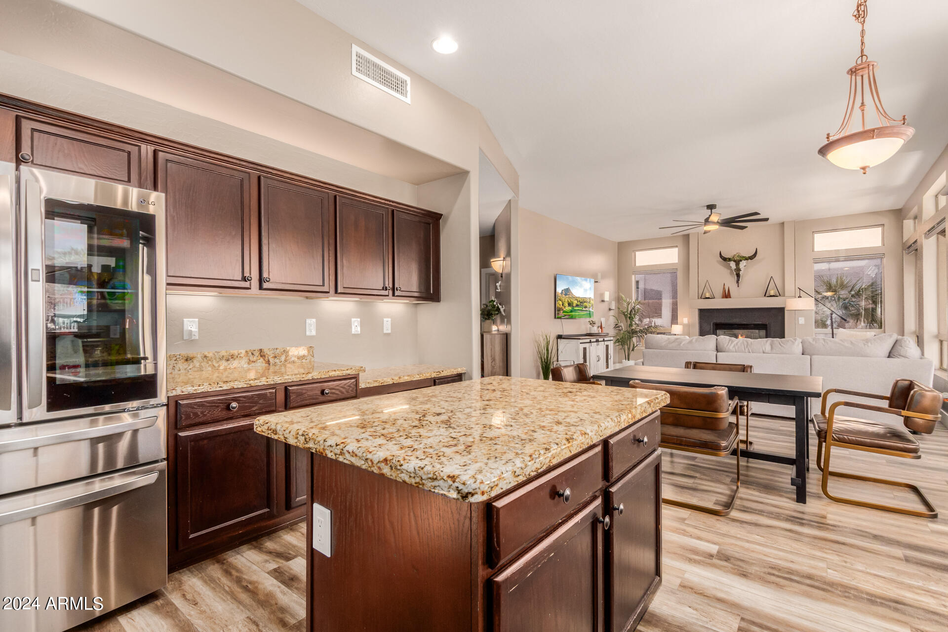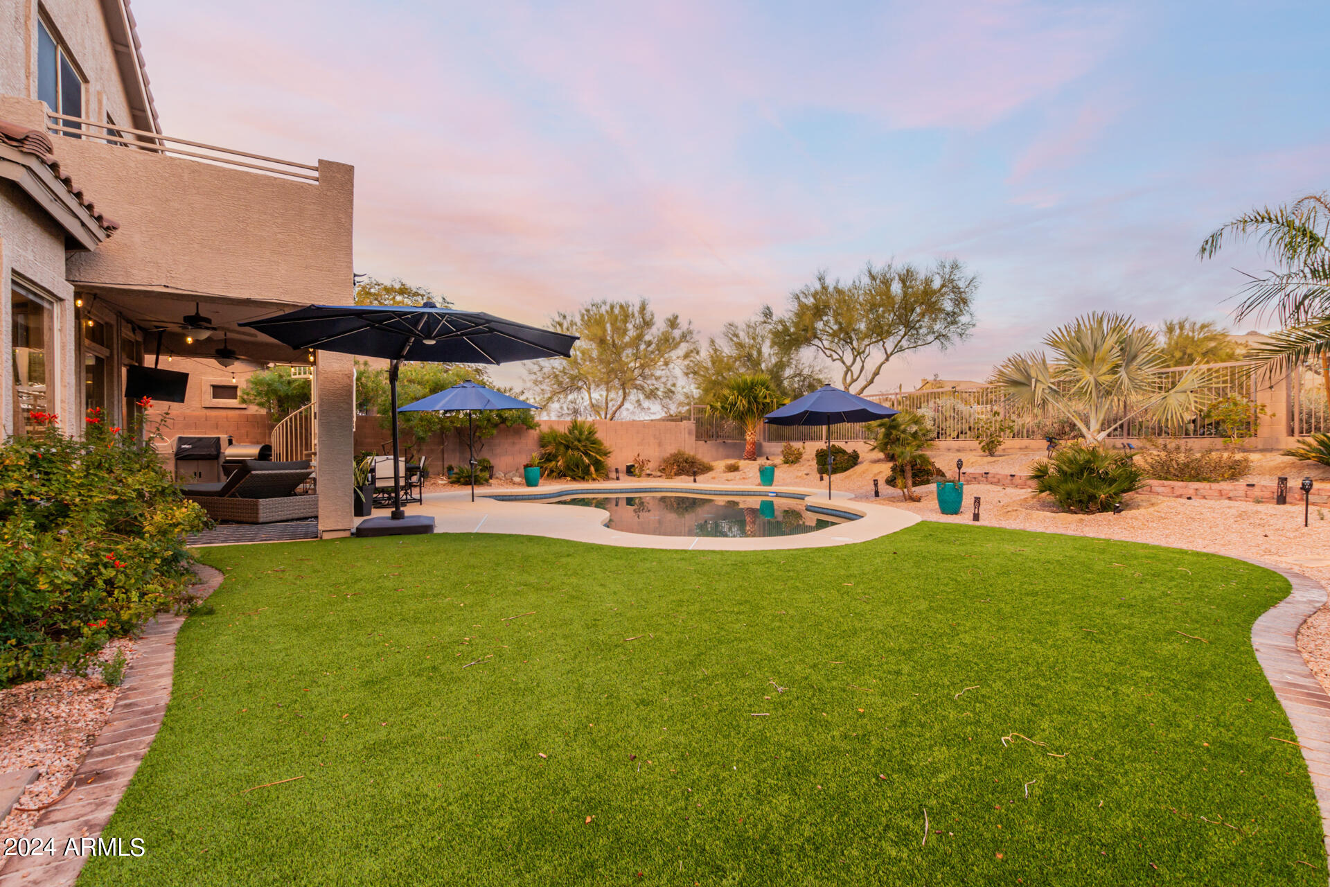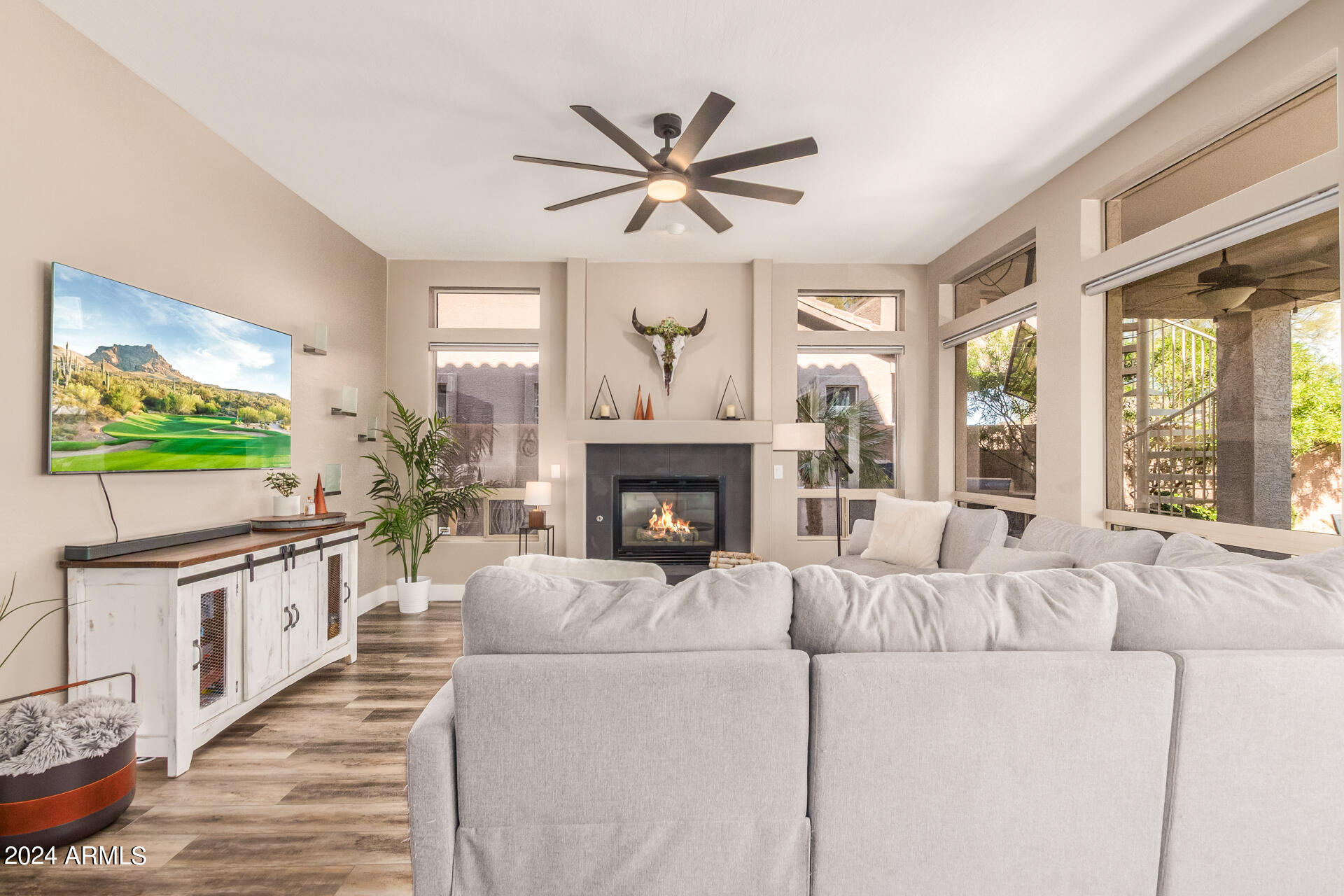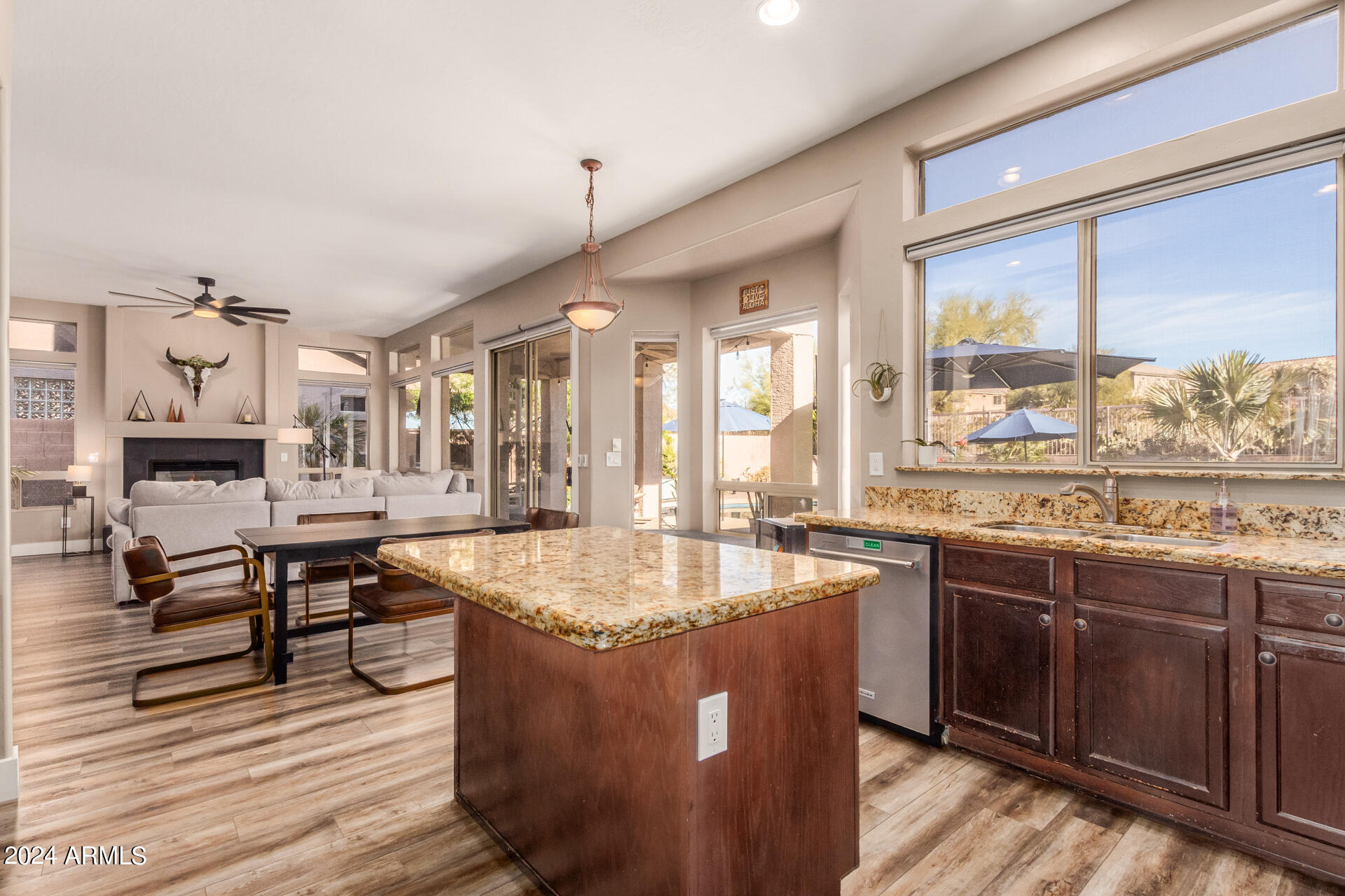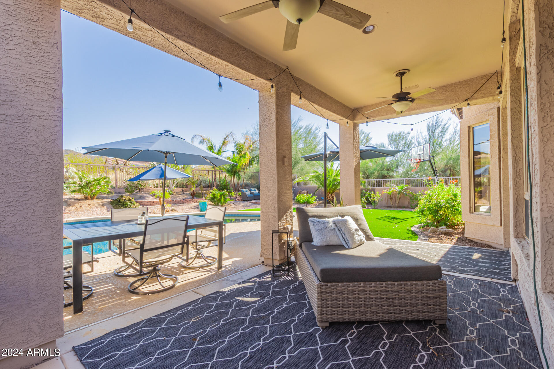 Stunning 4 bed + den, 3 bath, 3 car garage Blandford home in Las Sendas, in a gated community, situated on the 17th tee of the golf course is a dream come true! This move-in ready home has been lovingly upgraded with over $130,000 invested within the last two years, both inside the home and on the property grounds. Upgrades include 2 new HVAC units, new flooring, fresh interior paint, new appliances, new pool equipment, landscaping and so much more--ask your agent for the detailed upgrades list! Prepare to be impressed by an exquisite interior offering gleaming wood-look floor, high ceilings, soothing color palette, charming arched doorways, & dazzling light fixtures. Downstairs you'll find a bedroom AND full bath, and multiple entertainment spaces! (See more...) The impressive kitchen is the heart of the home, with plenty of counter space, granite counters, a center island complete w/ breakfast bar, a convenient built-in desk, multiple pantries, SS appliances, and fantastic views to your resort like backyard. The remarkable main retreat showcases soft carpet throughout, an adjoining office/bonus area (which could be converted to a fifth bedroom with a closet by it's future owner), private outdoor access with a spacious balcony and impressive views, a delightful two-way fireplace, & an immaculate ensuite with dual vanities. Two additional spacious bedrooms, one with a walk-in closet, and a full bath upstairs complete the indoor space. The spectacular backyard includes a sparkling pebble finish swimming pool, all new landscaping in front & back (under warranty) & a lovely deck displaying mountain views, complete the picture of this oasis! Homes and neighborhoods like this one are hard to come by. Minutes away from Saguaro Lake, Salt River and Tonto National Forest. Las Sendas features two community pools, spas, splash pad, multiple parks, tennis, pickleball, and bocce ball courts, walking/biking paths & groups/clubs for everyone!