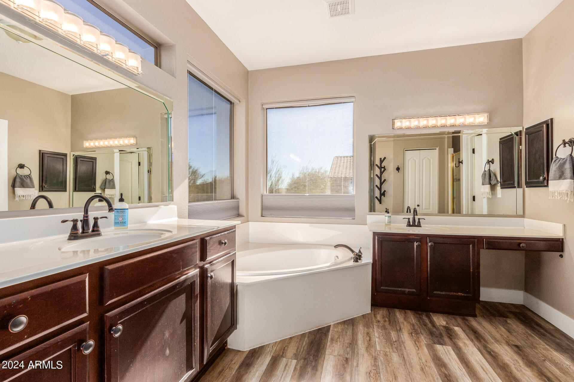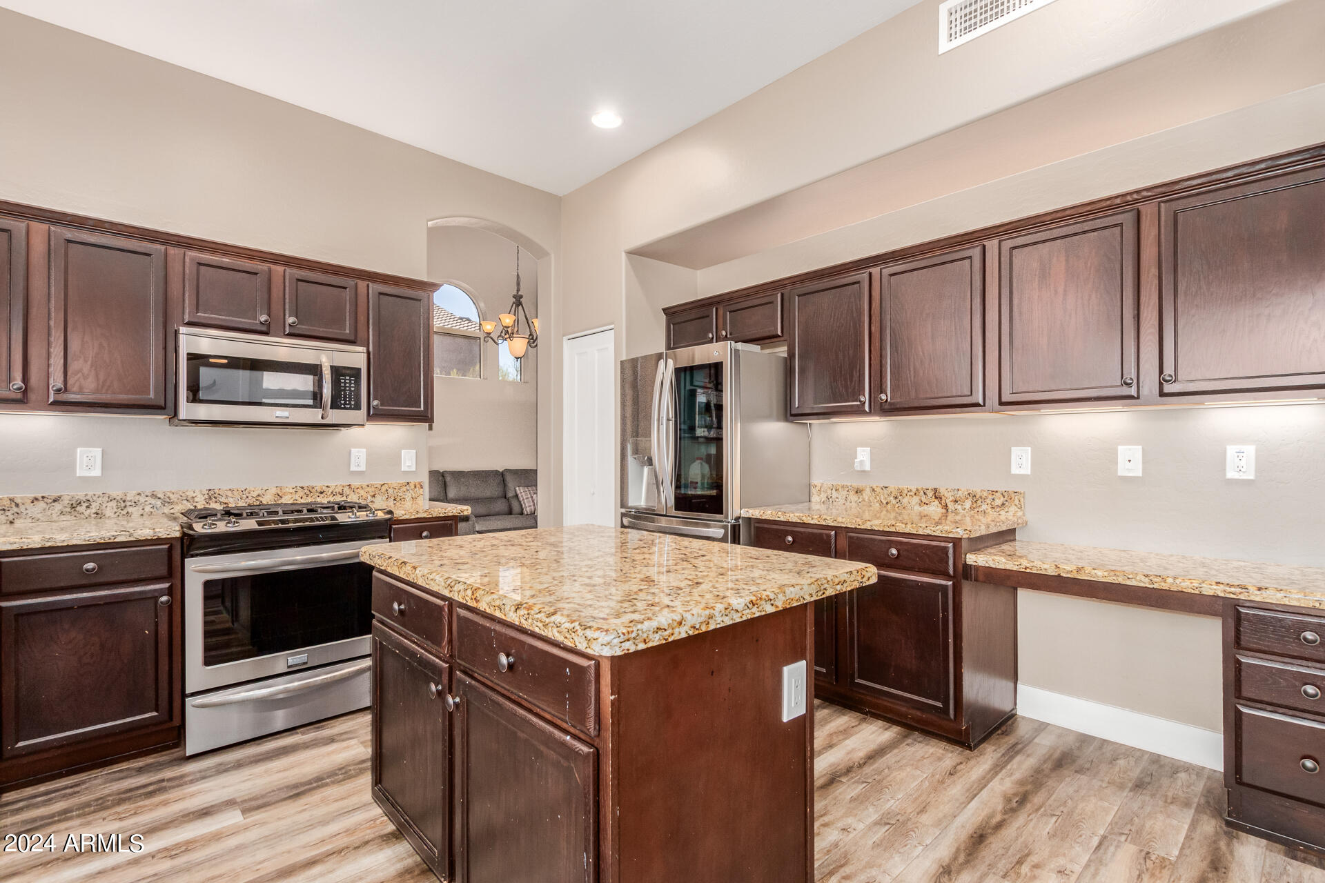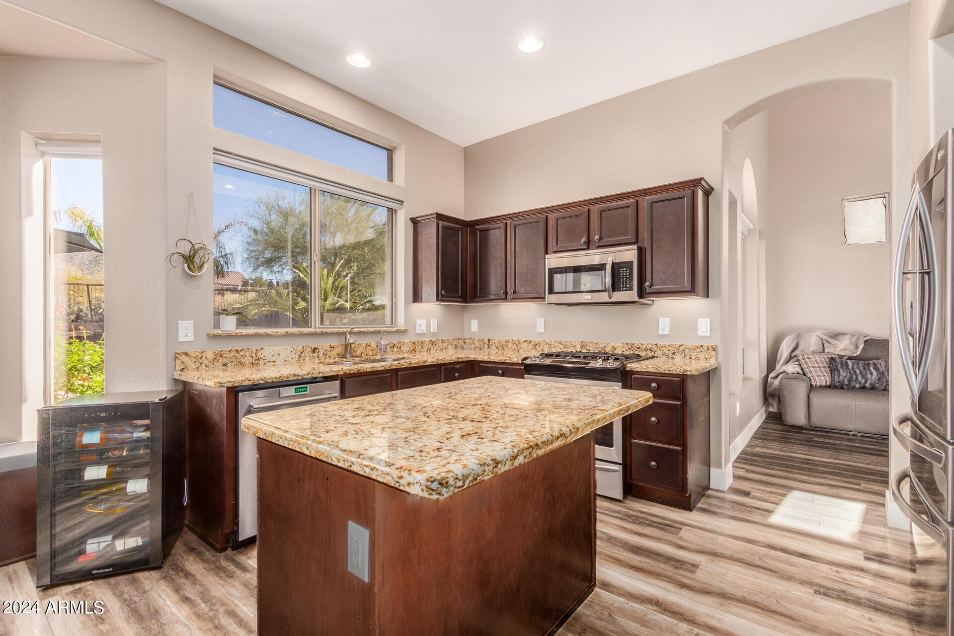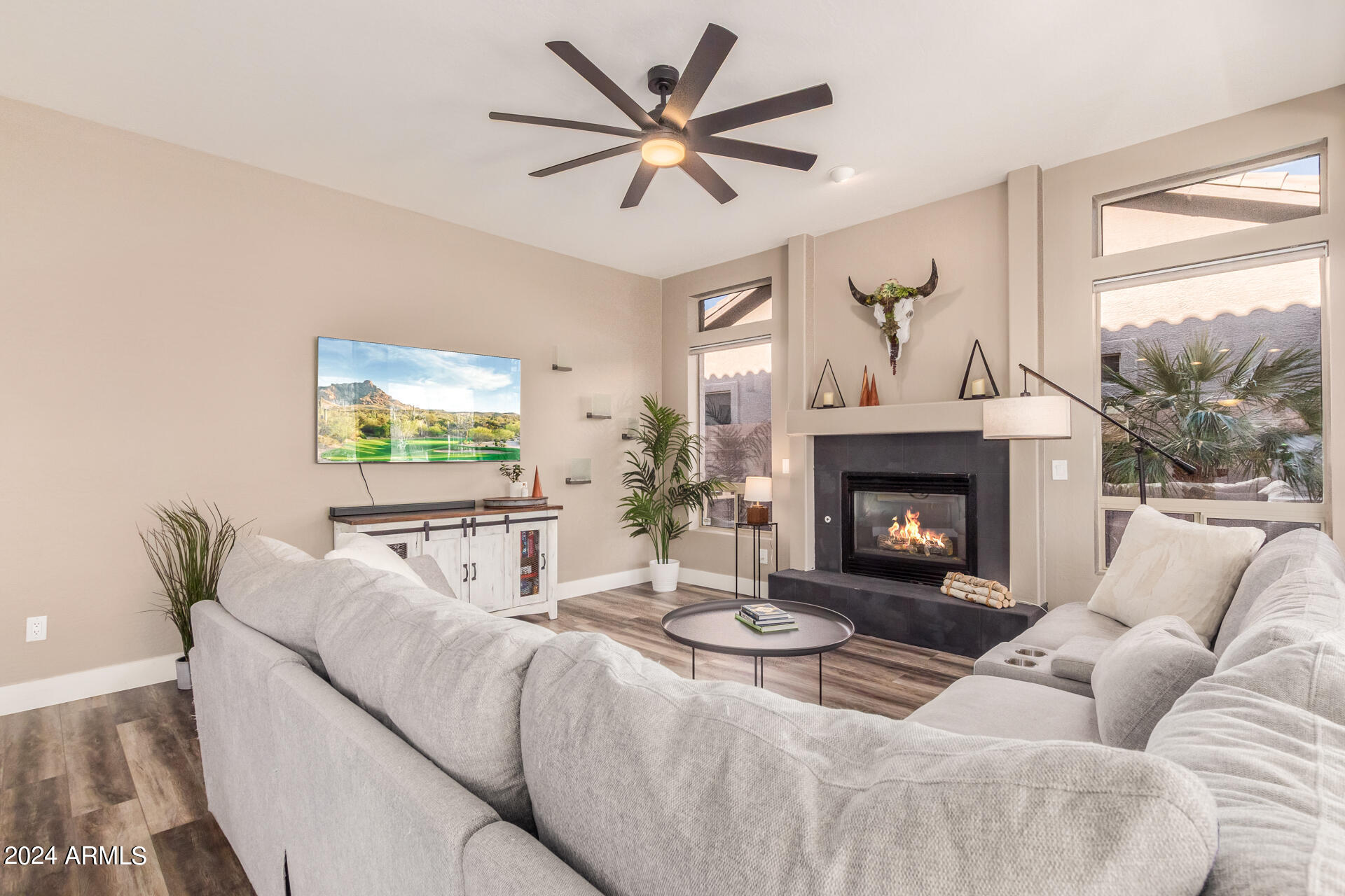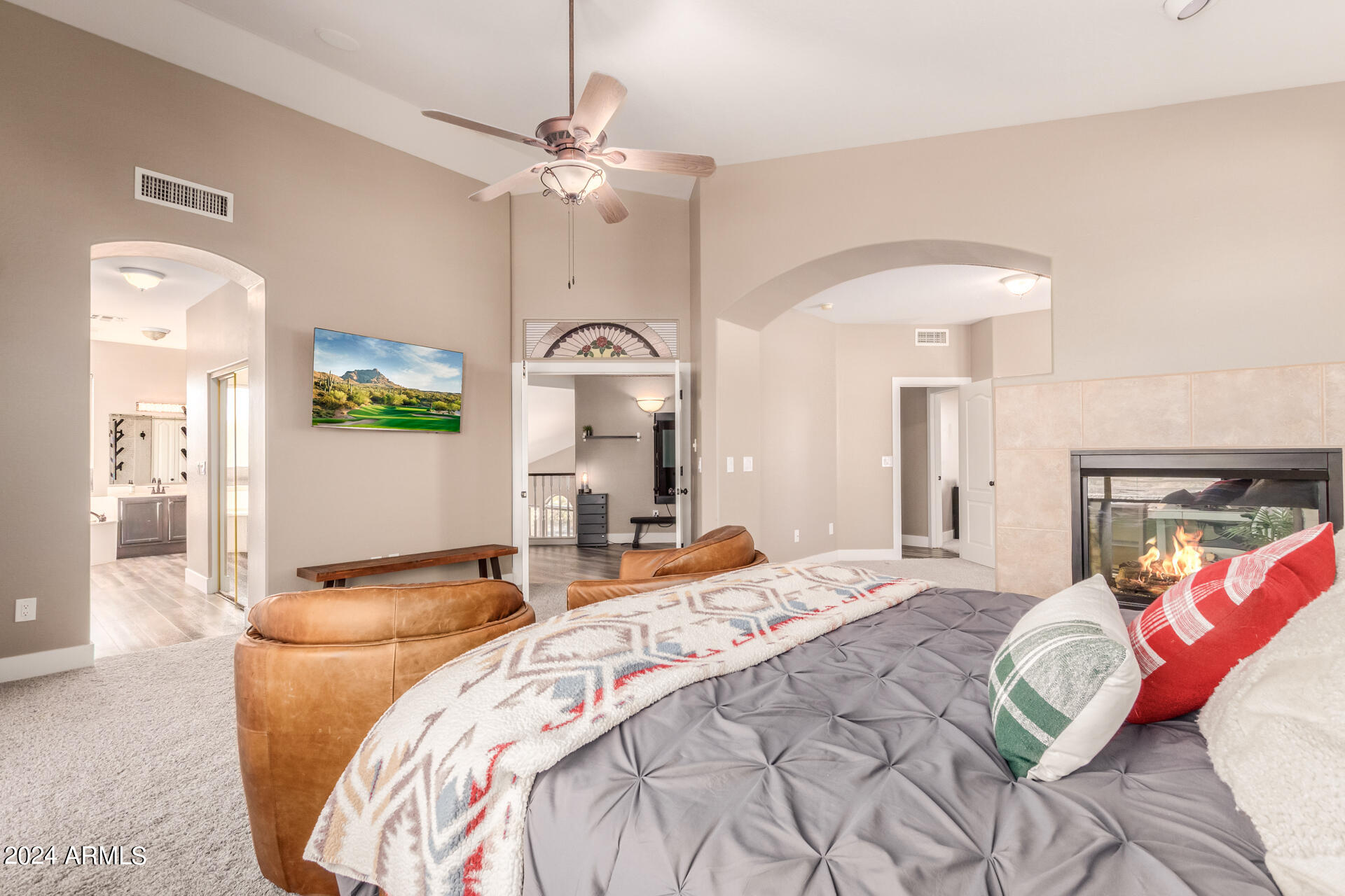 Stunning 4 bed + den, 3 bath, 3 car garage Blandford home in Las Sendas, in a gated community, situated on the 17th tee of the golf course is a dream come true! This move-in ready home has been lovingly upgraded with over $130,000 invested within the last two years, both inside the home and on the property grounds. Upgrades include 2 new HVAC units, new flooring, fresh interior paint, new appliances, new pool equipment, landscaping and so much more--ask your agent for the detailed upgrades list! Prepare to be impressed by an exquisite interior offering gleaming wood-look floor, high ceilings, soothing color palette, charming arched doorways, & dazzling light fixtures. Downstairs you'll find a bedroom AND full bath, and multiple entertainment spaces! (See more...) The impressive kitchen is the heart of the home, with plenty of counter space, granite counters, a center island complete w/ breakfast bar, a convenient built-in desk, multiple pantries, SS appliances, and fantastic views to your resort like backyard. The remarkable main retreat showcases soft carpet throughout, an adjoining office/bonus area (which could be converted to a fifth bedroom with a closet by it's future owner), private outdoor access with a spacious balcony and impressive views, a delightful two-way fireplace, & an immaculate ensuite with dual vanities. Two additional spacious bedrooms, one with a walk-in closet, and a full bath upstairs complete the indoor space. The spectacular backyard includes a sparkling pebble finish swimming pool, all new landscaping in front & back (under warranty) & a lovely deck displaying mountain views, complete the picture of this oasis! Homes and neighborhoods like this one are hard to come by. Minutes away from Saguaro Lake, Salt River and Tonto National Forest. Las Sendas features two community pools, spas, splash pad, multiple parks, tennis, pickleball, and bocce ball courts, walking/biking paths & groups/clubs for everyone!