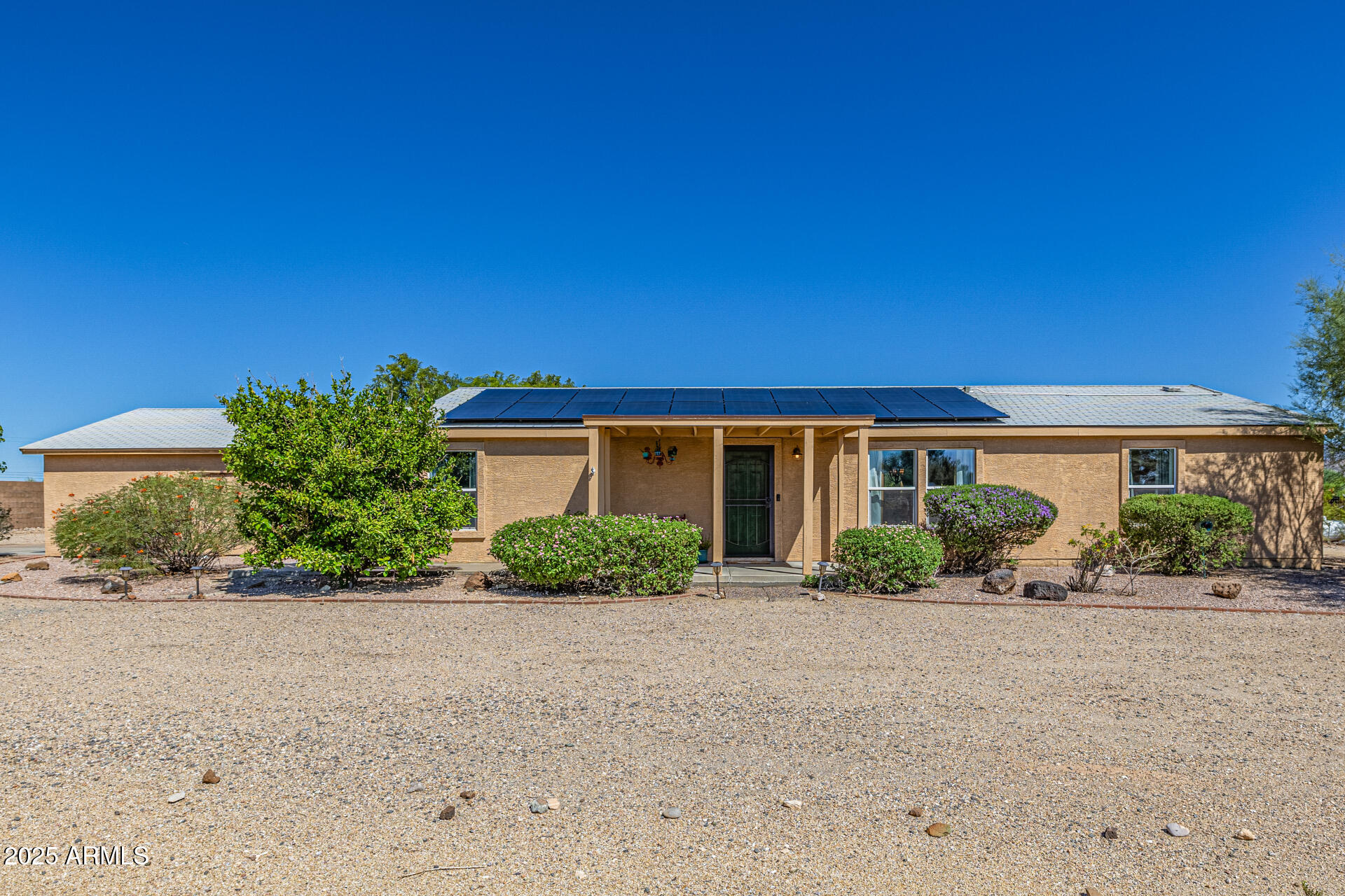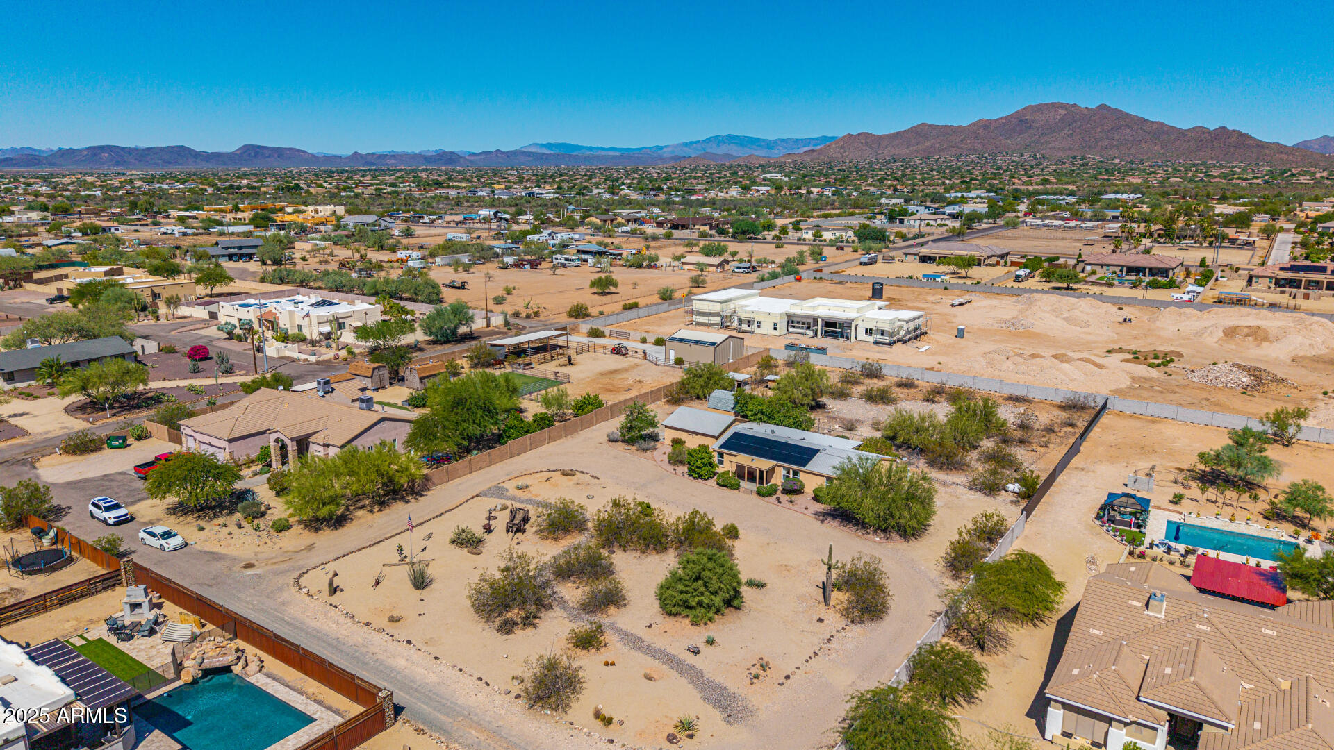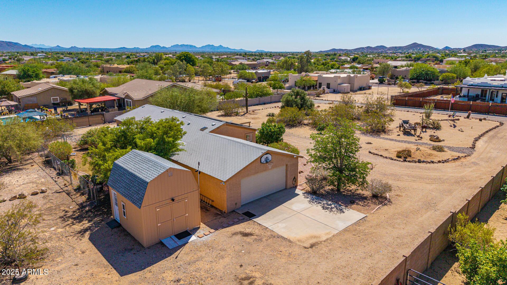 Beautiful, impeccably maintained ranch-style home set on over an acre with mountain views, no HOA, and thoughtful UPGRADES throughout! Enter a spacious, open-concept living area with vaulted ceilings and abundant natural light. The eat-in kitchen with breakfast bar is perfect for casual dining or entertaining, while the split floor plan ensures each bedroom has privacy, its own walk-in closet, and NEW carpet. The primary suite is a serene retreat, complete with a double vanity and walk-in shower. Step outside to a private backyard oasis featuring an expansive covered patio with a heated spa, ideal for relaxation. The fenced backyard offers natural grass and additional fenced area ideal for chickens, goats, or horses! Enjoy the benefits of a versatile workshop with attic space and A/C, along with a 2-car garage complete with a sink, workbenches, and shelving. Additional features include RV hookups (30-amp on the east side and 50-amp in the garage), leased solar system to help energy costs, RO system, NEW HVAC unit, and NEW tankless water heater. With abundant space and endless possibilities, this Desert Hills home is a rare find. Don't miss your chance to make it yours!