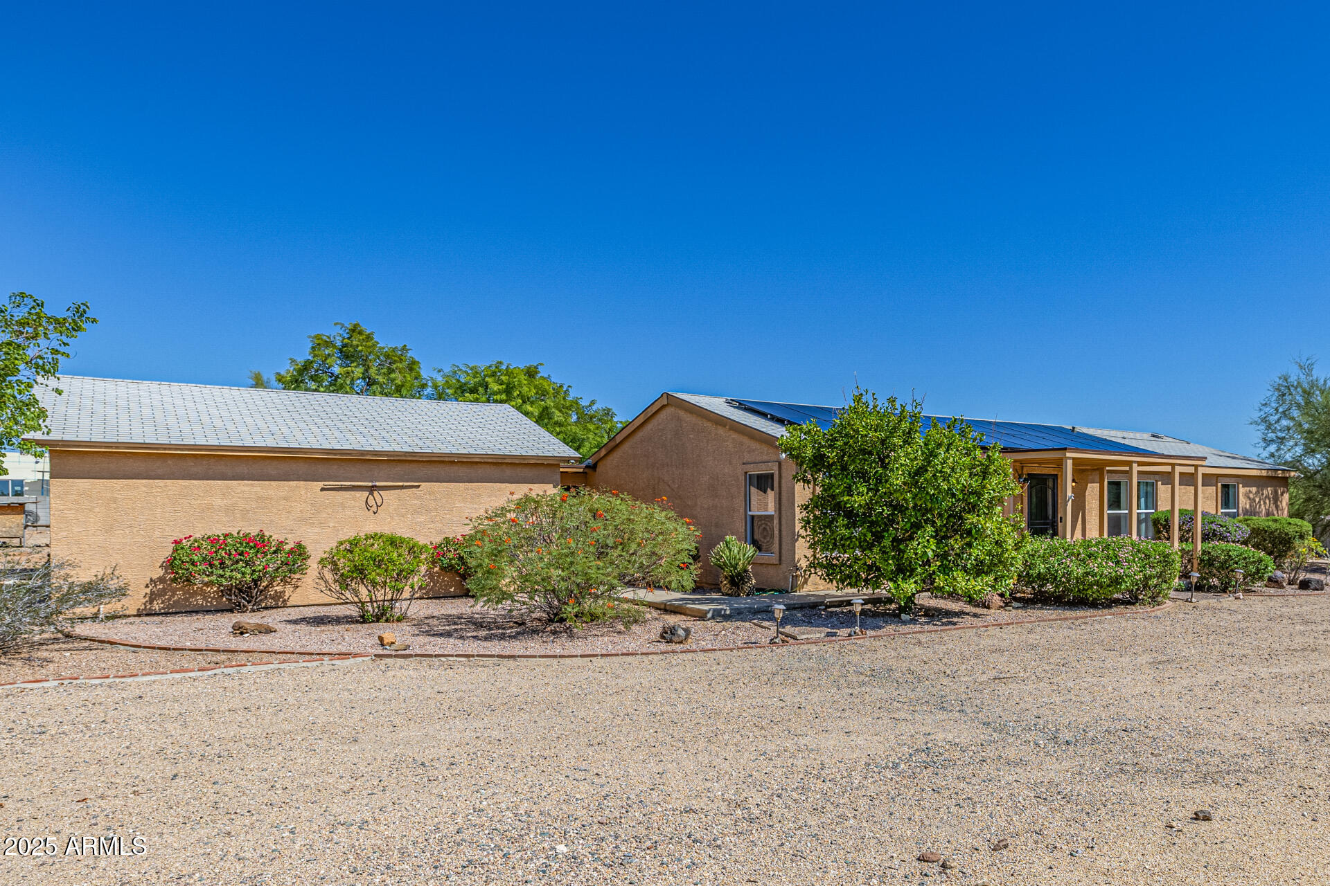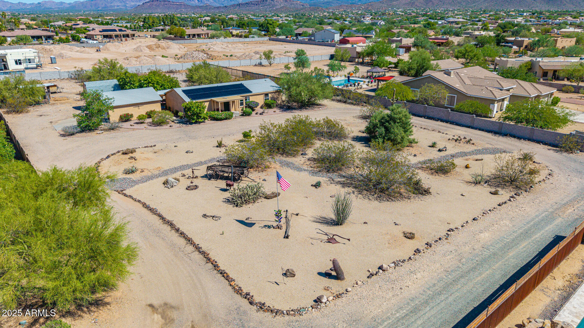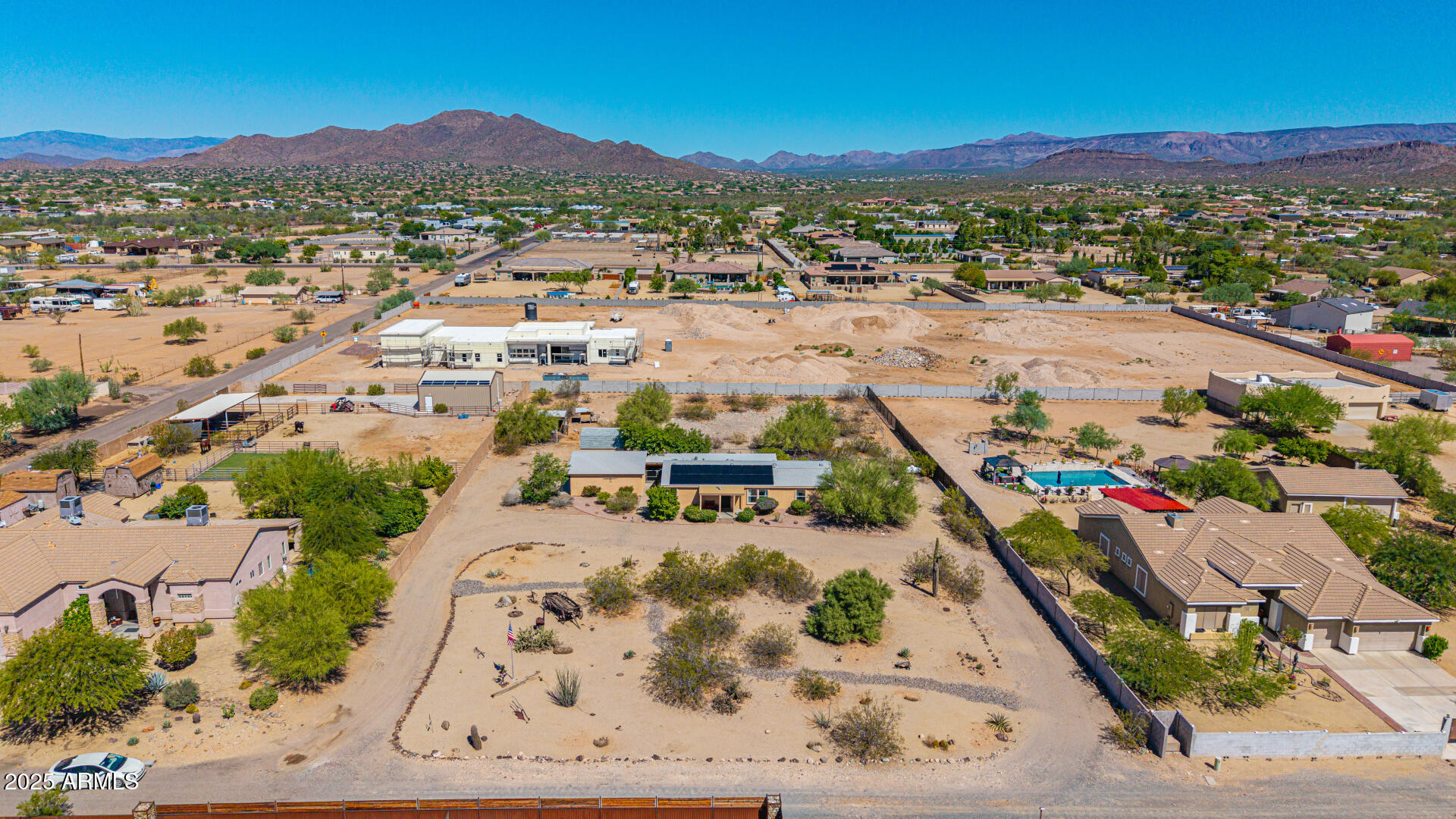 Beautiful, impeccably maintained ranch-style home set on over an acre with mountain views, no HOA, and thoughtful UPGRADES throughout! Enter a spacious, open-concept living area with vaulted ceilings and abundant natural light. The eat-in kitchen with breakfast bar is perfect for casual dining or entertaining, while the split floor plan ensures each bedroom has privacy, its own walk-in closet, and NEW carpet. The primary suite is a serene retreat, complete with a double vanity and walk-in shower. Step outside to a private backyard oasis featuring an expansive covered patio with a heated spa, ideal for relaxation. The fenced backyard offers natural grass and additional fenced area ideal for chickens, goats, or horses! Enjoy the benefits of a versatile workshop with attic space and A/C, along with a 2-car garage complete with a sink, workbenches, and shelving. Additional features include RV hookups (30-amp on the east side and 50-amp in the garage), leased solar system to help energy costs, RO system, NEW HVAC unit, and NEW tankless water heater. With abundant space and endless possibilities, this Desert Hills home is a rare find. Don't miss your chance to make it yours!