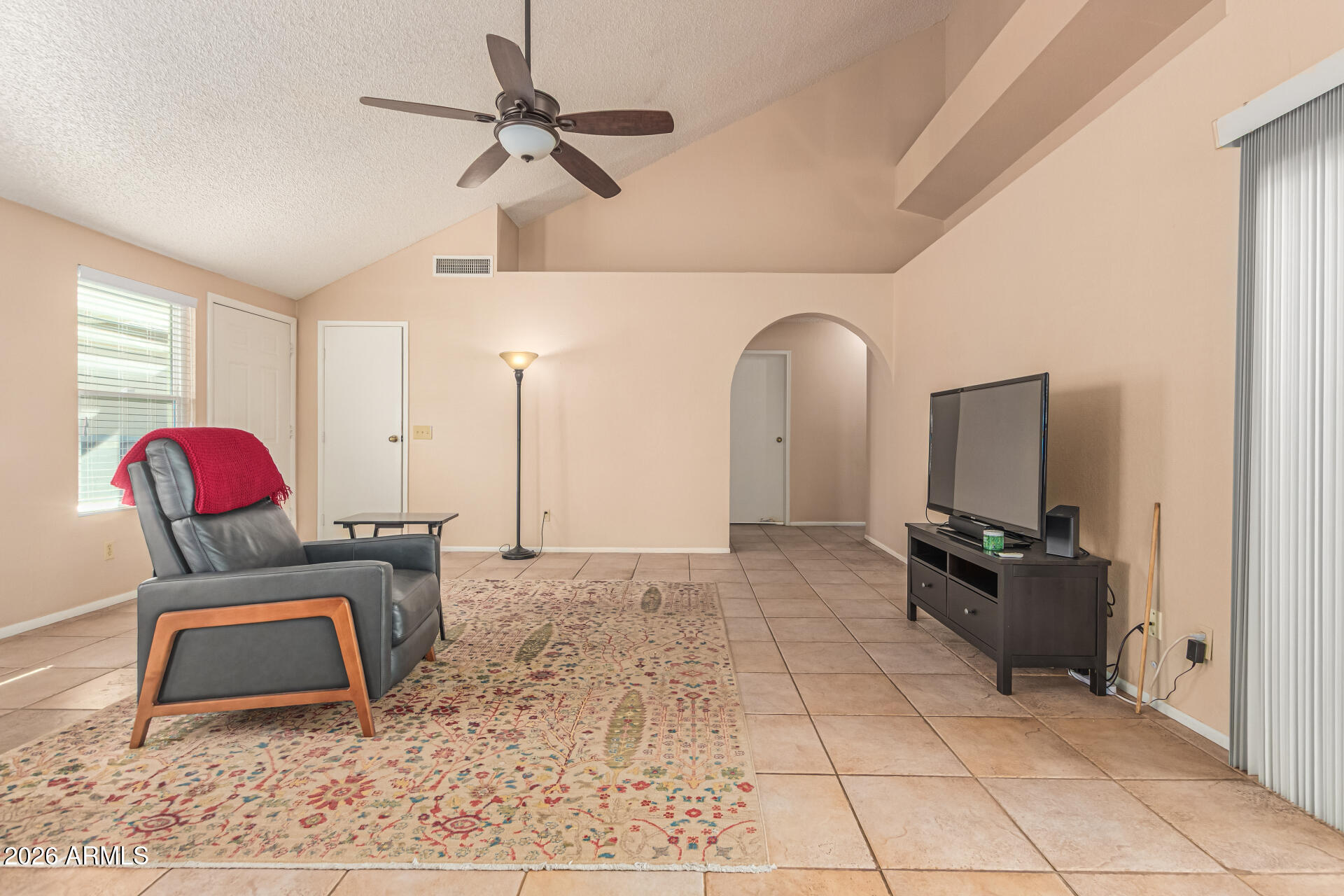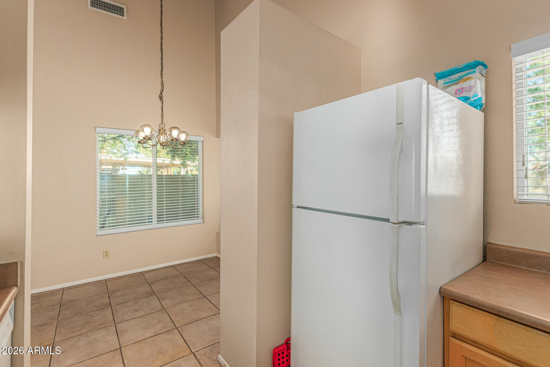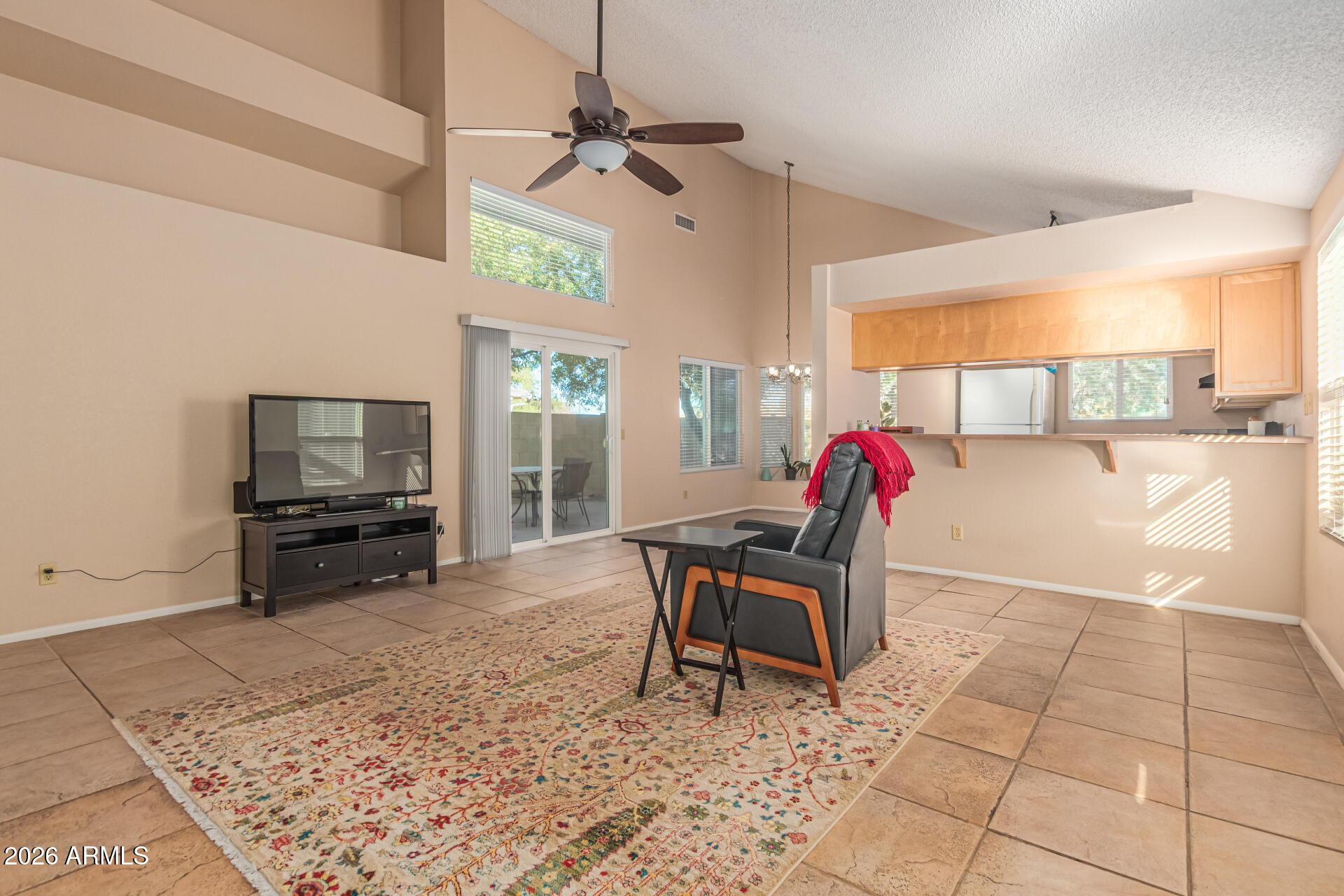 Beautiful home with large-format tile flooring flows throughout the main living spaces, with plush carpeted bedrooms for added comfort--tile even extends to the spacious patio, perfect for indoor-outdoor living. Situated on a desirable north/south lot backing to a lush greenbelt, this home offers privacy, mature trees, and a generously sized backyard. The kitchen features warm maple cabinetry and an open pass-through to the dining area, ideal for entertaining or everyday living. Recent upgrades include a newer roof and exterior paint. Enjoy being just minutes from fantastic shopping and dining, with quick access to the 101 and 202 freeways for an easy commute.