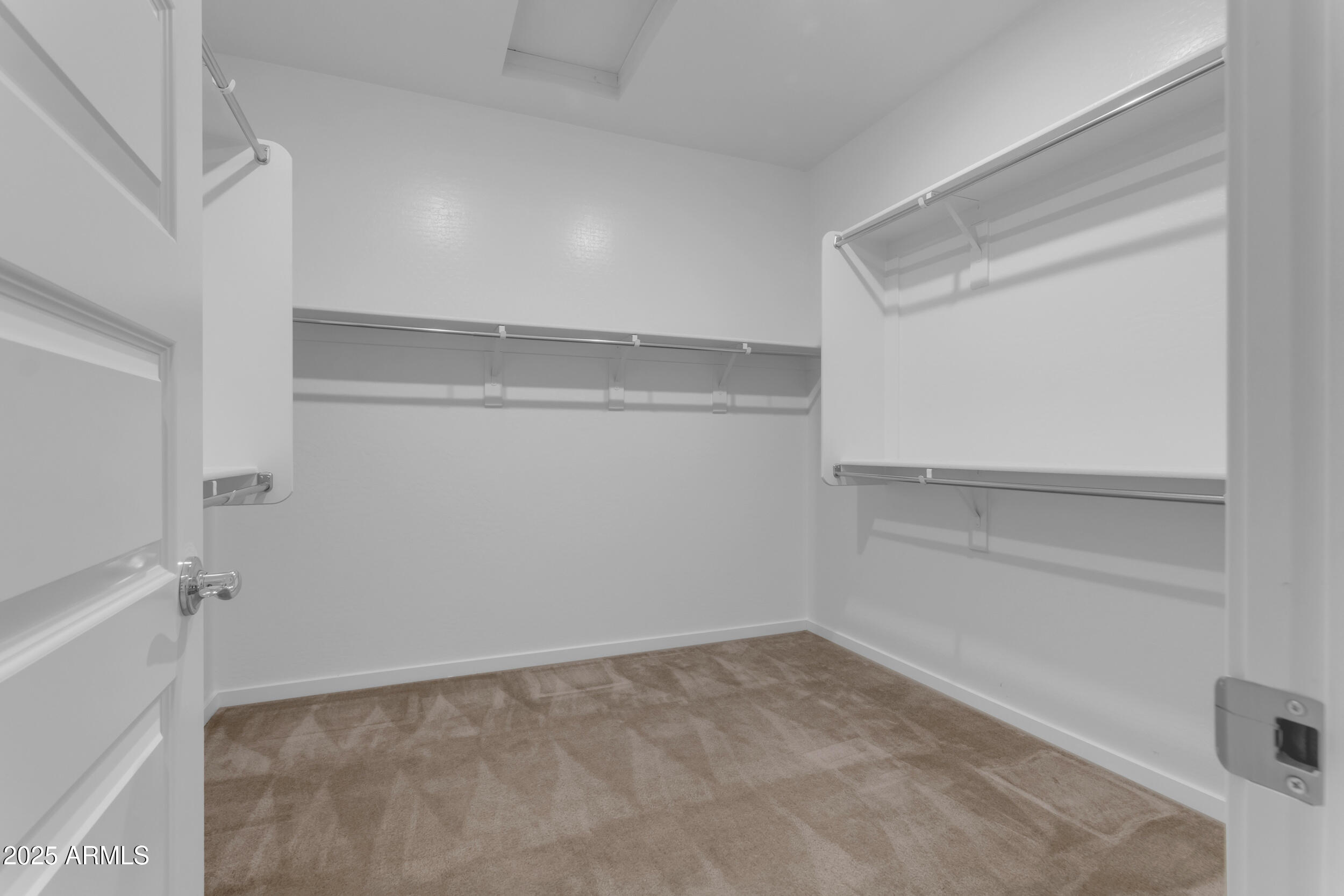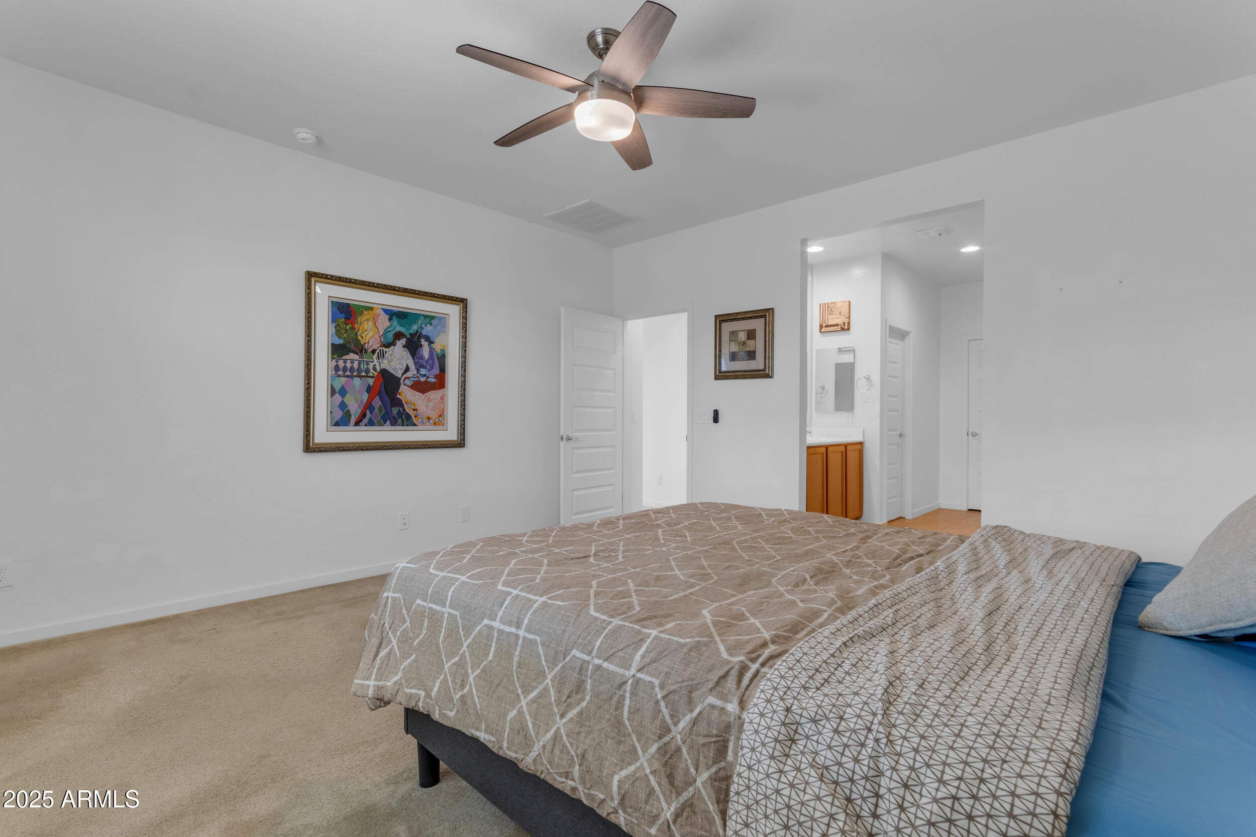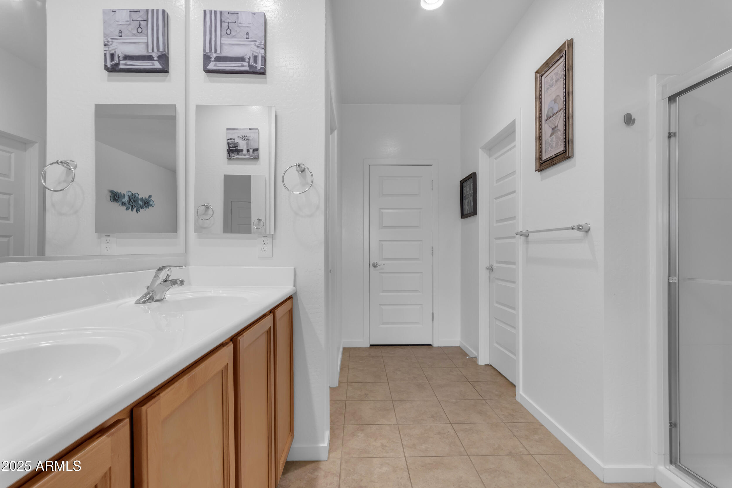 The split floor plan creates a private retreat in the oversized primary bedroom, which easily accommodates large furniture. The en-suite bathroom offers gentleman's height counters, double sinks, a large walk-in shower, and a giant walk-in closet. Secondary bedrooms are well sized, with a hall bathroom positioned between them that includes double sinks and a spacious linen closet.
