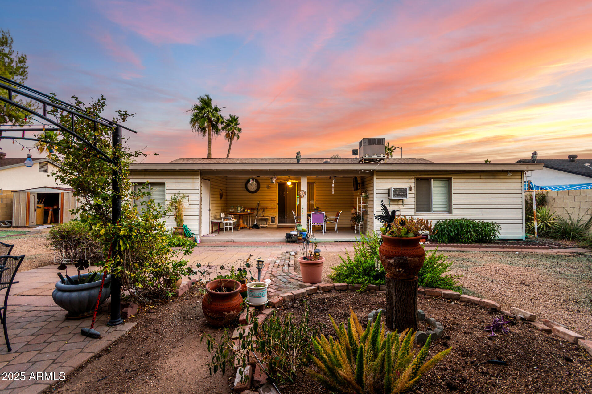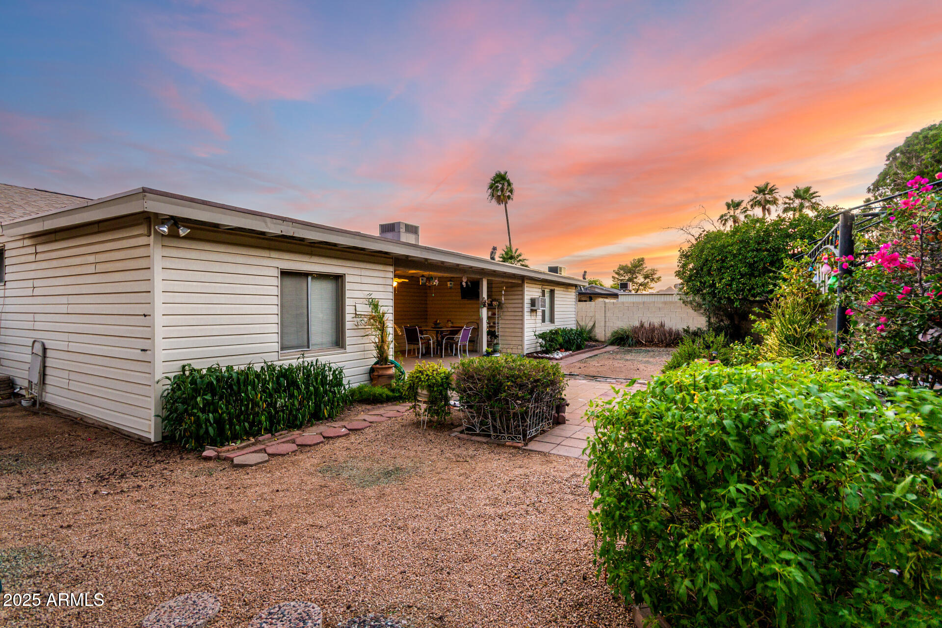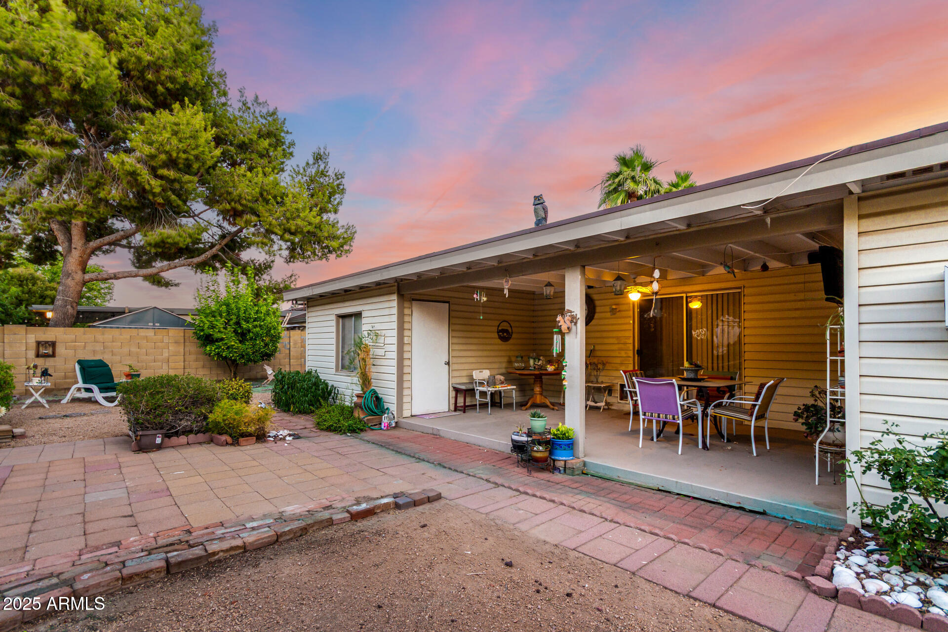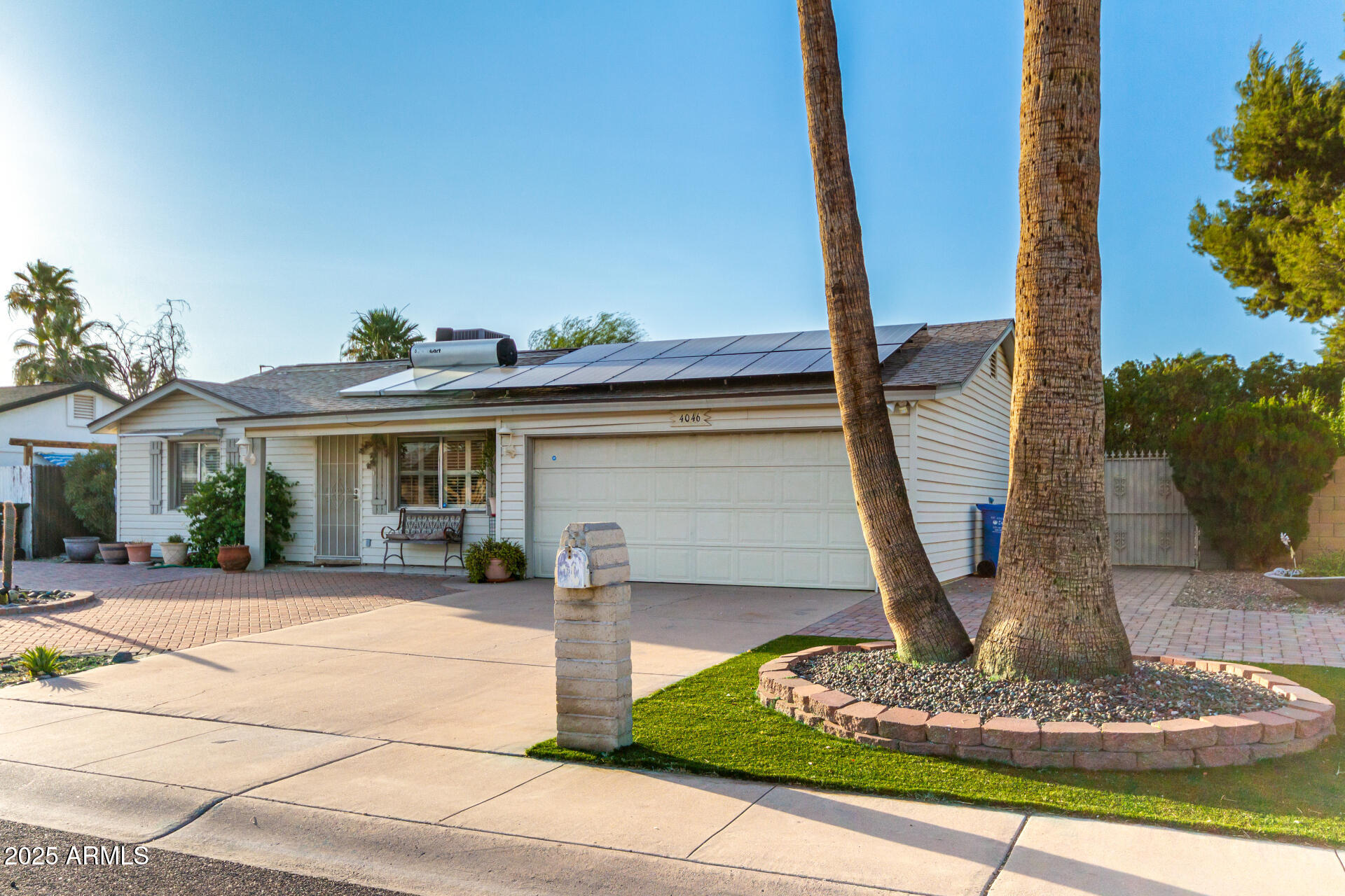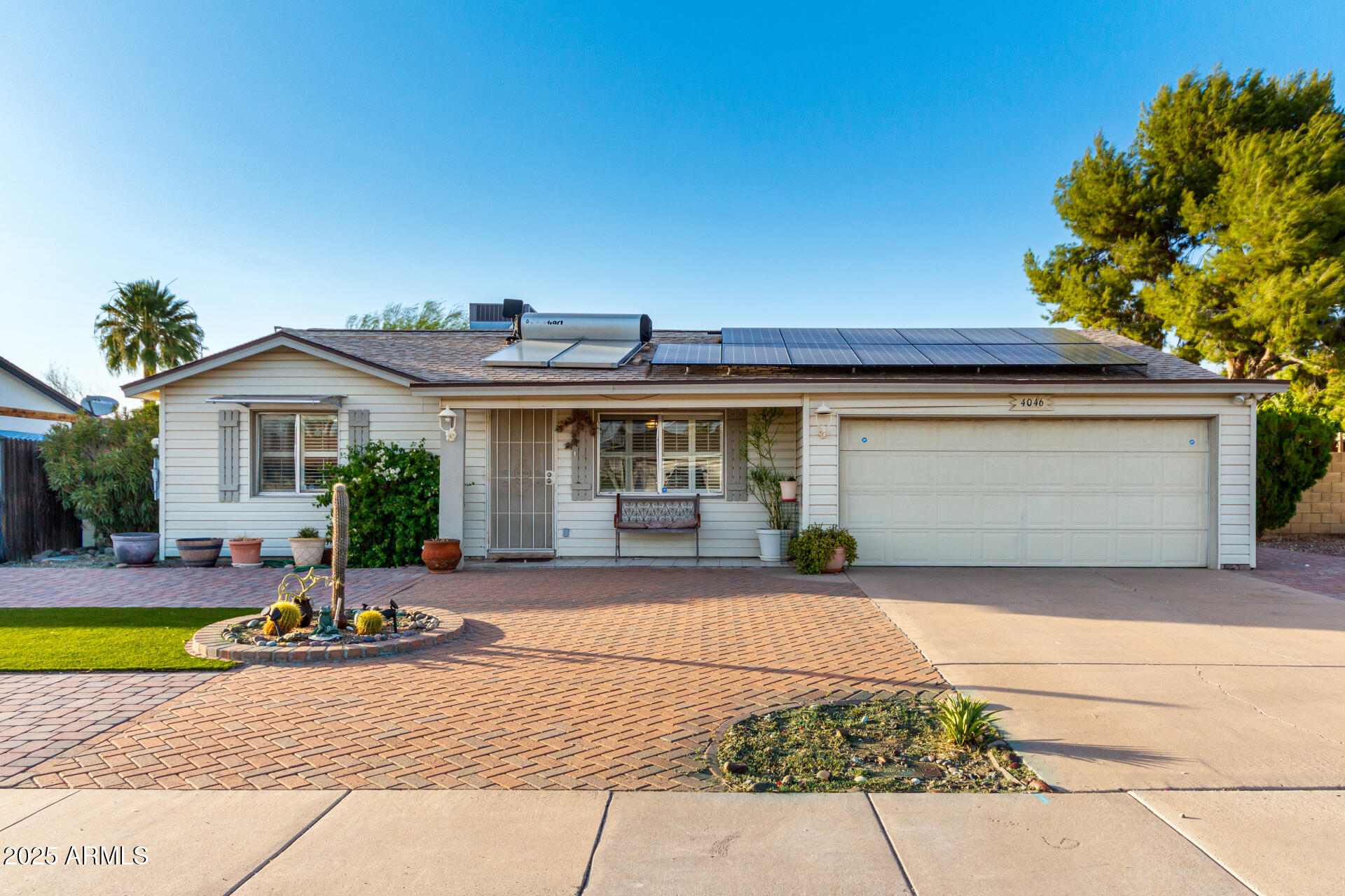 Includes APS solar panels with no lease, system is owned and maintained by APS with $49.99 monthly credit to homeowner. No cost to transfer to buyer. Great location is ready to move in! This charming home showcases an ample front yard with a no-fuss landscape, pavers galore, and a 2 car garage. Inside, you're welcomed by a bright living room. Discover tile & laminated floors, plantation shutters, and a spacious family/dining room. The kitchen features wood cabinets, built-in appliances, granite tile counters, ceramic tile backsplash, and a peninsula w/breakfast bar. The primary room has a sizable sitting/hobby room and a bathroom. The backyard offers a covered patio, multiple seating areas, and abundant greenery.Close to markets, restaurants, and Village Plaza. Don't miss out!