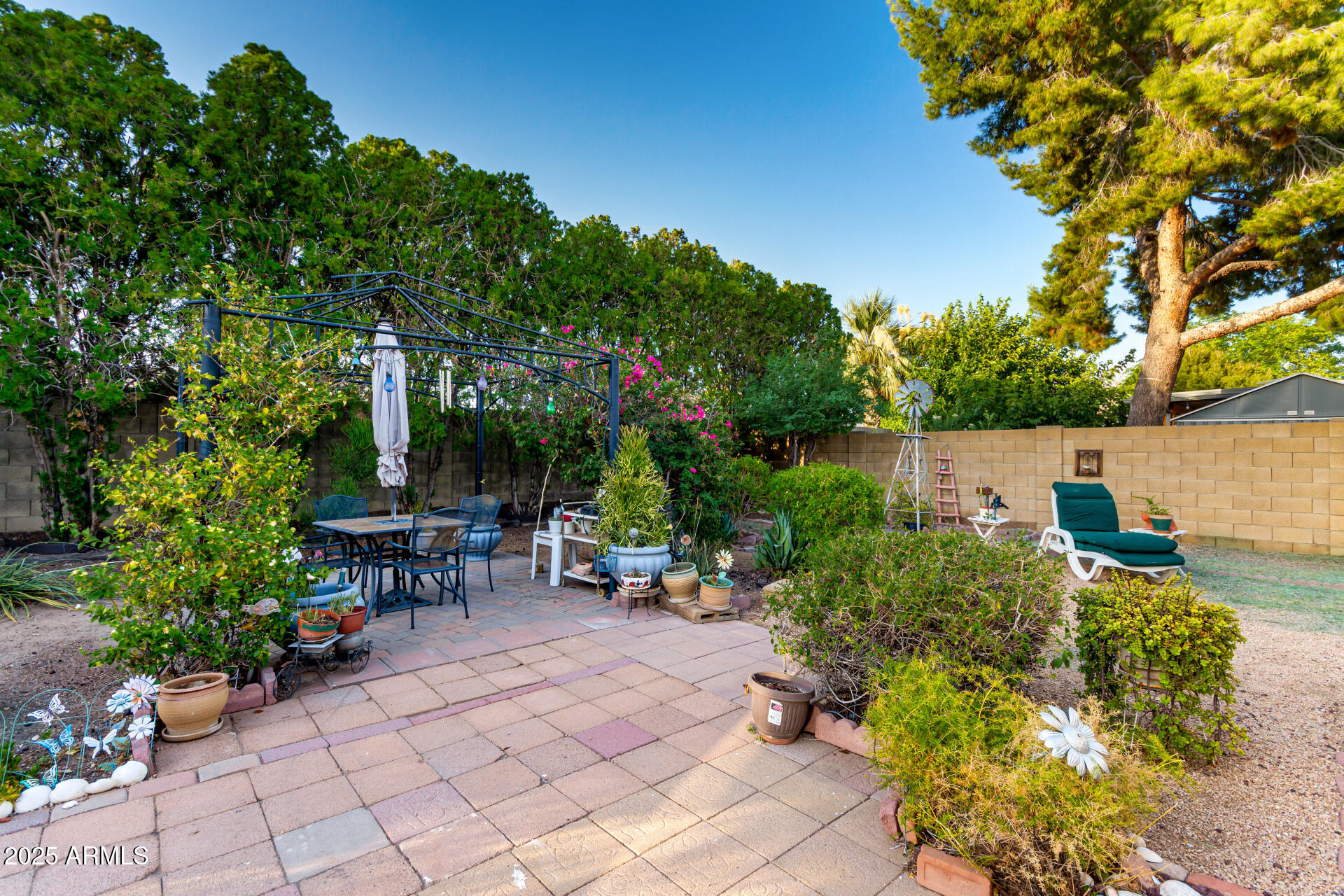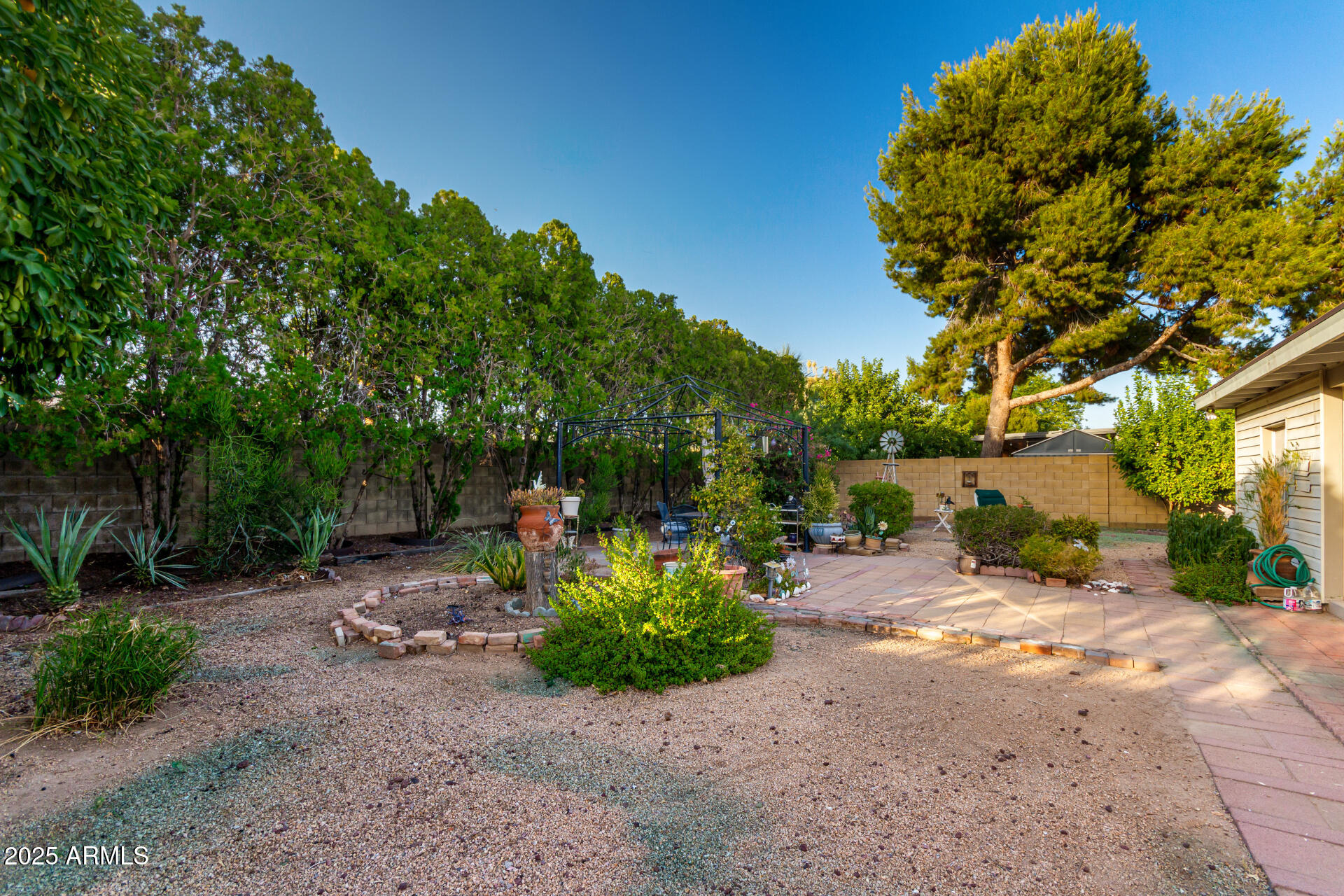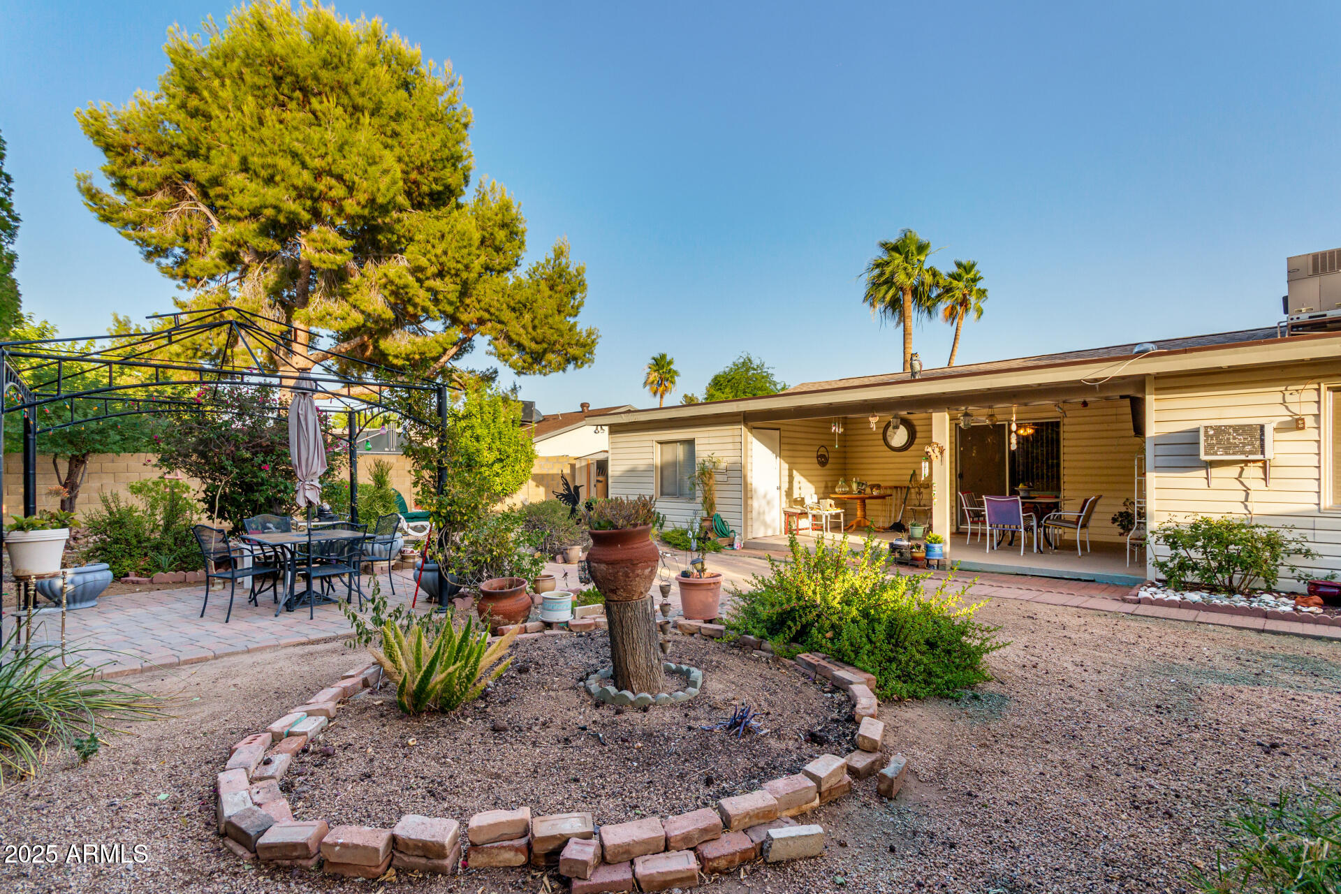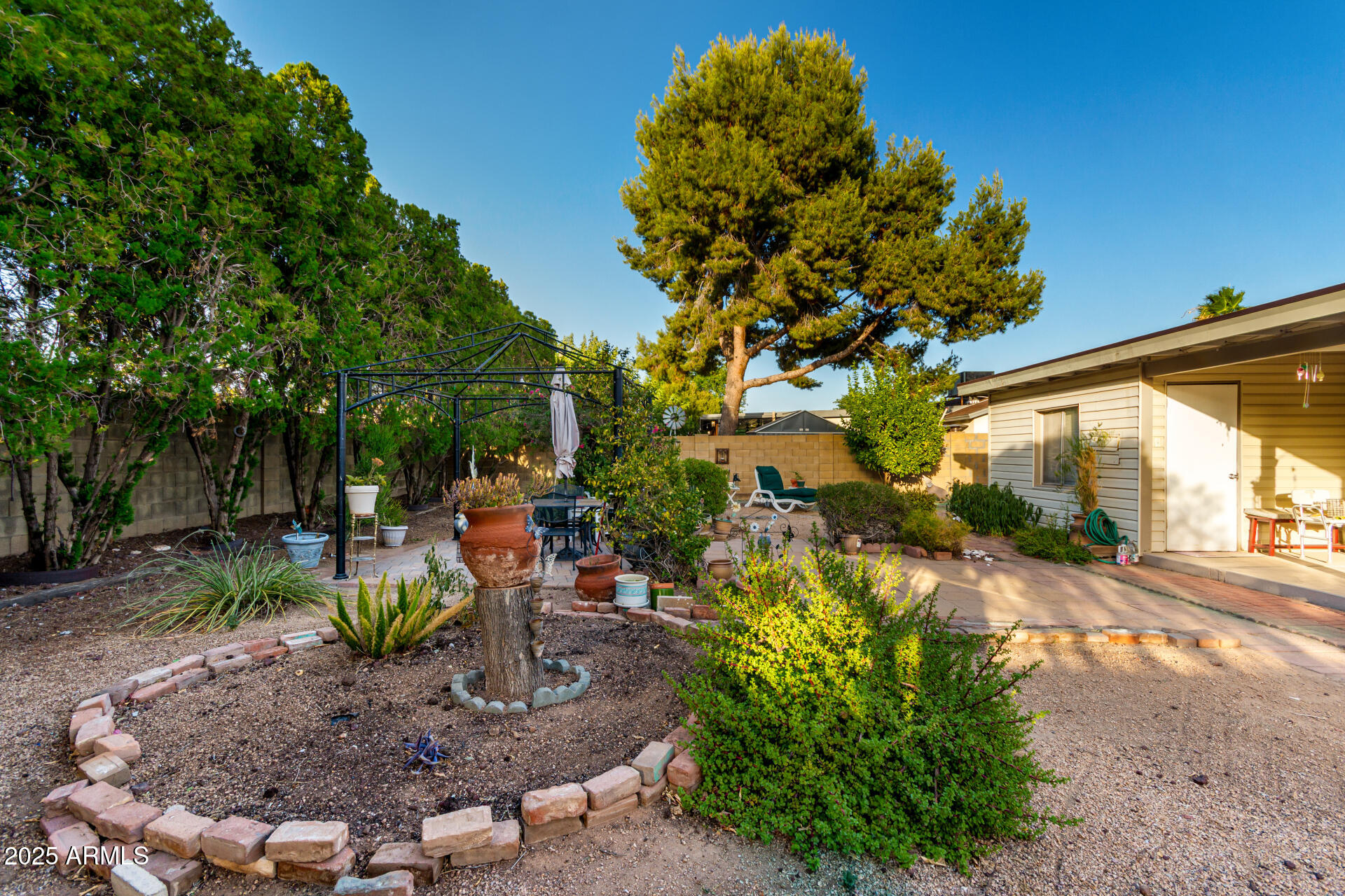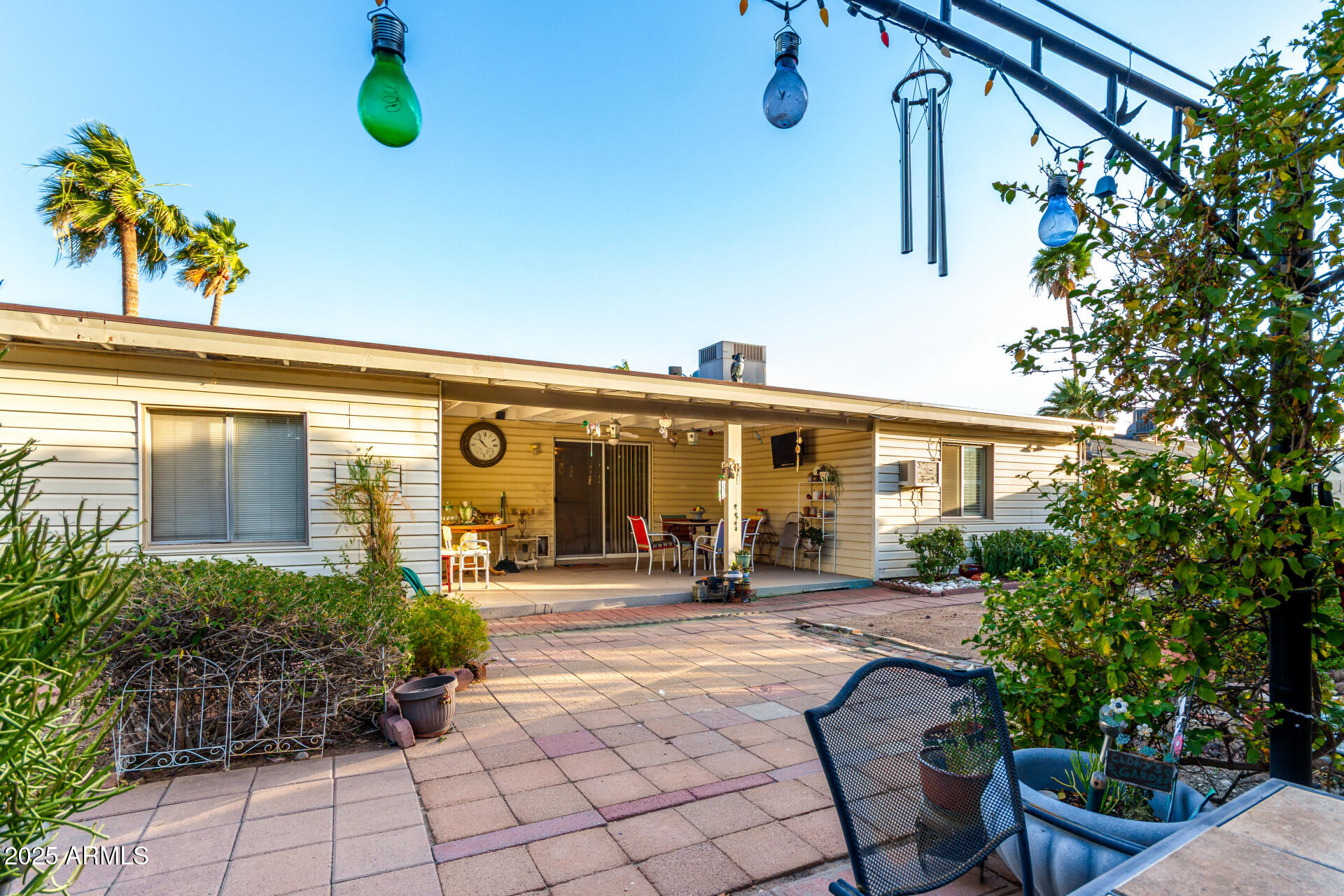Includes APS solar panels with no lease, system is owned and maintained by APS with $49.99 monthly credit to homeowner. No cost to transfer to buyer. Great location is ready to move in! This charming home showcases an ample front yard with a no-fuss landscape, pavers galore, and a 2 car garage. Inside, you're welcomed by a bright living room. Discover tile & laminated floors, plantation shutters, and a spacious family/dining room. The kitchen features wood cabinets, built-in appliances, granite tile counters, ceramic tile backsplash, and a peninsula w/breakfast bar. The primary room has a sizable sitting/hobby room and a bathroom. The backyard offers a covered patio, multiple seating areas, and abundant greenery.Close to markets, restaurants, and Village Plaza. Don't miss out!