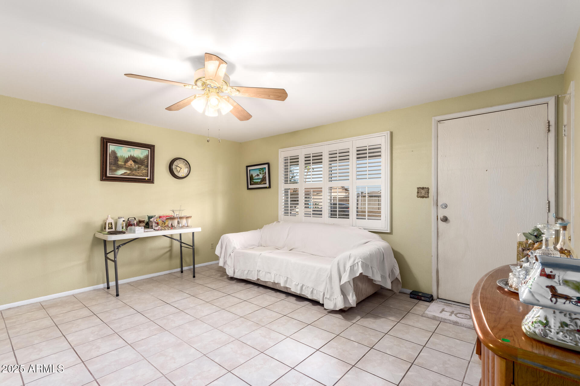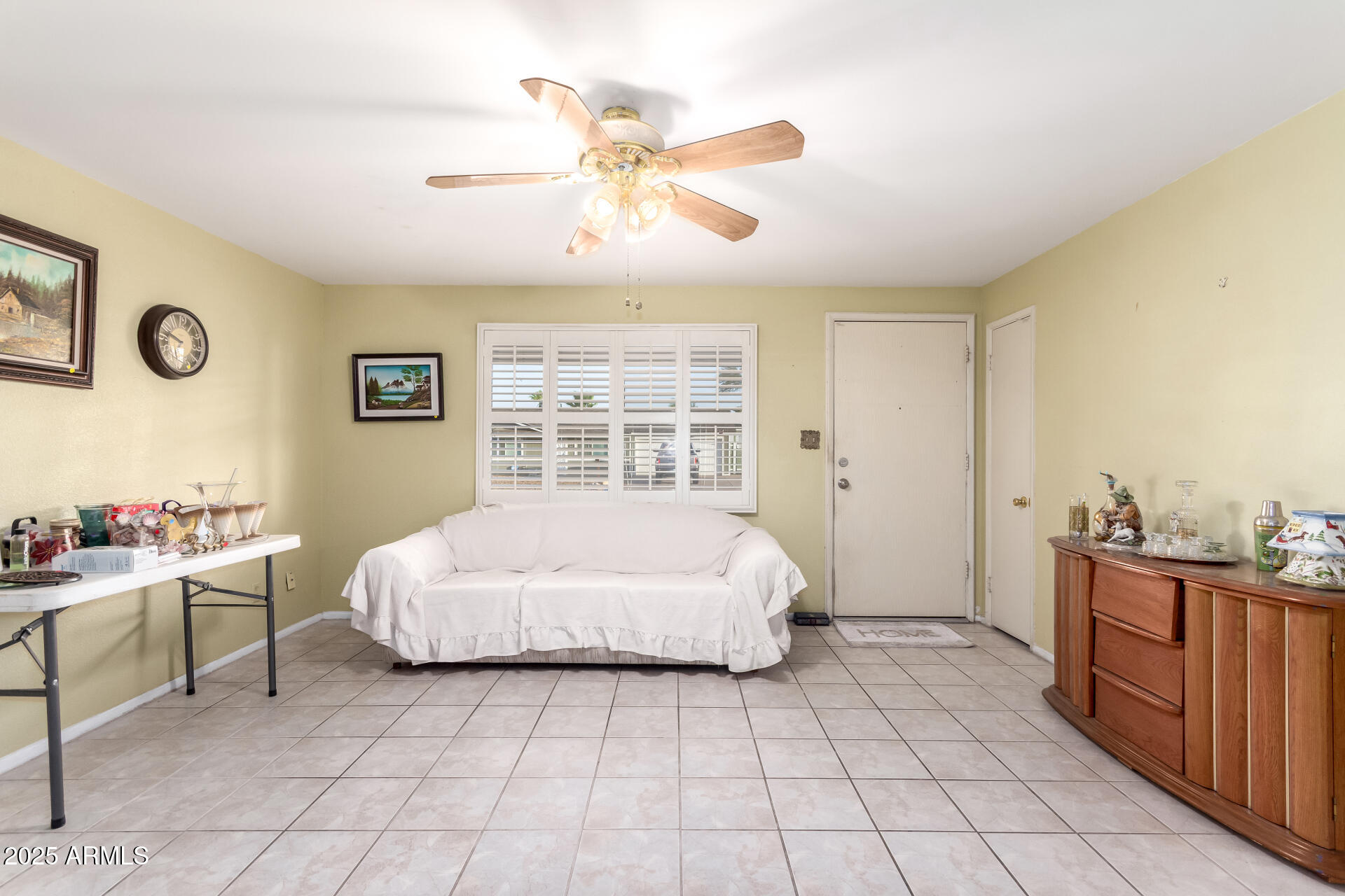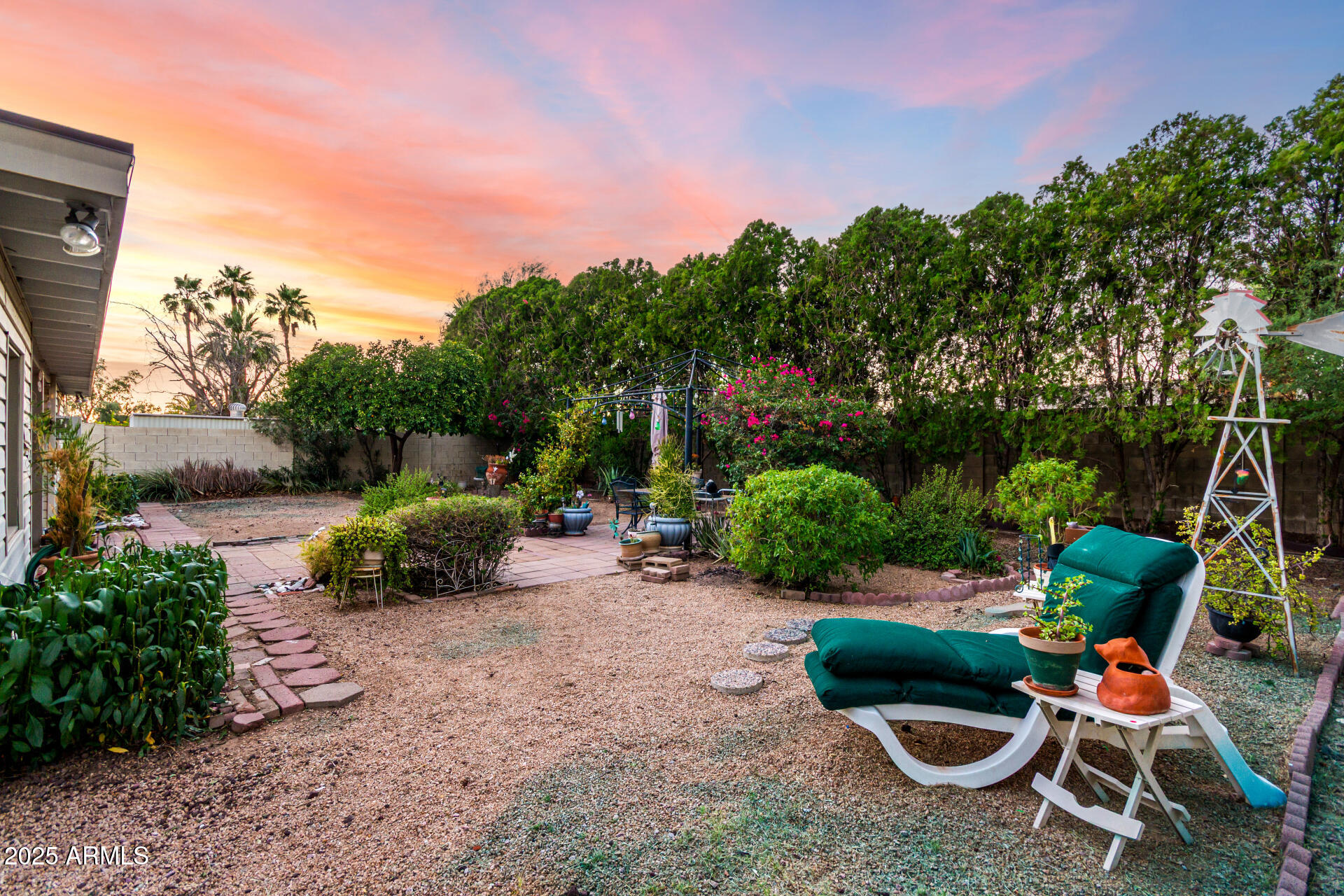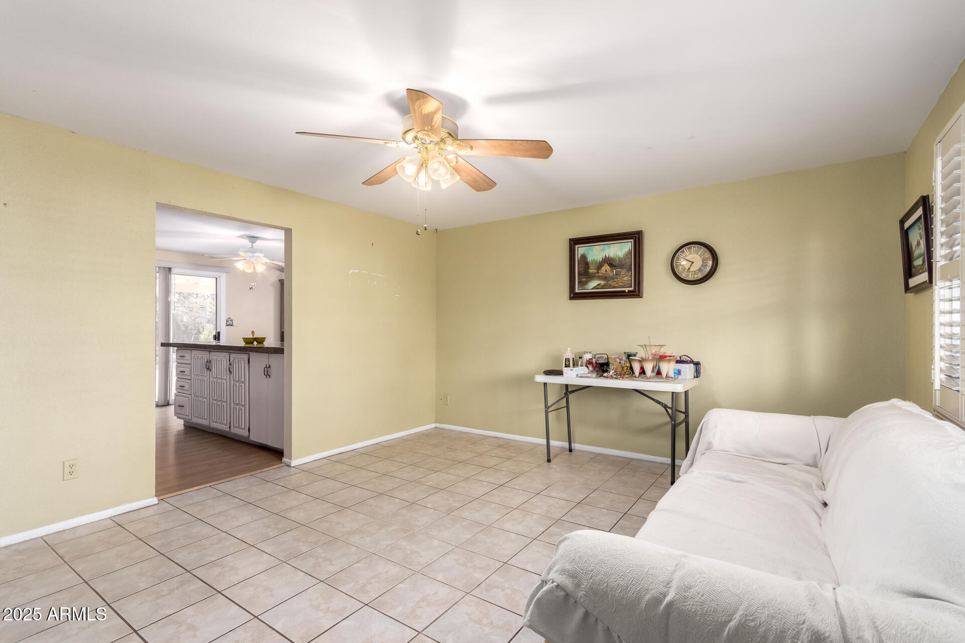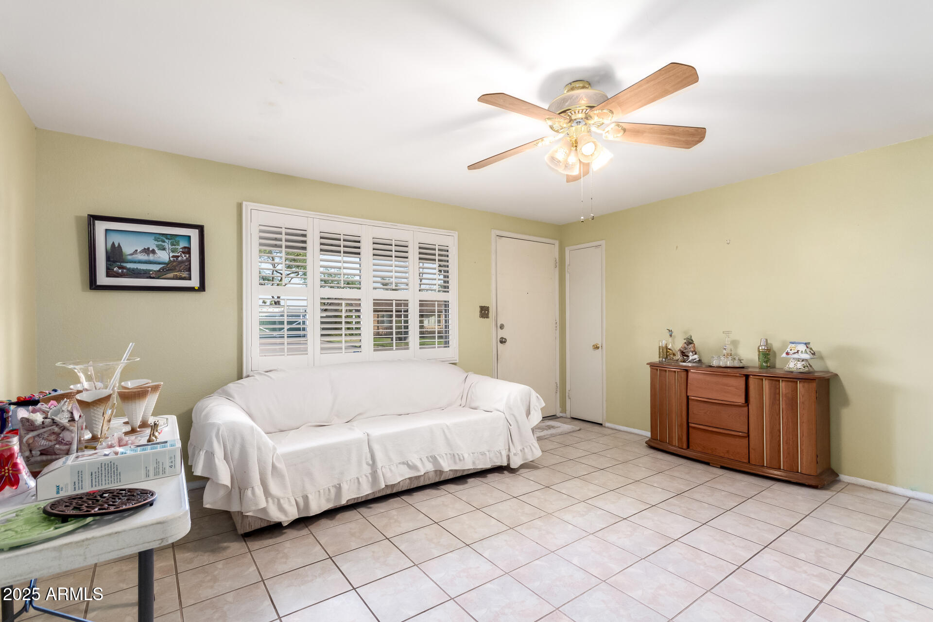 Includes APS solar panels with no lease, system is owned and maintained by APS with $49.99 monthly credit to homeowner. No cost to transfer to buyer. Great location is ready to move in! This charming home showcases an ample front yard with a no-fuss landscape, pavers galore, and a 2 car garage. Inside, you're welcomed by a bright living room. Discover tile & laminated floors, plantation shutters, and a spacious family/dining room. The kitchen features wood cabinets, built-in appliances, granite tile counters, ceramic tile backsplash, and a peninsula w/breakfast bar. The primary room has a sizable sitting/hobby room and a bathroom. The backyard offers a covered patio, multiple seating areas, and abundant greenery.Close to markets, restaurants, and Village Plaza. Don't miss out!