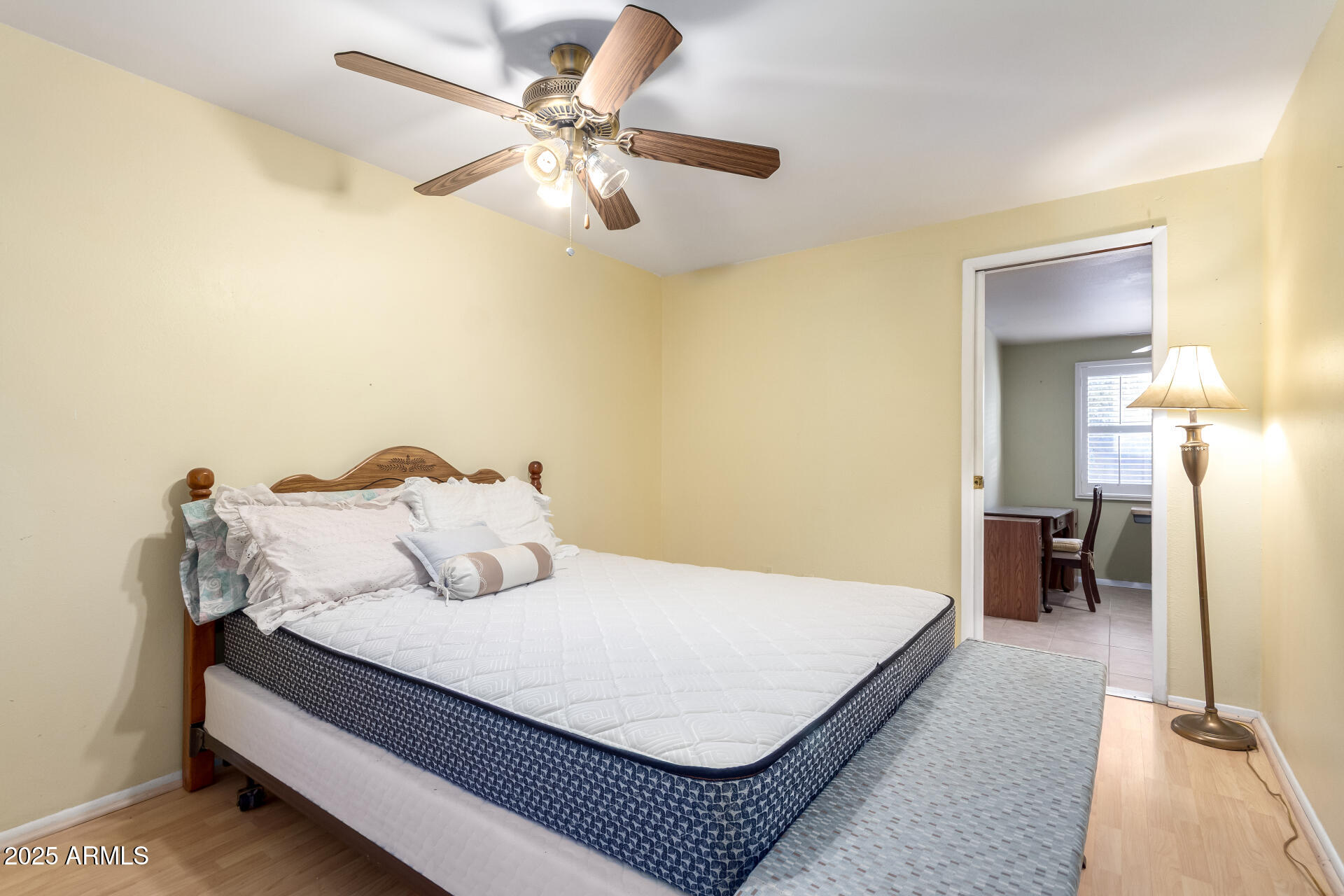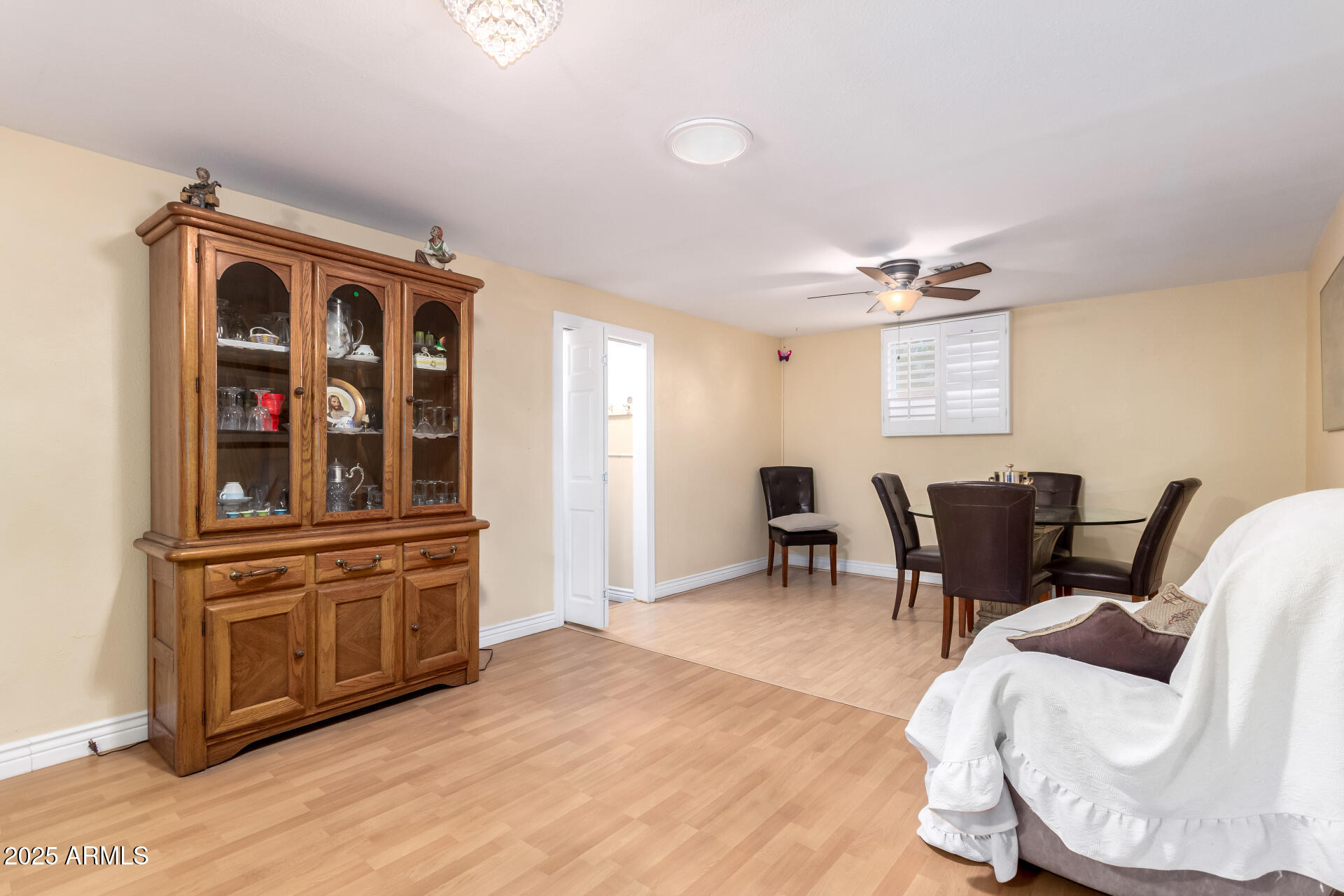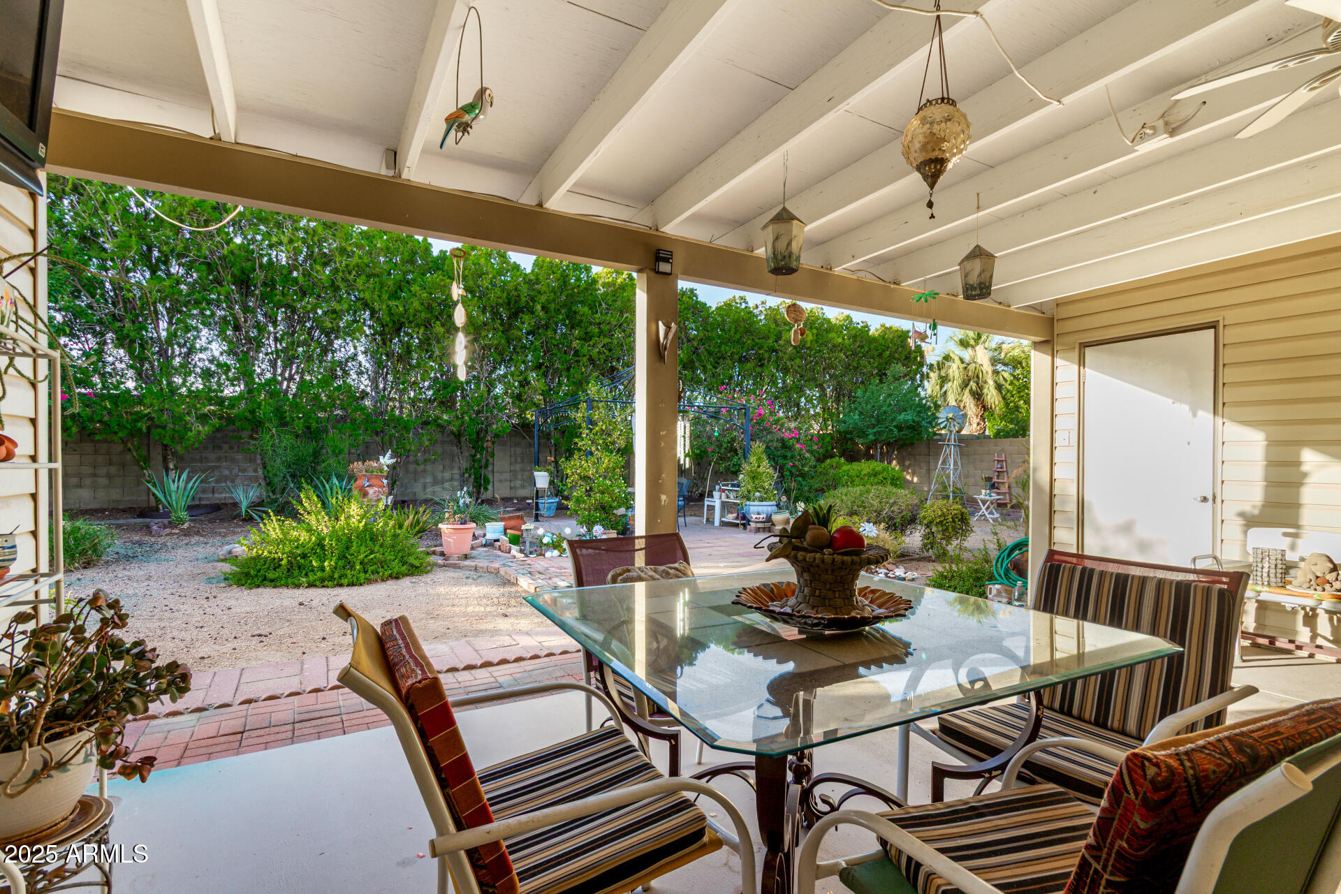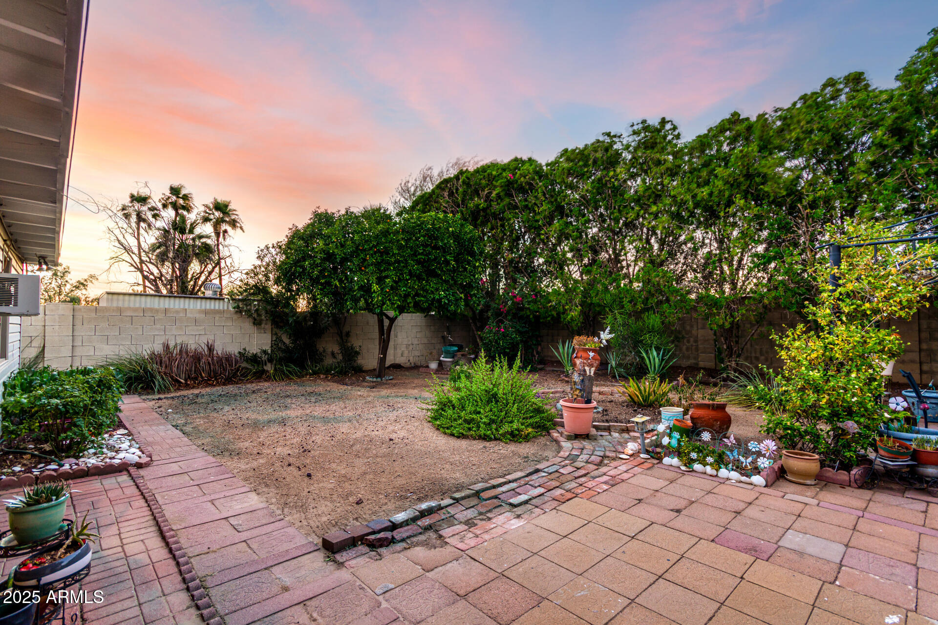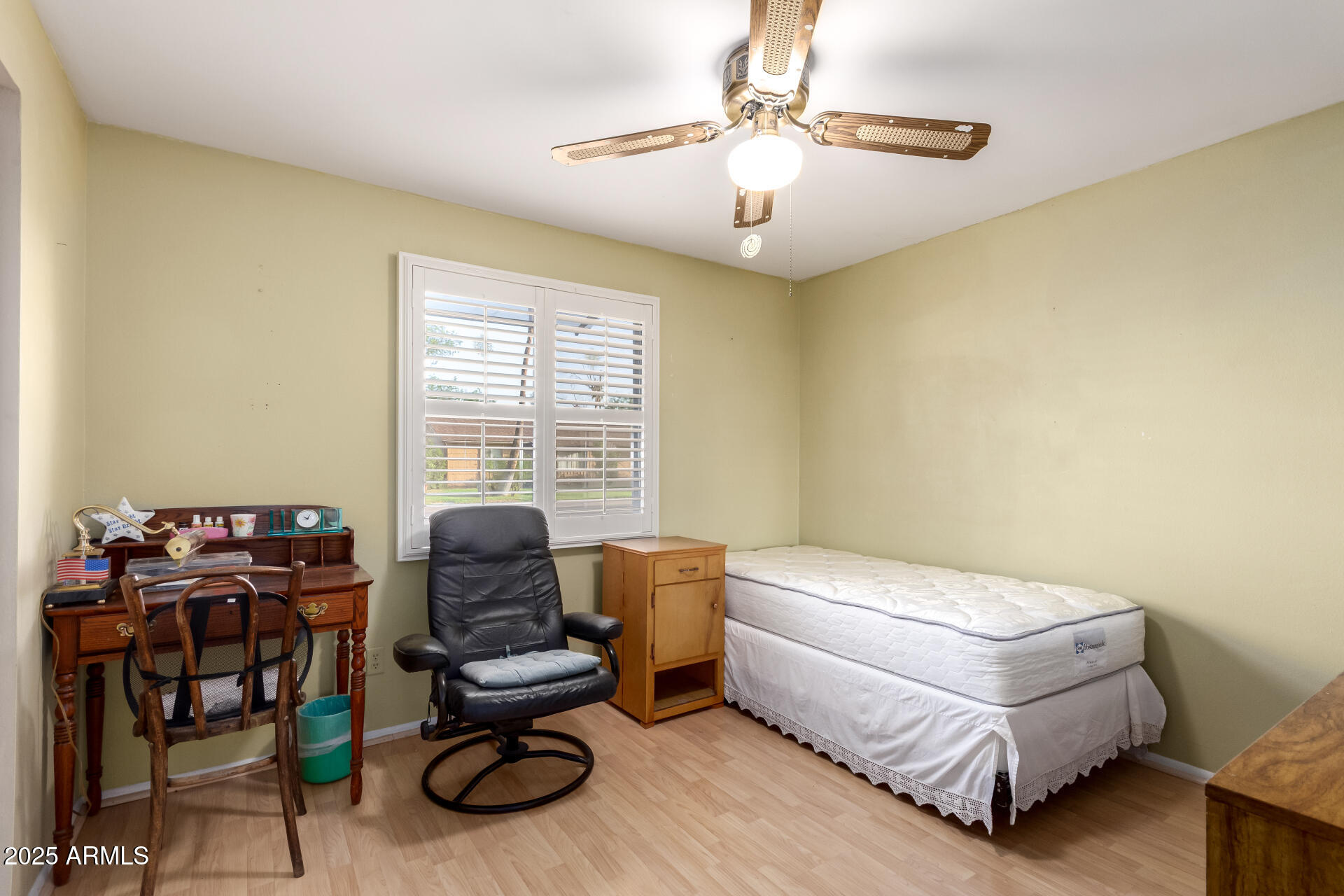 Includes APS solar panels with no lease, system is owned and maintained by APS with $49.99 monthly credit to homeowner. No cost to transfer to buyer. Great location is ready to move in! This charming home showcases an ample front yard with a no-fuss landscape, pavers galore, and a 2 car garage. Inside, you're welcomed by a bright living room. Discover tile & laminated floors, plantation shutters, and a spacious family/dining room. The kitchen features wood cabinets, built-in appliances, granite tile counters, ceramic tile backsplash, and a peninsula w/breakfast bar. The primary room has a sizable sitting/hobby room and a bathroom. The backyard offers a covered patio, multiple seating areas, and abundant greenery.Close to markets, restaurants, and Village Plaza. Don't miss out!