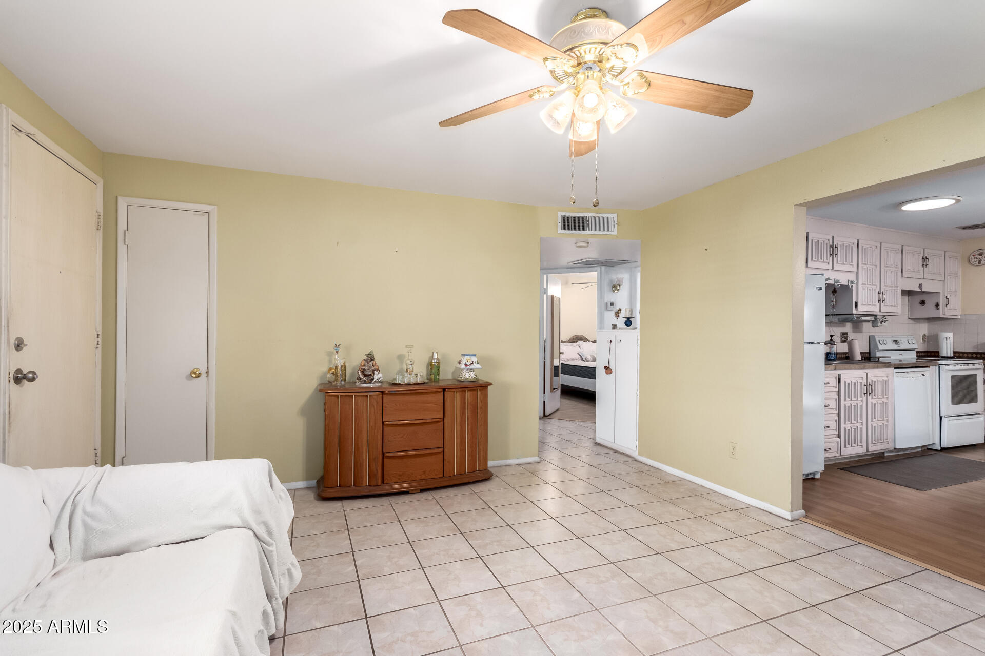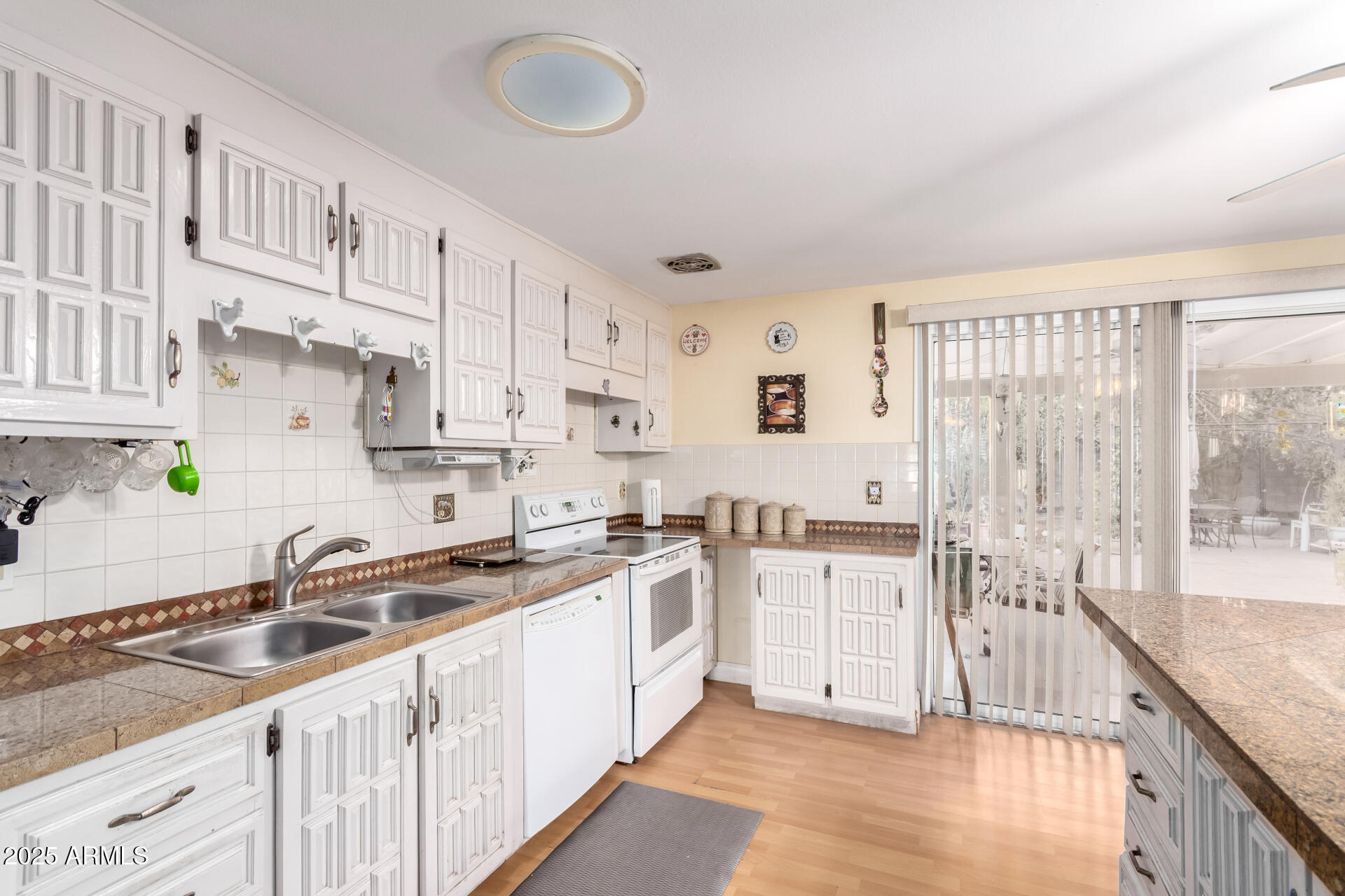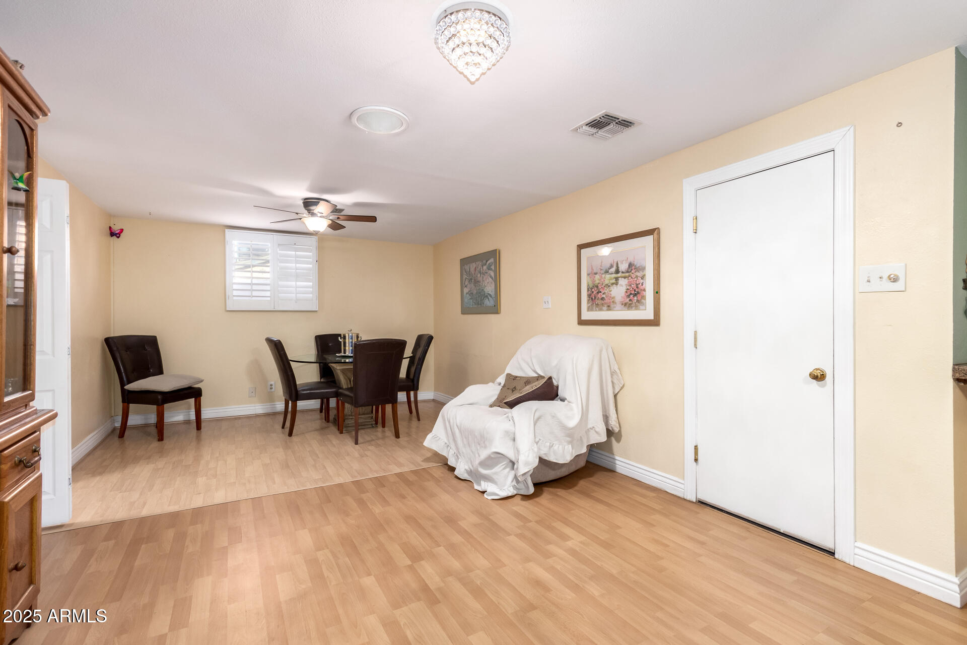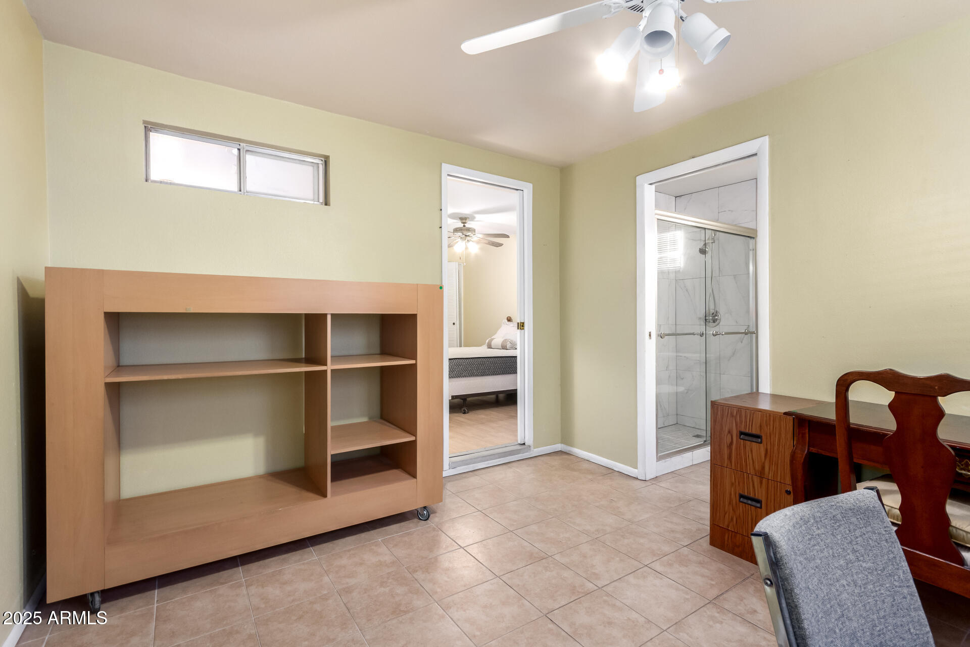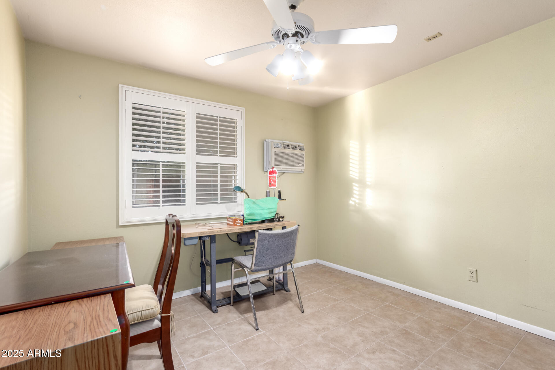 Includes APS solar panels with no lease, system is owned and maintained by APS with $49.99 monthly credit to homeowner. No cost to transfer to buyer. Great location is ready to move in! This charming home showcases an ample front yard with a no-fuss landscape, pavers galore, and a 2 car garage. Inside, you're welcomed by a bright living room. Discover tile & laminated floors, plantation shutters, and a spacious family/dining room. The kitchen features wood cabinets, built-in appliances, granite tile counters, ceramic tile backsplash, and a peninsula w/breakfast bar. The primary room has a sizable sitting/hobby room and a bathroom. The backyard offers a covered patio, multiple seating areas, and abundant greenery.Close to markets, restaurants, and Village Plaza. Don't miss out!