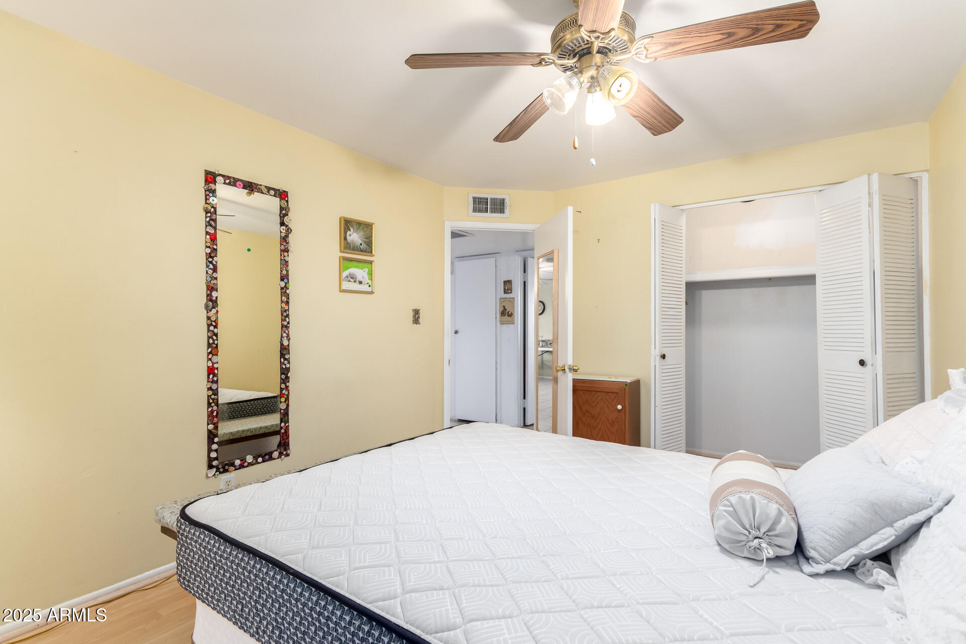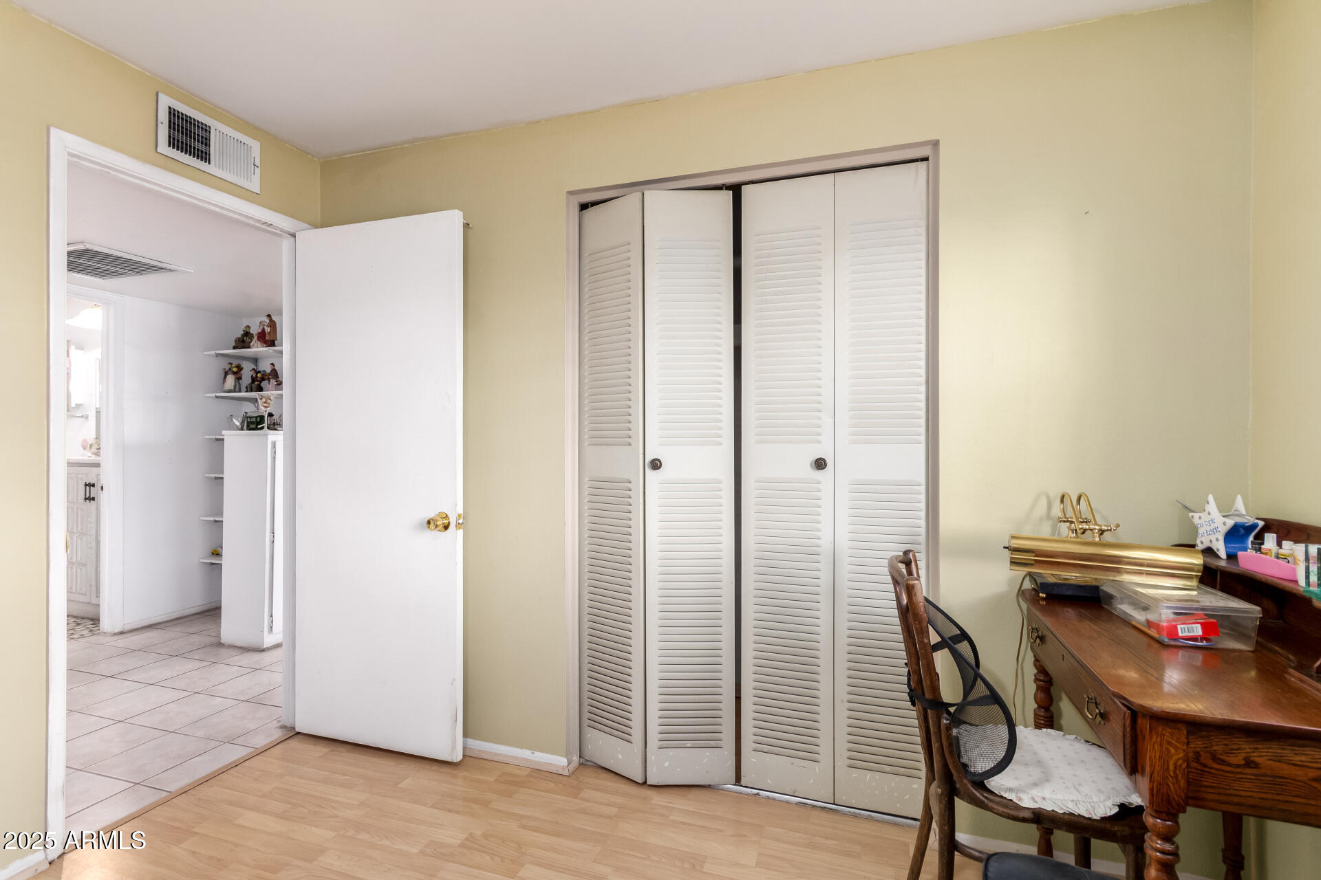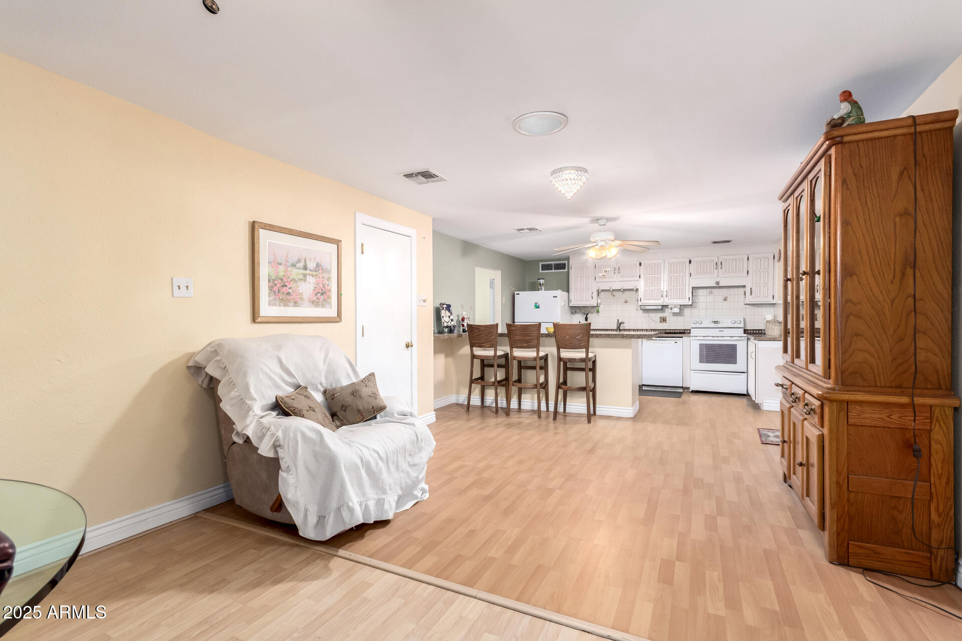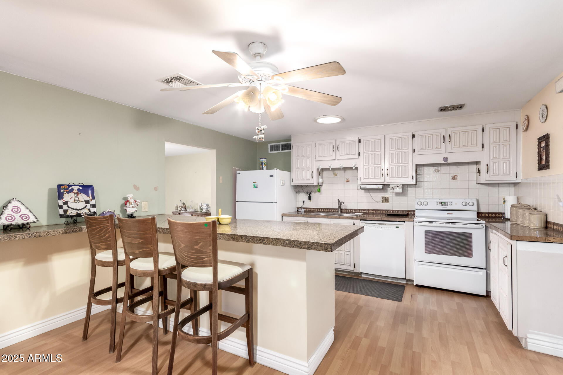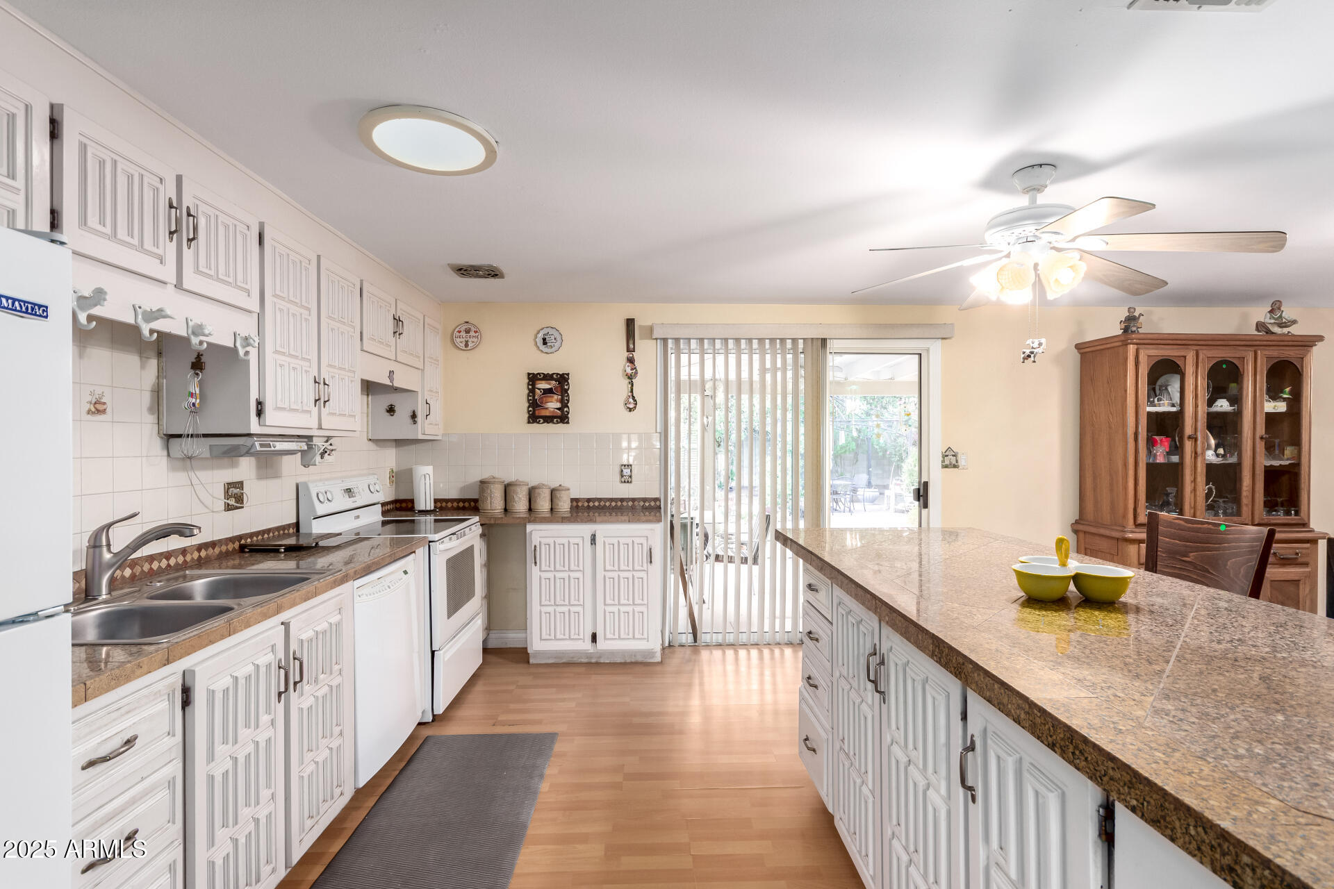 Includes APS solar panels with no lease, system is owned and maintained by APS with $49.99 monthly credit to homeowner. No cost to transfer to buyer. Great location is ready to move in! This charming home showcases an ample front yard with a no-fuss landscape, pavers galore, and a 2 car garage. Inside, you're welcomed by a bright living room. Discover tile & laminated floors, plantation shutters, and a spacious family/dining room. The kitchen features wood cabinets, built-in appliances, granite tile counters, ceramic tile backsplash, and a peninsula w/breakfast bar. The primary room has a sizable sitting/hobby room and a bathroom. The backyard offers a covered patio, multiple seating areas, and abundant greenery.Close to markets, restaurants, and Village Plaza. Don't miss out!