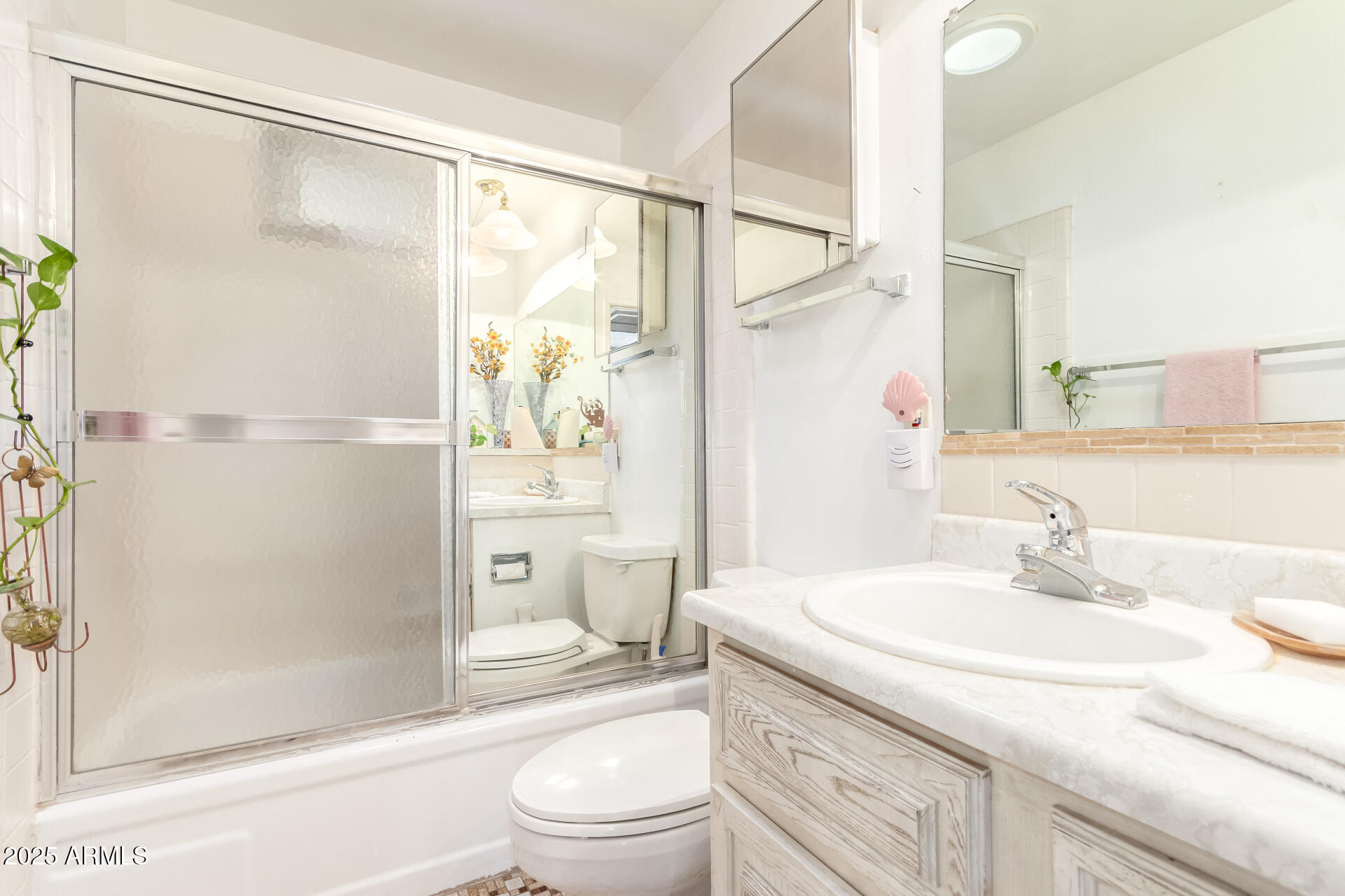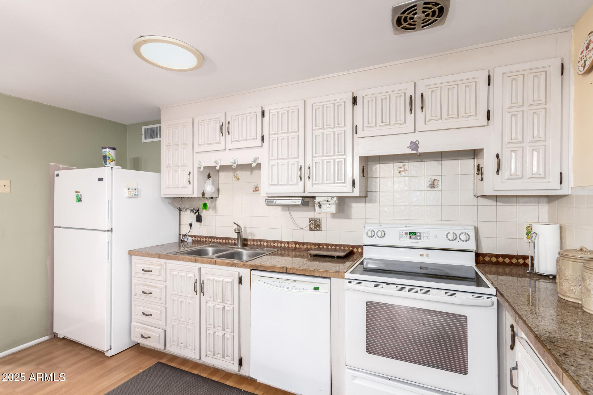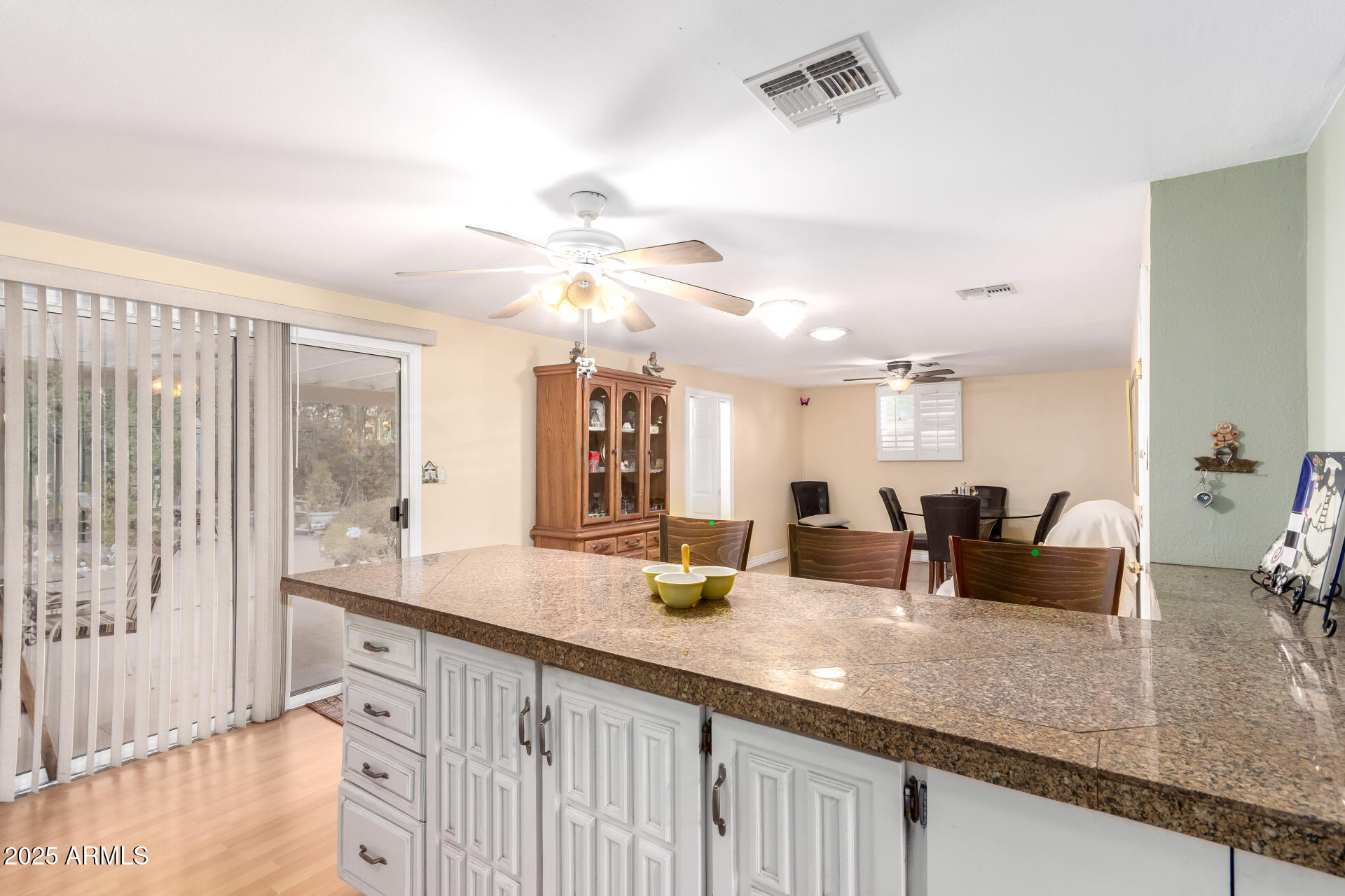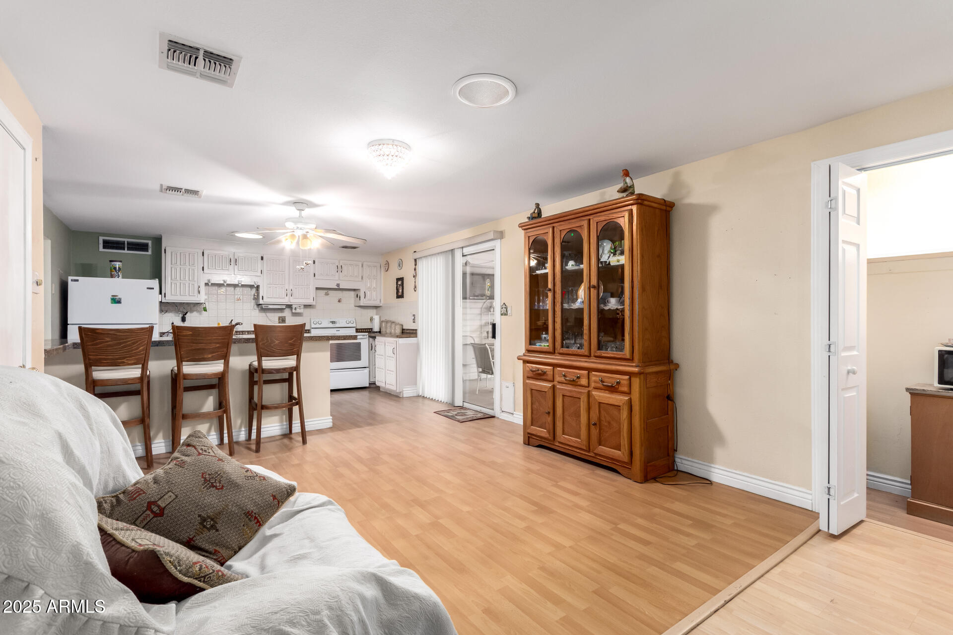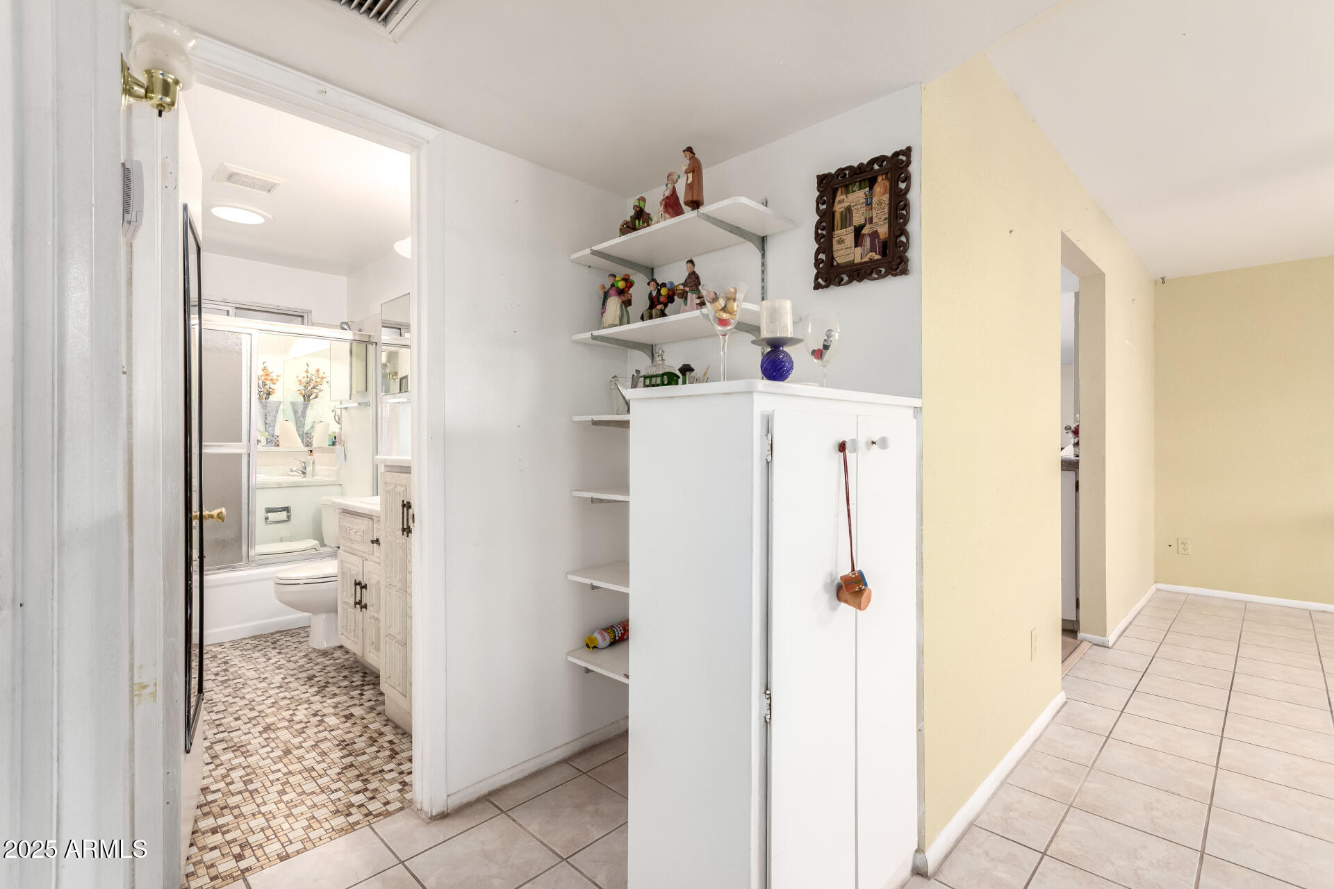 Includes APS solar panels with no lease, system is owned and maintained by APS with $49.99 monthly credit to homeowner. No cost to transfer to buyer. Great location is ready to move in! This charming home showcases an ample front yard with a no-fuss landscape, pavers galore, and a 2 car garage. Inside, you're welcomed by a bright living room. Discover tile & laminated floors, plantation shutters, and a spacious family/dining room. The kitchen features wood cabinets, built-in appliances, granite tile counters, ceramic tile backsplash, and a peninsula w/breakfast bar. The primary room has a sizable sitting/hobby room and a bathroom. The backyard offers a covered patio, multiple seating areas, and abundant greenery.Close to markets, restaurants, and Village Plaza. Don't miss out!