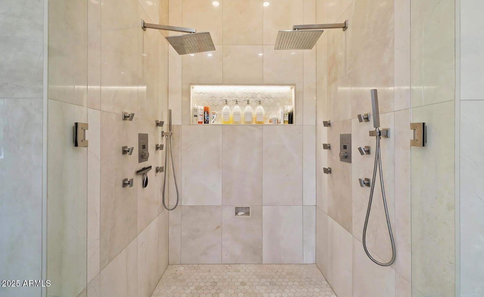 The primary suite is a true retreat, offering a spa-like sanctuary bath complete with a large walk-in shower featuring double shower heads and multi-jets, a freestanding soaking tub, double vanities with lighted... mirror cabinets, and a custom built-in closet system. Two beautifully updated guest baths also feature natural stone and multi-jet showers.