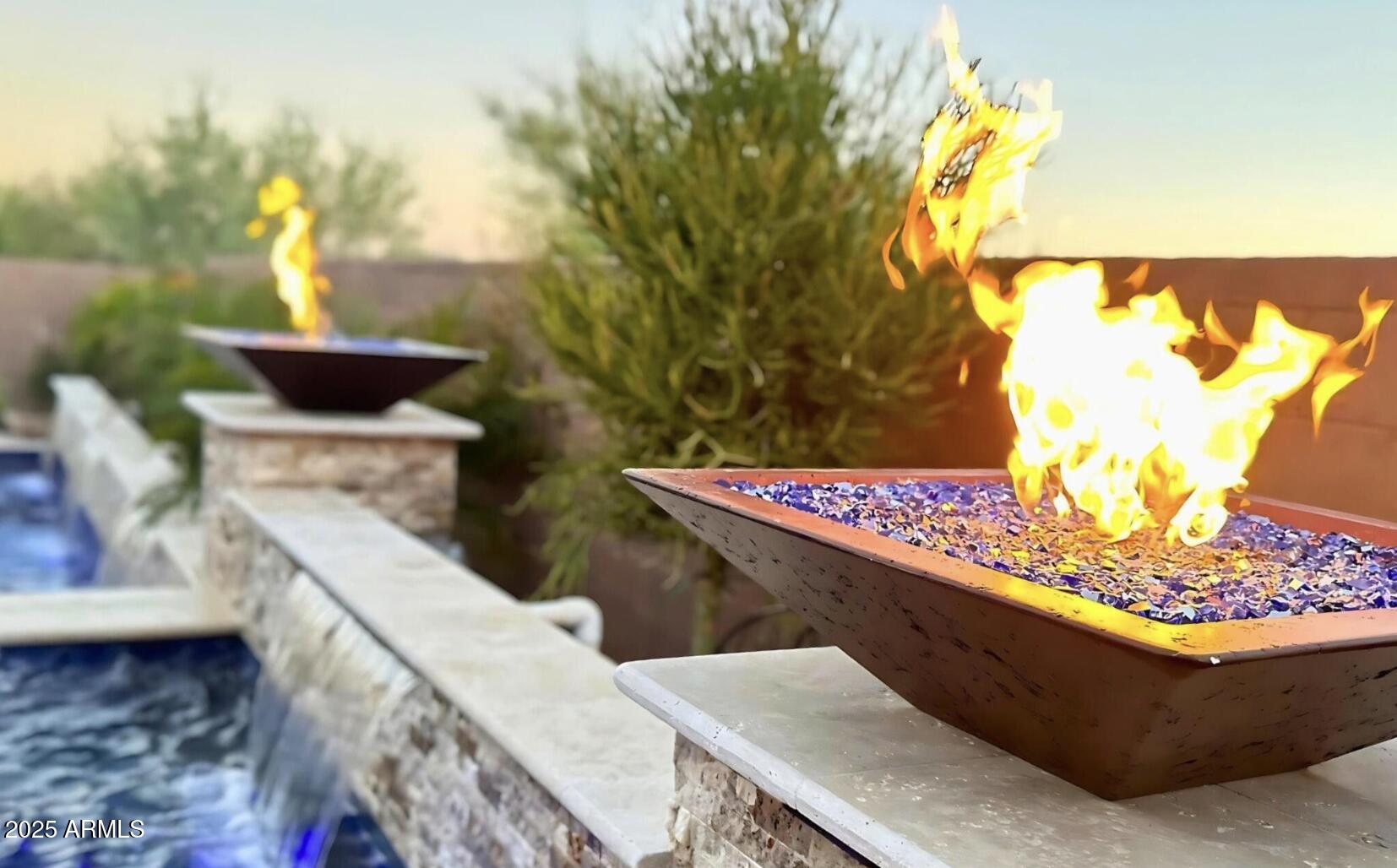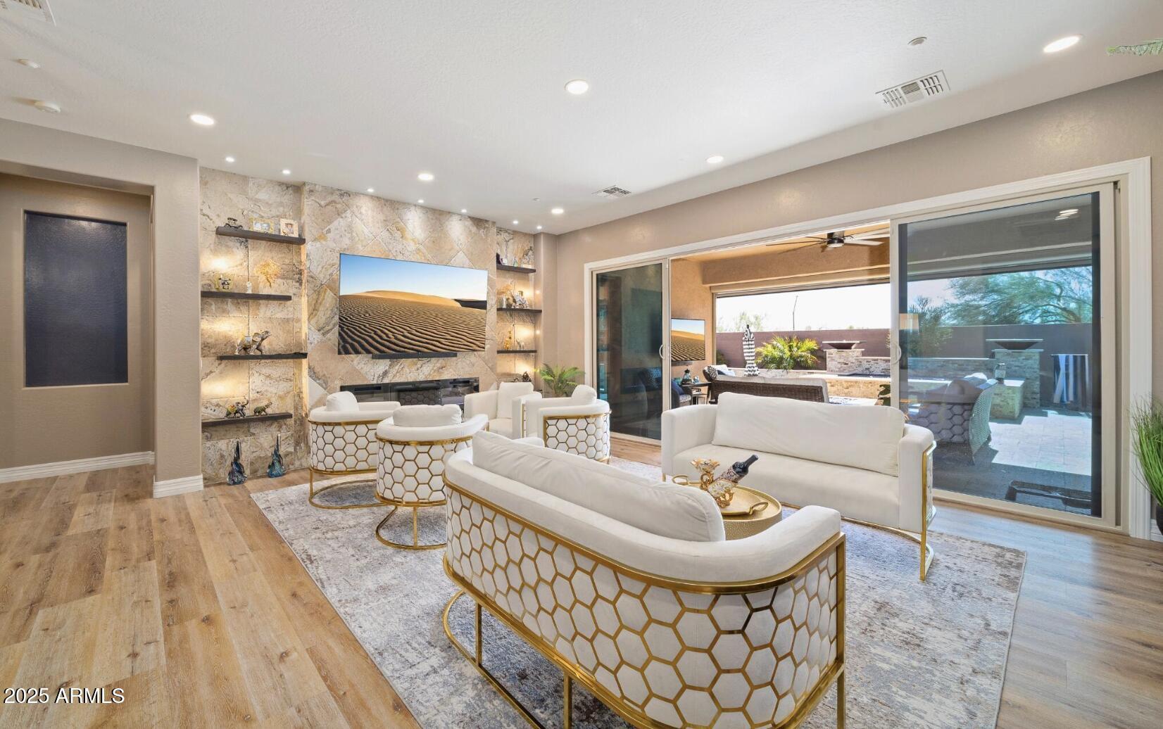Enjoy seamless indoor-outdoor living with three expansive patio doors opening to a backyard oasis. The private outdoor space includes a pool and spa with water shears and fire bowls, an outdoor shower, a dog run, and a fully equipped outdoor kitchen under a pergola. The patio is complete with a remote-control shade, natural gas fire pit, and built-in BBQ, perfect for relaxing or entertaining.