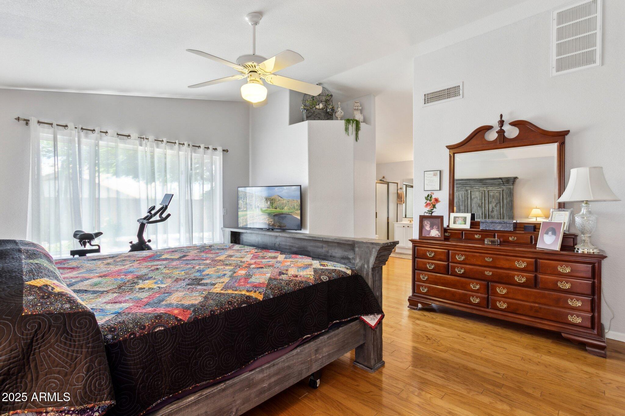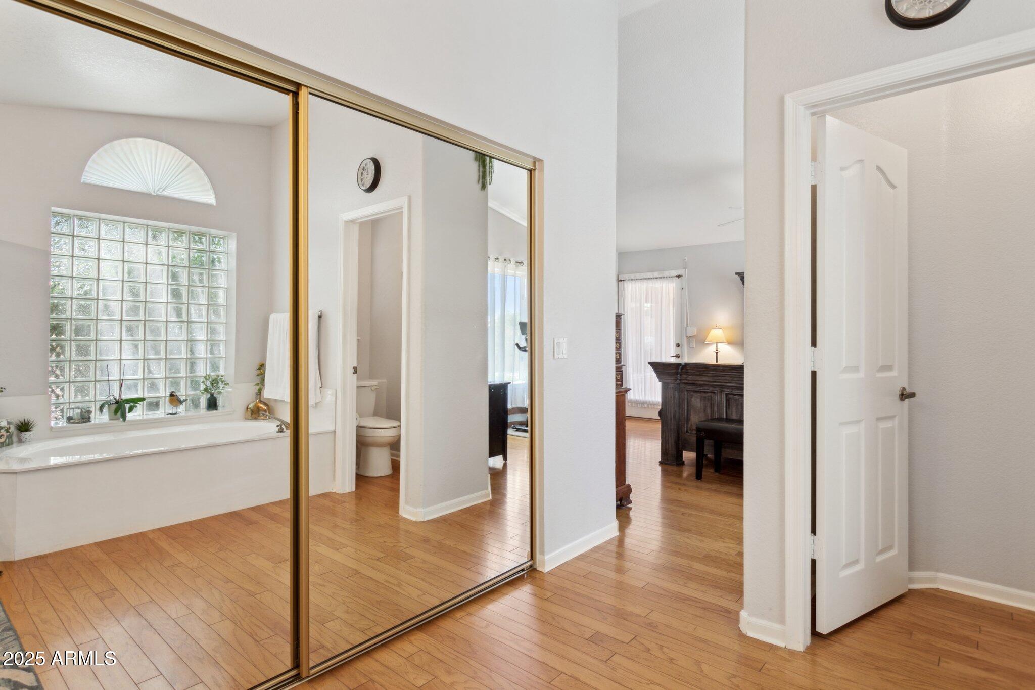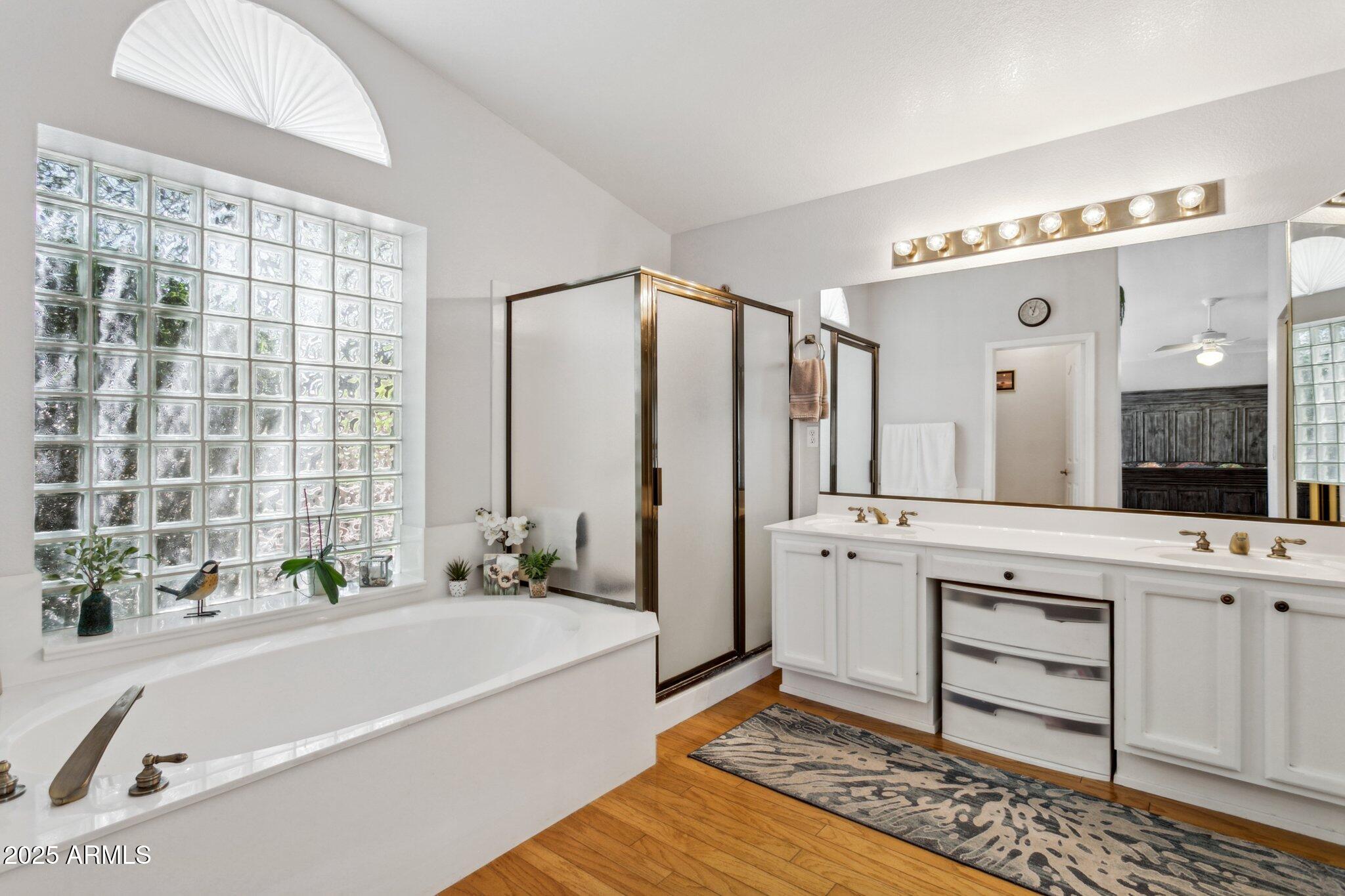 The primary suite is a true retreat, featuring double-door entry, a walk-in closet, dual sinks, separate tub and shower, and direct access to your private backyard oasis.