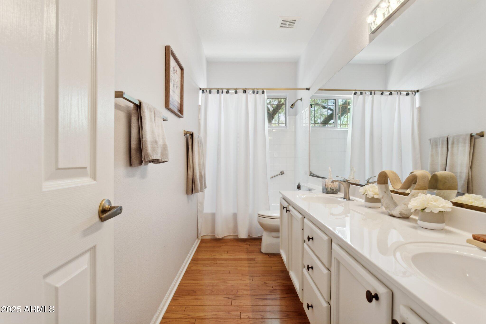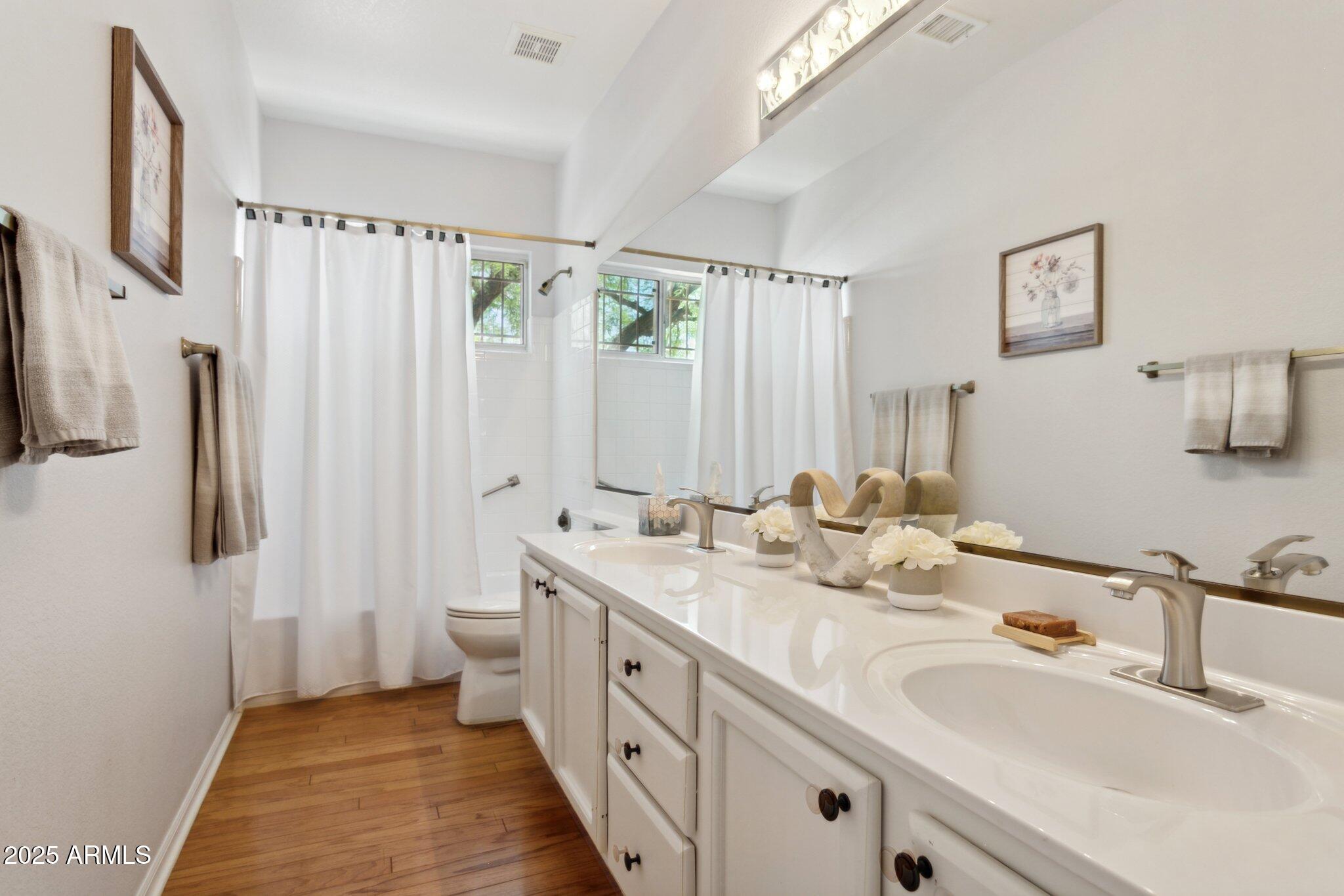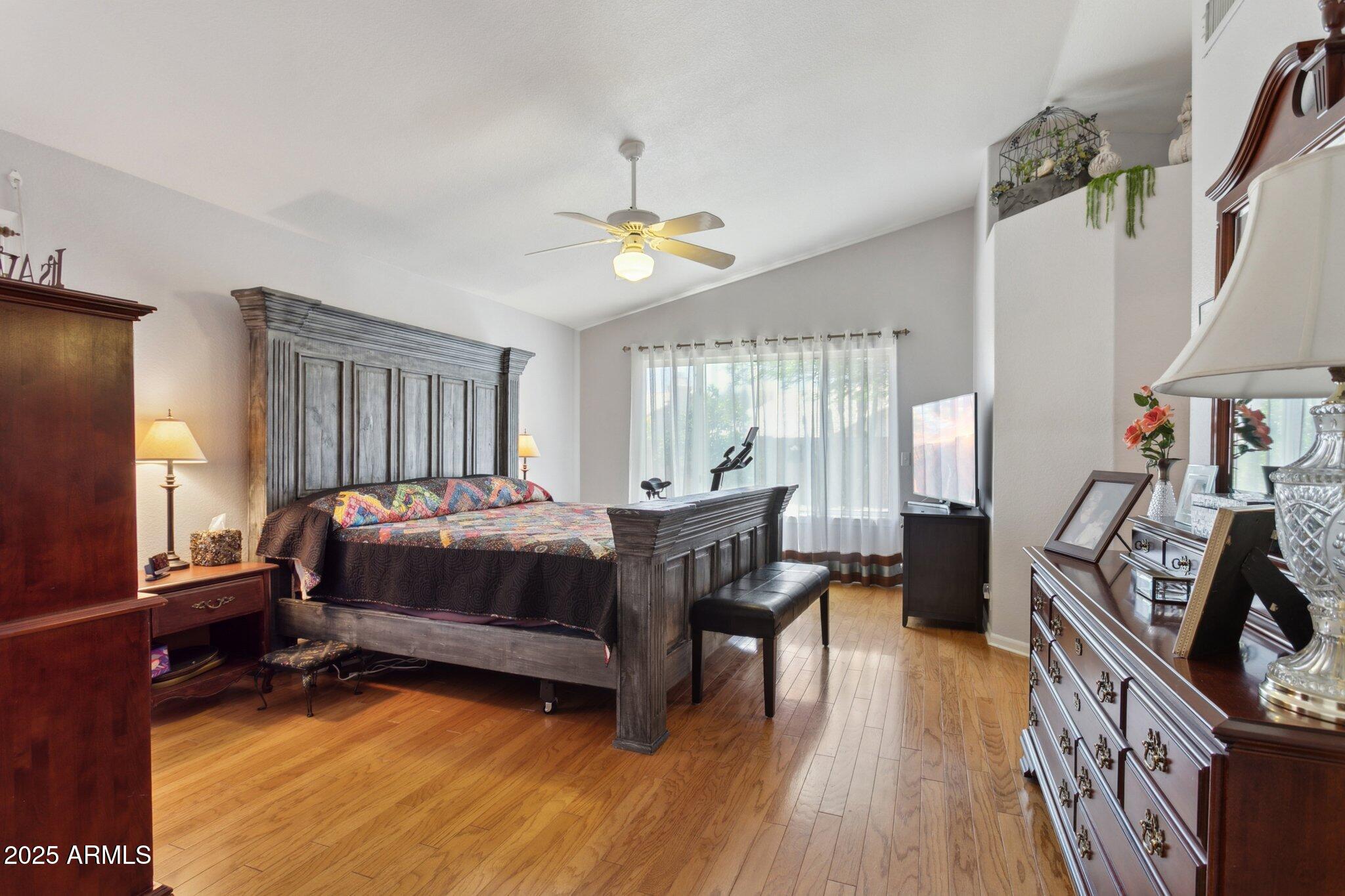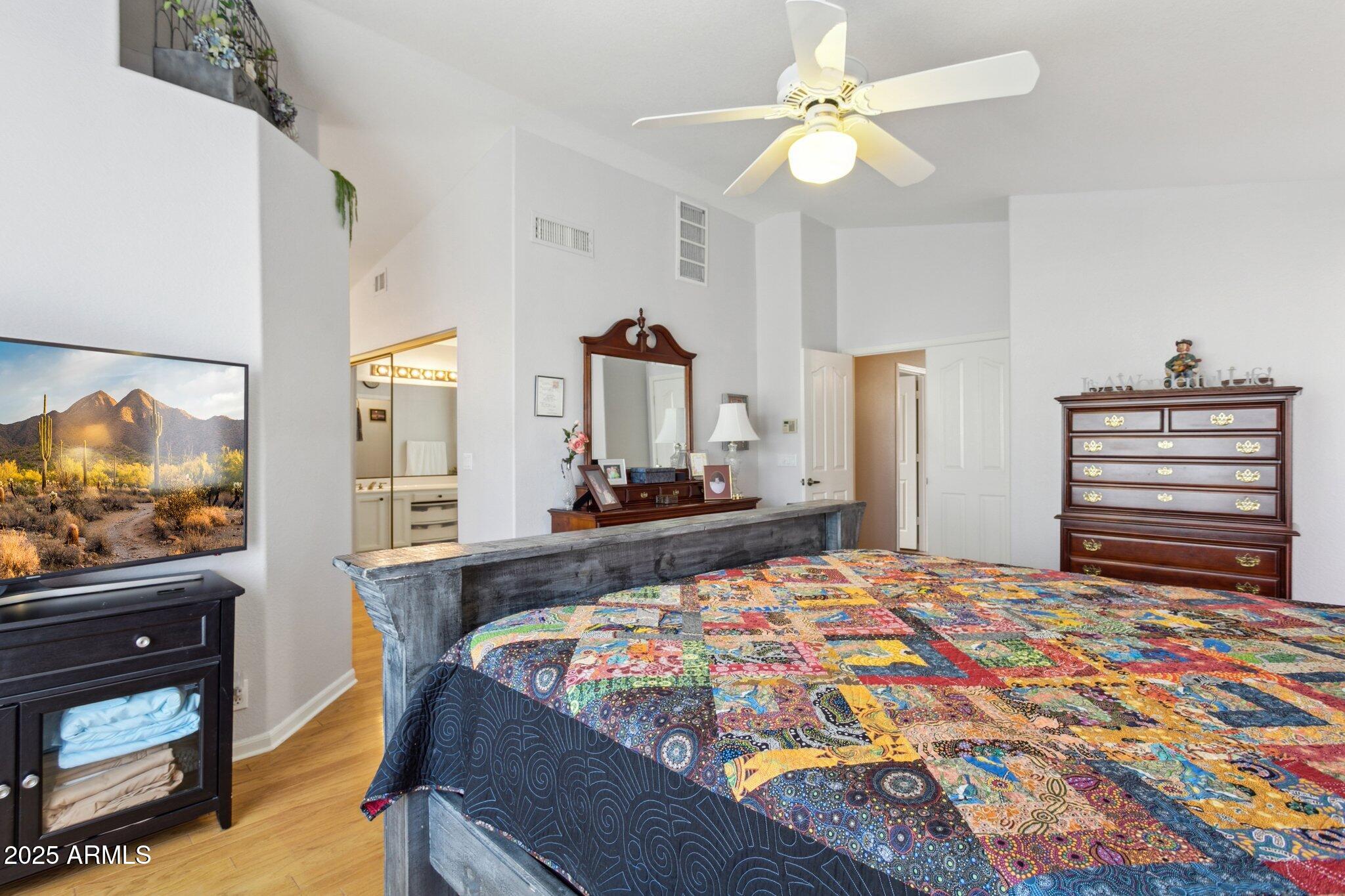 The primary suite is a true retreat, featuring double-door entry, a walk-in closet, dual sinks, separate tub and shower, and direct access to your private backyard oasis.