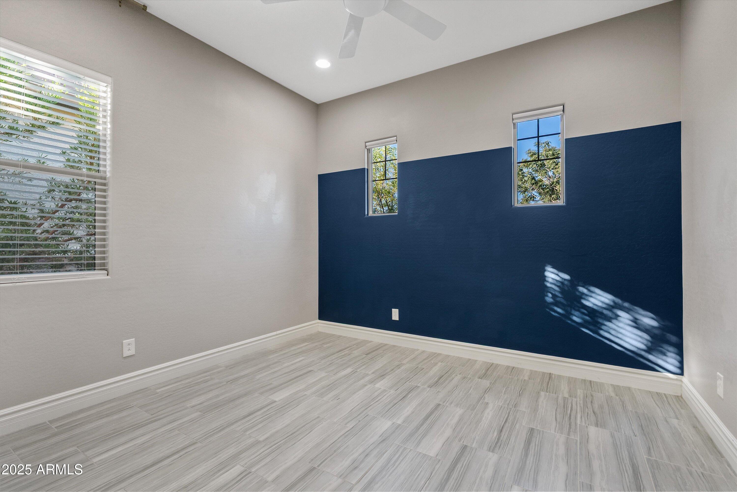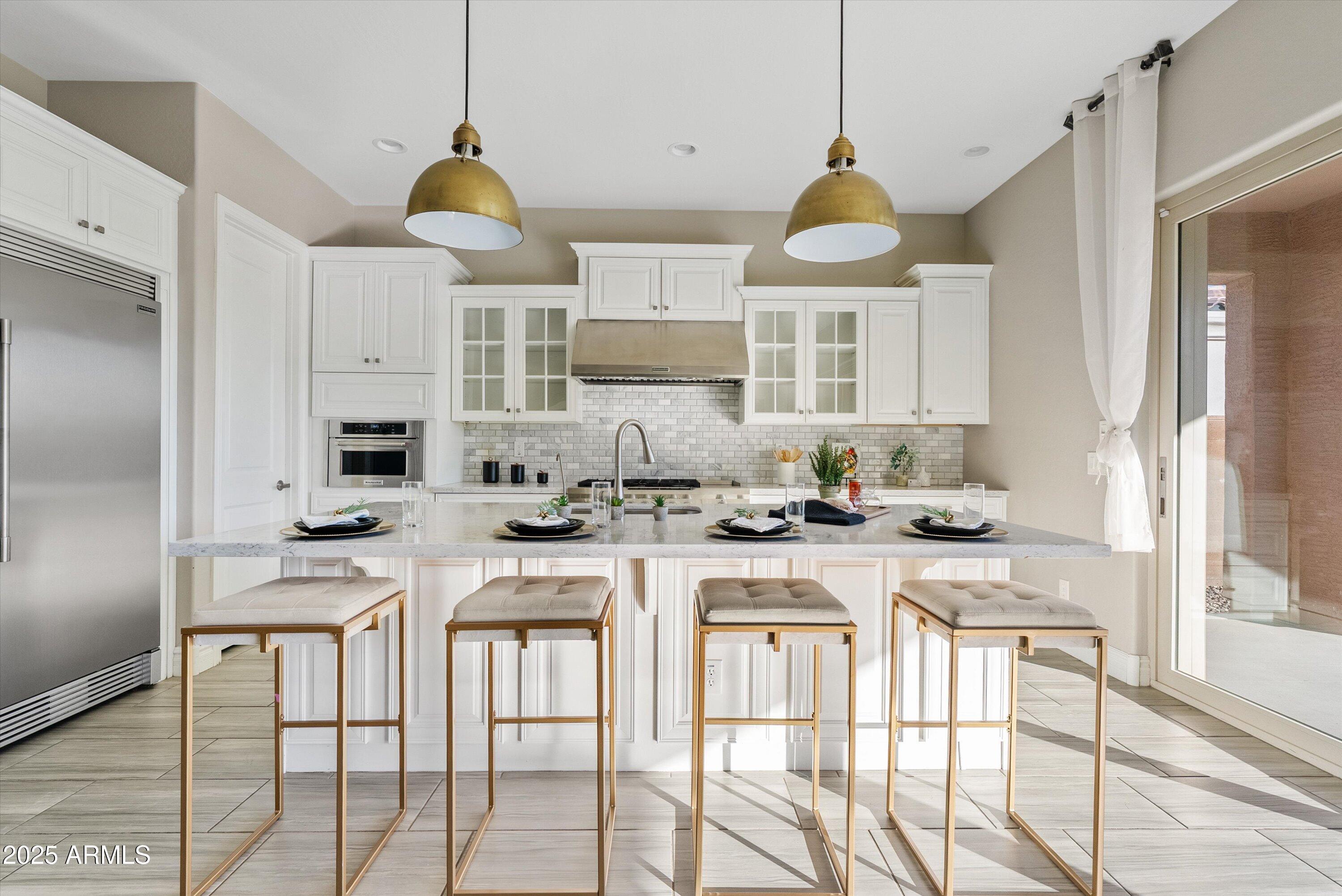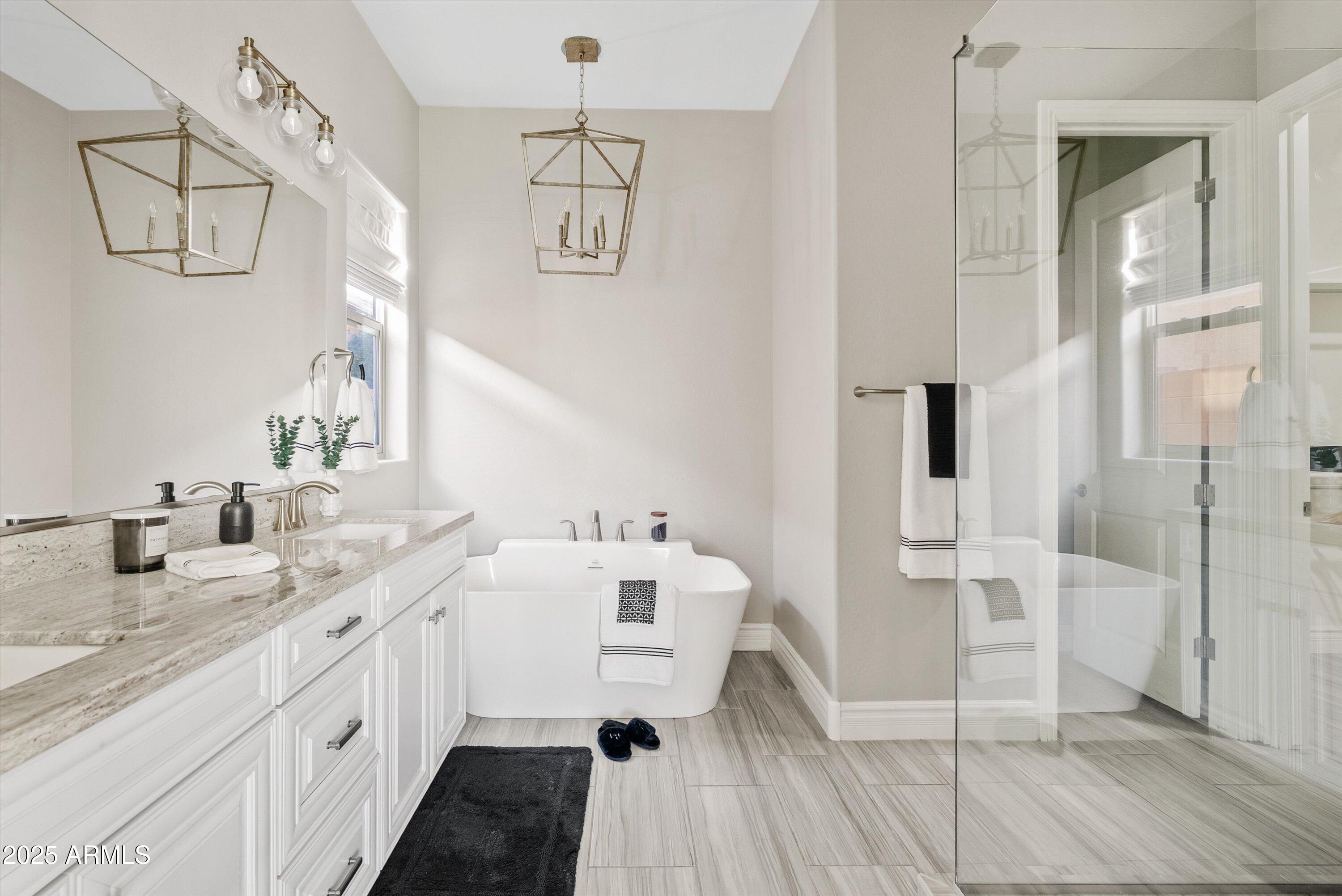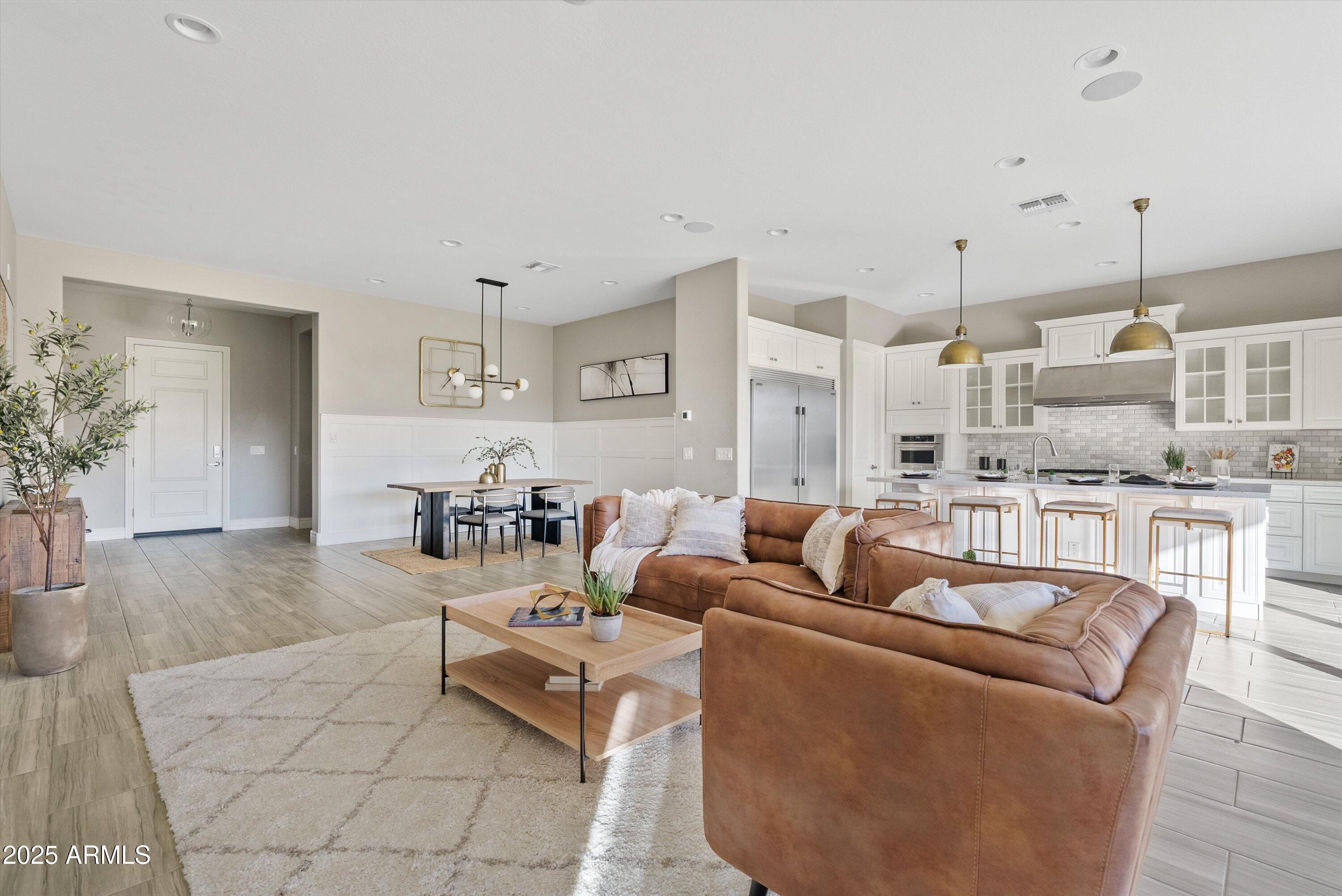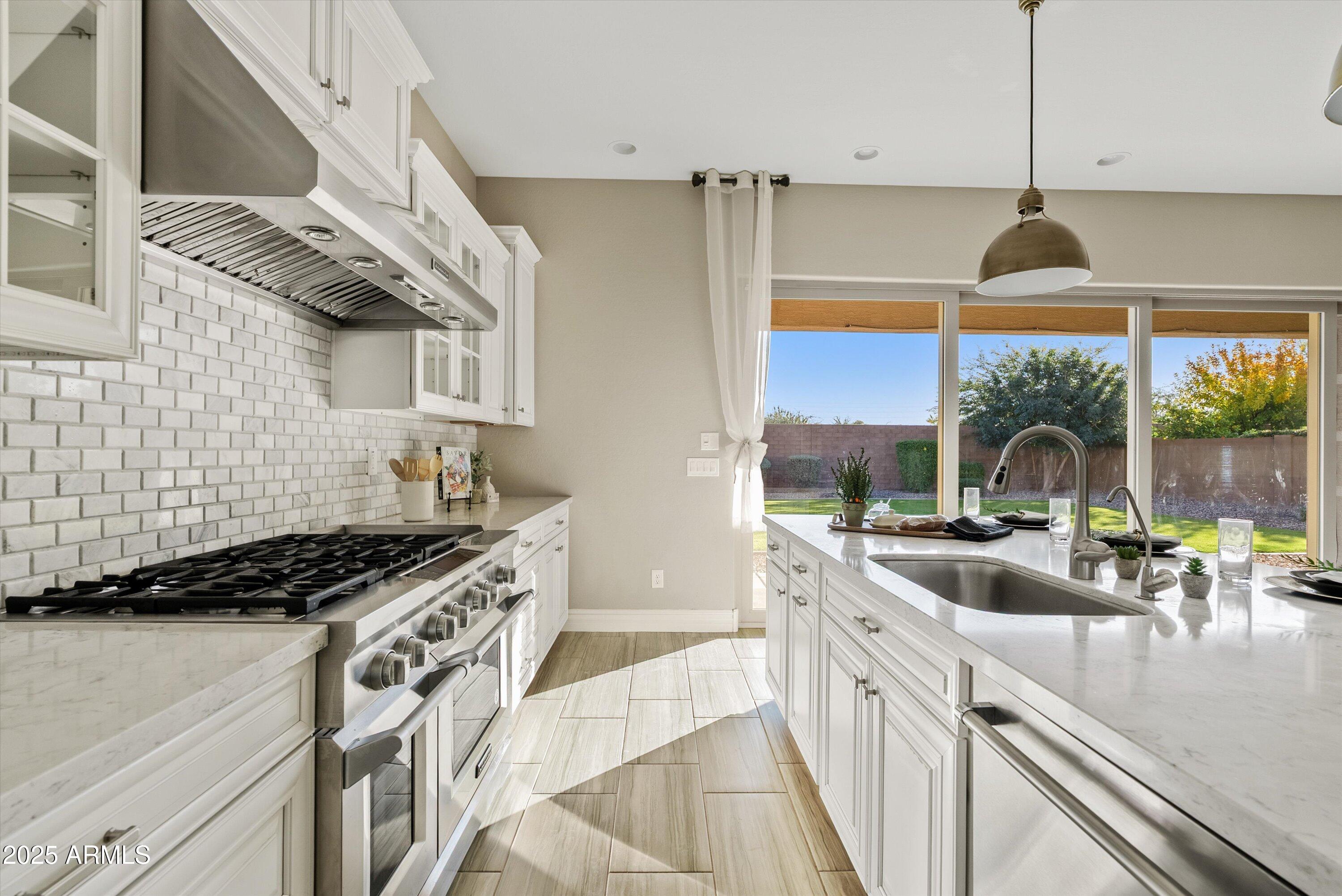 Located in one of Eastmark's most sought after sections, this beautifully maintained and highly upgraded home sits on a premium, park facing lot and offers an elevated living experience from the moment you arrive. Designed to reflect the feel of a luxury model home, it features neutral rectangular tile flooring, white cabinetry, Quartz countertops in the kitchen and baths, upgraded lighting and designer backsplashes throughout.