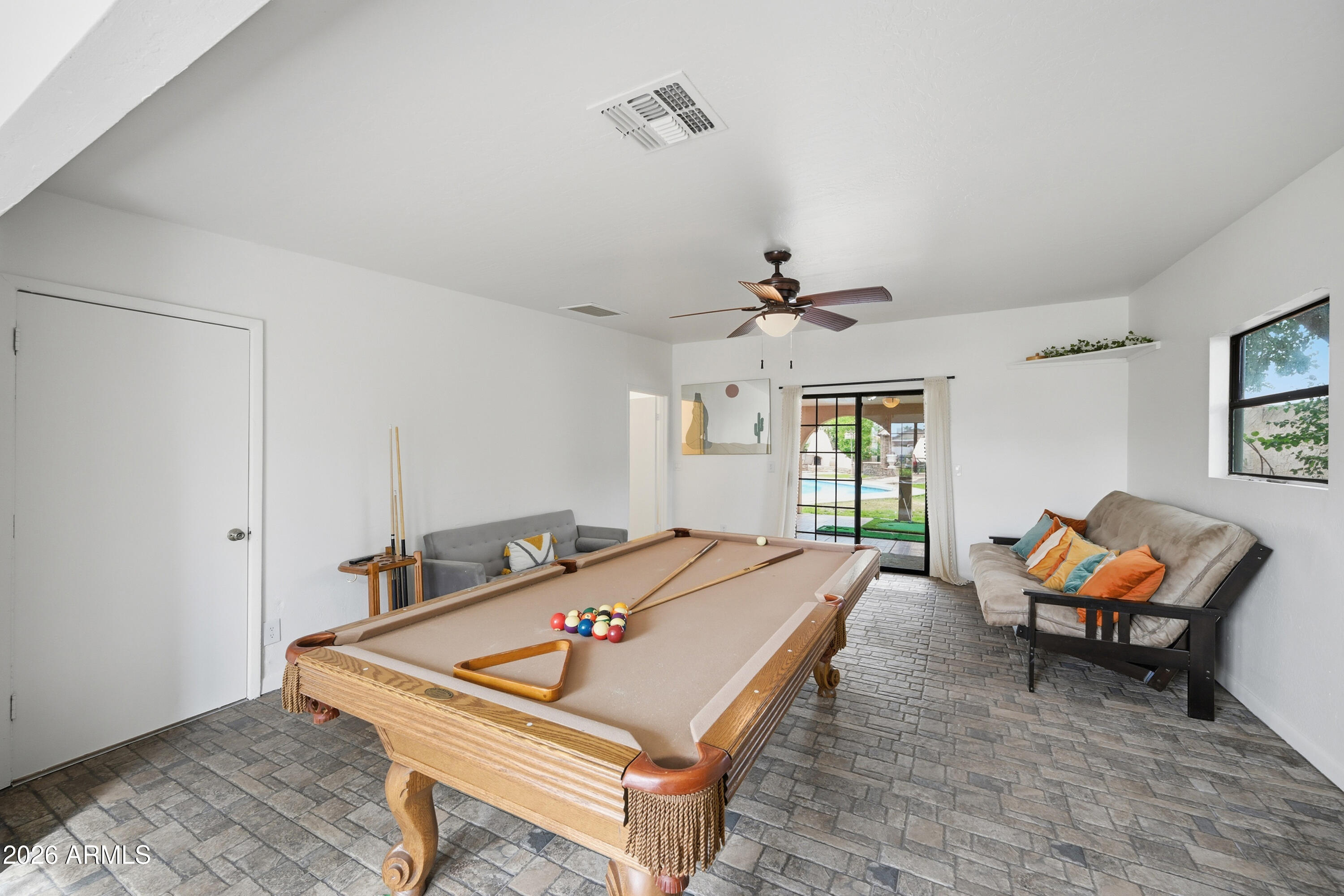 Inside, you'll find arched entryways, an inviting eat-in kitchen with breakfast bar, and a spacious game room complete with a pool table. Currently operating as a successful Airbnb, this property can be sold furnished, making it a seamless turnkey investment or private getaway.
