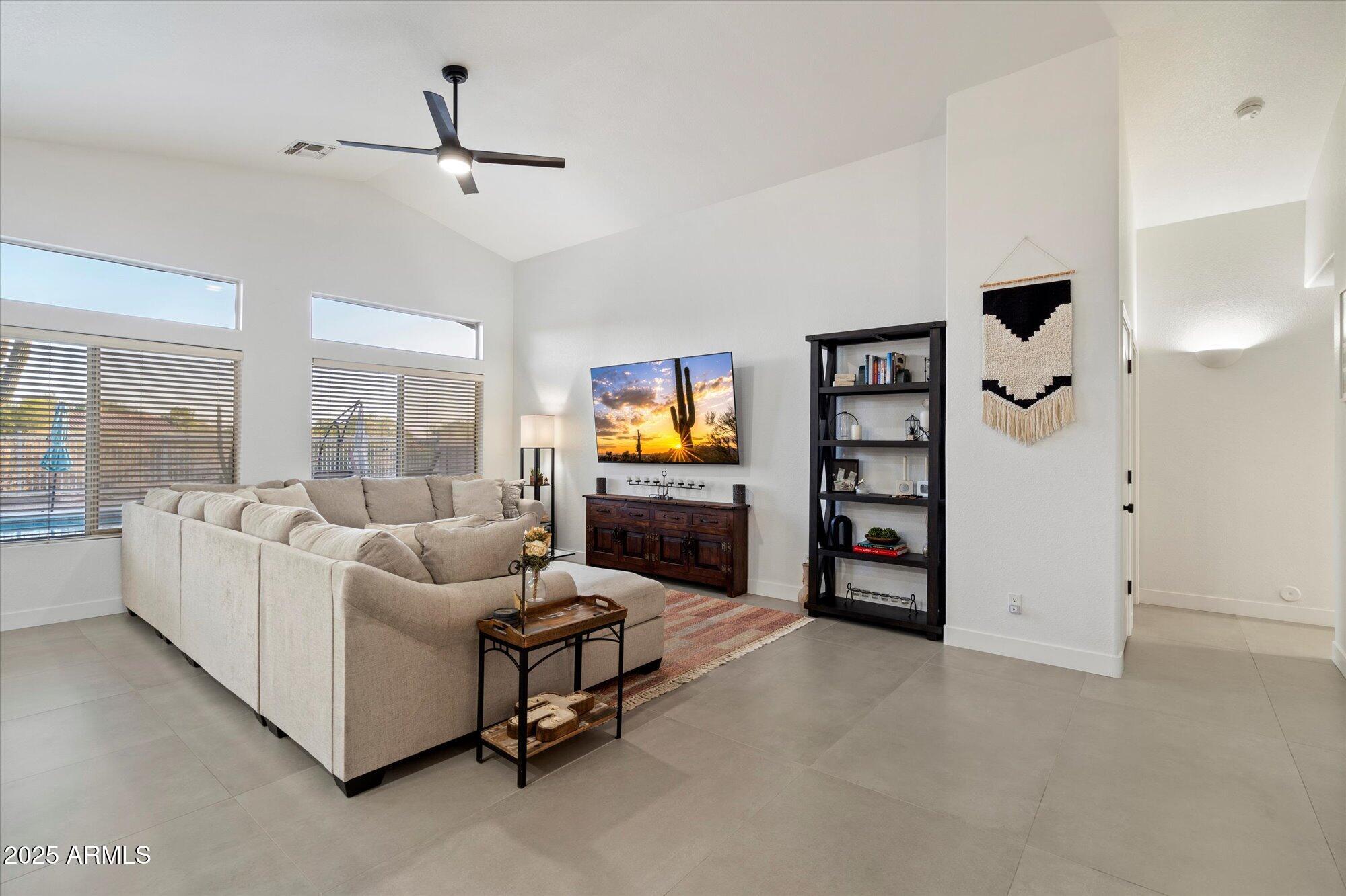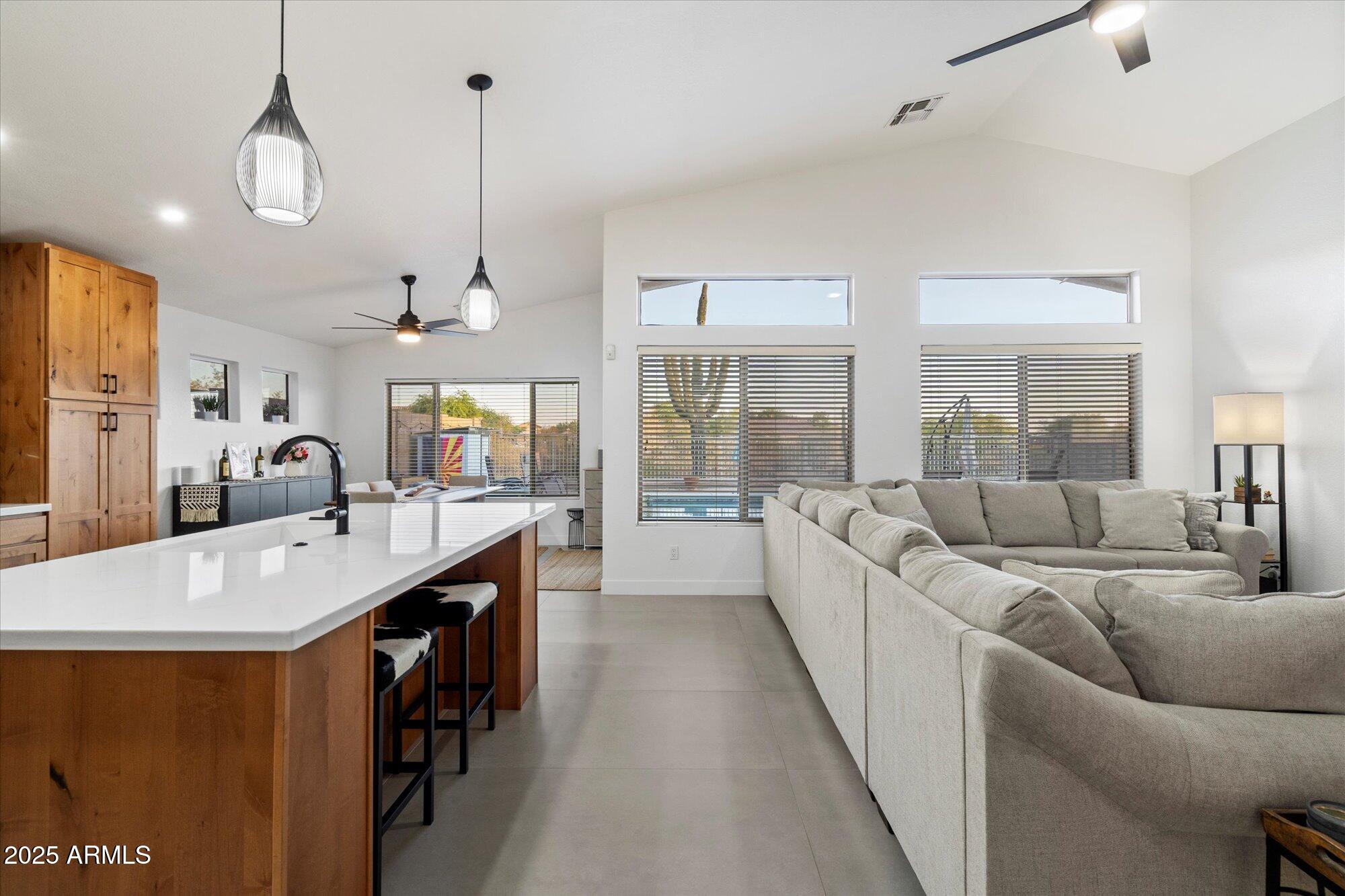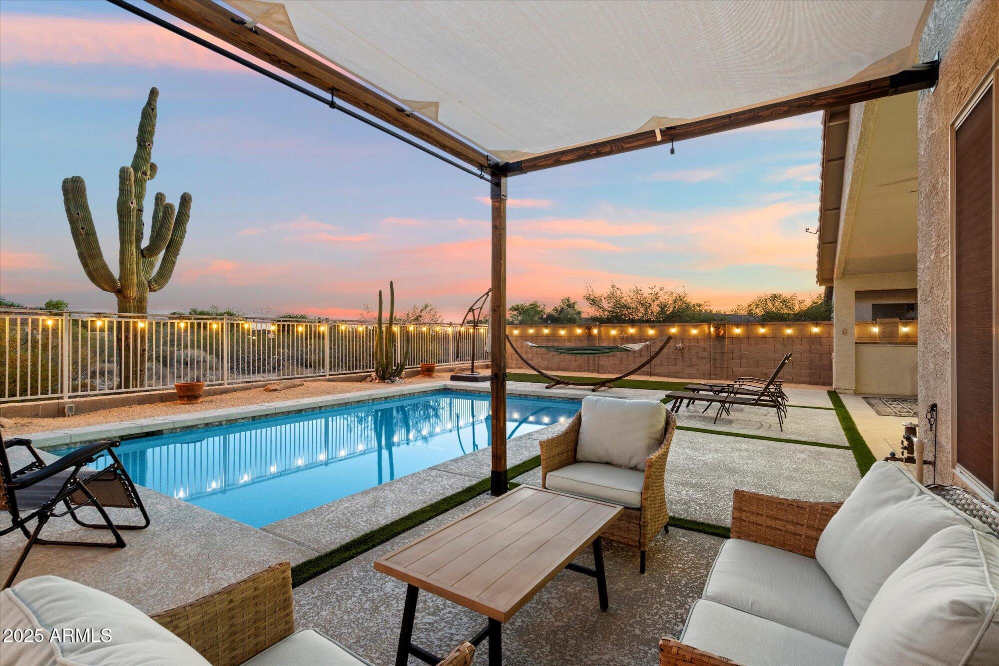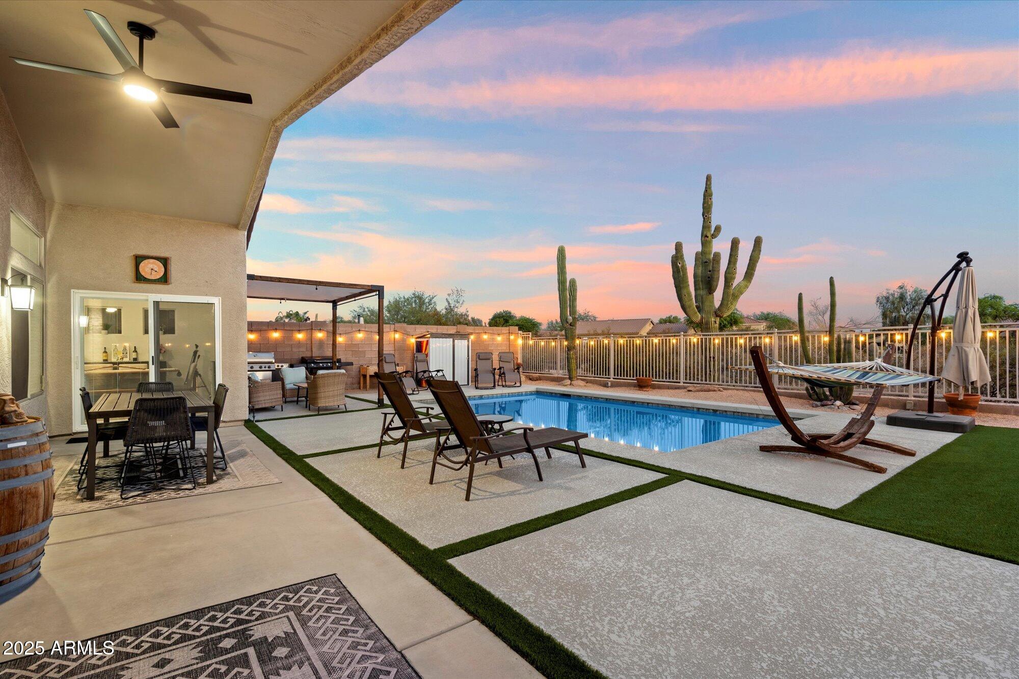 WOW! Centered on a premium view lot in gated Dove Valley Ranch, this single-level home pairs fresh updates with an open, easy flow. FULLY REMODELED! Soaring ceilings and archways brighten a great room that connects to an island kitchen with quartz counters, subway tile, pendant lighting, a gas range and honey-toned knotty cabinetry. The split plan places the backyard-facing primary retreat w/spa bathroom with dual sinks, soaking tub, separate shower, private water closet and walk-in closet. Indoor laundry with built-ins. Pool parties await out back, a covered patio with ceiling fan, retractable shade and string lights overlooks a NEW heated sparkling pool, turf accents w/a view fence frames desert and mountain sunsets. NO CARPET AND NO STAIRS! Your turnkey MODEL HOME Beauty awaits! ....additional lighting, plus a storage shed. Big-ticket peace of mind: new roof, updated HVAC with transferable warranty, and an extended 2 1/2-car garage with climate-controlled workshop, new opener, workbench and shelving. Turnkey living in a favorite Cave Creek neighborhood.