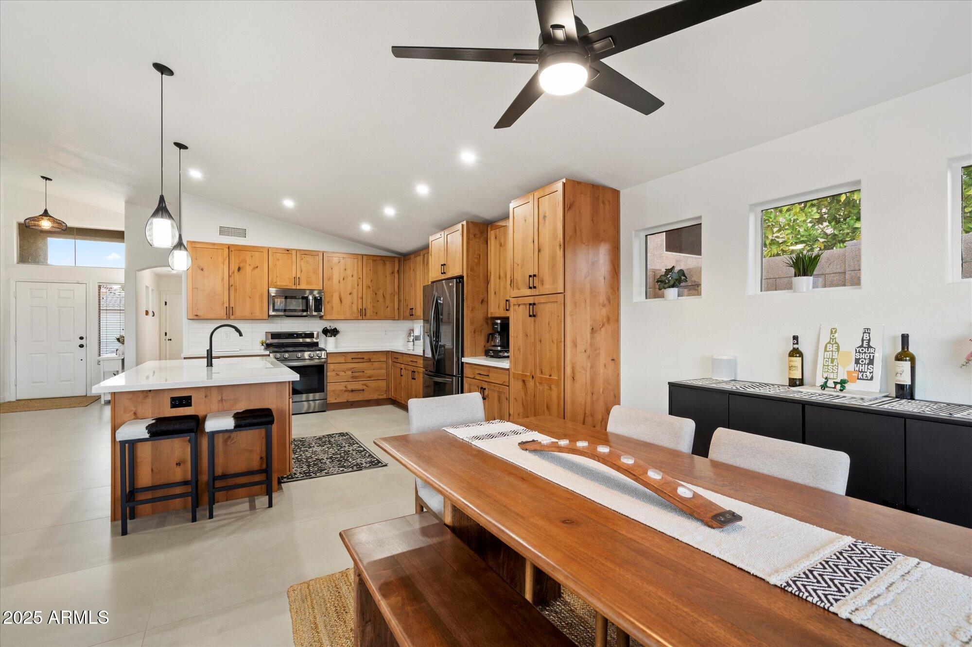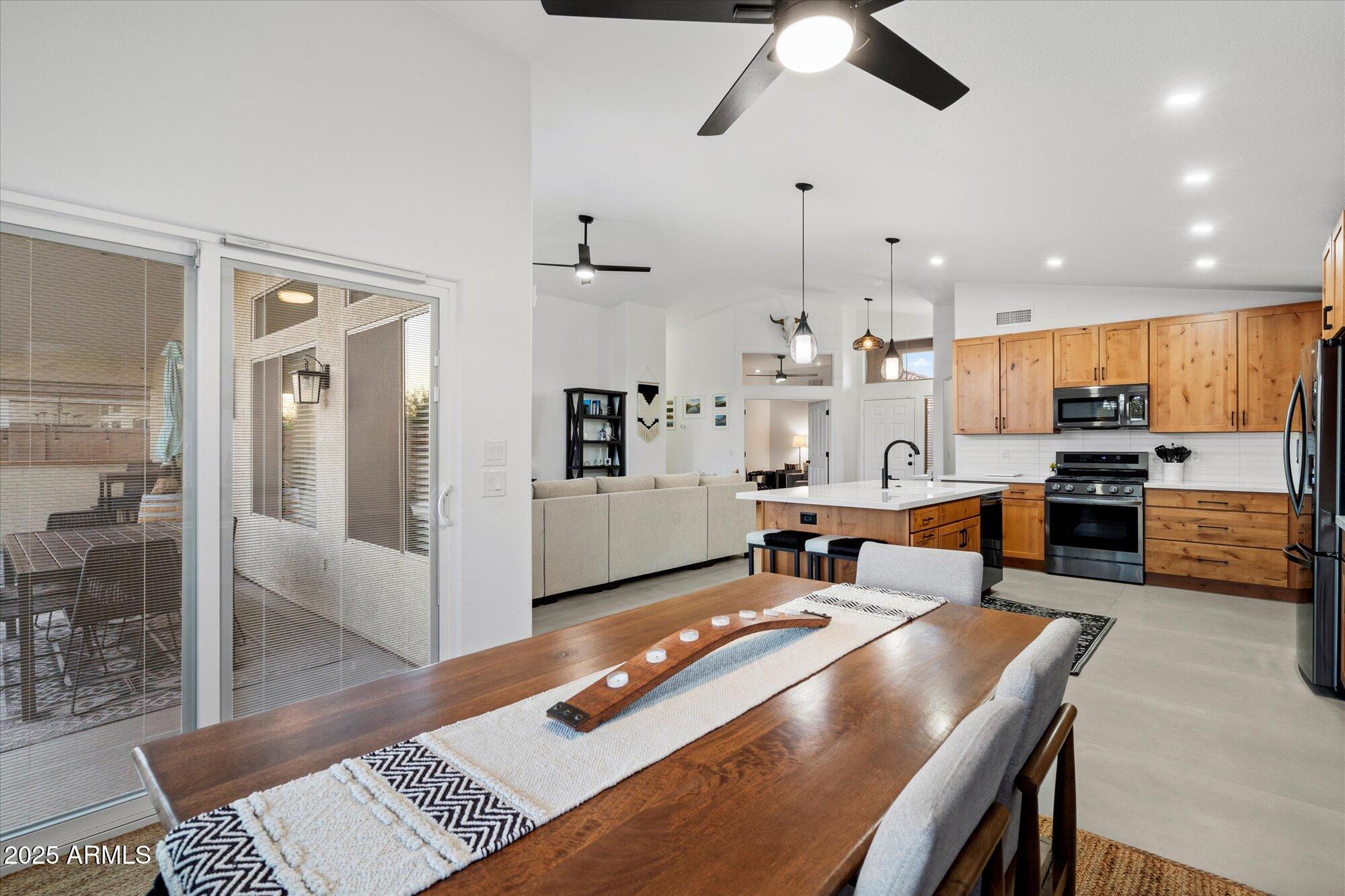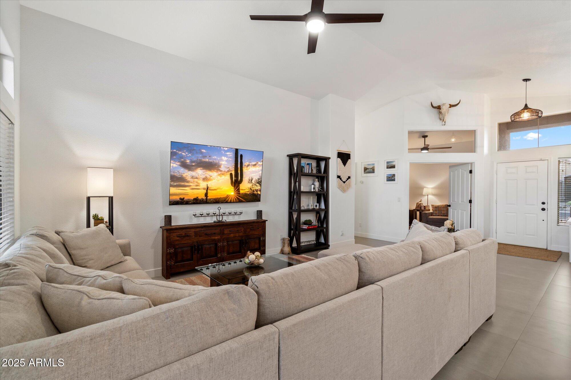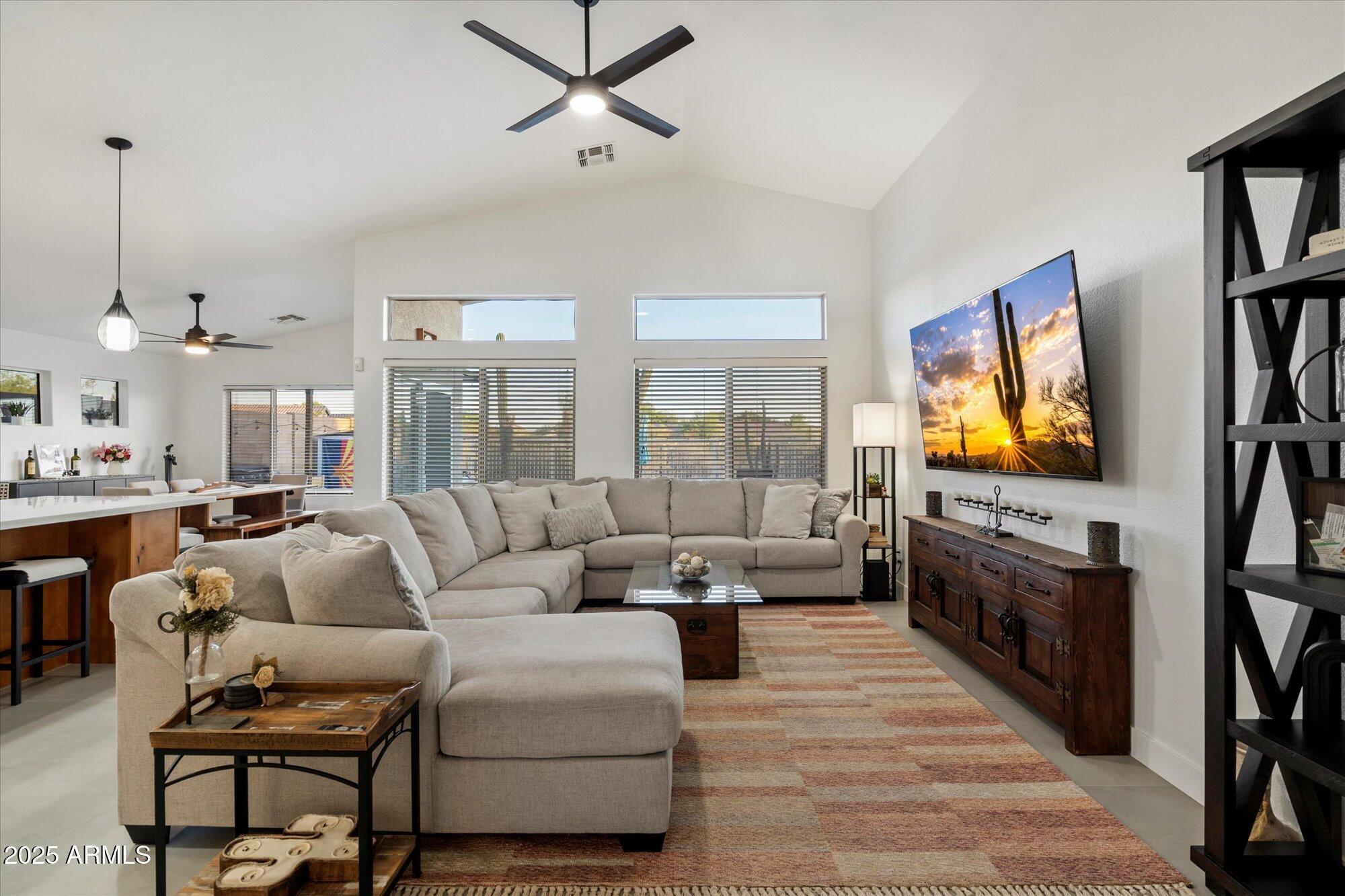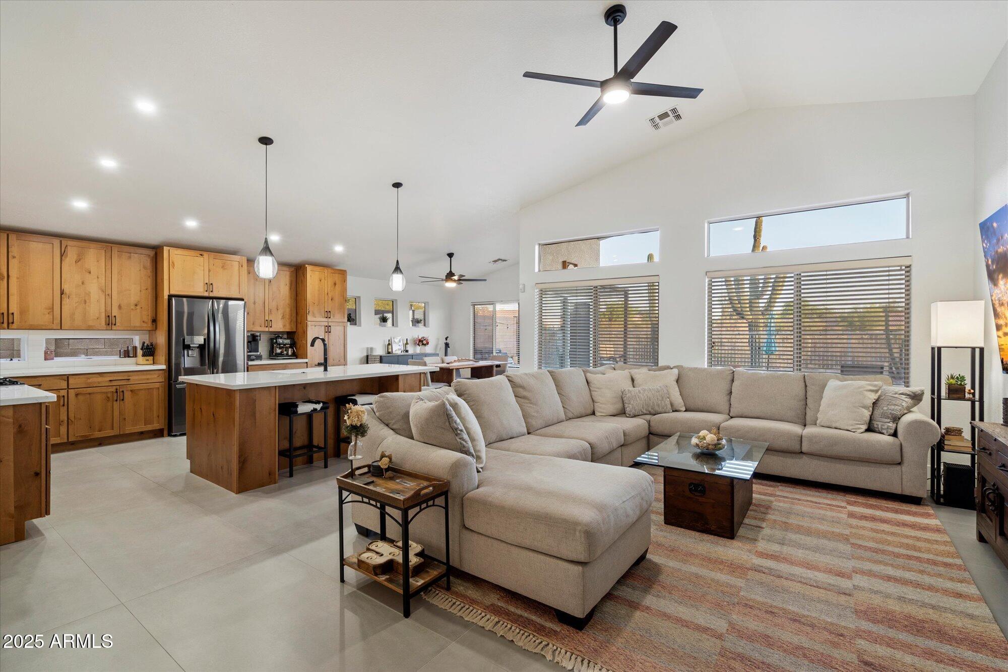 WOW! Centered on a premium view lot in gated Dove Valley Ranch, this single-level home pairs fresh updates with an open, easy flow. FULLY REMODELED! Soaring ceilings and archways brighten a great room that connects to an island kitchen with quartz counters, subway tile, pendant lighting, a gas range and honey-toned knotty cabinetry. The split plan places the backyard-facing primary retreat w/spa bathroom with dual sinks, soaking tub, separate shower, private water closet and walk-in closet. Indoor laundry with built-ins. Pool parties await out back, a covered patio with ceiling fan, retractable shade and string lights overlooks a NEW heated sparkling pool, turf accents w/a view fence frames desert and mountain sunsets. NO CARPET AND NO STAIRS! Your turnkey MODEL HOME Beauty awaits! ....additional lighting, plus a storage shed. Big-ticket peace of mind: new roof, updated HVAC with transferable warranty, and an extended 2 1/2-car garage with climate-controlled workshop, new opener, workbench and shelving. Turnkey living in a favorite Cave Creek neighborhood.