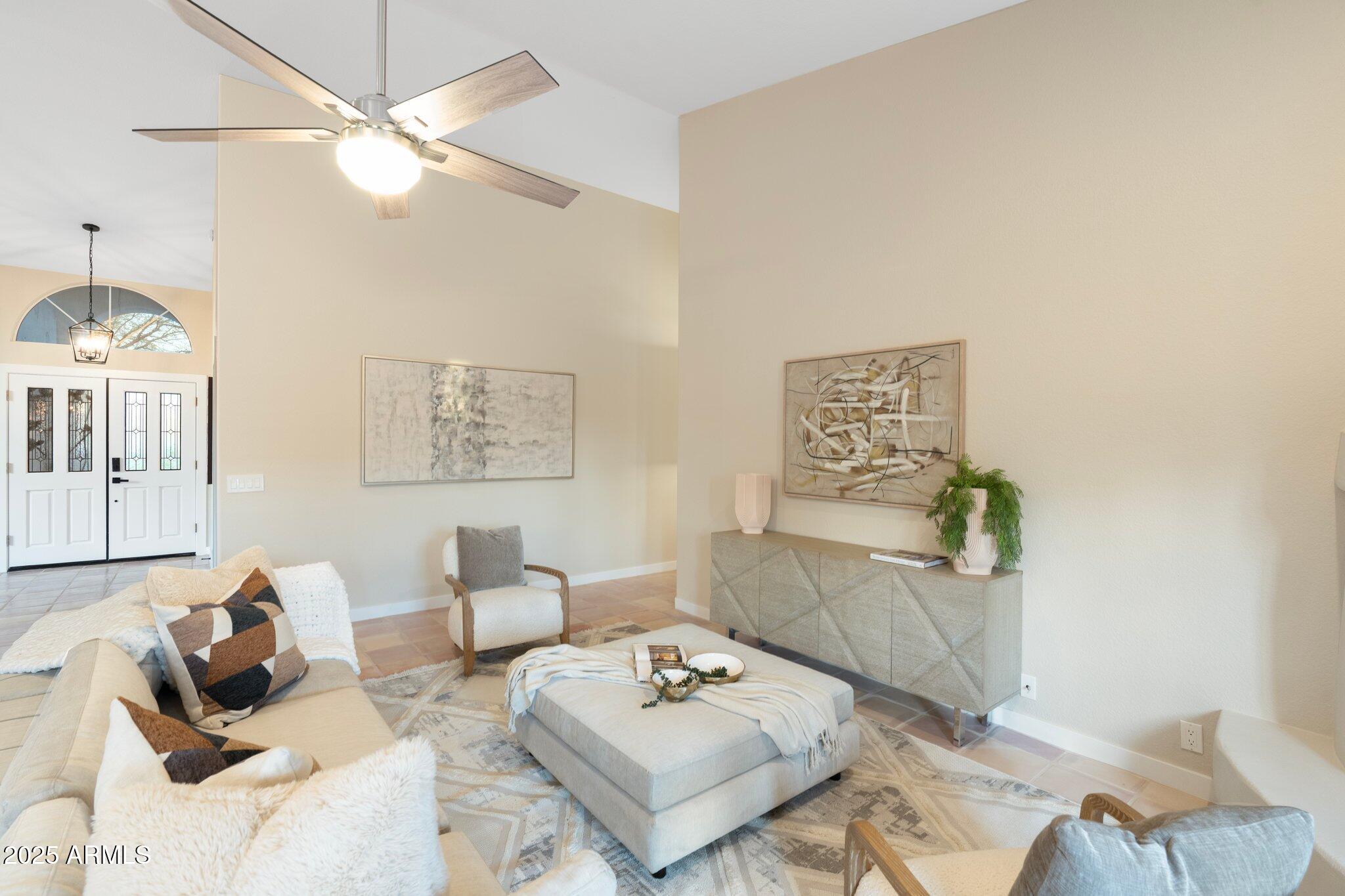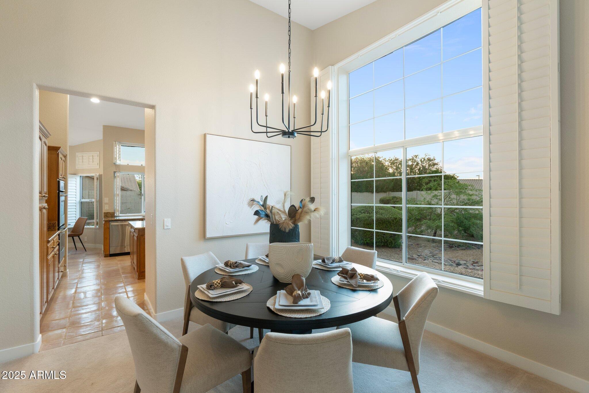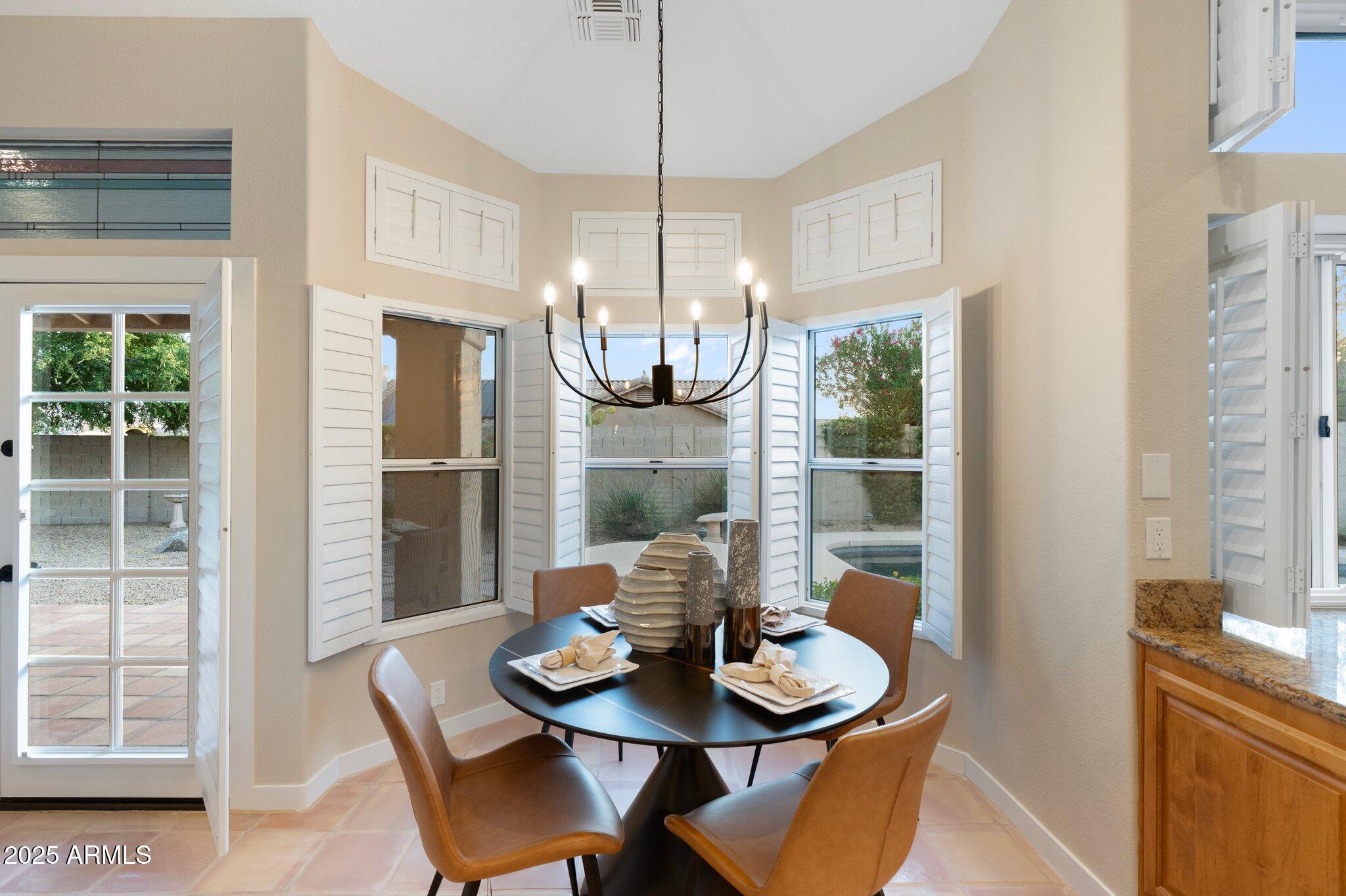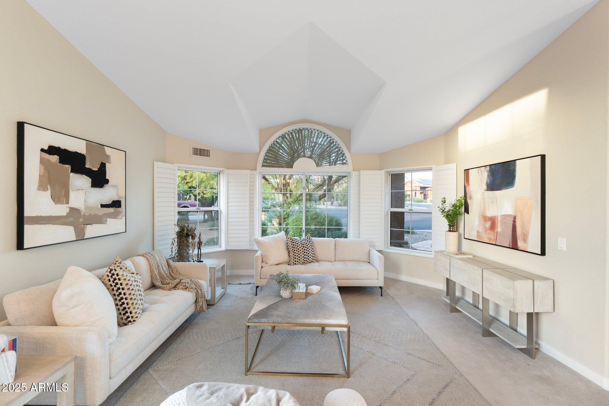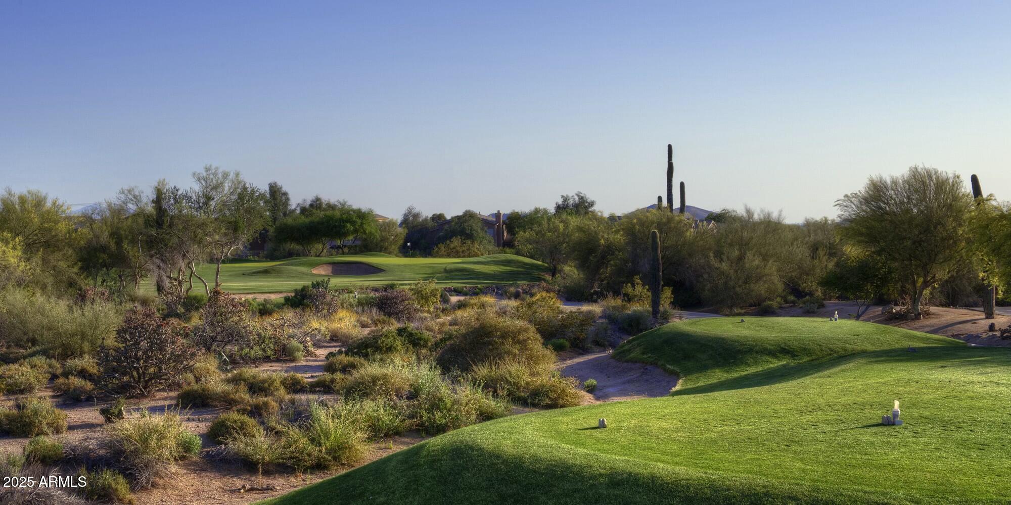 Top-Tier Living nestled on a premium, QUARTER ACRE, CUL-DE-SAC, CORNER LOT in the coveted DESERT FAIRWAYS OF TATUM RANCH. No neighbors to the left or directly in front, near HOLE 5 of Robert Cupp's designed, PRIVATE 18-HOLE CHAMPIONSHIP GOLF COURSE! Admire the mountain views and fairway views on the drive to/from home every day. Built by UDC Homes, this one story home wows with IMPRESSIVE VAULTED CEILINGS, gorgeous, custom double pane arched windows for endless natural light and solid wood shutters on every window for ENERGY EFFICIENCY. Note the custom architectural inspired, curved fireplace with mantle along with French doors to your DESIGNATED OFFICE/STUDY with built in desks, shelving and display cabinets or easily convert for a 4TH BEDROOM. Chef's kitchen with granite counters, ample cabinetry, GE Profile stainless steel appliances, island and breakfast nook for convenient dining. Additional French doors guide you to the massive private backyard retreat complete with a sparkling PEBBLE-TEC POOL with cool decking surround, a covered patio, and mature landscaping. Enjoy the spacious 3 CAR GARAGE with built in cabinetry and convenient man door to the backyard. This entire community is centered around the Tatum Ranch Golf Club featuring practice facilities, a fitness center, and a Junior-Olympic heated pool & spa. The neighborhood includes 3 COMMUNITY PARKS - Desert Willow, Dynamite, and Lone Mountain fully equipped with PLAYGROUNDS, picnic ramadas, basketball, volleyball, soccer fields, plus numerous walking, biking, and equestrian trails woven throughout, TENNIS AND PICKLEBALL courts, a clubhouse and business center, BBQ areas, and rentable community center for private events Plus a robust array of fun optional gatherings and volunteer opportunities to join. High value community, yet LOW HOA DUES!