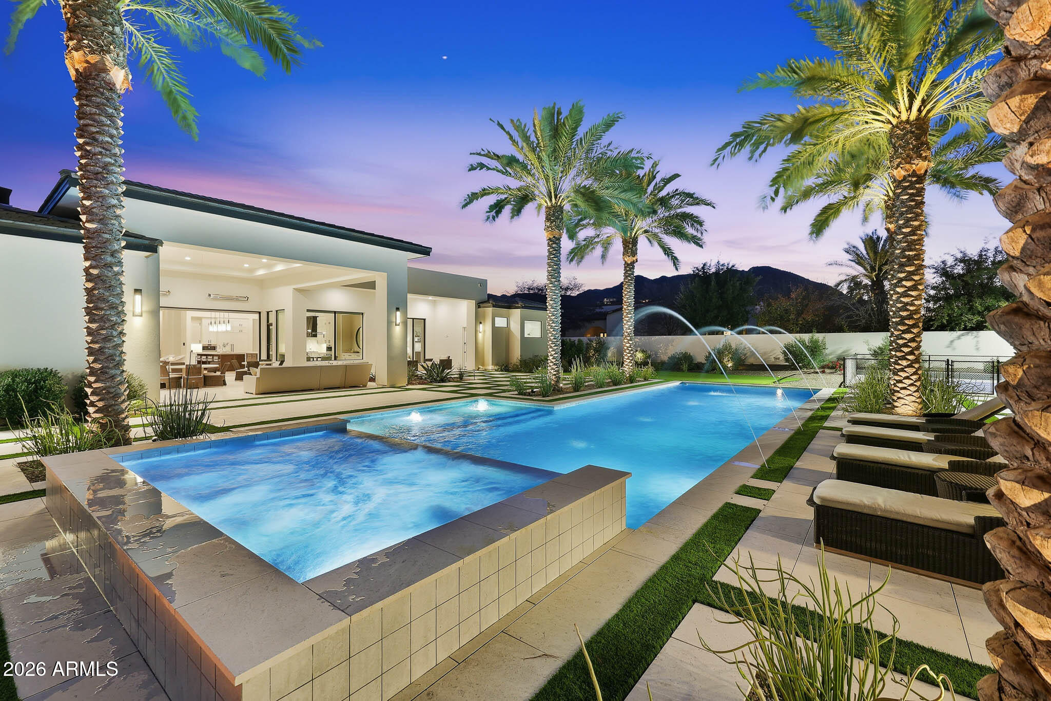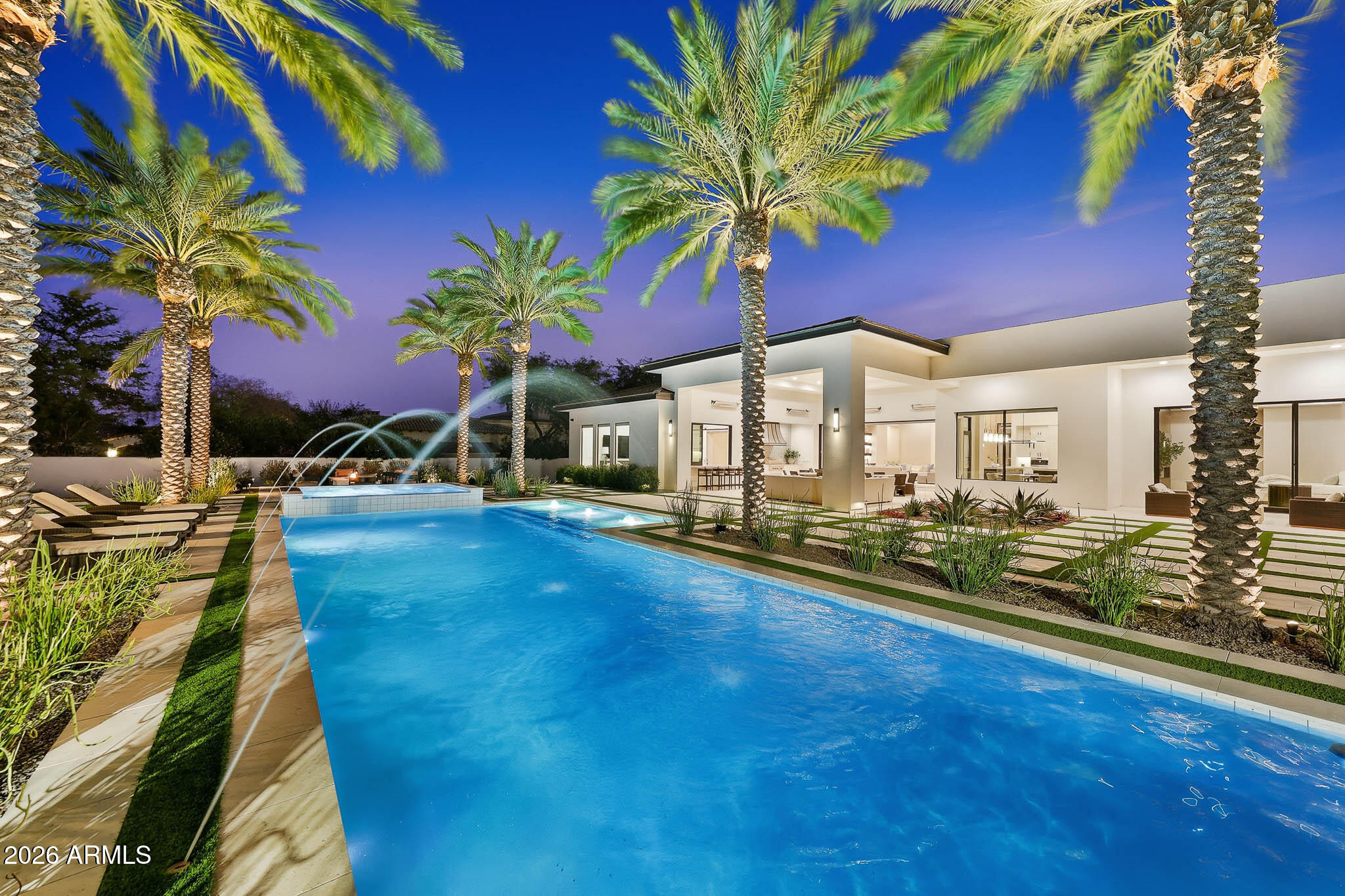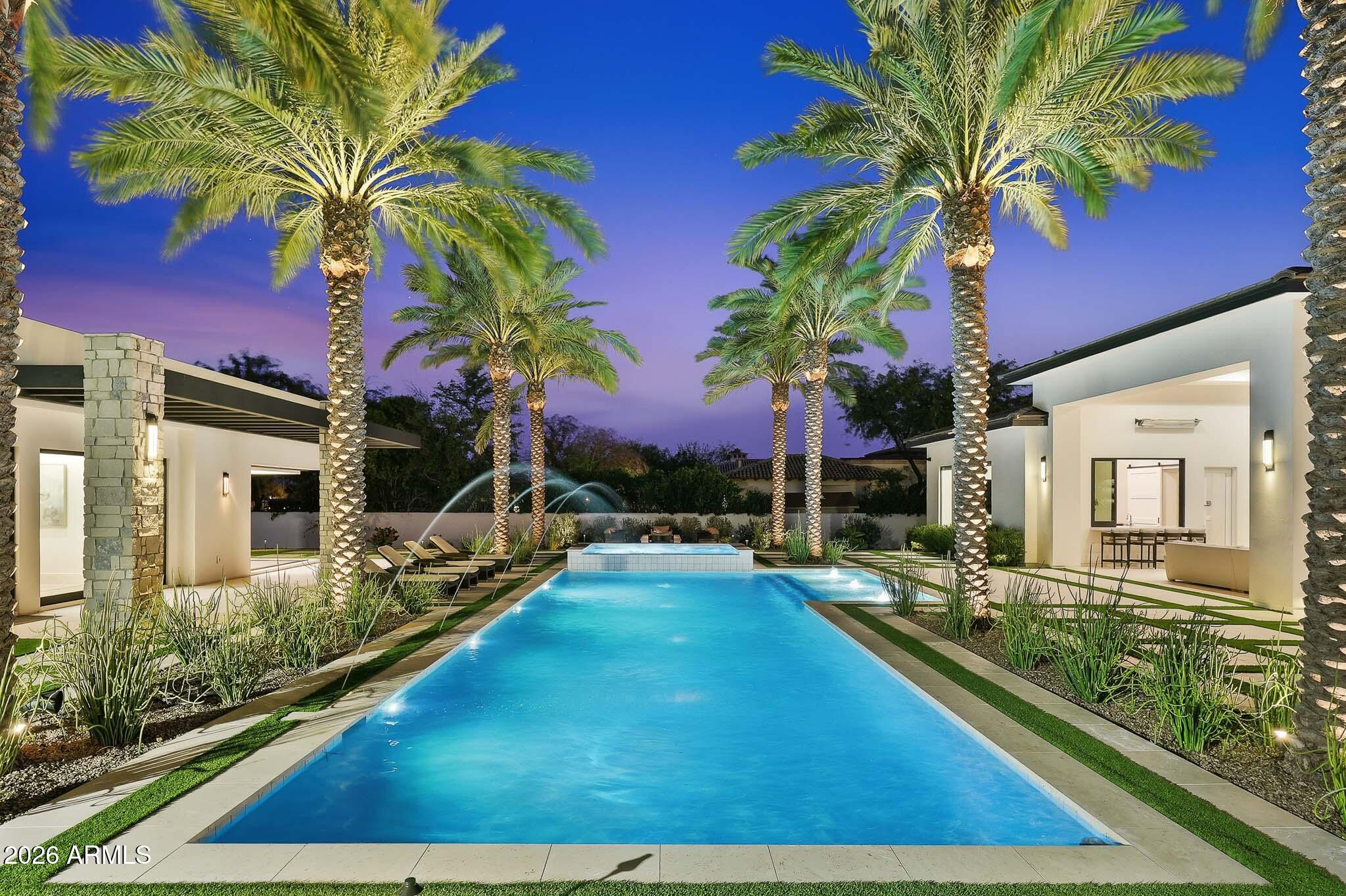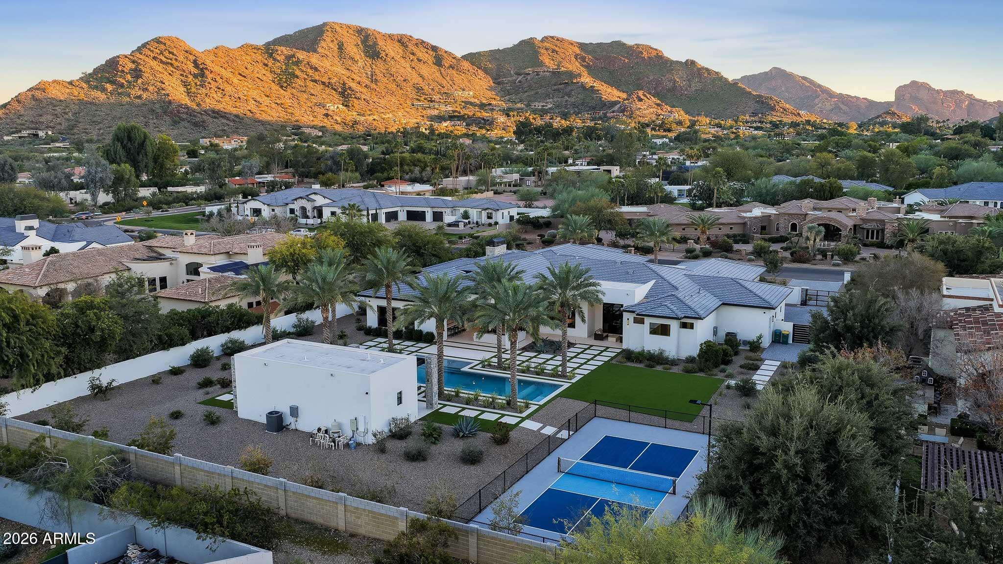 Premier Paradise Valley living with breathtaking Camelback Mountain views. This exceptional Forte Homes residence is ideally positioned in one of PV's most desirable locations and offers a rare blend of modern architecture, resort-style outdoor living, and elevated luxury finishes throughout. The main residence spans 6,509 sq ft and is complemented by a 575 sq ft detached guest house, creating a total of 6 bedrooms and 6.5 bathrooms. Designed with a desirable split floor plan, the home features an expansive great room with soaring ceilings and dramatic wood beam details in both the living and dining areas. Walls of glass seamlessly connect indoor and outdoor living spaces, perfect for entertaining. The chef's kitchen is equipped with Sub-Zero and Wolf appliances and opens to the great room, while additional interior highlights include a private office, formal dining room with a stunning climate-controlled wine room, and a versatile flex room with an indoor/outdoor bar. High-end wall coverings throughout, along with Rocky Mountain Hardware, Visual Comfort lighting, Control4 smart-home automation, Taj Mahal quartz throughout, and luxury engineered hardware at every turn. The resort-style backyard is a true showpiece, framed by rows of gorgeous, mature palm trees and designed for both relaxation and recreation. Outdoor amenities include a large heated pool and spa with water features, multiple covered patios, fire features, lush landscaping, and a full-size pickleball courtcreating a private oasis ideal for year-round enjoyment.