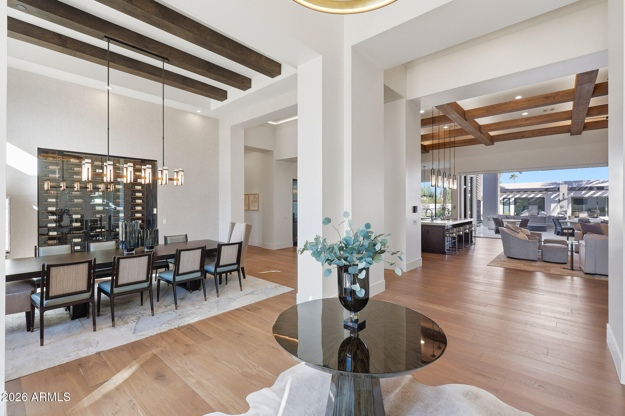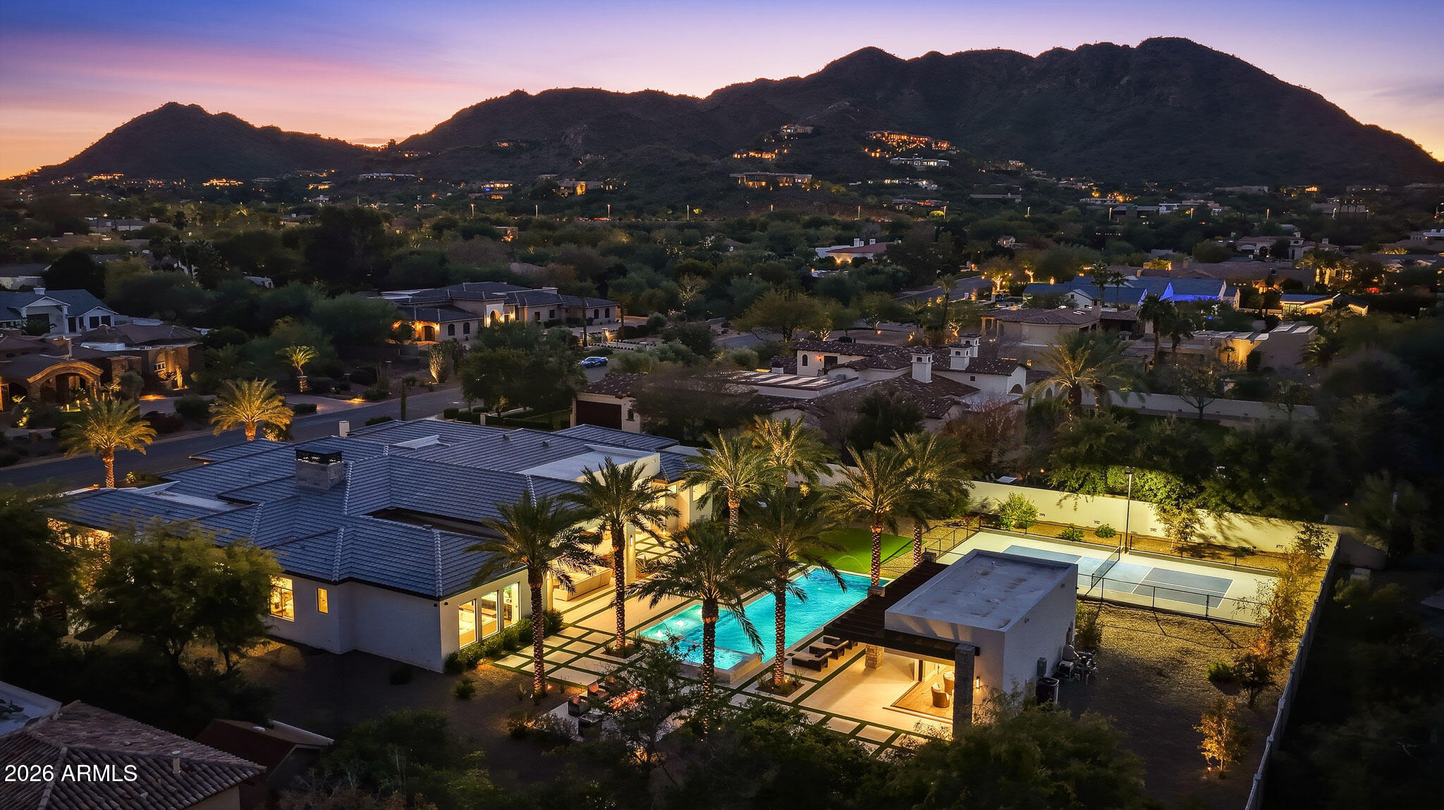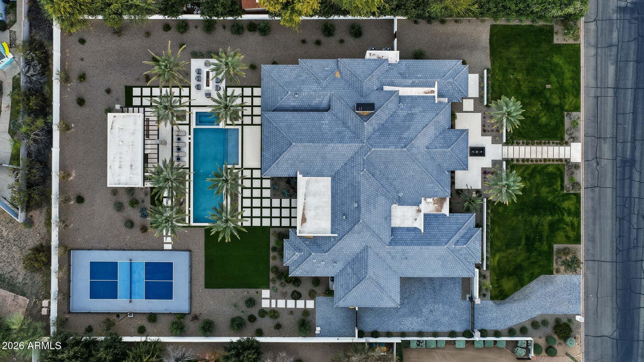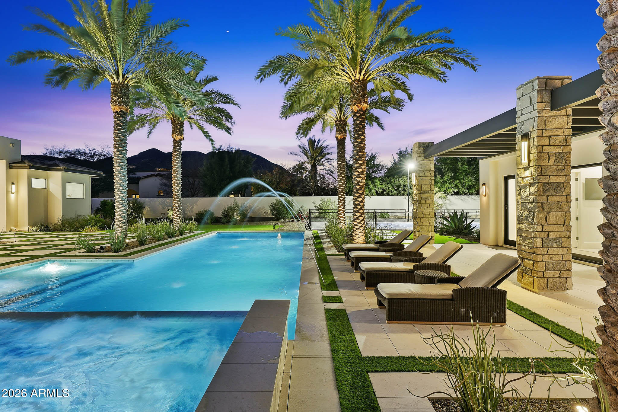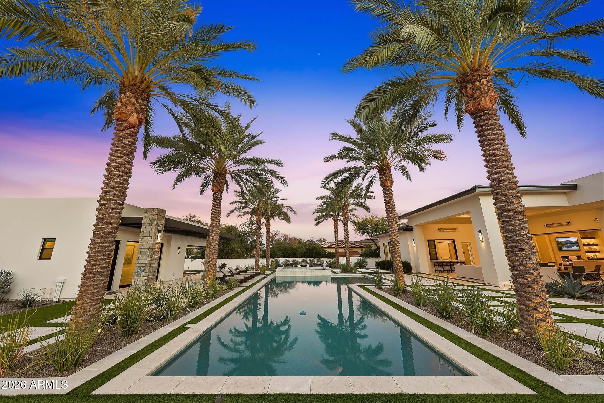Premier Paradise Valley living with breathtaking Camelback Mountain views. This exceptional Forte Homes residence is ideally positioned in one of PV's most desirable locations and offers a rare blend of modern architecture, resort-style outdoor living, and elevated luxury finishes throughout. The main residence spans 6,509 sq ft and is complemented by a 575 sq ft detached guest house, creating a total of 6 bedrooms and 6.5 bathrooms. Designed with a desirable split floor plan, the home features an expansive great room with soaring ceilings and dramatic wood beam details in both the living and dining areas. Walls of glass seamlessly connect indoor and outdoor living spaces, perfect for entertaining. The chef's kitchen is equipped with Sub-Zero and Wolf appliances and opens to the great room, while additional interior highlights include a private office, formal dining room with a stunning climate-controlled wine room, and a versatile flex room with an indoor/outdoor bar. High-end wall coverings throughout, along with Rocky Mountain Hardware, Visual Comfort lighting, Control4 smart-home automation, Taj Mahal quartz throughout, and luxury engineered hardware at every turn. The resort-style backyard is a true showpiece, framed by rows of gorgeous, mature palm trees and designed for both relaxation and recreation. Outdoor amenities include a large heated pool and spa with water features, multiple covered patios, fire features, lush landscaping, and a full-size pickleball courtcreating a private oasis ideal for year-round enjoyment.