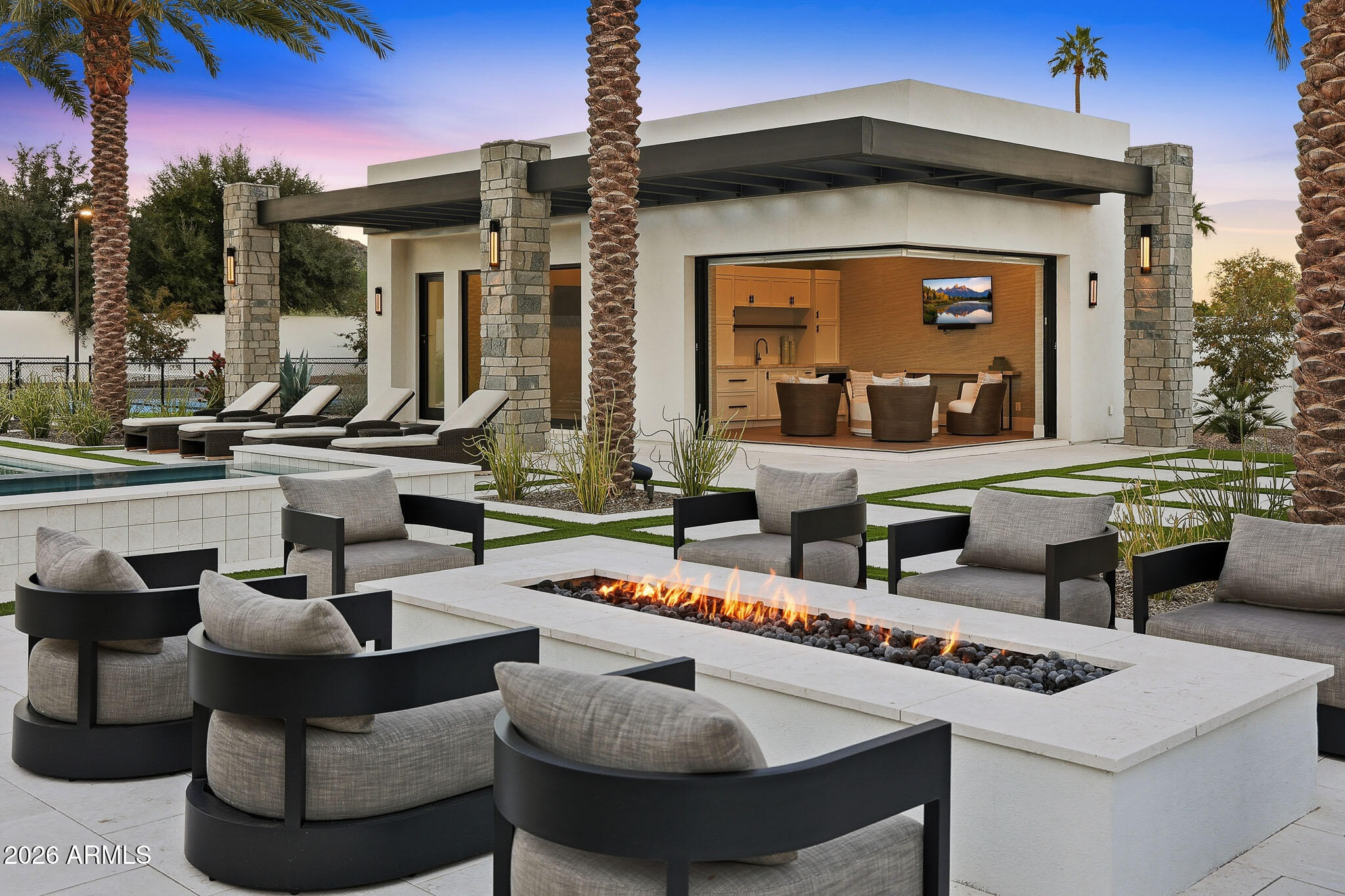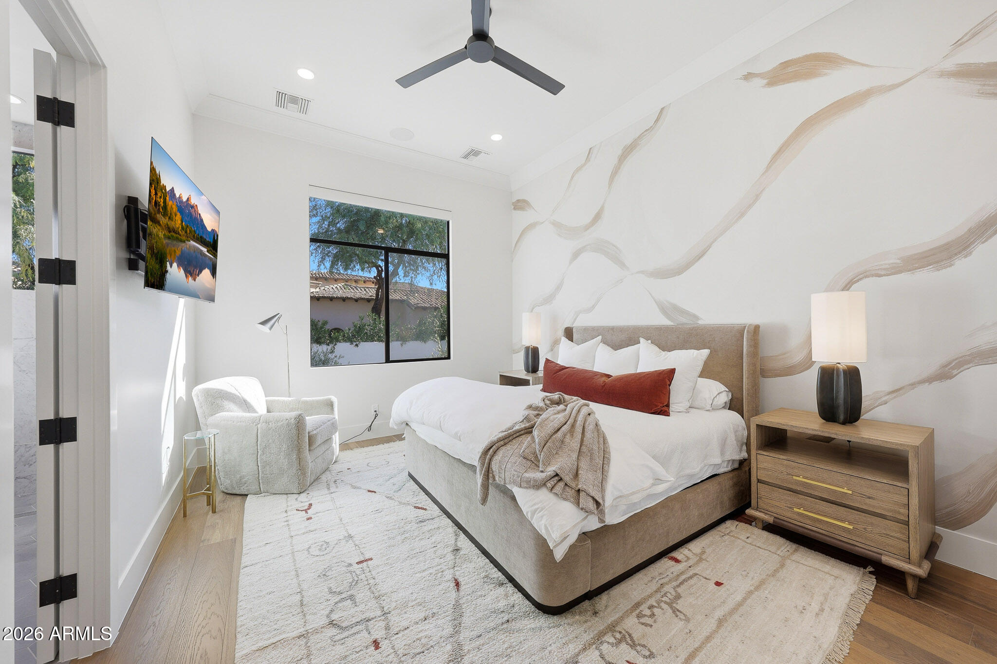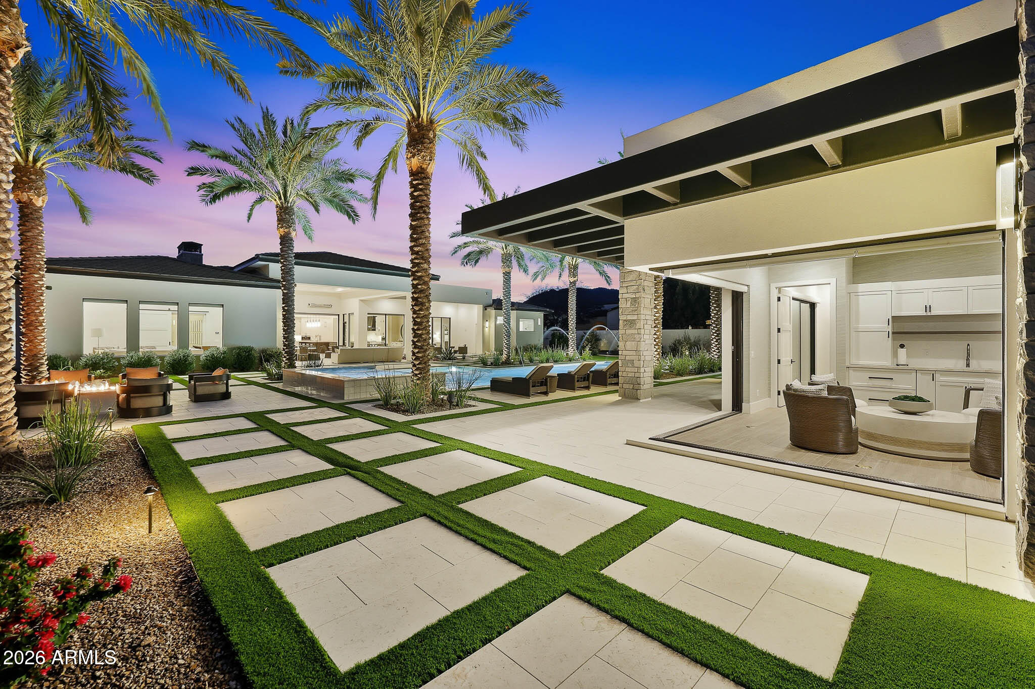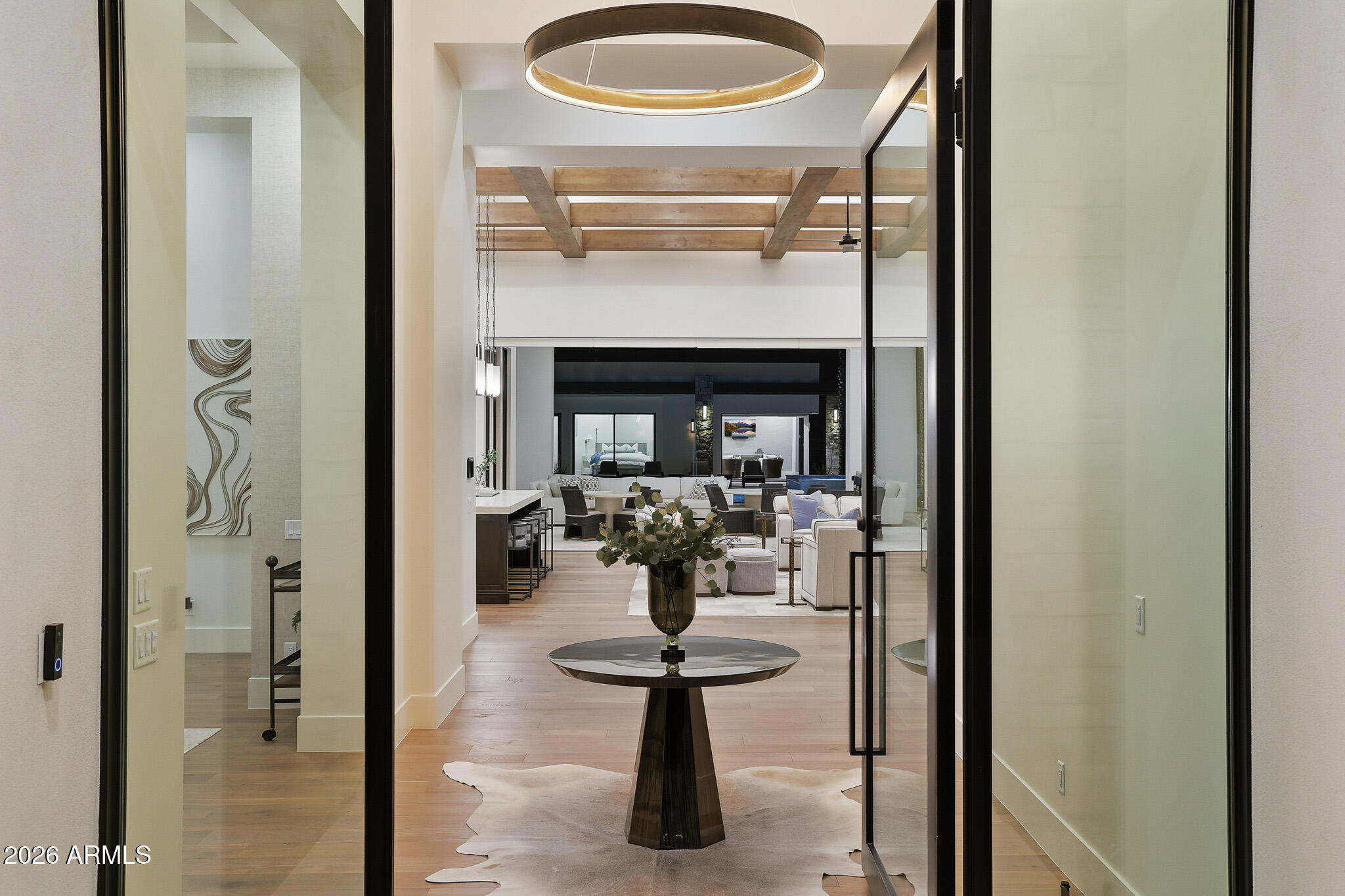 Premier Paradise Valley living with breathtaking Camelback Mountain views. This exceptional Forte Homes residence is ideally positioned in one of PV's most desirable locations and offers a rare blend of modern architecture, resort-style outdoor living, and elevated luxury finishes throughout. The main residence spans 6,509 sq ft and is complemented by a 575 sq ft detached guest house, creating a total of 6 bedrooms and 6.5 bathrooms. Designed with a desirable split floor plan, the home features an expansive great room with soaring ceilings and dramatic wood beam details in both the living and dining areas. Walls of glass seamlessly connect indoor and outdoor living spaces, perfect for entertaining. The chef's kitchen is equipped with Sub-Zero and Wolf appliances and opens to the great room, while additional interior highlights include a private office, formal dining room with a stunning climate-controlled wine room, and a versatile flex room with an indoor/outdoor bar. High-end wall coverings throughout, along with Rocky Mountain Hardware, Visual Comfort lighting, Control4 smart-home automation, Taj Mahal quartz throughout, and luxury engineered hardware at every turn. The resort-style backyard is a true showpiece, framed by rows of gorgeous, mature palm trees and designed for both relaxation and recreation. Outdoor amenities include a large heated pool and spa with water features, multiple covered patios, fire features, lush landscaping, and a full-size pickleball courtcreating a private oasis ideal for year-round enjoyment.