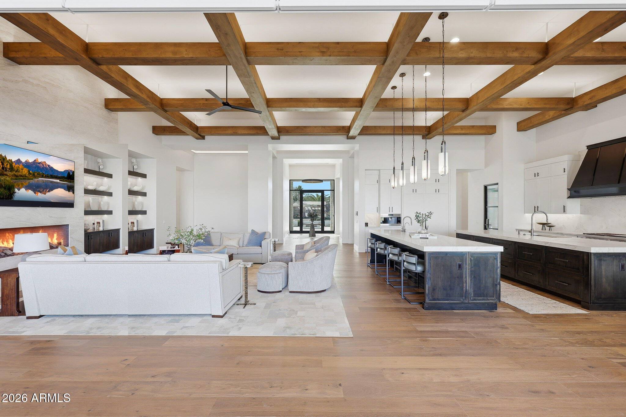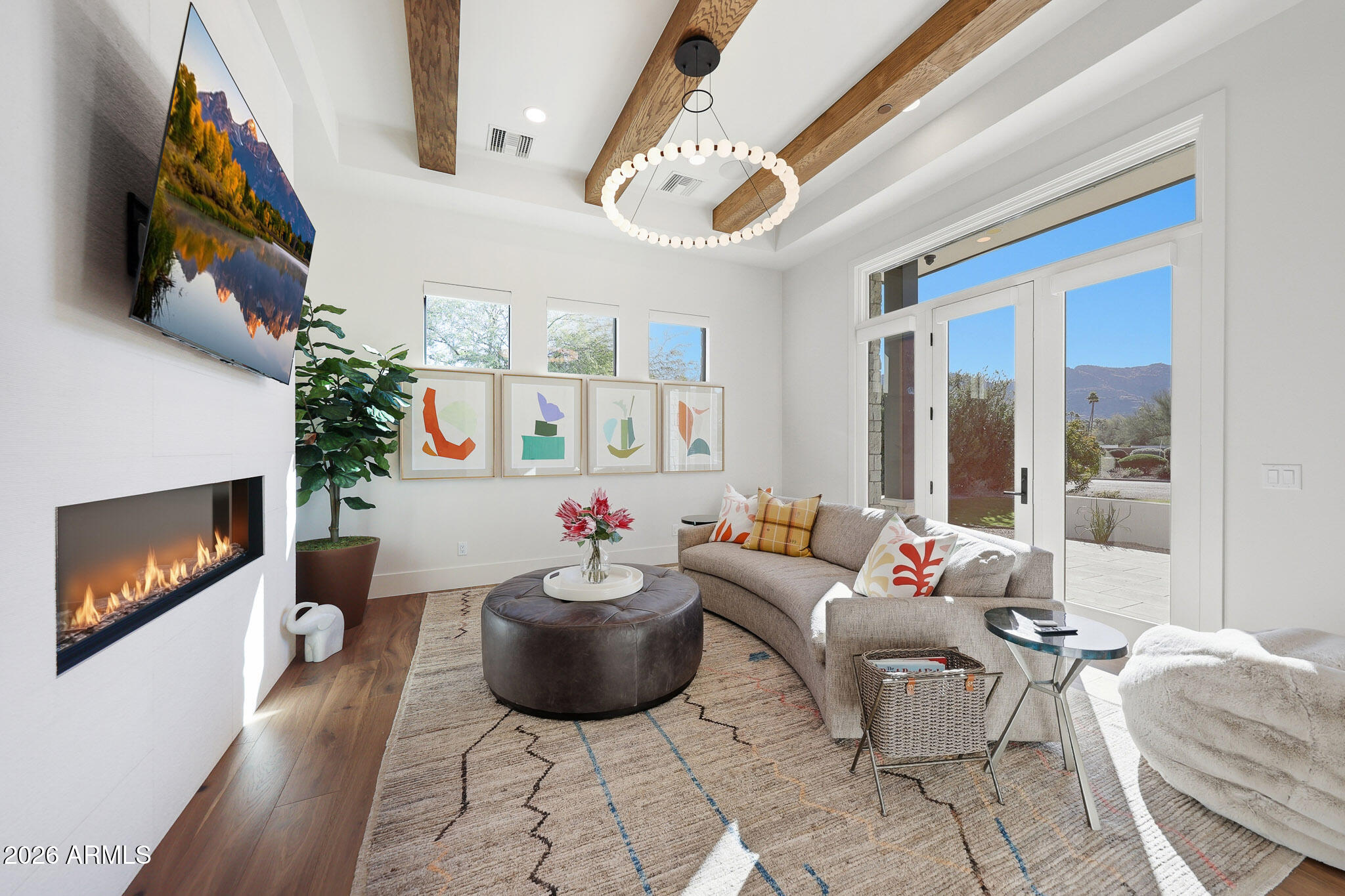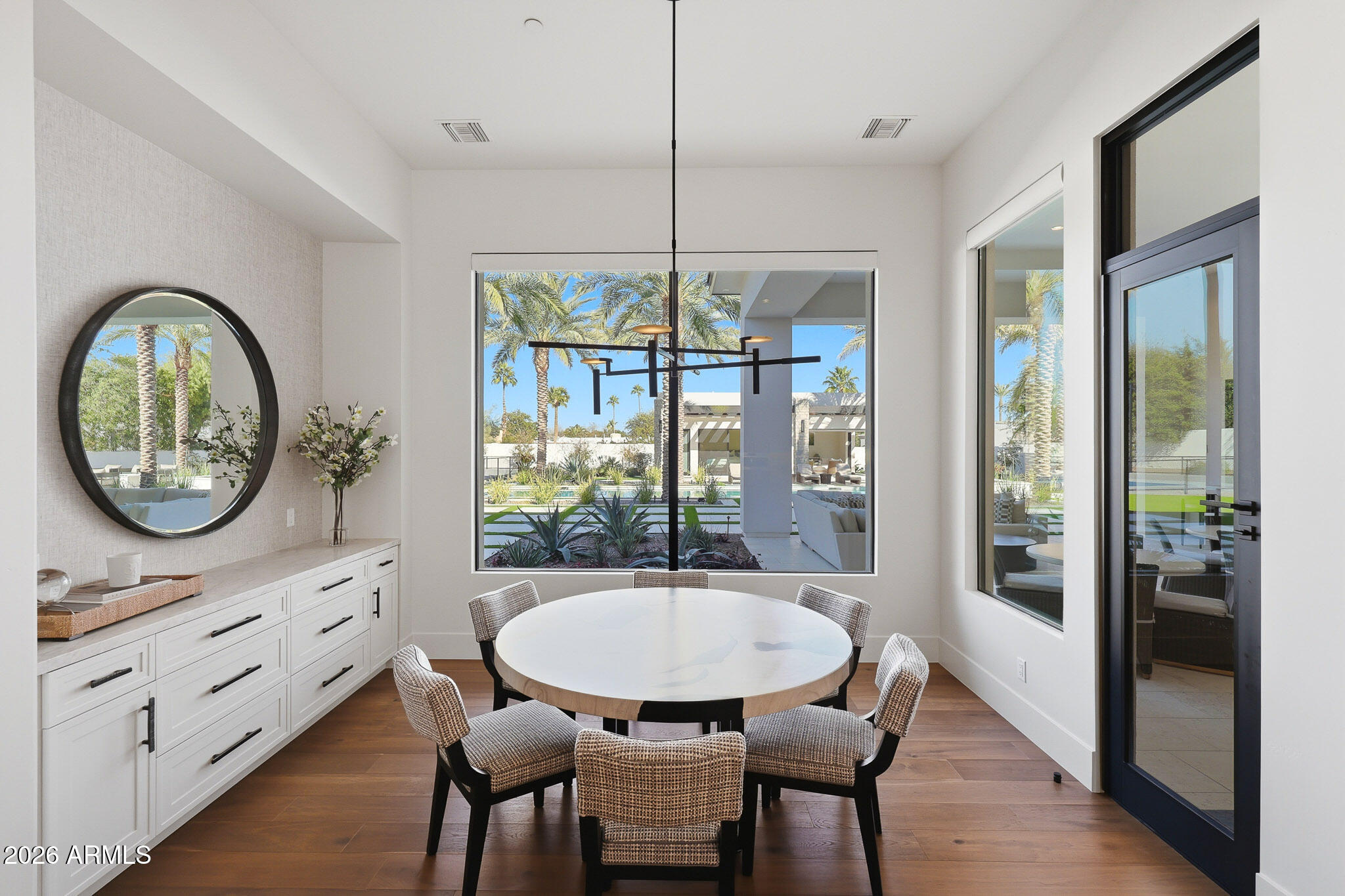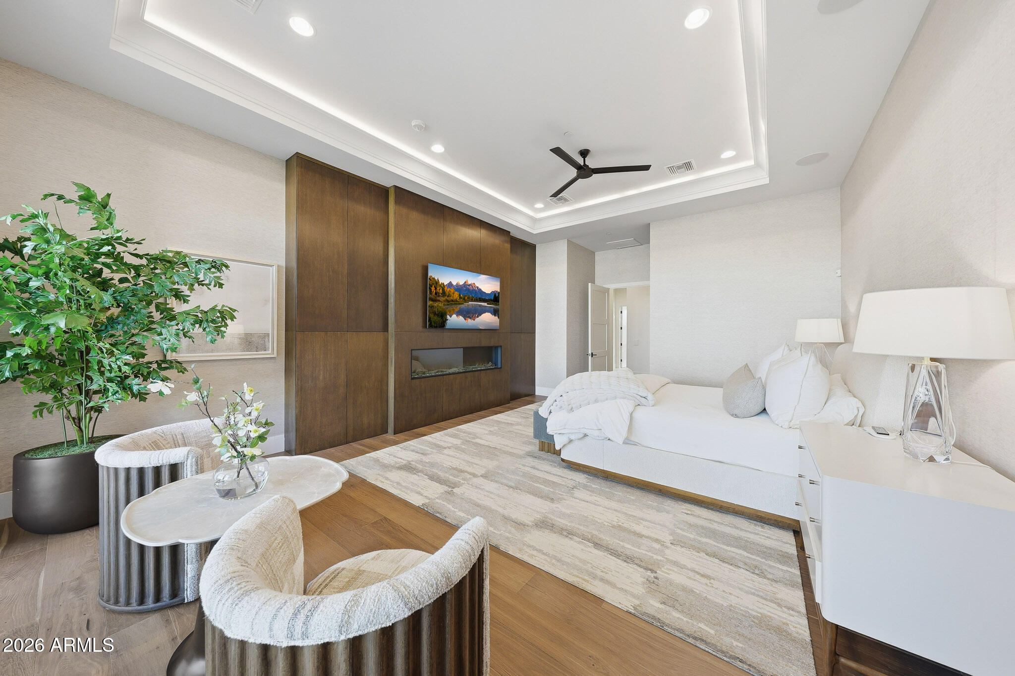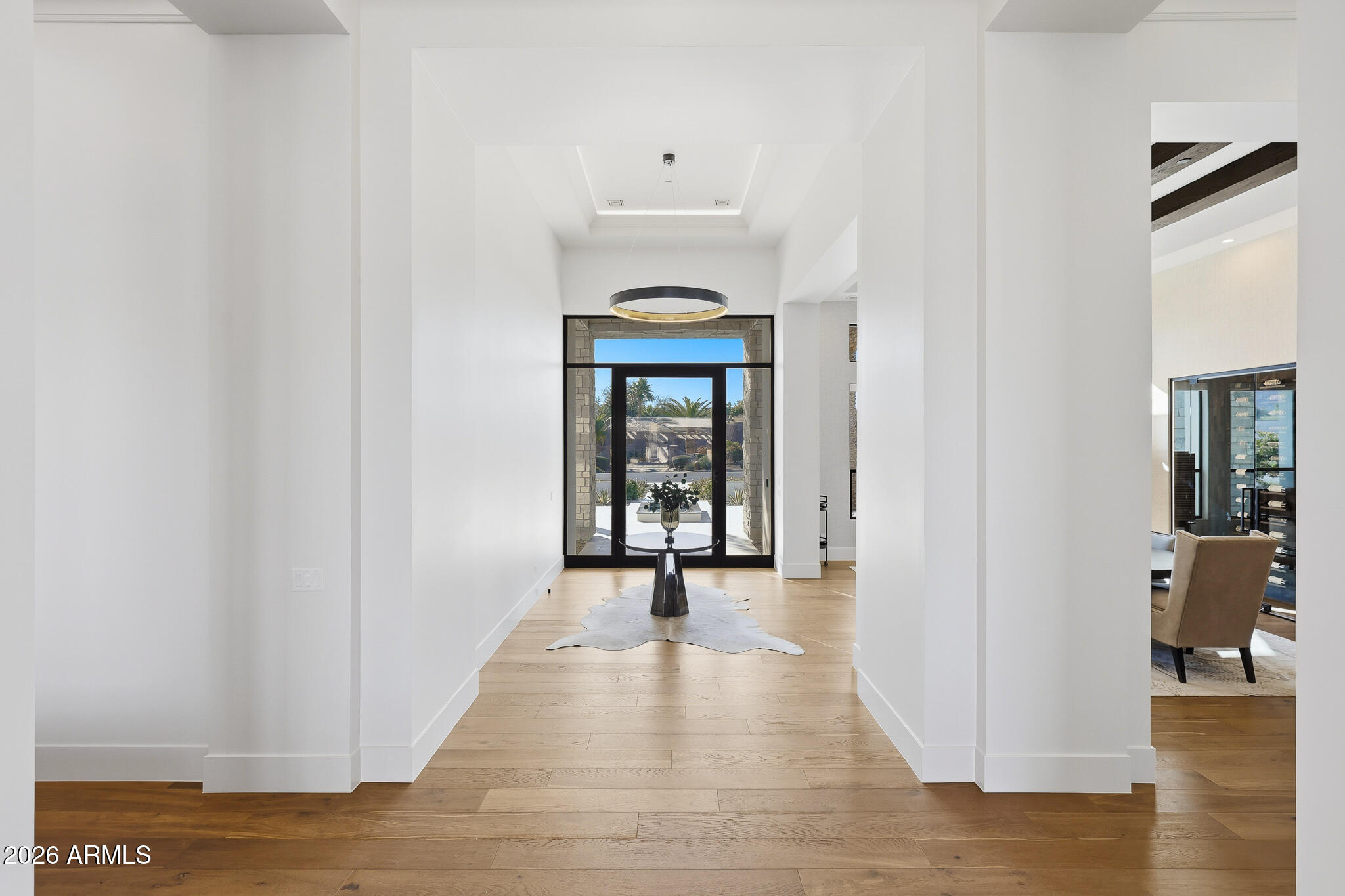 Premier Paradise Valley living with breathtaking Camelback Mountain views. This exceptional Forte Homes residence is ideally positioned in one of PV's most desirable locations and offers a rare blend of modern architecture, resort-style outdoor living, and elevated luxury finishes throughout. The main residence spans 6,509 sq ft and is complemented by a 575 sq ft detached guest house, creating a total of 6 bedrooms and 6.5 bathrooms. Designed with a desirable split floor plan, the home features an expansive great room with soaring ceilings and dramatic wood beam details in both the living and dining areas. Walls of glass seamlessly connect indoor and outdoor living spaces, perfect for entertaining. The chef's kitchen is equipped with Sub-Zero and Wolf appliances and opens to the great room, while additional interior highlights include a private office, formal dining room with a stunning climate-controlled wine room, and a versatile flex room with an indoor/outdoor bar. High-end wall coverings throughout, along with Rocky Mountain Hardware, Visual Comfort lighting, Control4 smart-home automation, Taj Mahal quartz throughout, and luxury engineered hardware at every turn. The resort-style backyard is a true showpiece, framed by rows of gorgeous, mature palm trees and designed for both relaxation and recreation. Outdoor amenities include a large heated pool and spa with water features, multiple covered patios, fire features, lush landscaping, and a full-size pickleball courtcreating a private oasis ideal for year-round enjoyment.