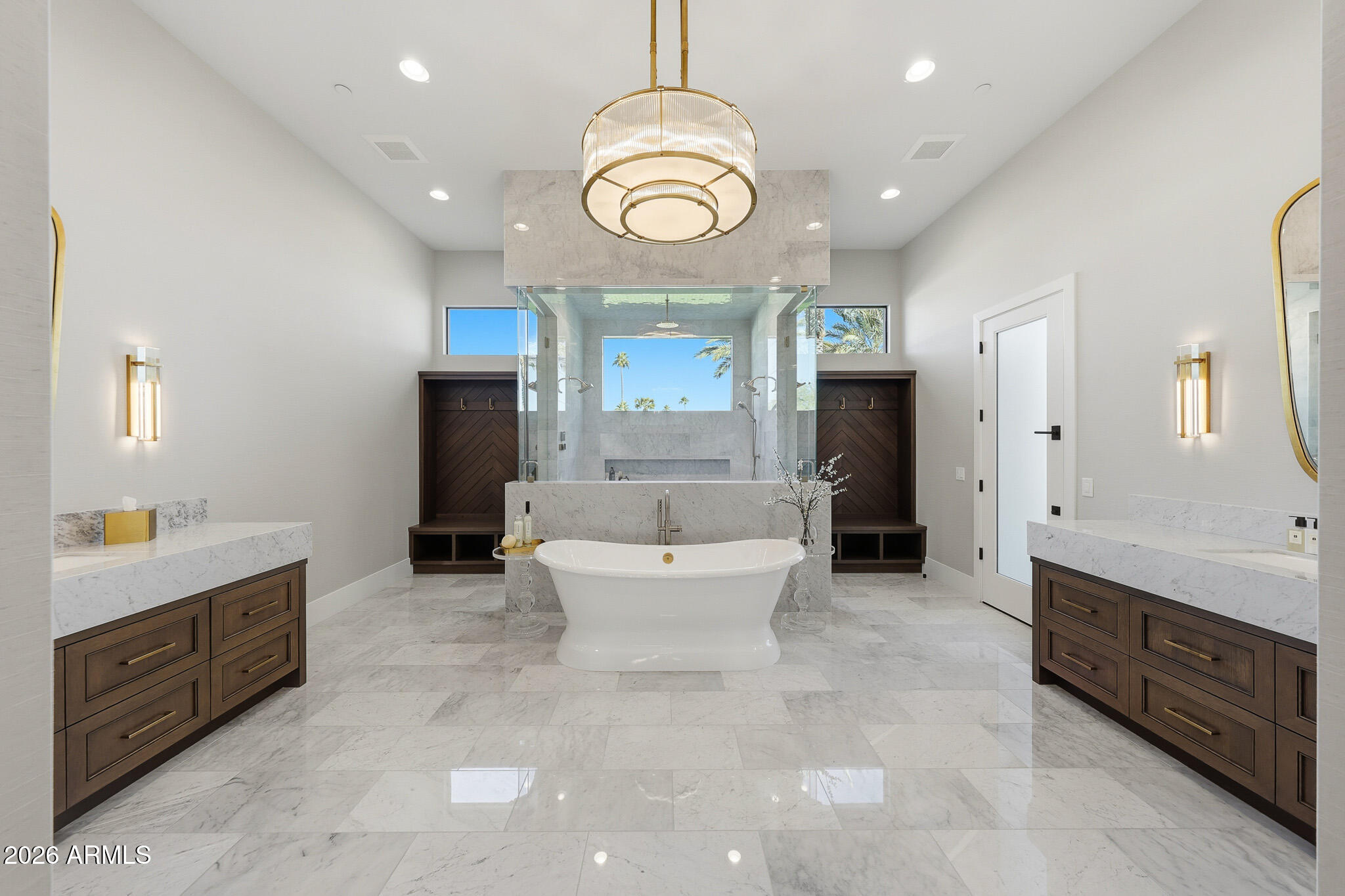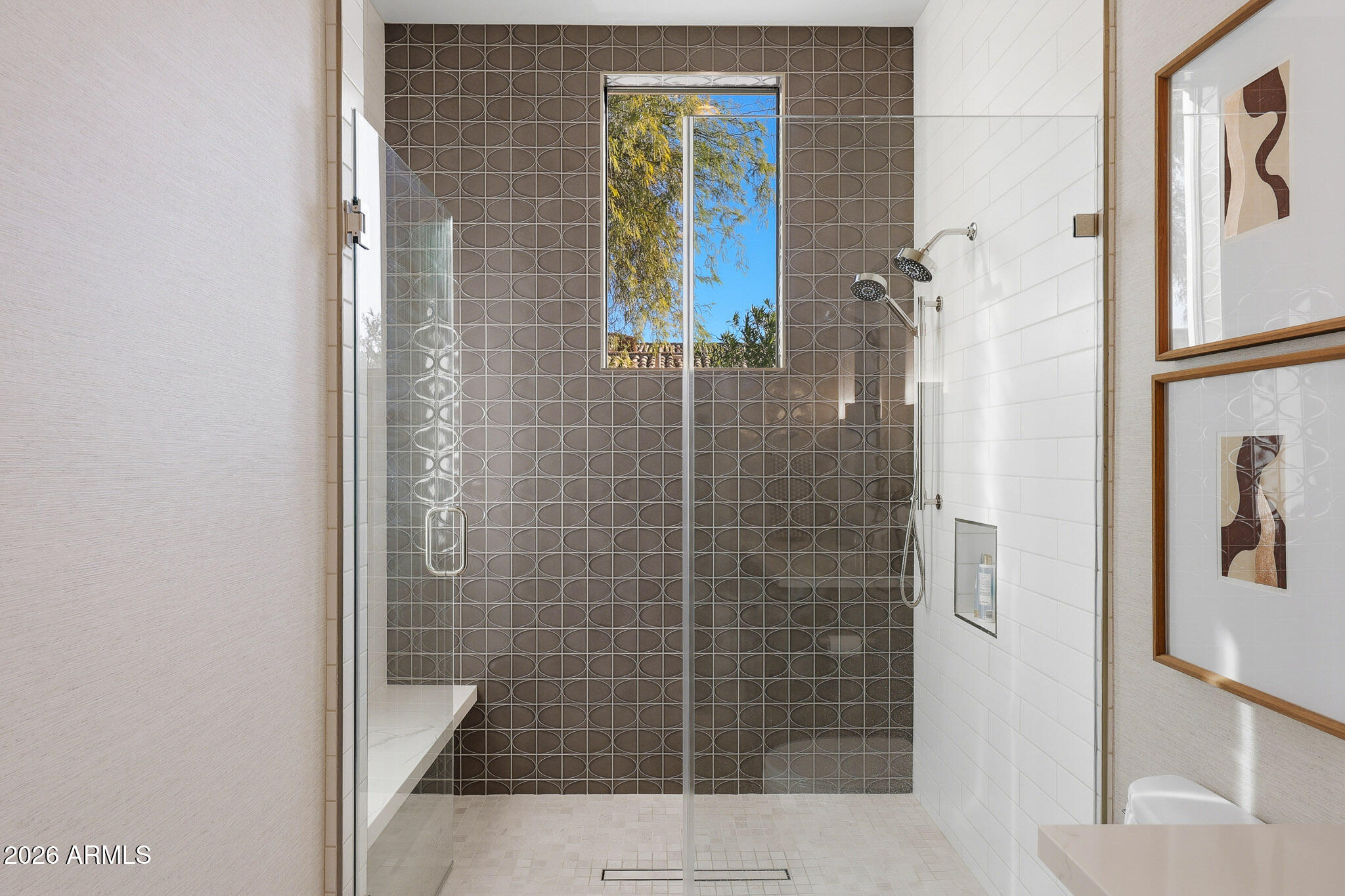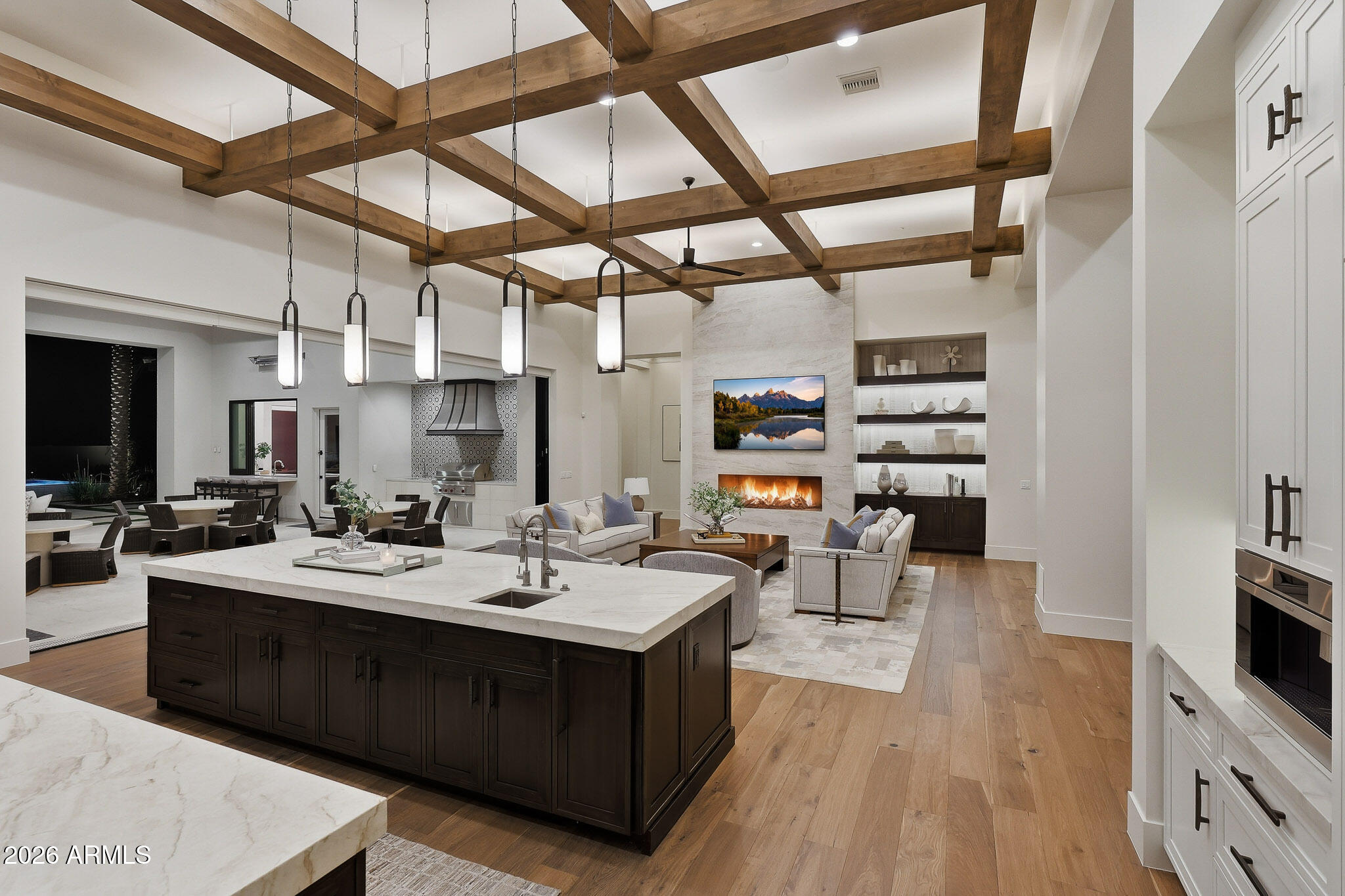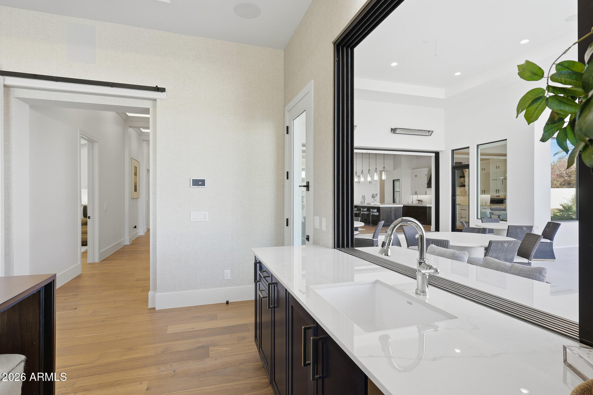 Premier Paradise Valley living with breathtaking Camelback Mountain views. This exceptional Forte Homes residence is ideally positioned in one of PV's most desirable locations and offers a rare blend of modern architecture, resort-style outdoor living, and elevated luxury finishes throughout. The main residence spans 6,509 sq ft and is complemented by a 575 sq ft detached guest house, creating a total of 6 bedrooms and 6.5 bathrooms. Designed with a desirable split floor plan, the home features an expansive great room with soaring ceilings and dramatic wood beam details in both the living and dining areas. Walls of glass seamlessly connect indoor and outdoor living spaces, perfect for entertaining. The chef's kitchen is equipped with Sub-Zero and Wolf appliances and opens to the great room, while additional interior highlights include a private office, formal dining room with a stunning climate-controlled wine room, and a versatile flex room with an indoor/outdoor bar. High-end wall coverings throughout, along with Rocky Mountain Hardware, Visual Comfort lighting, Control4 smart-home automation, Taj Mahal quartz throughout, and luxury engineered hardware at every turn. The resort-style backyard is a true showpiece, framed by rows of gorgeous, mature palm trees and designed for both relaxation and recreation. Outdoor amenities include a large heated pool and spa with water features, multiple covered patios, fire features, lush landscaping, and a full-size pickleball courtcreating a private oasis ideal for year-round enjoyment.