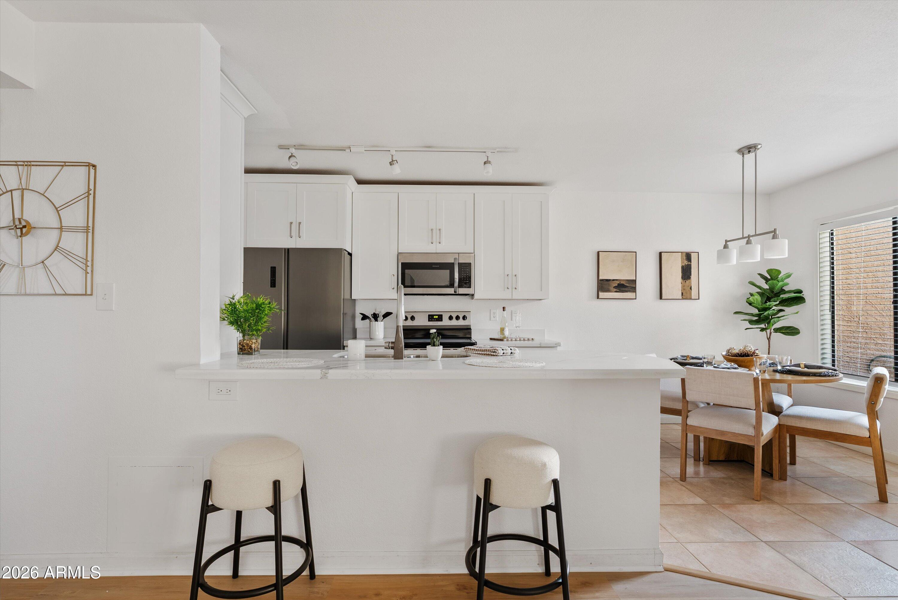 The kitchen has been fully refreshed with new quartz countertops, new cabinetry, updated lighting, and modern appliances, complemented by large-format tile flooring that adds both style and durability. The spacious primary bedroom includes a sitting area and an updated walk-in shower, while both bathrooms showcase newer countertops, faucets, flooring, and updated finishes throughout. A new vanity in the guest bath adds a fresh, modern touch.
