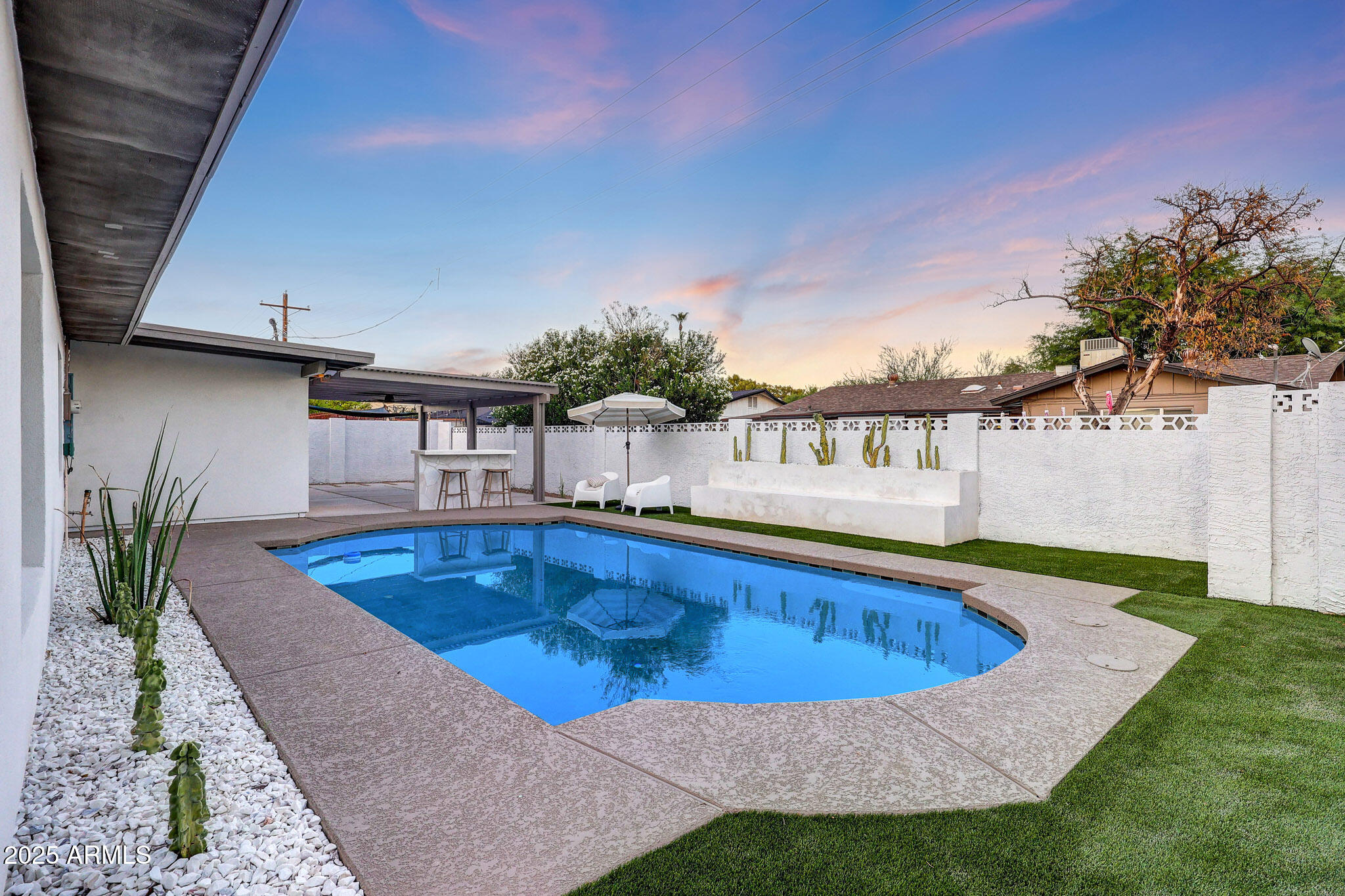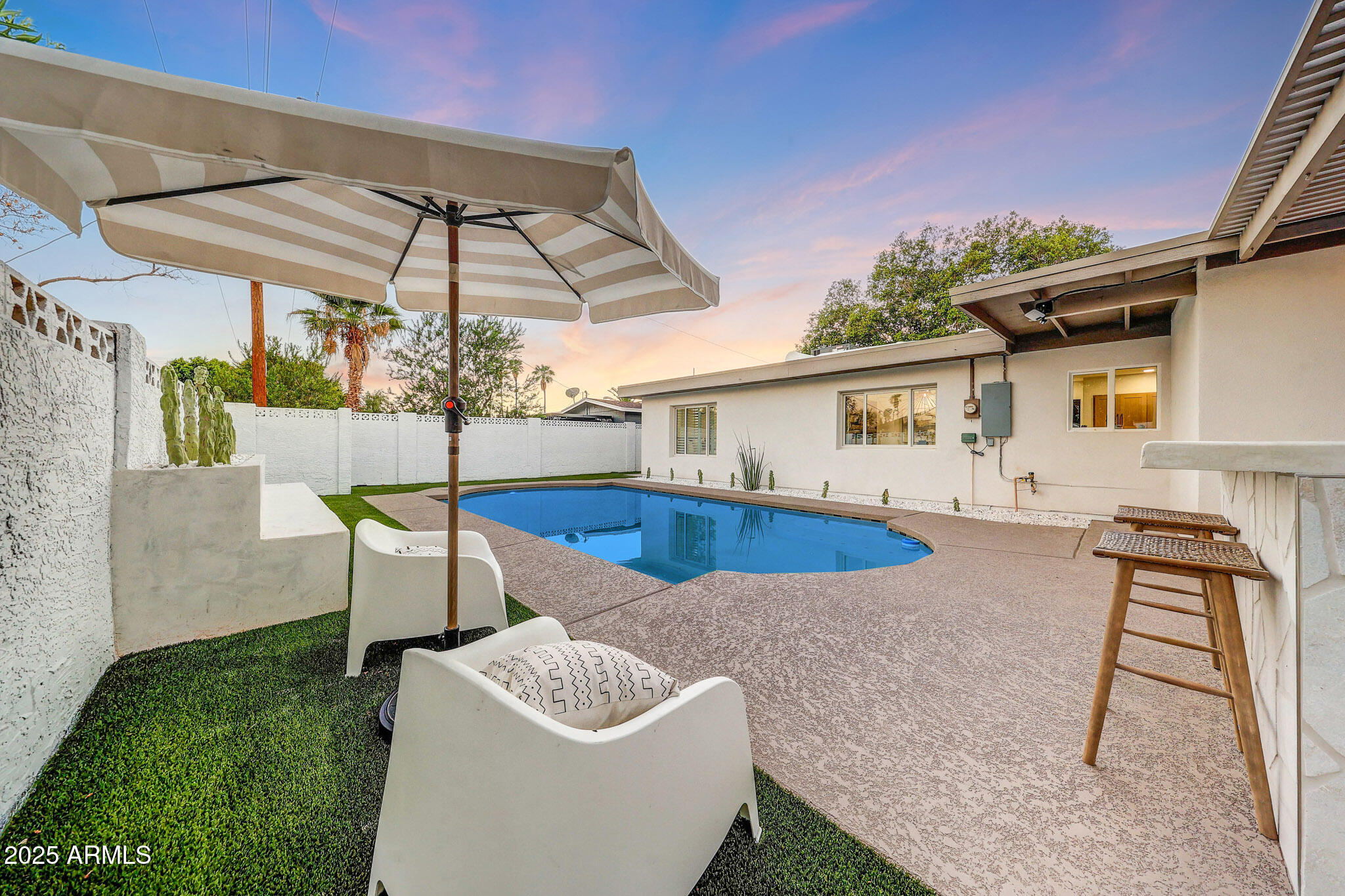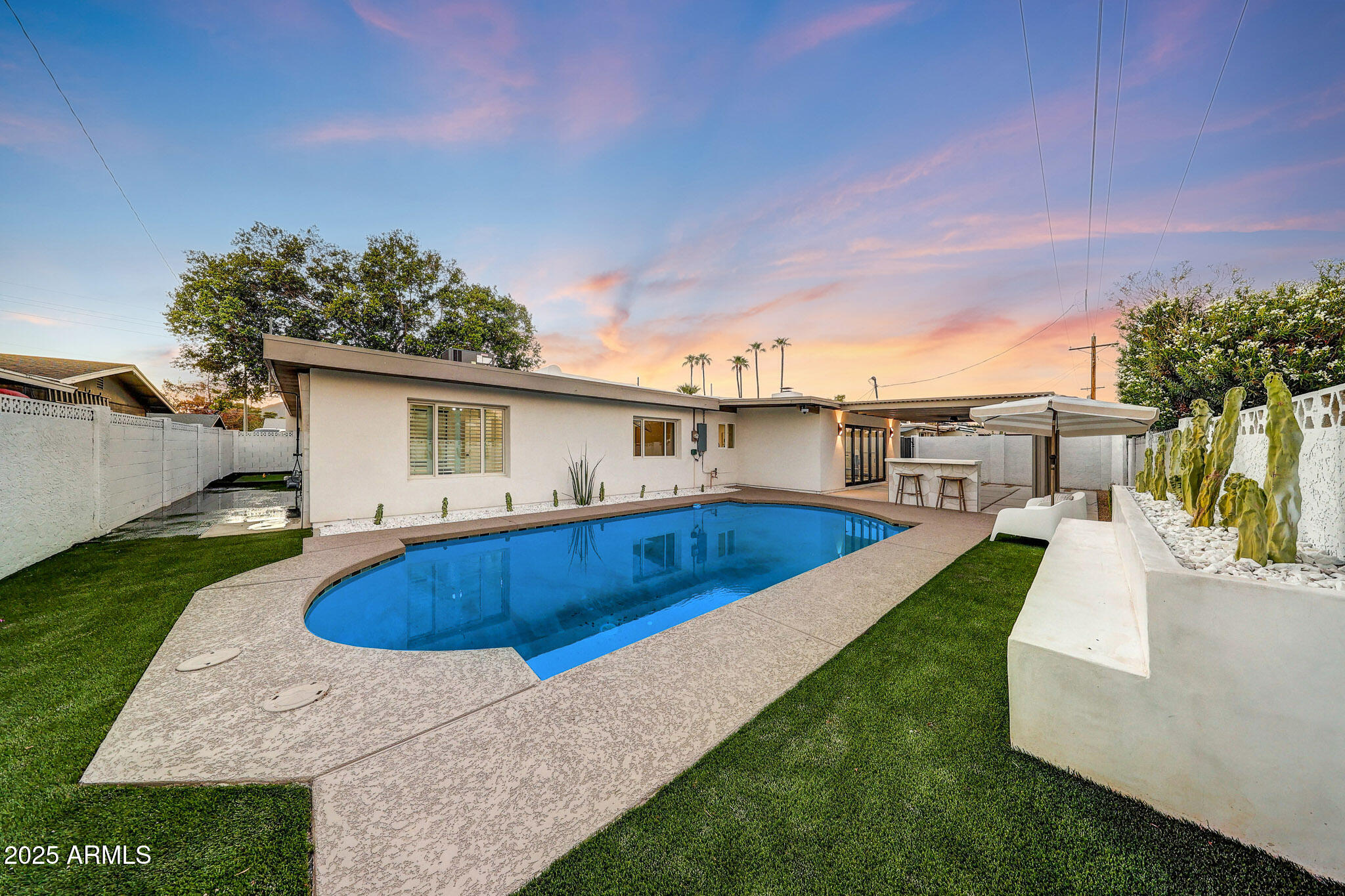 Welcome to your ultimate entertainer's paradise! This beautifully remodeled 4-bedroom, 3-bath home blends modern luxury with timeless comfort. Behind a custom iron front door, you're greeted by an open, light-filled floor plan designed for today's lifestyle. The gourmet kitchen is a true showpiece--featuring a gas range, all-new cabinetry, an 8-foot island with a quartz waterfall countertop, elegant counter-to-ceiling backsplash, and a custom plastered hood vent. The space flows seamlessly into the spacious living area, where a statement fireplace wrapped in luxury tile anchors the room. The primary suite is a true retreat with a spa-inspired bathroom featuring a seamless walk-in shower, freestanding soaking tub, and a generous walk-in closet. Three additional bedrooms include a private en-suite, ideal for guests, in-laws, or a home office. A 5-panel accordion door opens to the stunning backyard, creating the perfect indoor-outdoor experience. Enjoy dinner beneath the designer chandelier and custom floating shelves in the dining area, or step outside to your private Southwest oasiscomplete with low-maintenance synthetic turf, a micro-cement seating area and planter, an outdoor island, an expansive pergola for shade, a two-tone tiled pool, an Outdoor Shower, and even a putting green! Every detail has been thoughtfully updatednew smooth wall finishes throughout, new cabinetry, epoxy garage floors, exterior synthetic stucco, roof, HVAC, electrical, and garage door. Every element has been professionally designed for both style and function. Located in a highly desirable neighborhood within walking distance to Chaparral Park and just minutes from Old Town Scottsdale's top dining and shopping, this home offers the best of Arizona living. This turnkey entertainer's dream is ready for you to move in and enjoyevery detail perfected, inside and out. Owner/Agent.