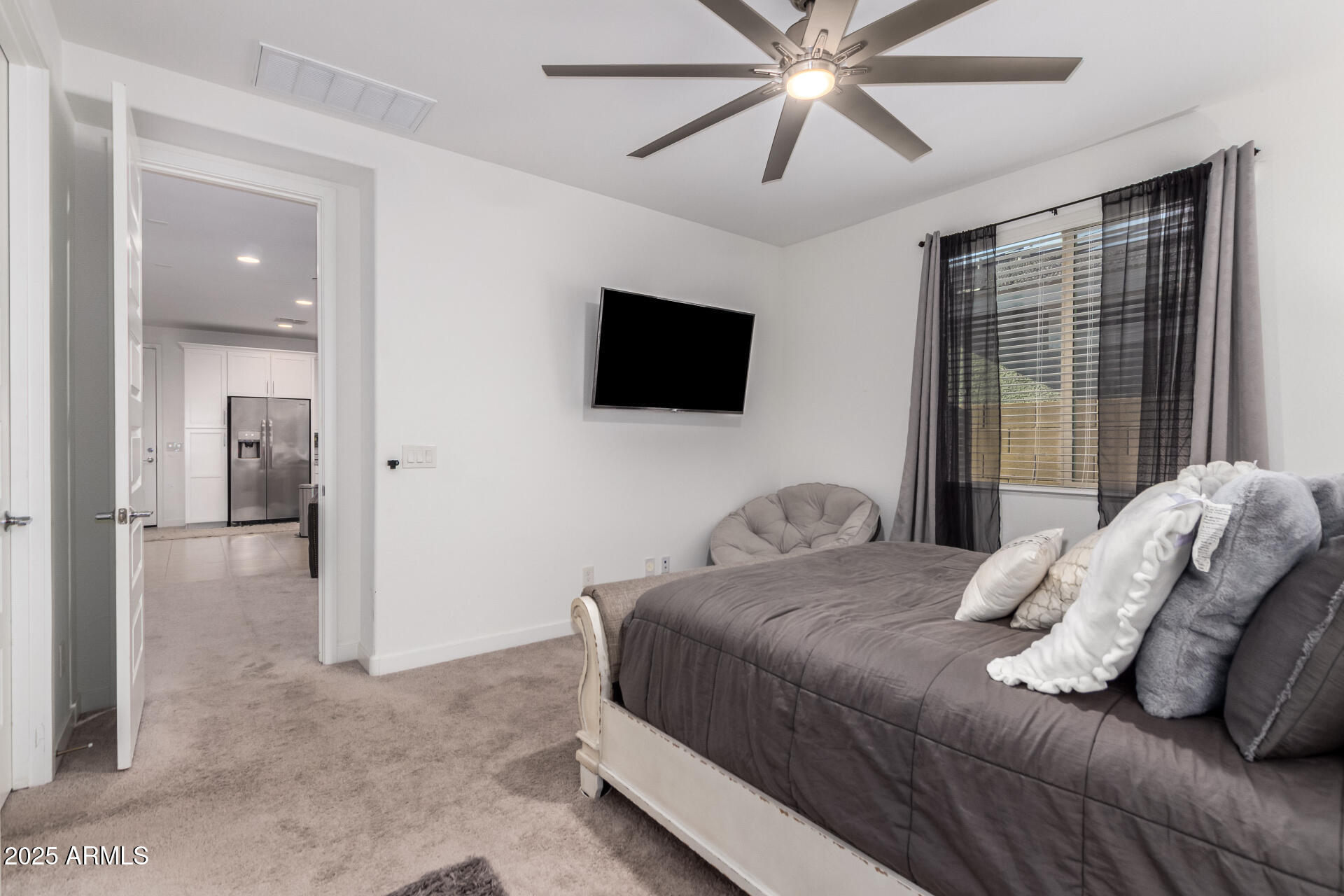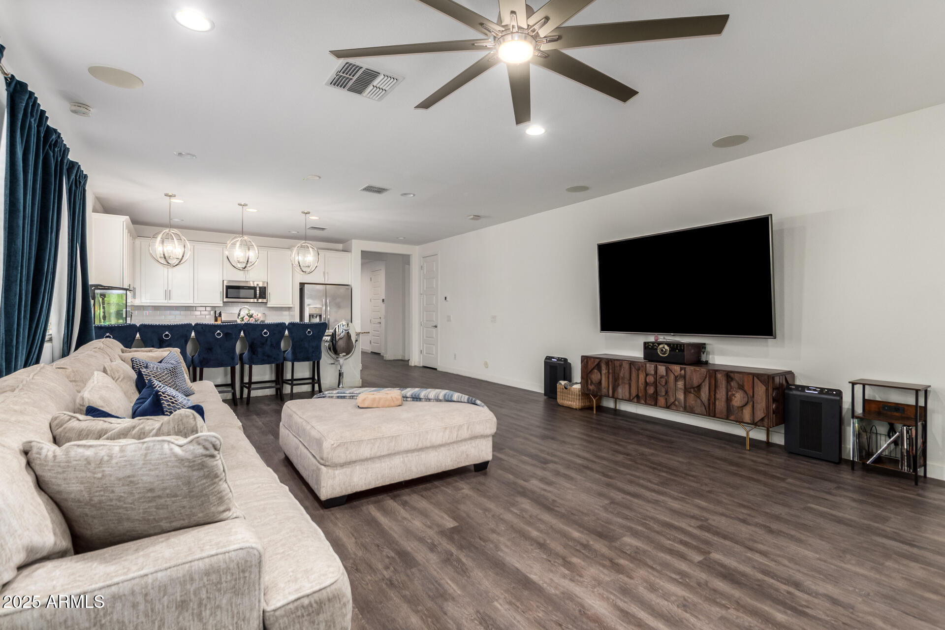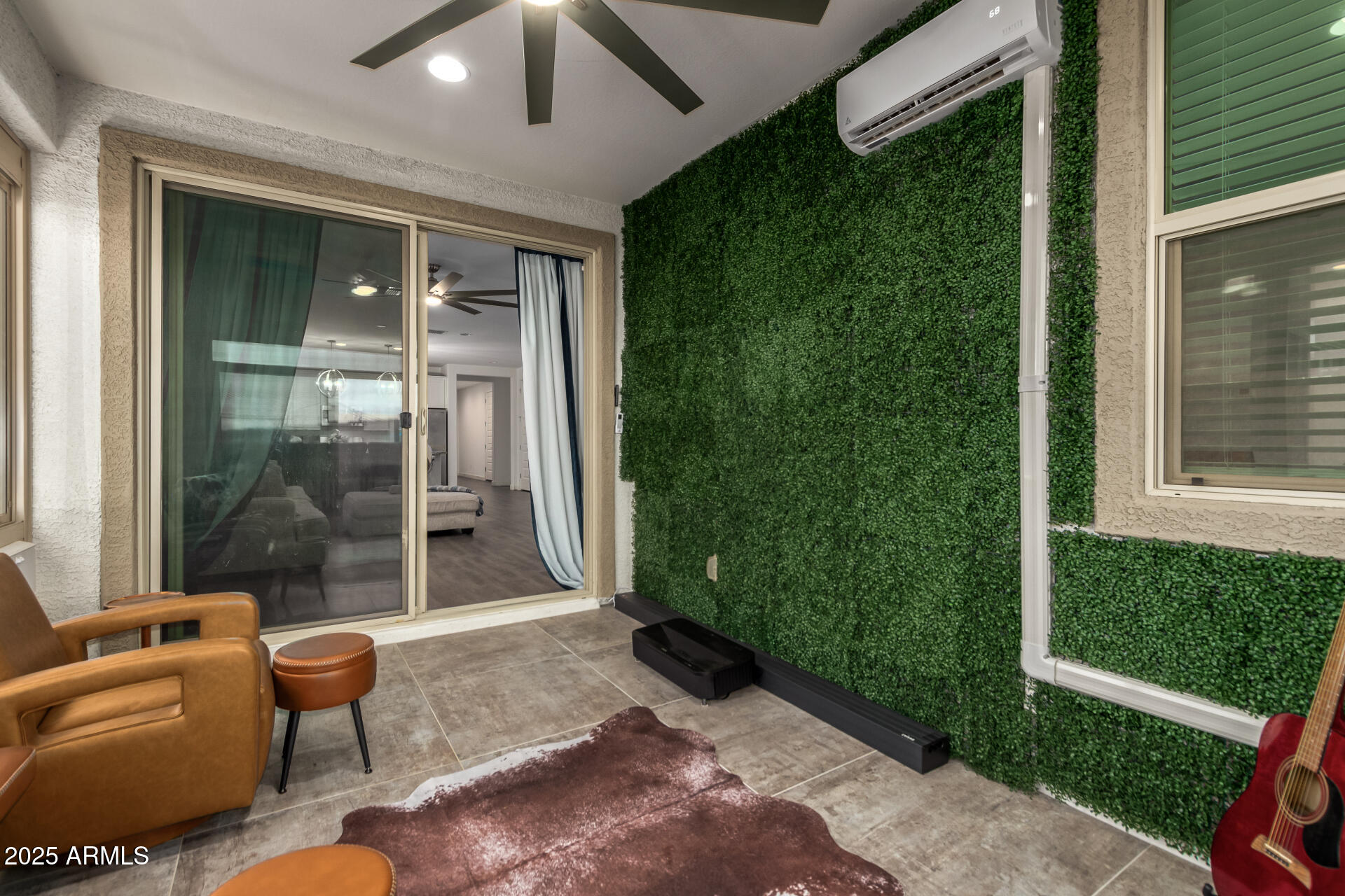 Outdoor living is elevated with lush artificial turf, and a charming, enclosed patio area, perfect for entertaining or relaxing. The home is equipped with two washers and two dryers for added convenience. Retreat to the luxurious owner's suite, strategically tucked away for privacy, while two additional bedrooms are conveniently located near the entry. Every room is enhanced with ceiling fans and built-in lighting, ensuring comfort and ambiance throughout.
