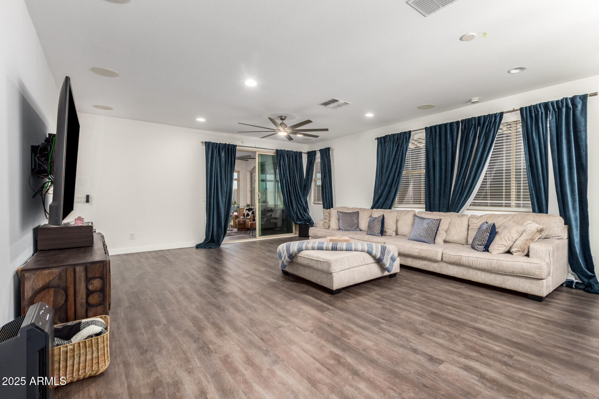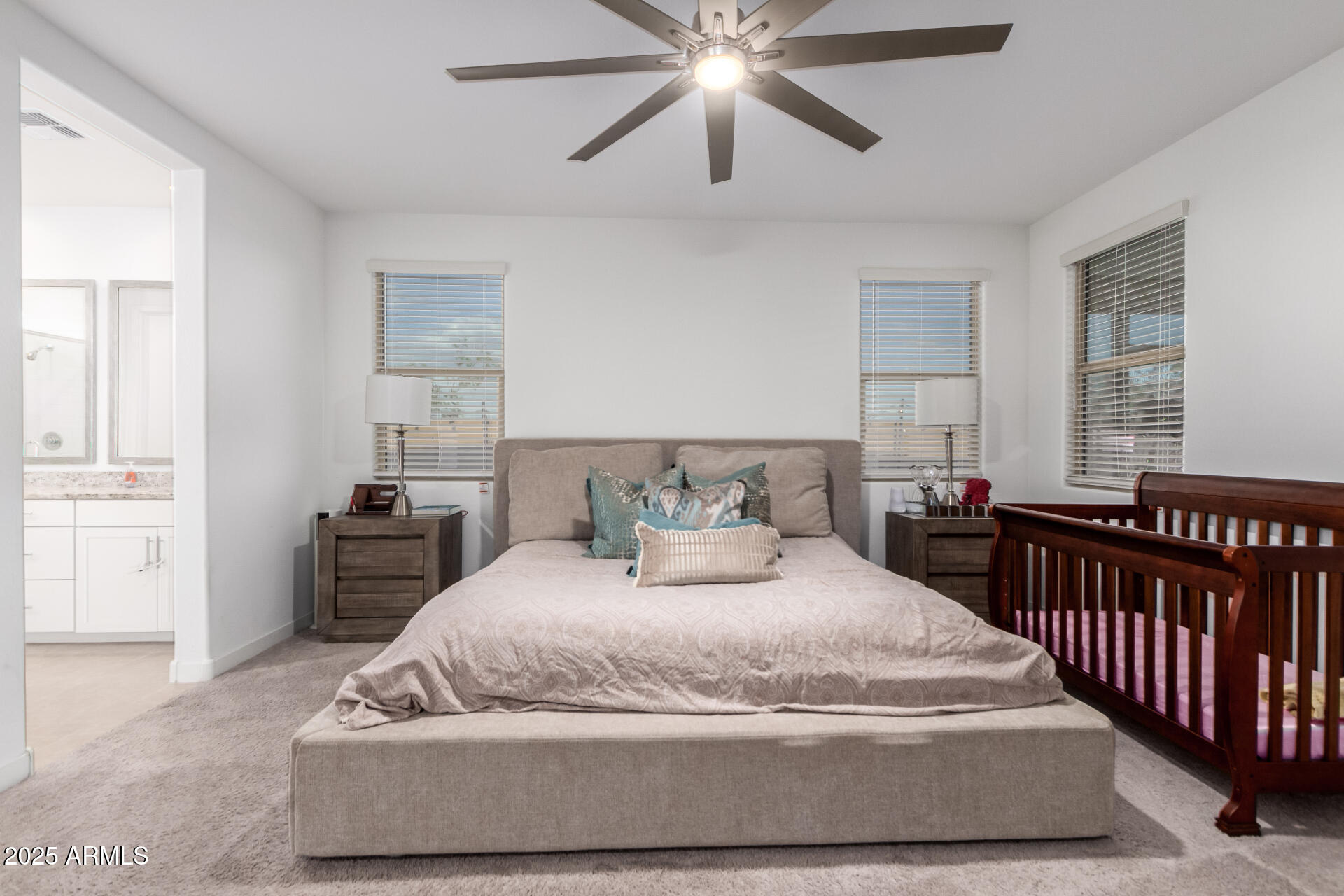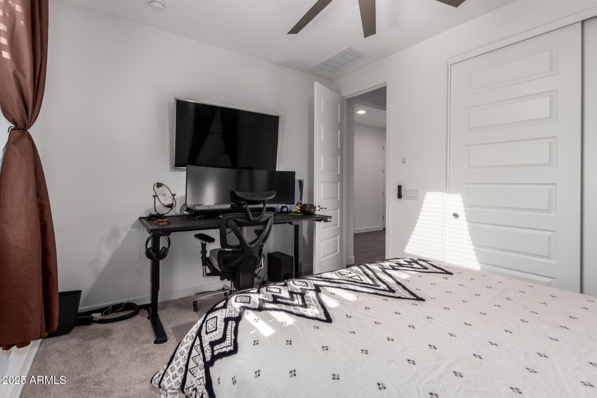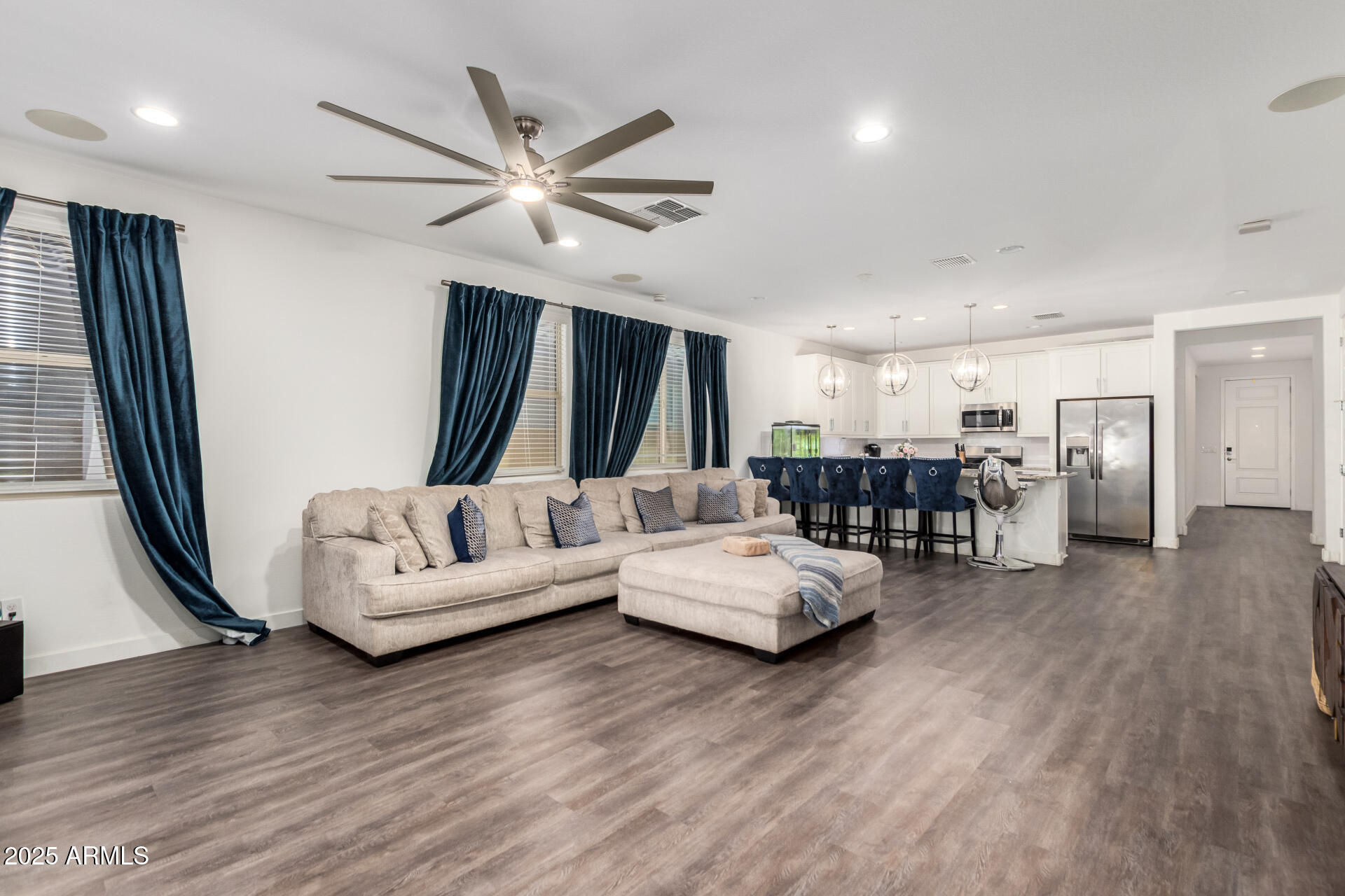 Outdoor living is elevated with lush artificial turf, and a charming, enclosed patio area, perfect for entertaining or relaxing. The home is equipped with two washers and two dryers for added convenience. Retreat to the luxurious owner's suite, strategically tucked away for privacy, while two additional bedrooms are conveniently located near the entry. Every room is enhanced with ceiling fans and built-in lighting, ensuring comfort and ambiance throughout.