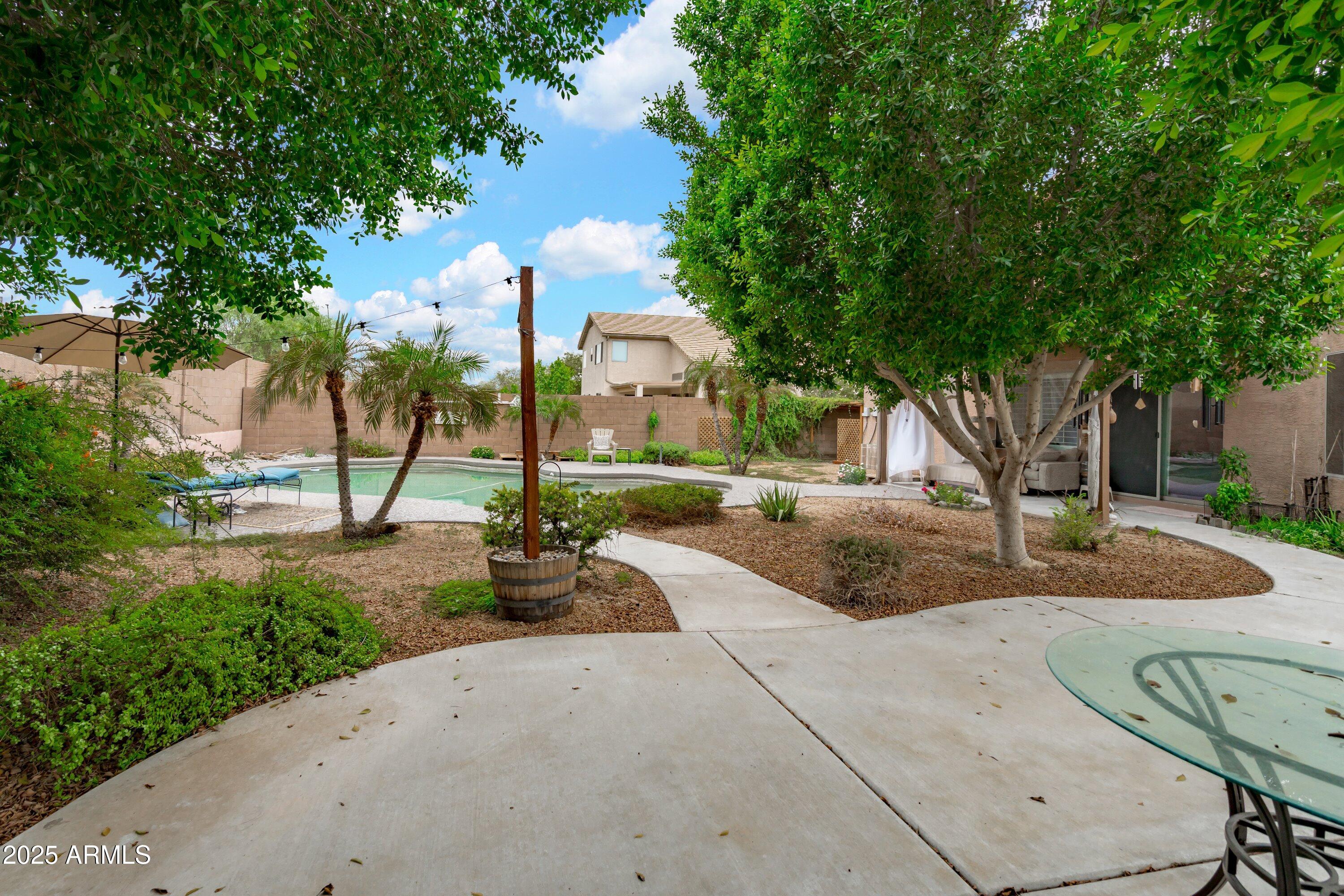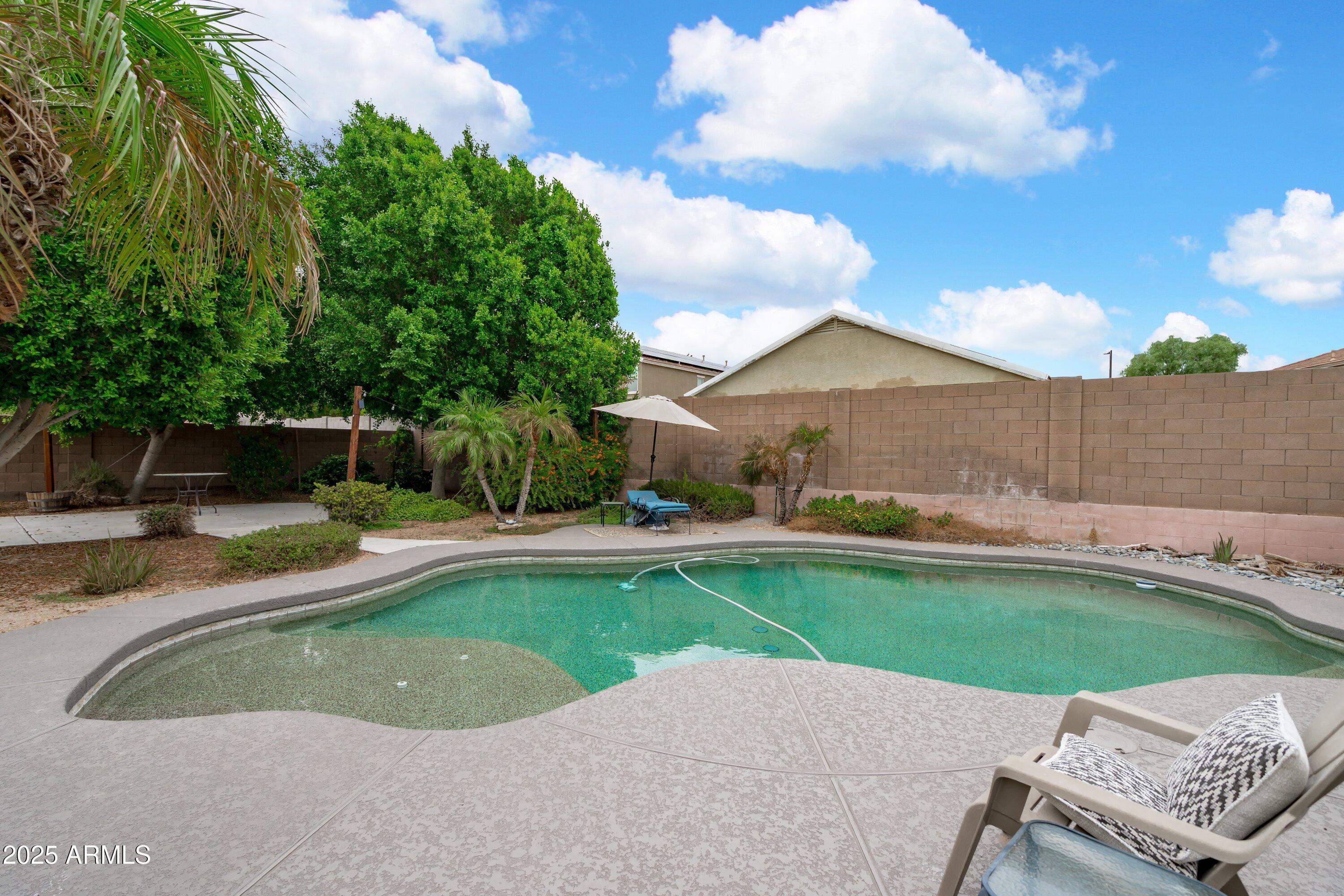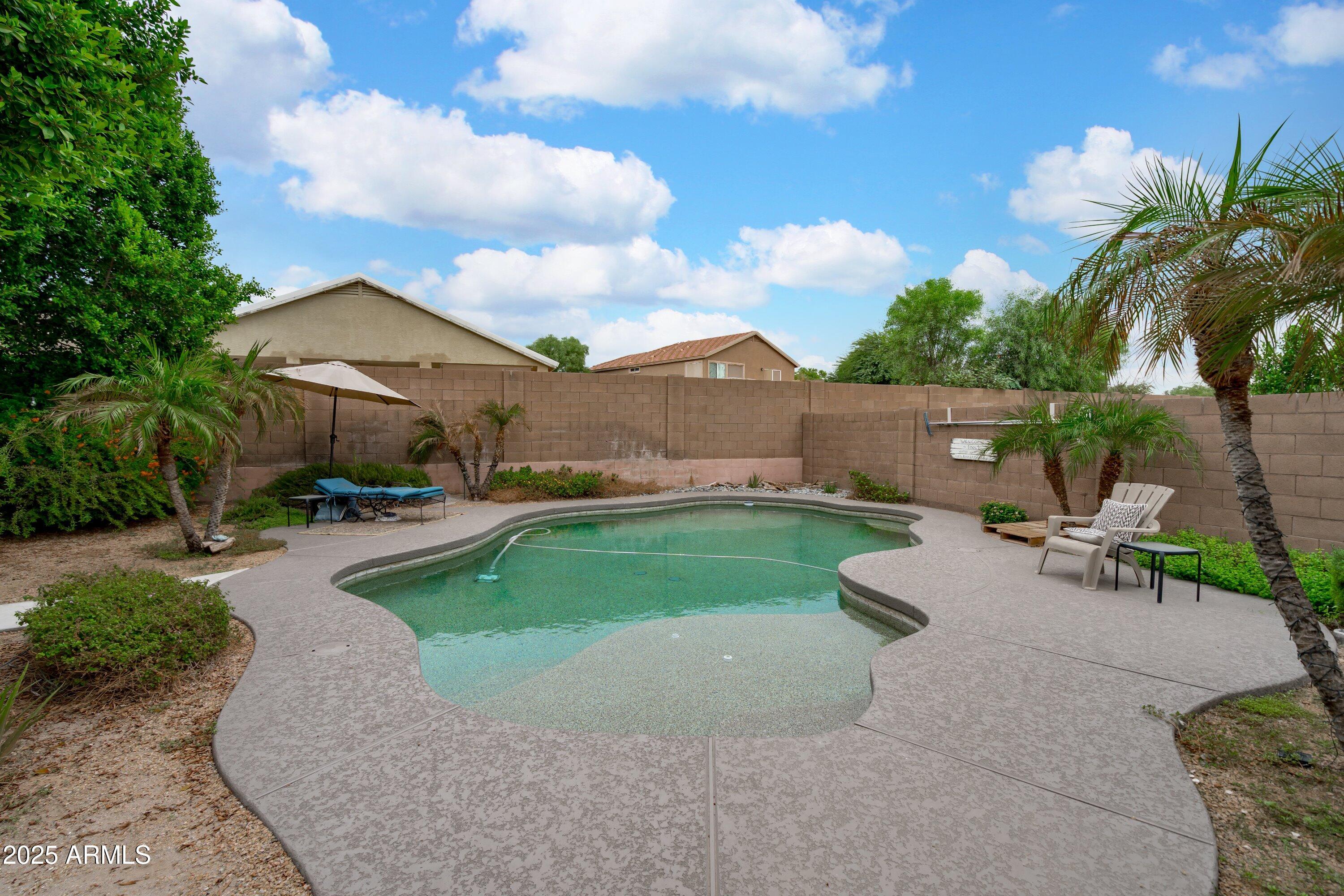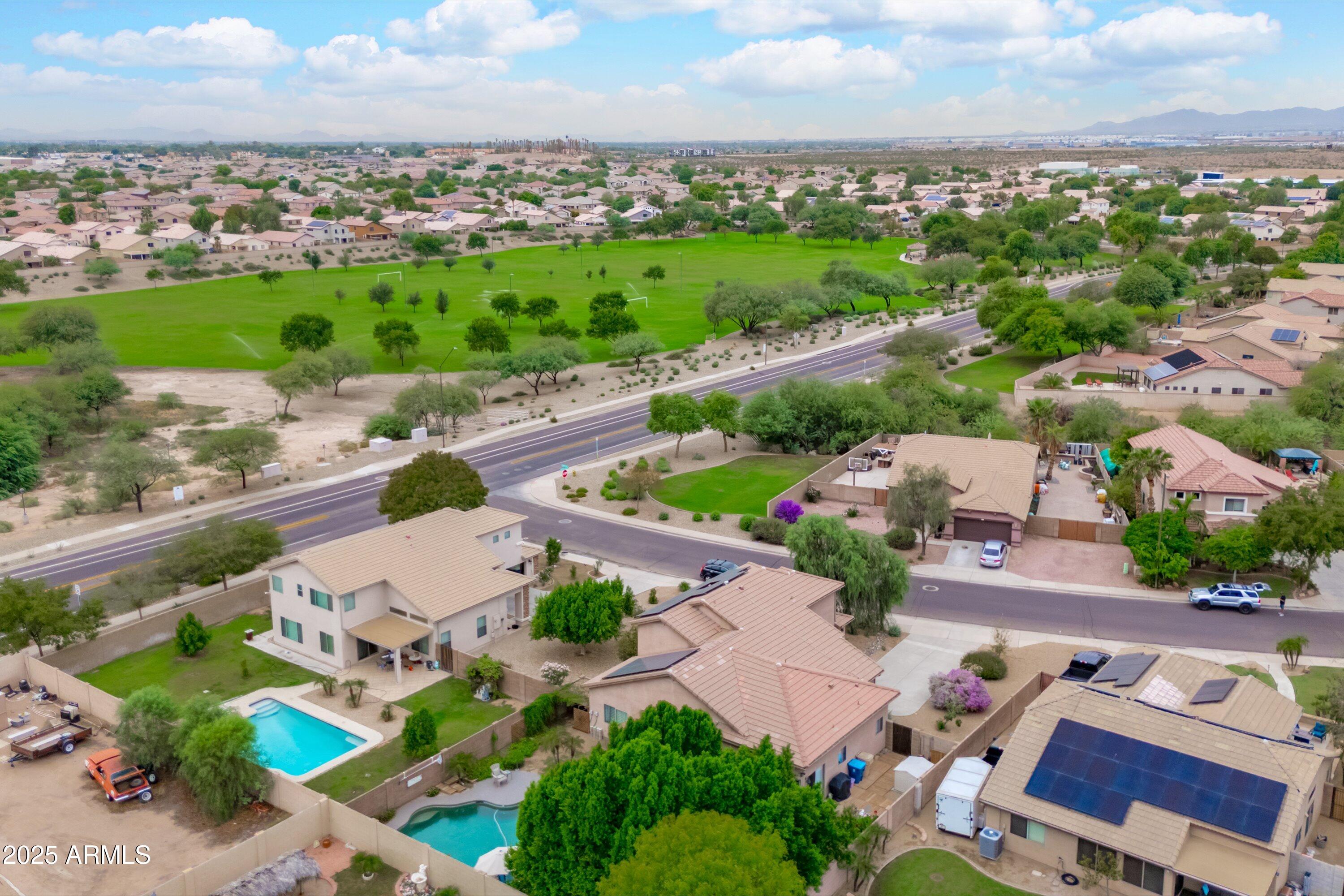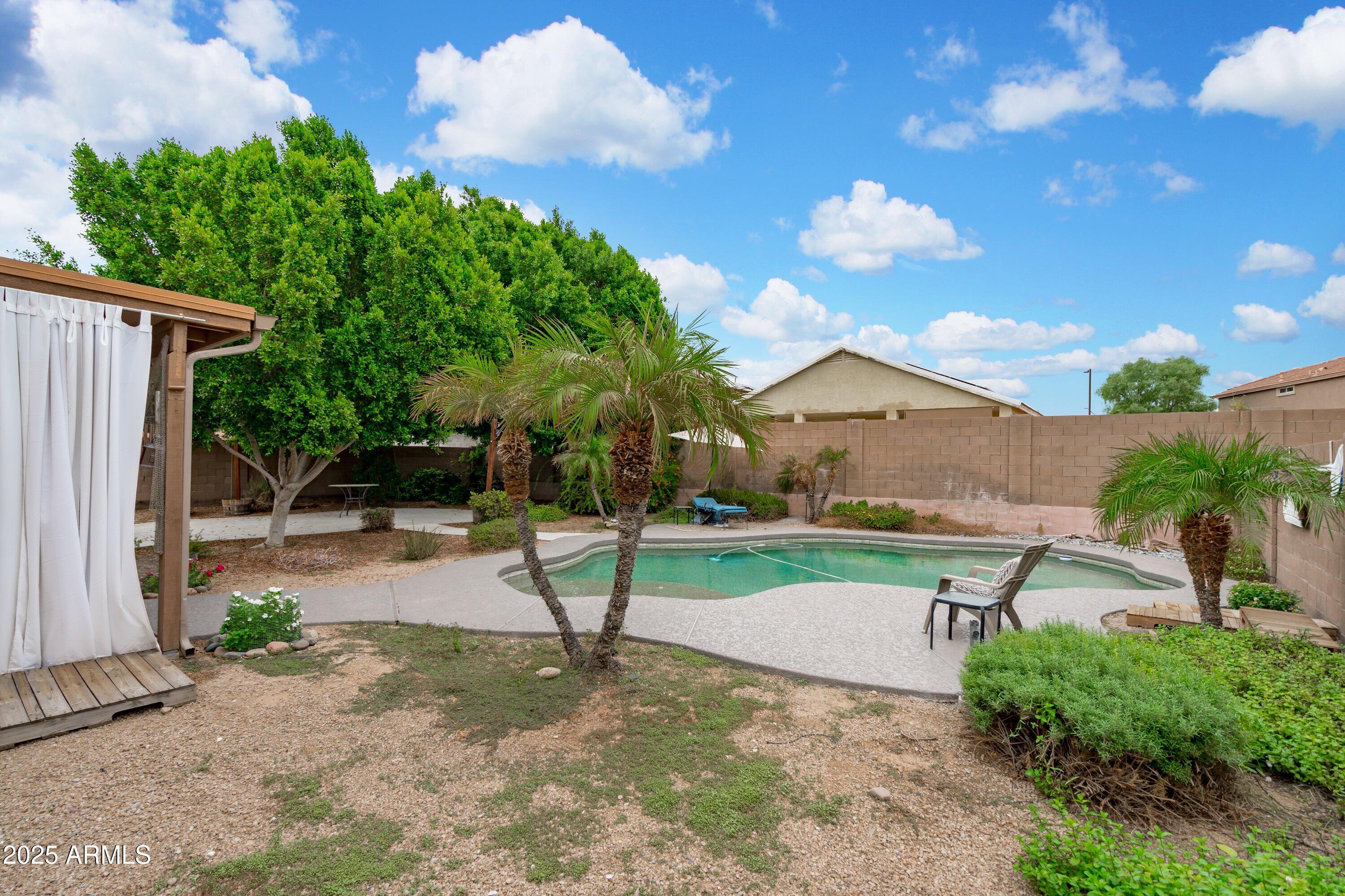 This 4-bedroom beauty boasts 2 master suites downstairs and 3.5 baths, with upgrades everywhere you look! Gorgeous tile and laminate flooring flow through the main living areas, accented by vaulted ceilings and wood shutters for a bright, open feel. The stunning kitchen features Silestone counters, stainless steel appliances, ample cabinetry, and a large breakfast bar. Step outside to your private oasis--an oversized backyard with a sparkling pool, multi-colored lighting, and a shaded retreat beneath a weeping willow tree and herb garden. Extras include a solar system (2 years left on lease), water softener, attic air purifier, and garage storage. Prime location near the I-10, 101, 303, and Luke AFB!
