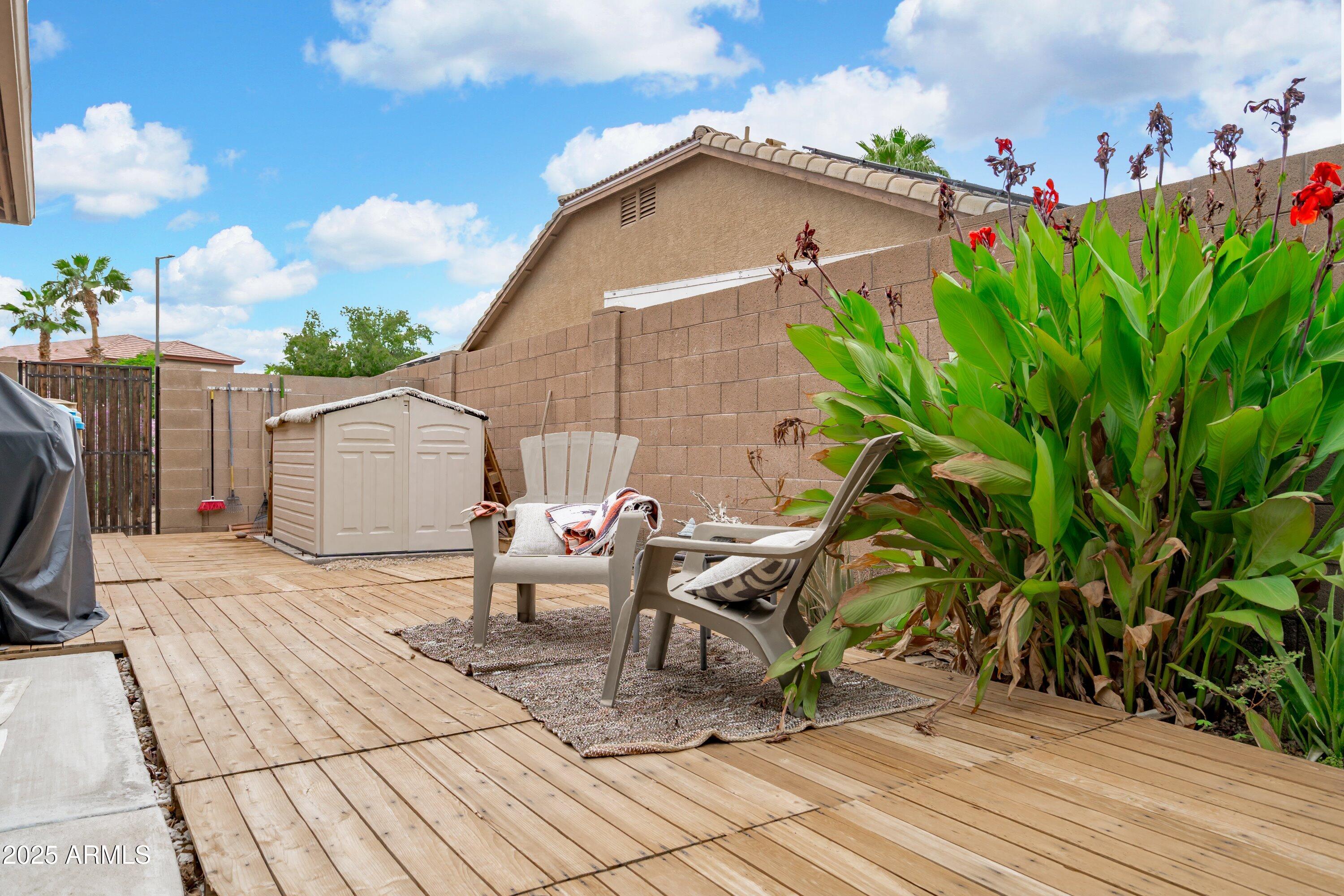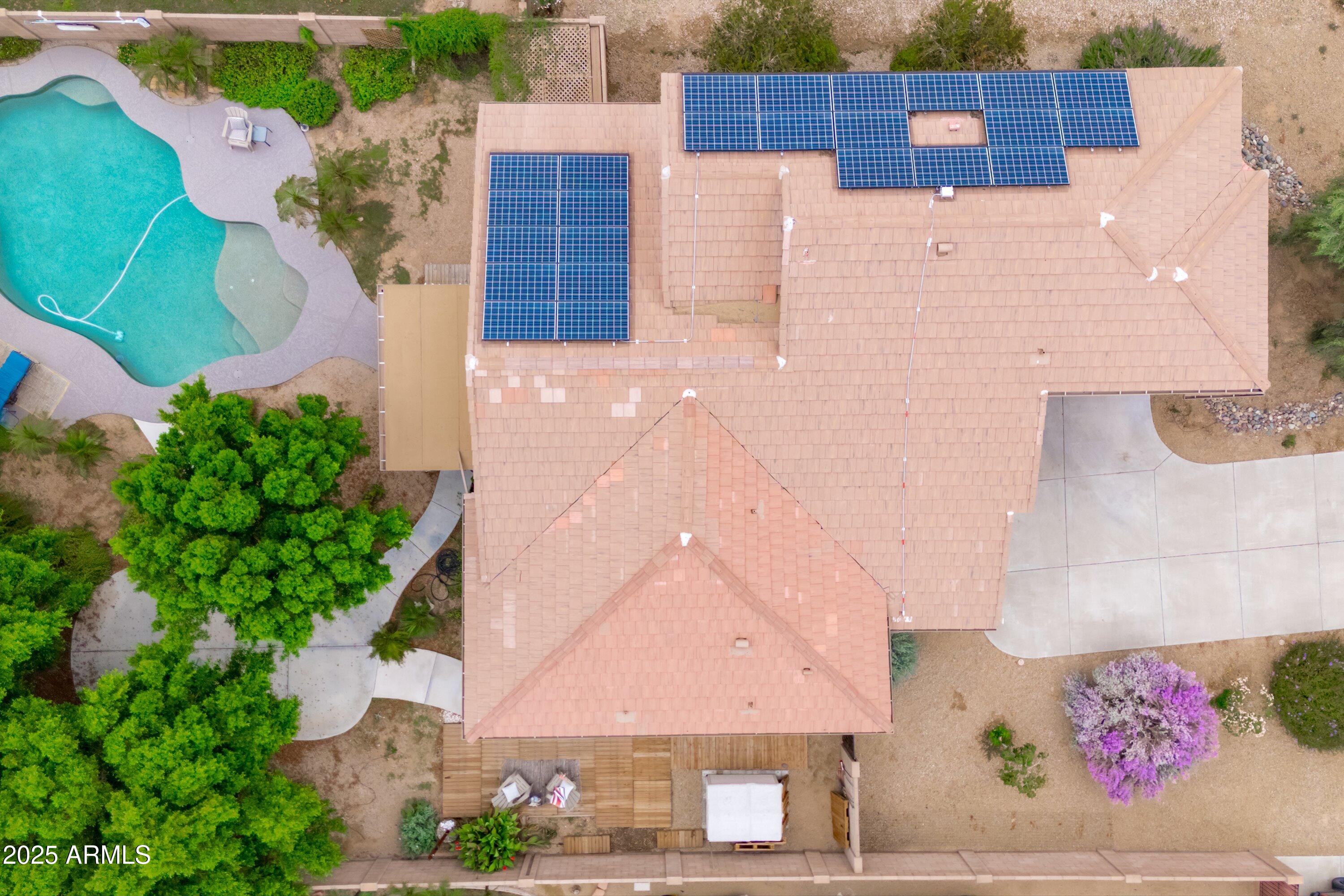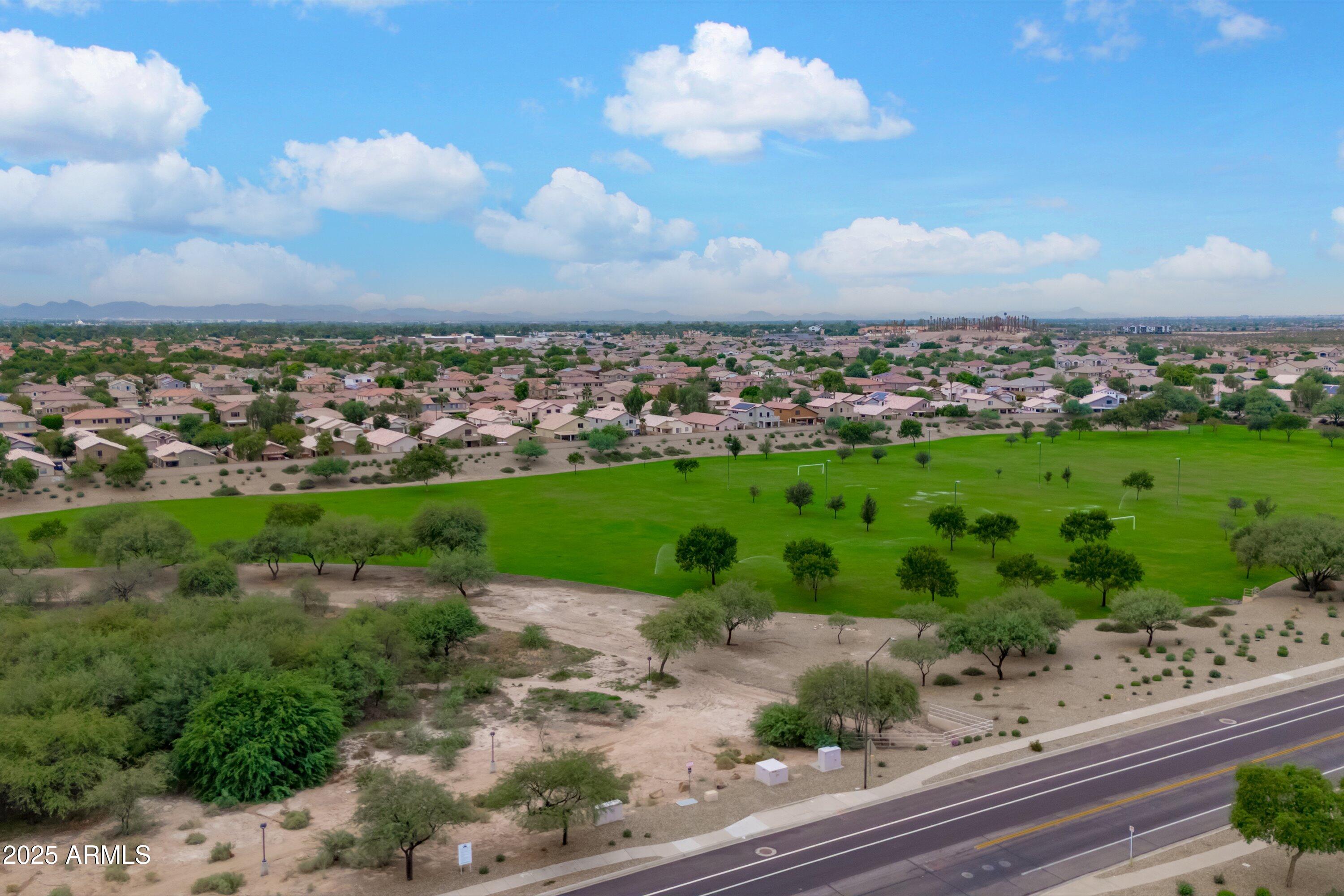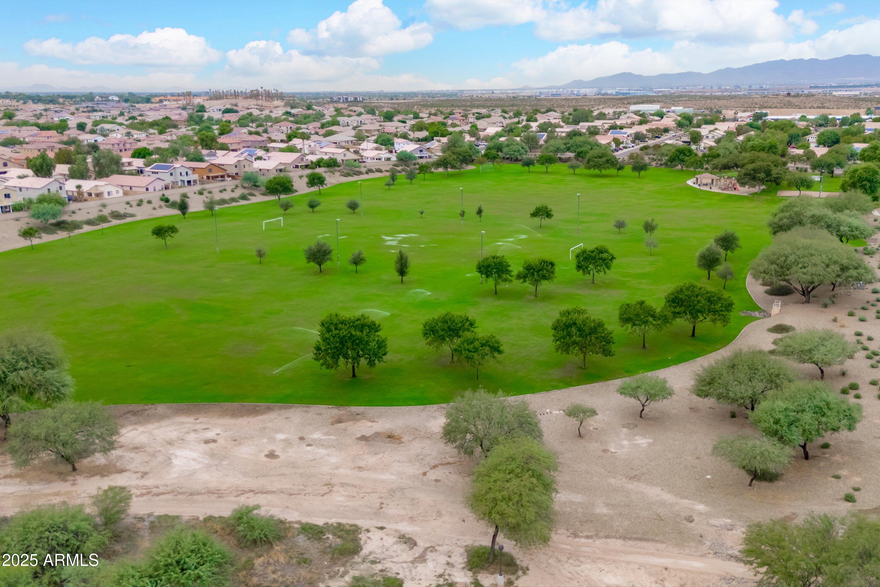 This 4-bedroom beauty boasts 2 master suites downstairs and 3.5 baths, with upgrades everywhere you look! Gorgeous tile and laminate flooring flow through the main living areas, accented by vaulted ceilings and wood shutters for a bright, open feel. The stunning kitchen features Silestone counters, stainless steel appliances, ample cabinetry, and a large breakfast bar. Step outside to your private oasis--an oversized backyard with a sparkling pool, multi-colored lighting, and a shaded retreat beneath a weeping willow tree and herb garden. Extras include a solar system (2 years left on lease), water softener, attic air purifier, and garage storage. Prime location near the I-10, 101, 303, and Luke AFB!
