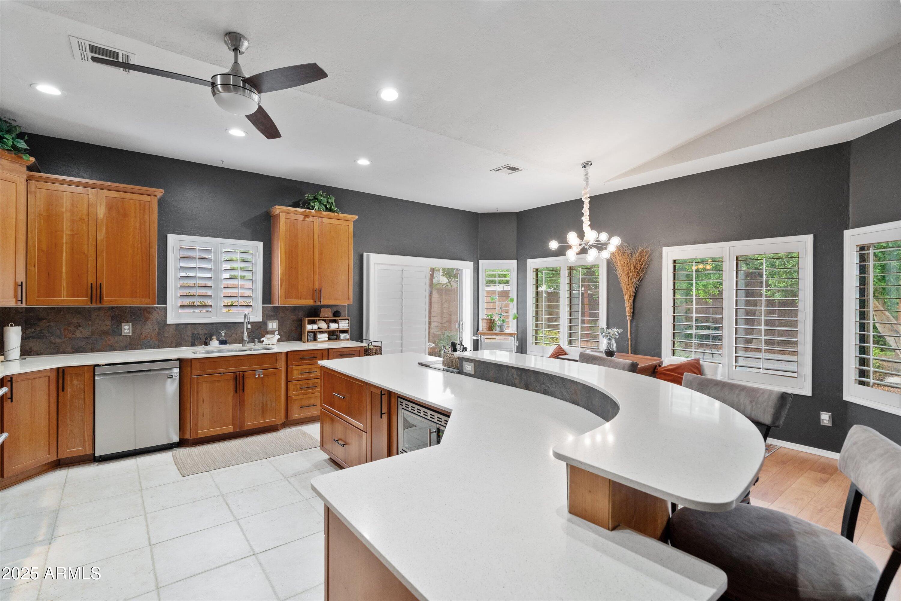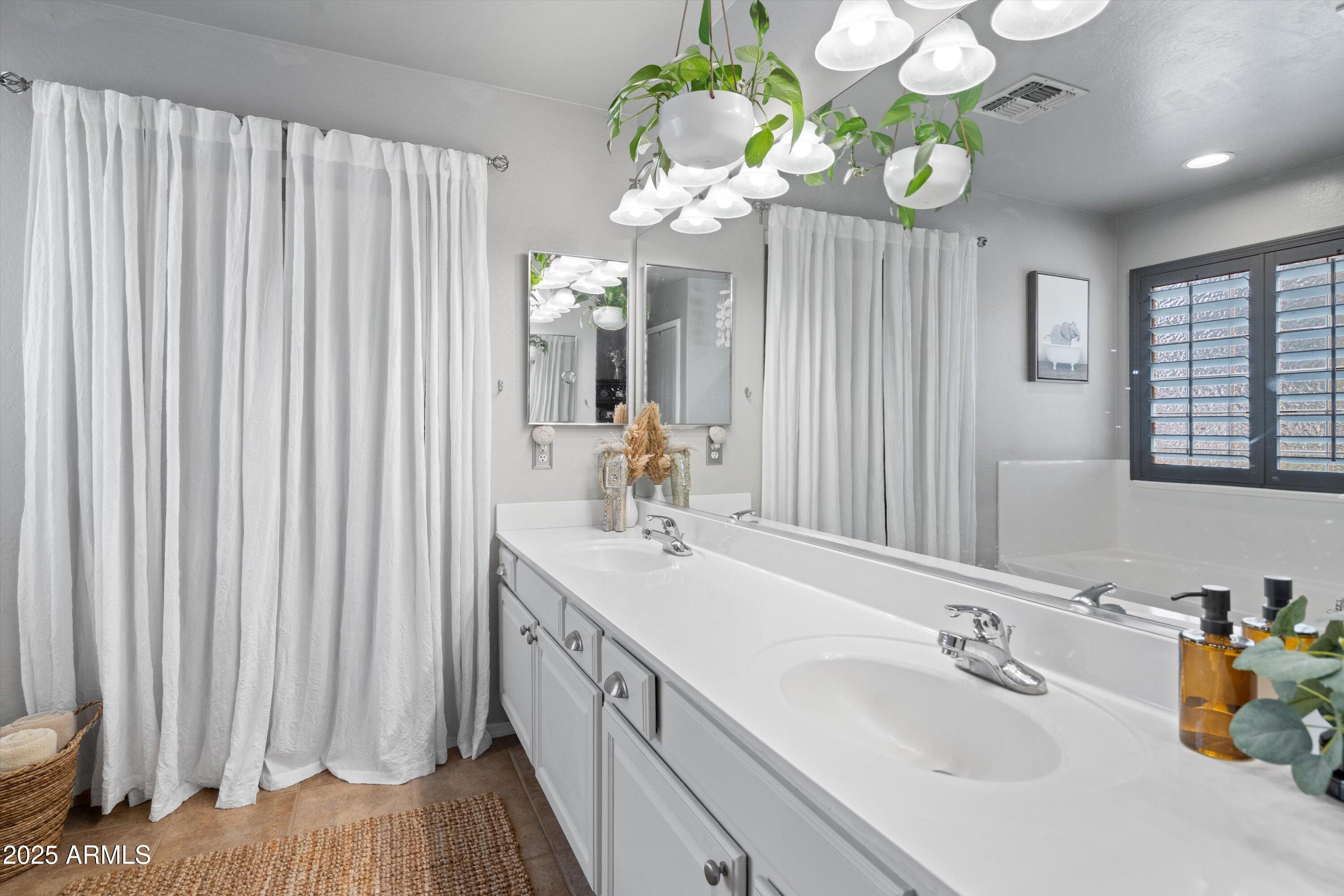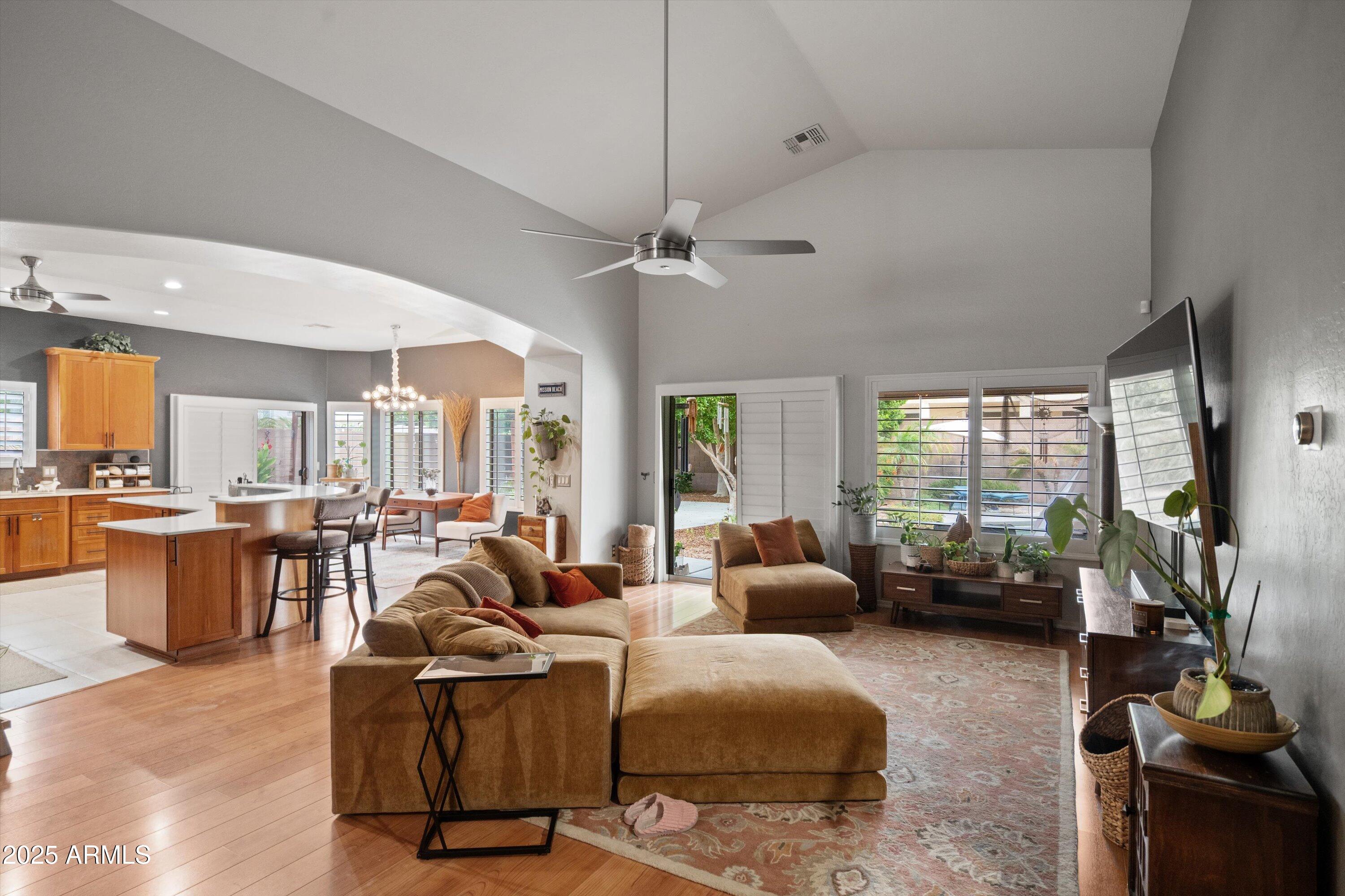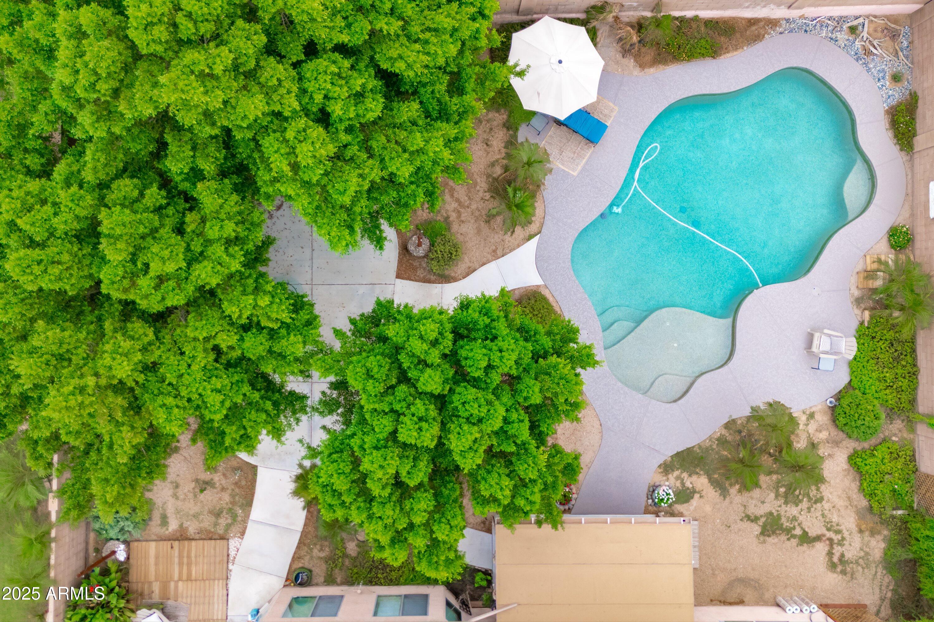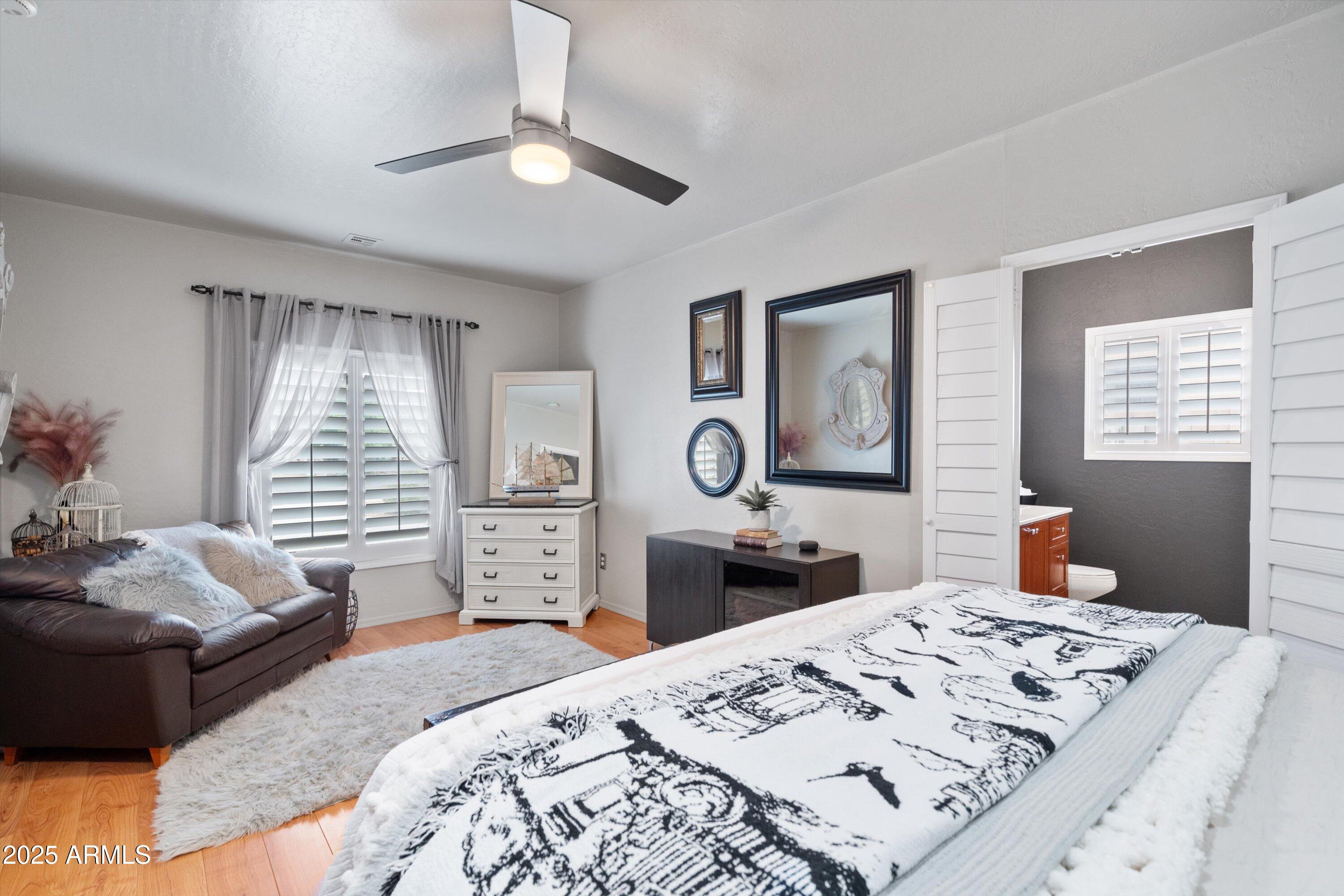 This 4-bedroom beauty boasts 2 master suites downstairs and 3.5 baths, with upgrades everywhere you look! Gorgeous tile and laminate flooring flow through the main living areas, accented by vaulted ceilings and wood shutters for a bright, open feel. The stunning kitchen features Silestone counters, stainless steel appliances, ample cabinetry, and a large breakfast bar. Step outside to your private oasis--an oversized backyard with a sparkling pool, multi-colored lighting, and a shaded retreat beneath a weeping willow tree and herb garden. Extras include a solar system (2 years left on lease), water softener, attic air purifier, and garage storage. Prime location near the I-10, 101, 303, and Luke AFB!