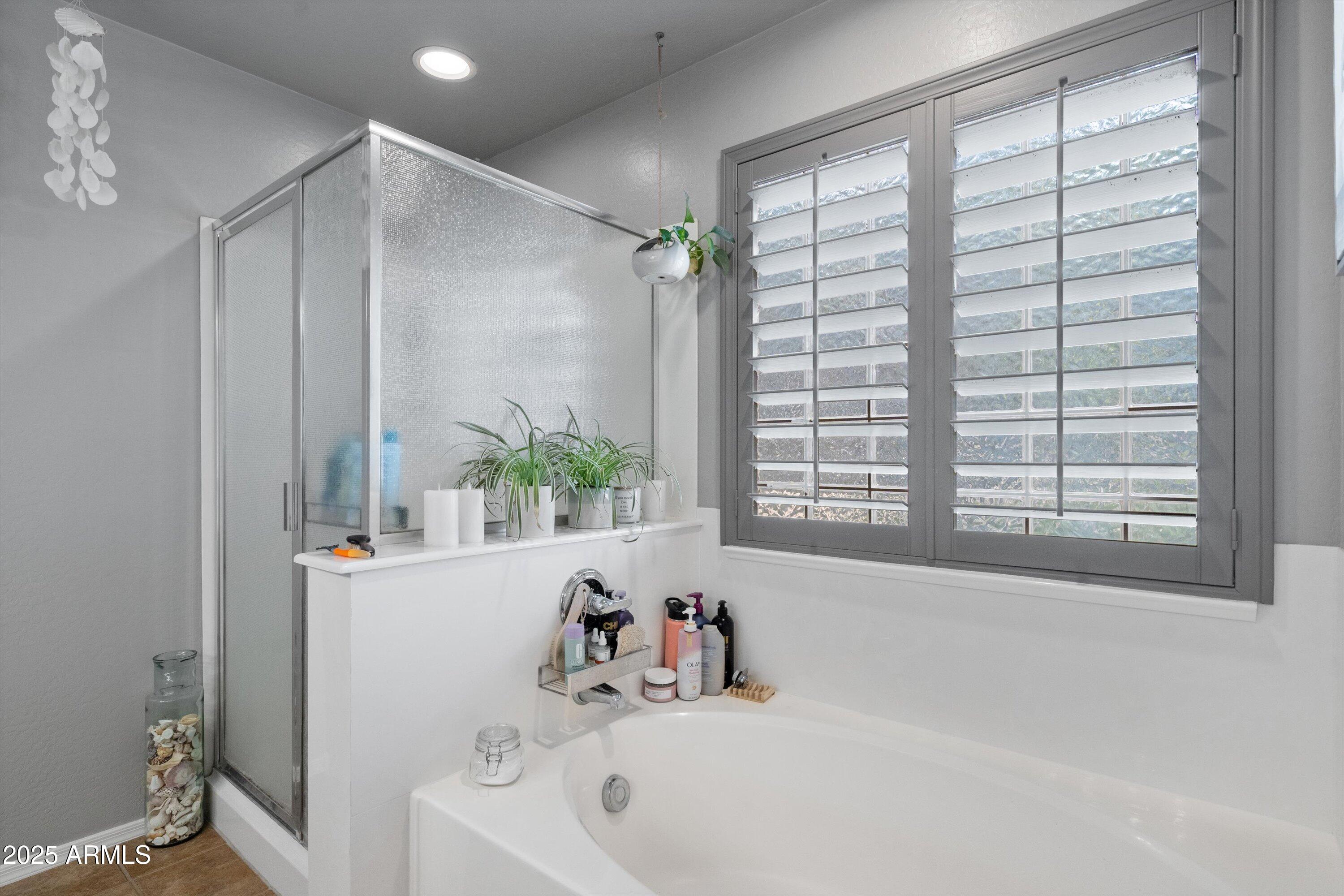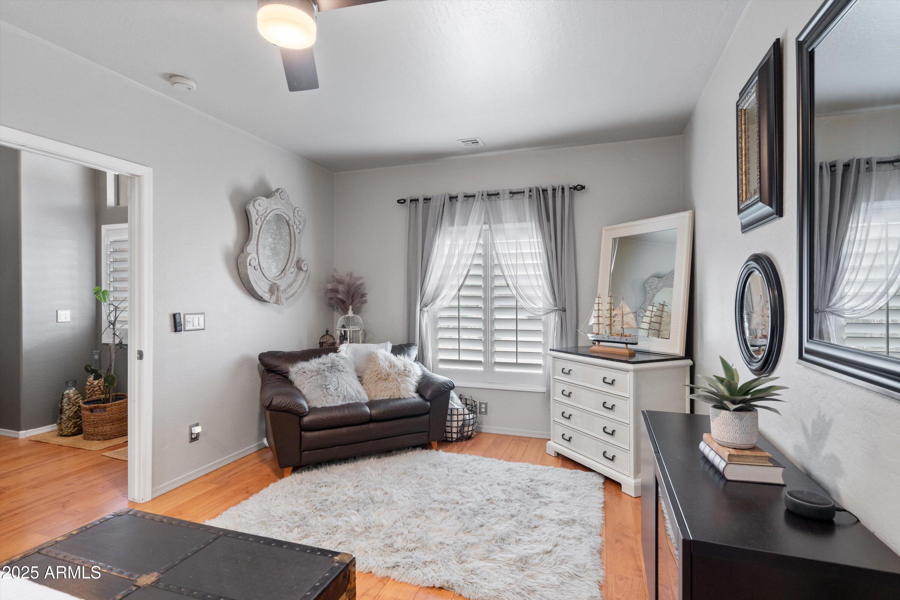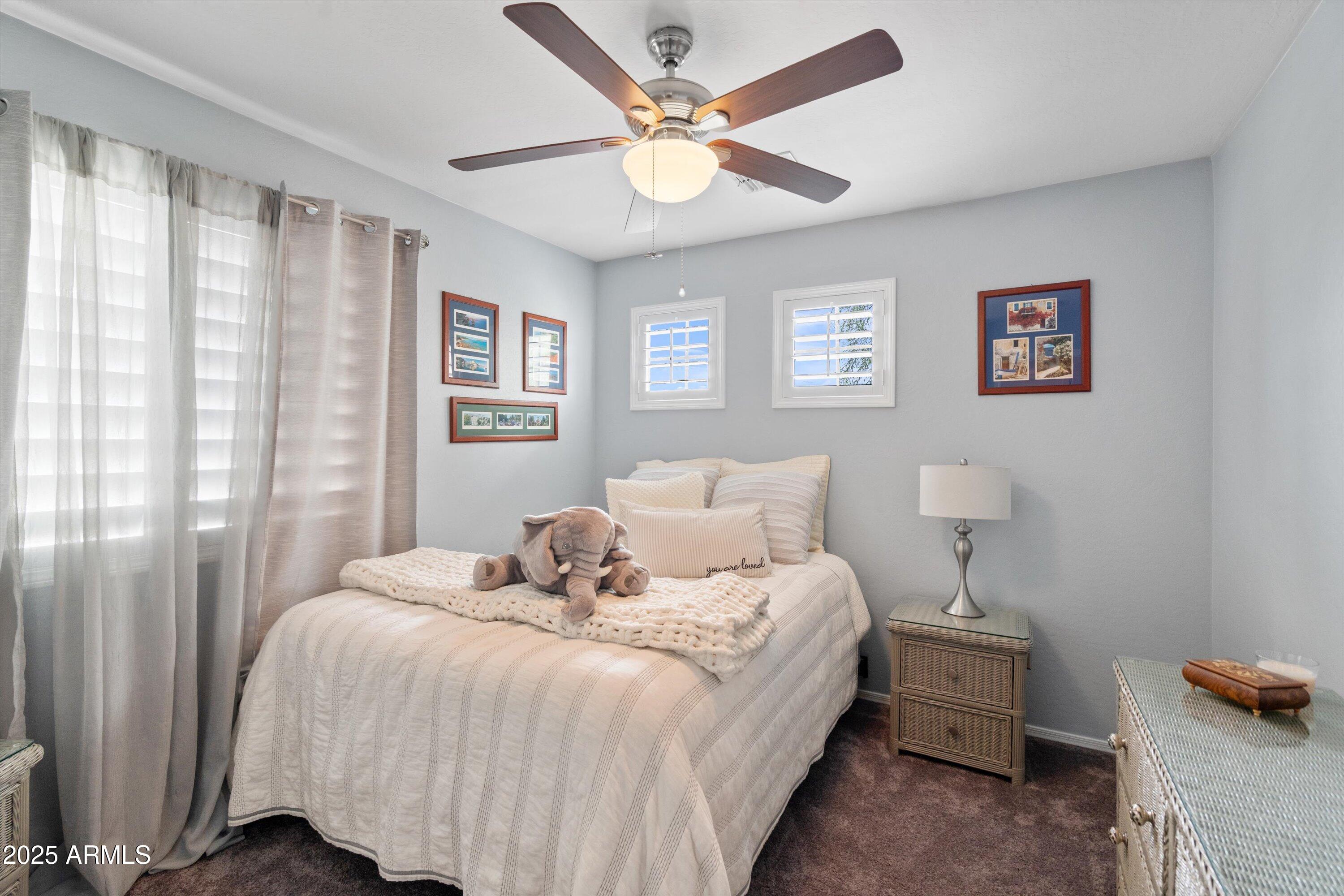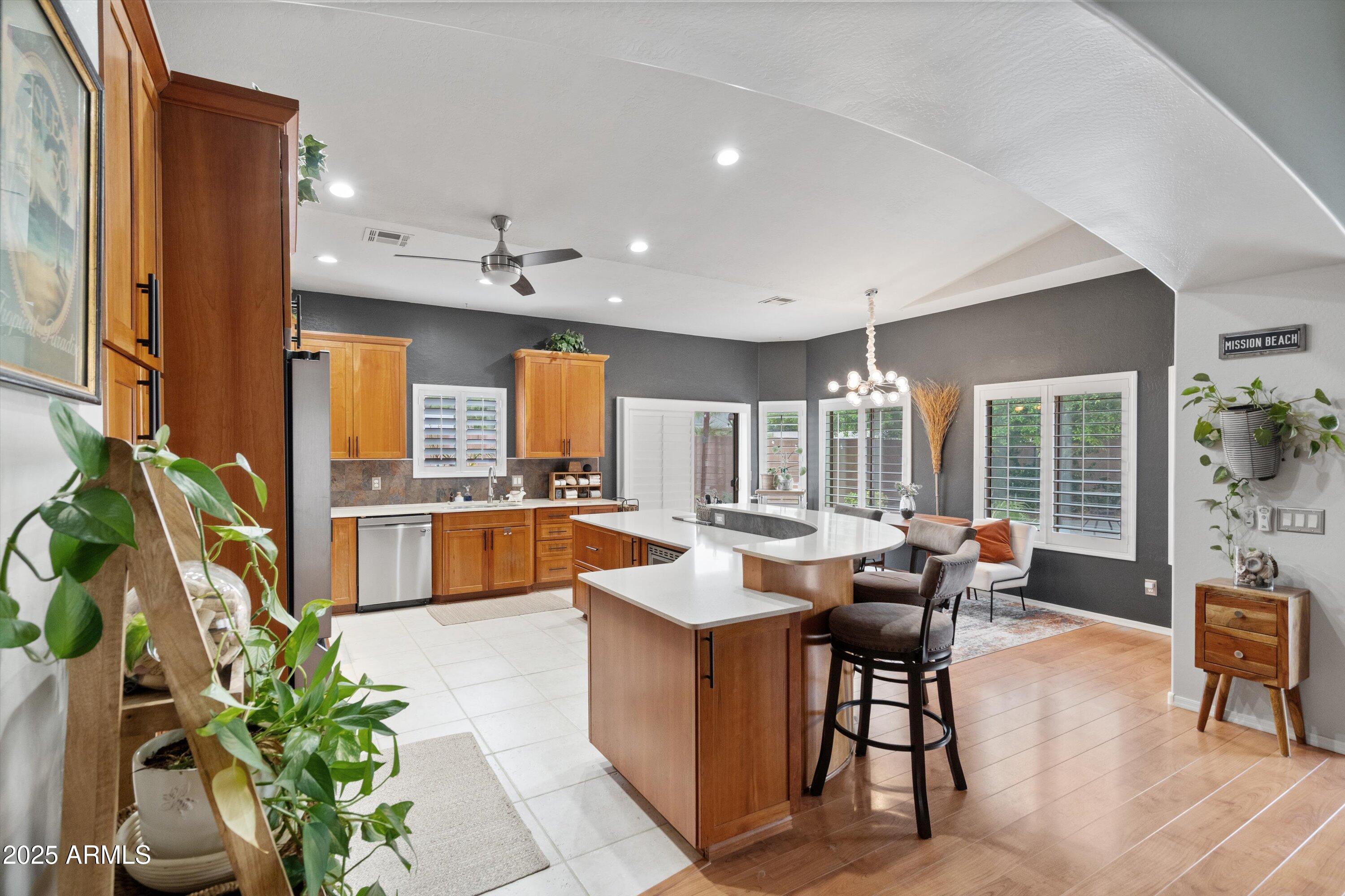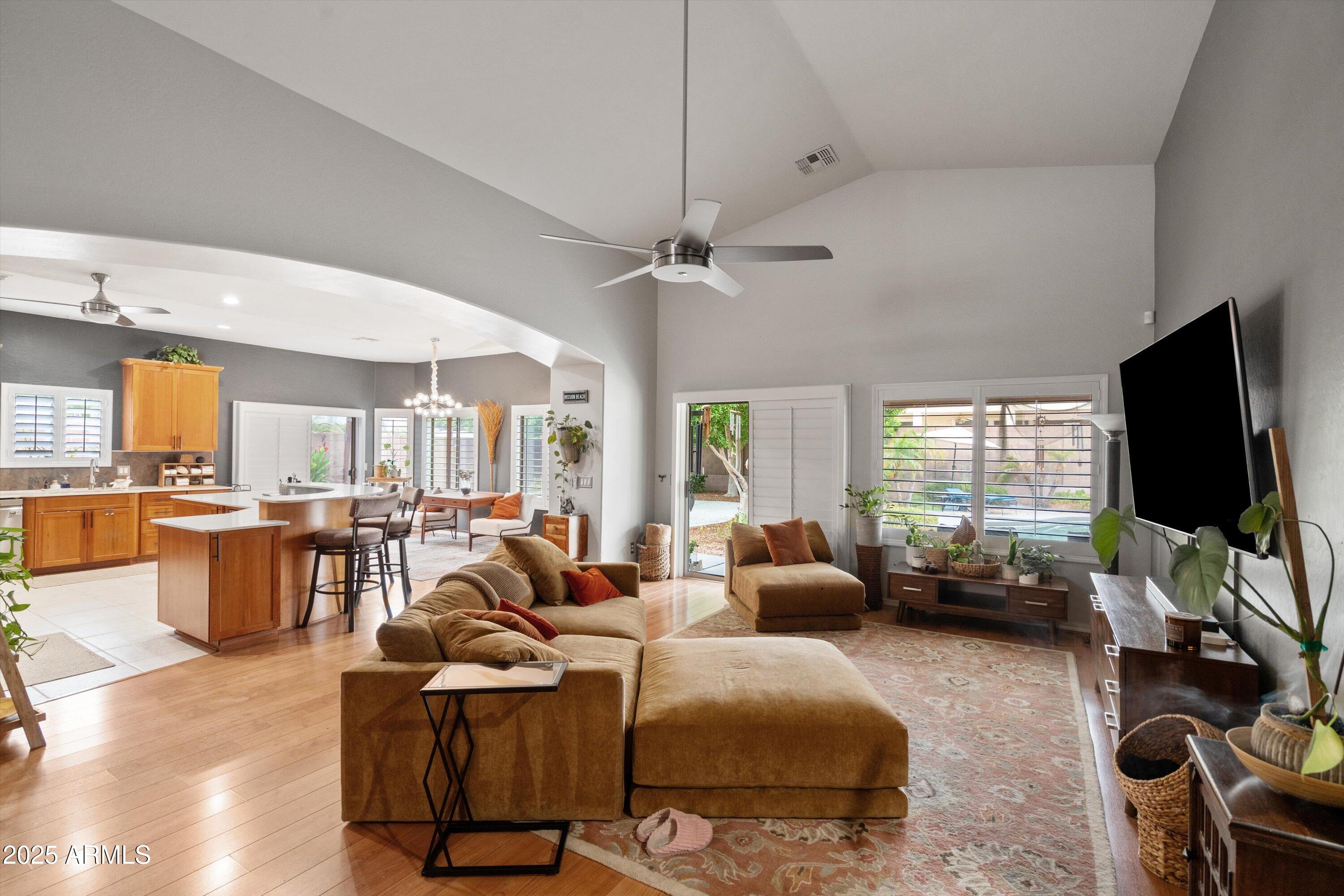 This 4-bedroom beauty boasts 2 master suites downstairs and 3.5 baths, with upgrades everywhere you look! Gorgeous tile and laminate flooring flow through the main living areas, accented by vaulted ceilings and wood shutters for a bright, open feel. The stunning kitchen features Silestone counters, stainless steel appliances, ample cabinetry, and a large breakfast bar. Step outside to your private oasis--an oversized backyard with a sparkling pool, multi-colored lighting, and a shaded retreat beneath a weeping willow tree and herb garden. Extras include a solar system (2 years left on lease), water softener, attic air purifier, and garage storage. Prime location near the I-10, 101, 303, and Luke AFB!