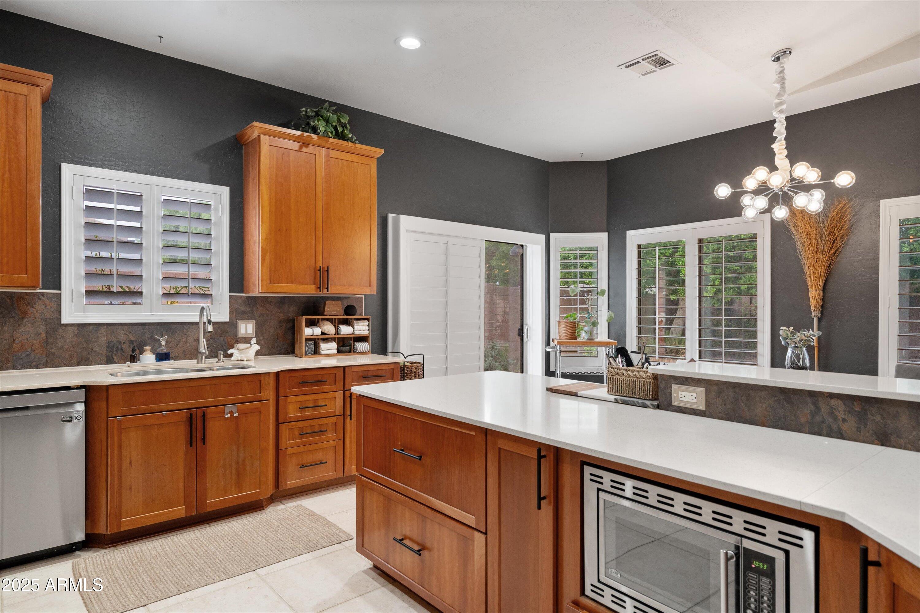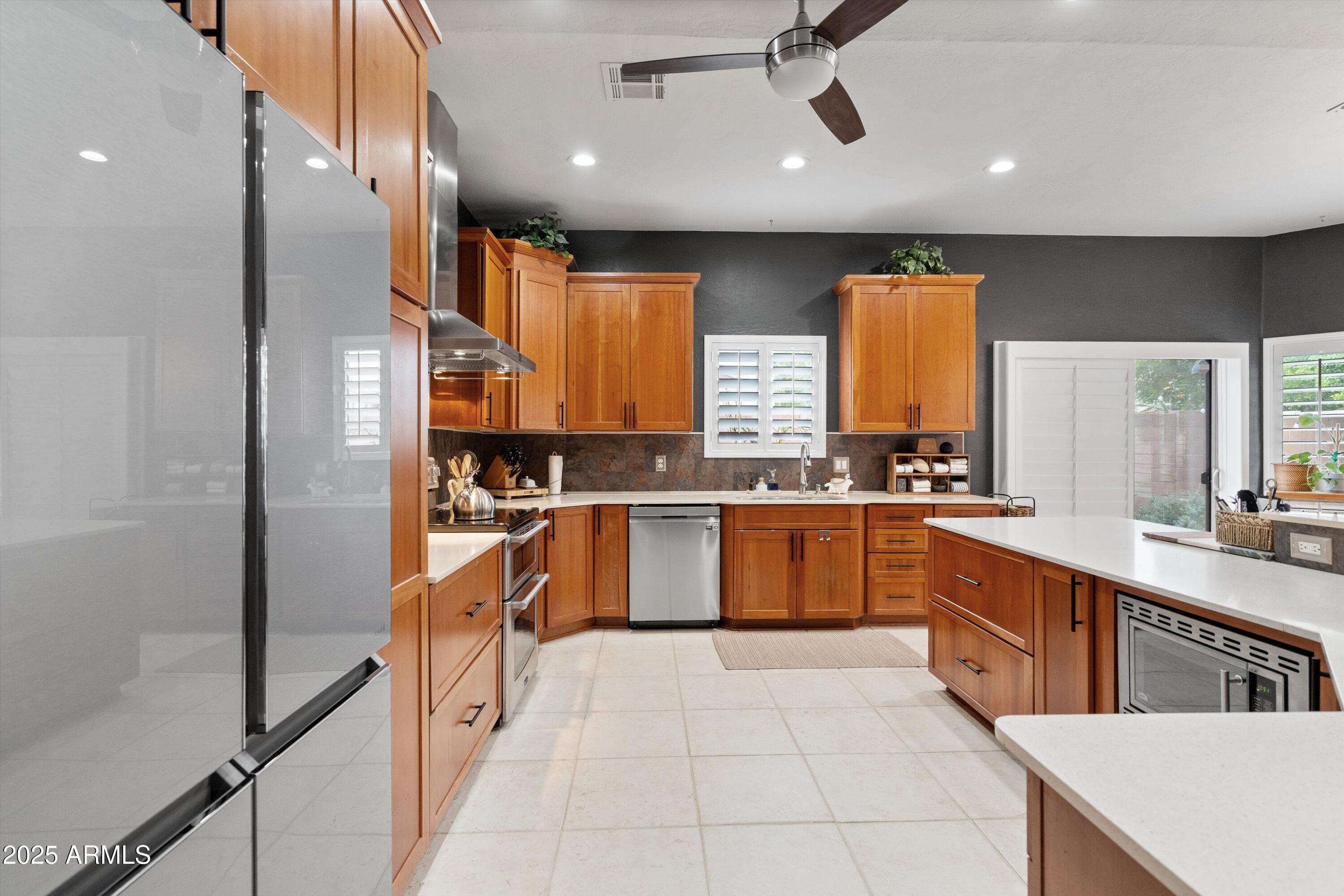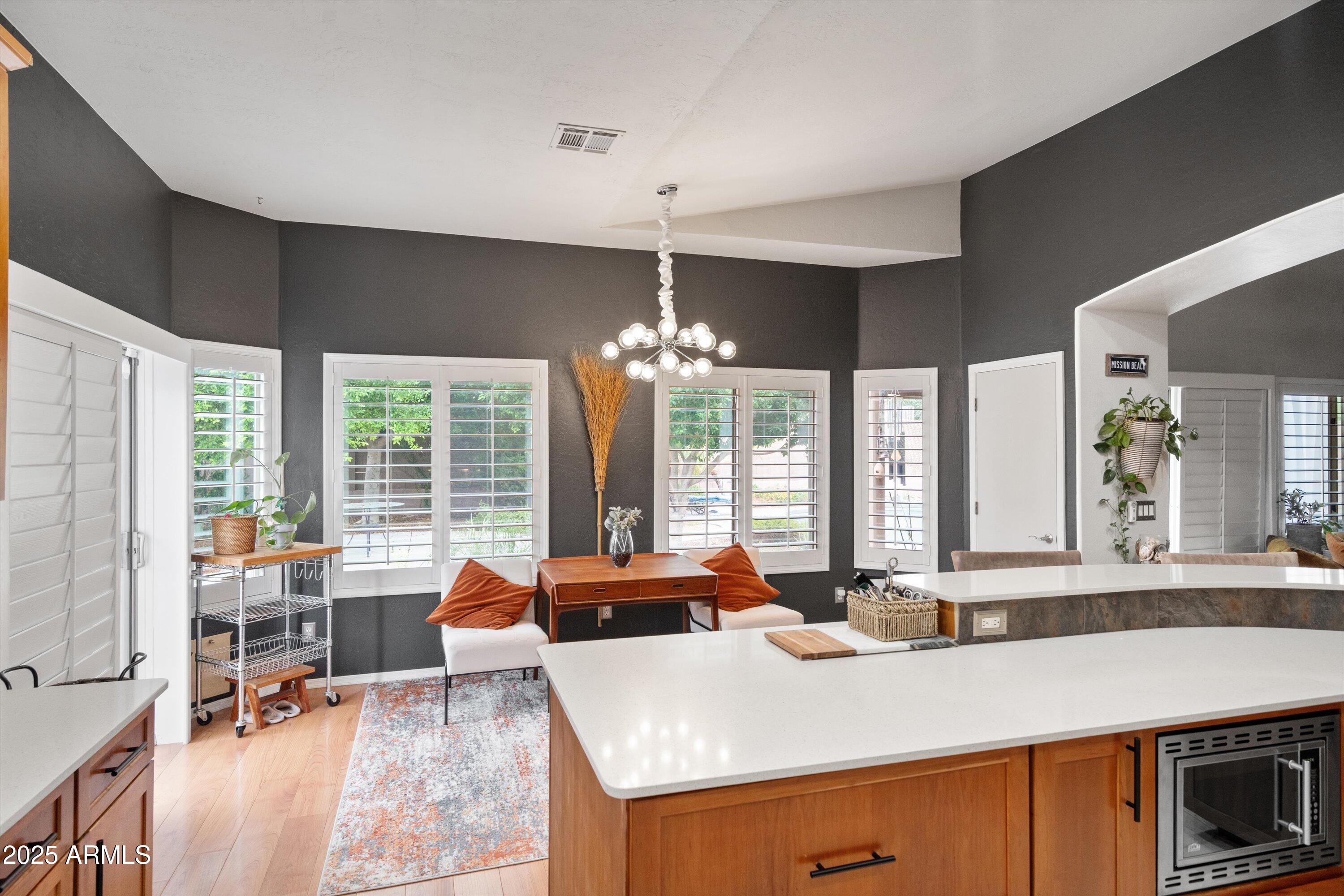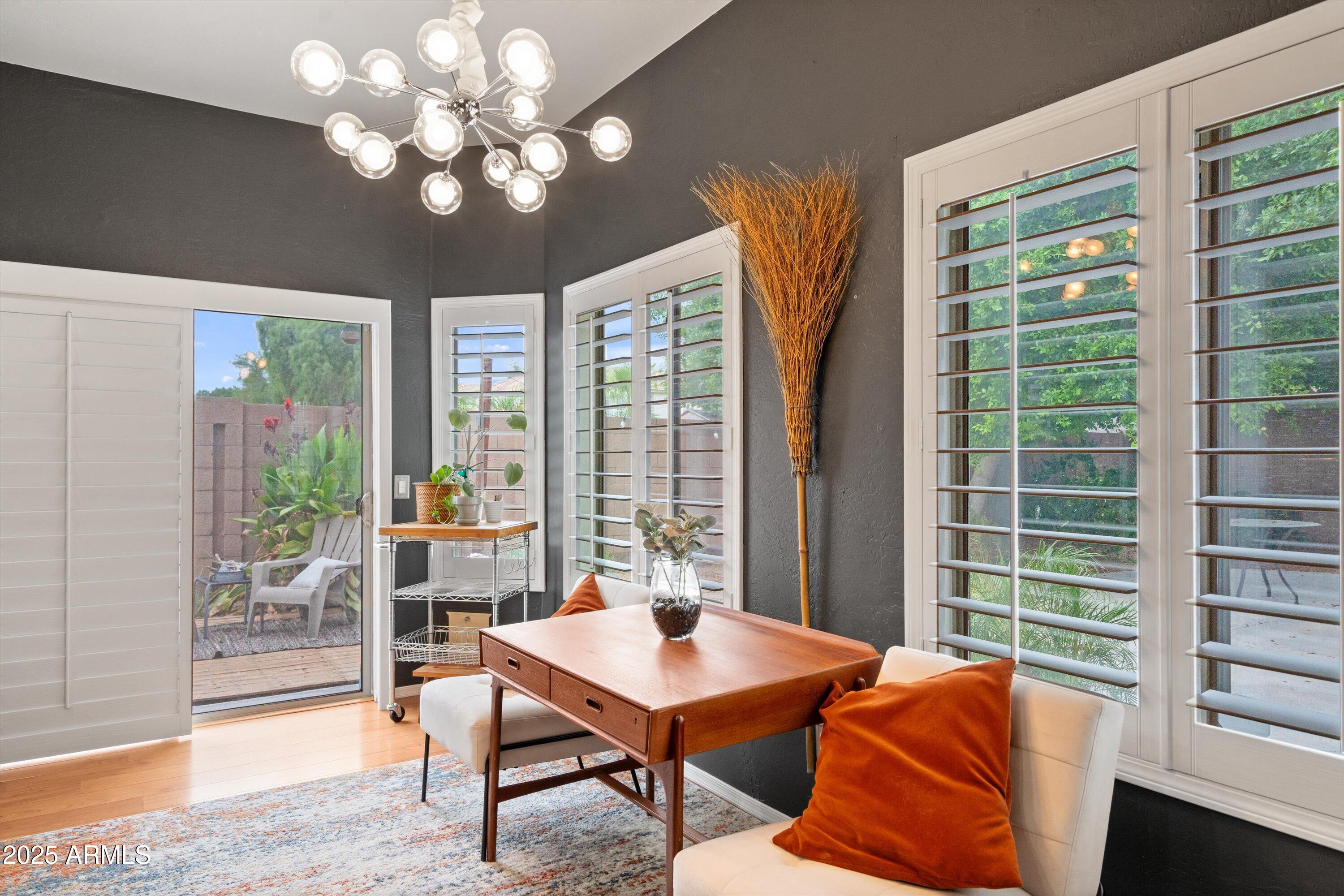 This 4-bedroom beauty boasts 2 master suites downstairs and 3.5 baths, with upgrades everywhere you look! Gorgeous tile and laminate flooring flow through the main living areas, accented by vaulted ceilings and wood shutters for a bright, open feel. The stunning kitchen features Silestone counters, stainless steel appliances, ample cabinetry, and a large breakfast bar. Step outside to your private oasis--an oversized backyard with a sparkling pool, multi-colored lighting, and a shaded retreat beneath a weeping willow tree and herb garden. Extras include a solar system (2 years left on lease), water softener, attic air purifier, and garage storage. Prime location near the I-10, 101, 303, and Luke AFB!