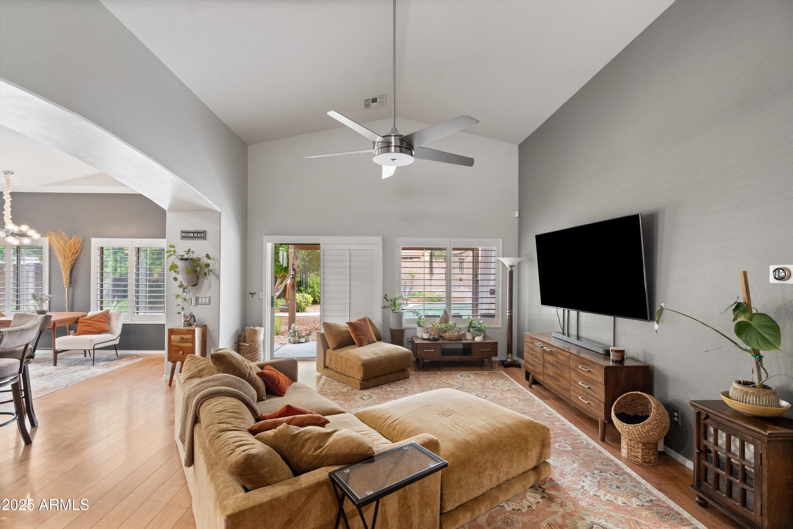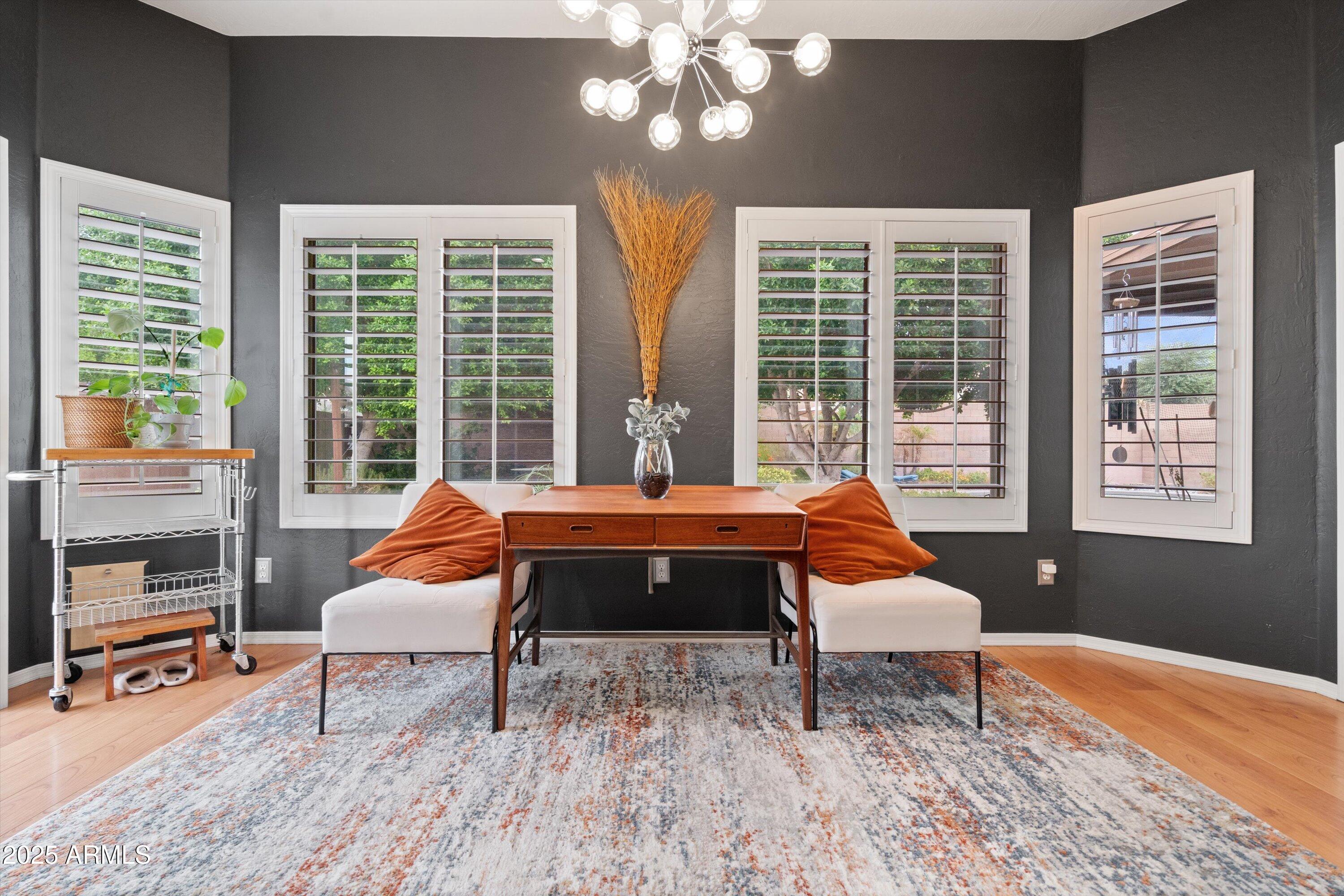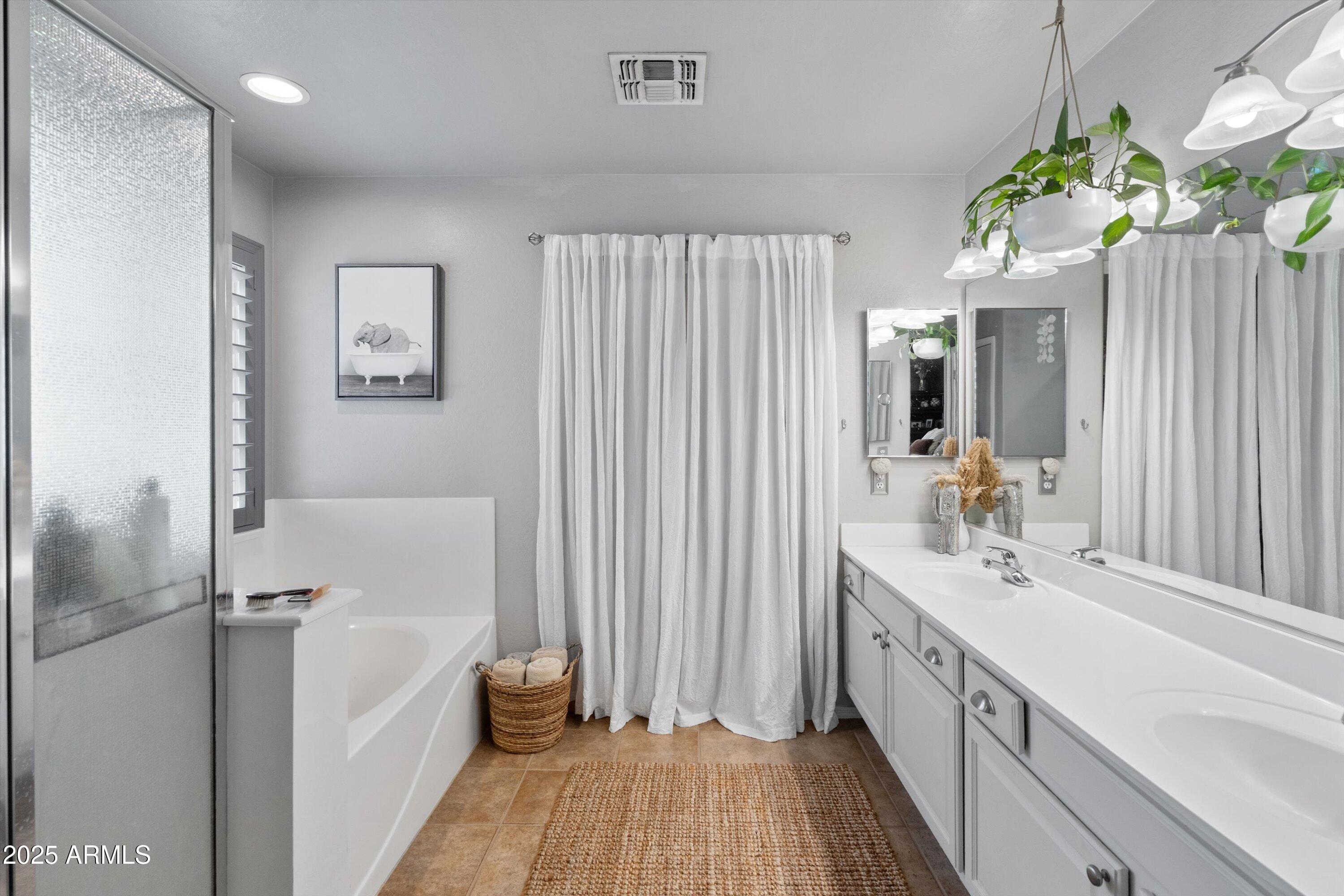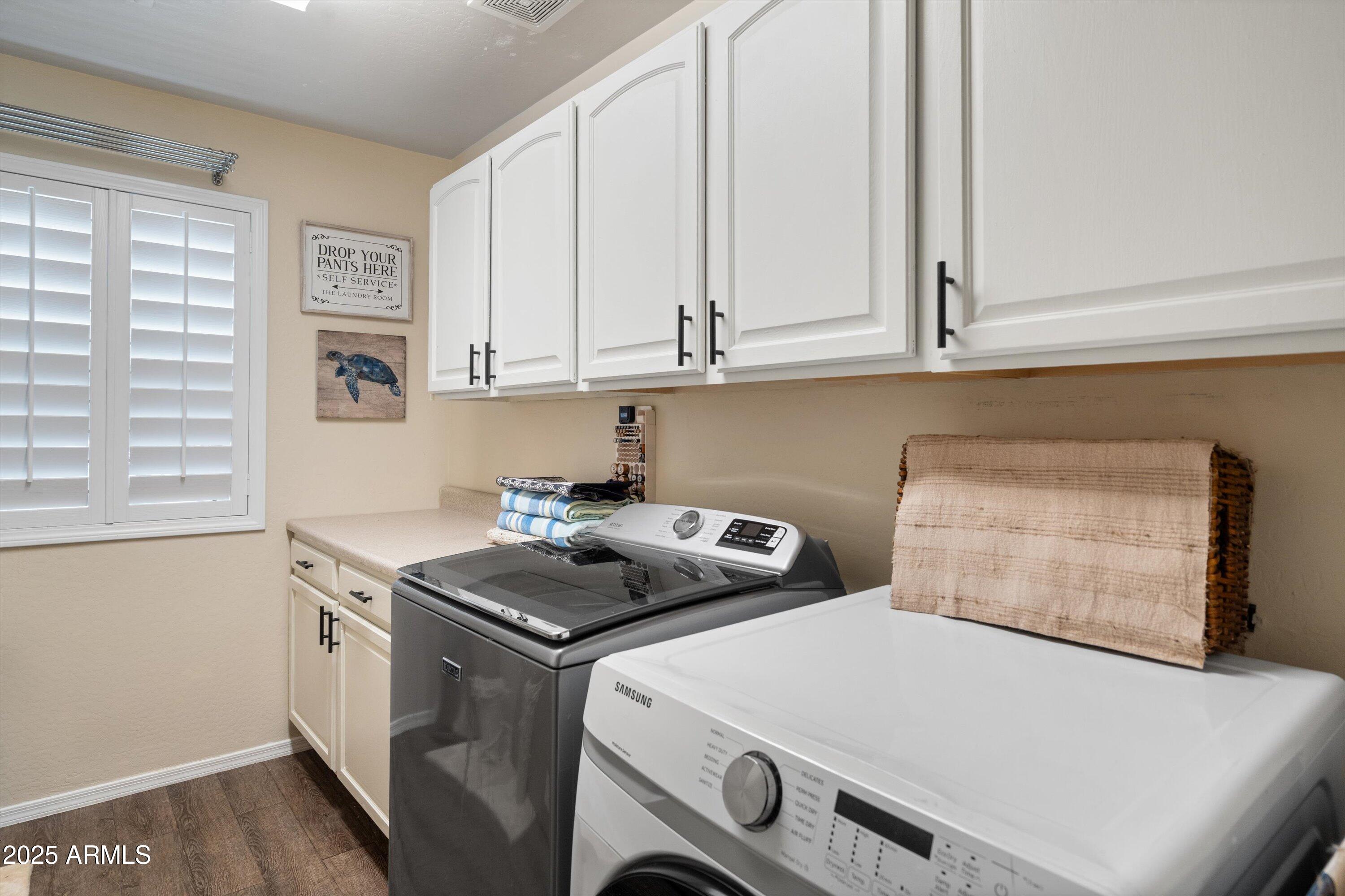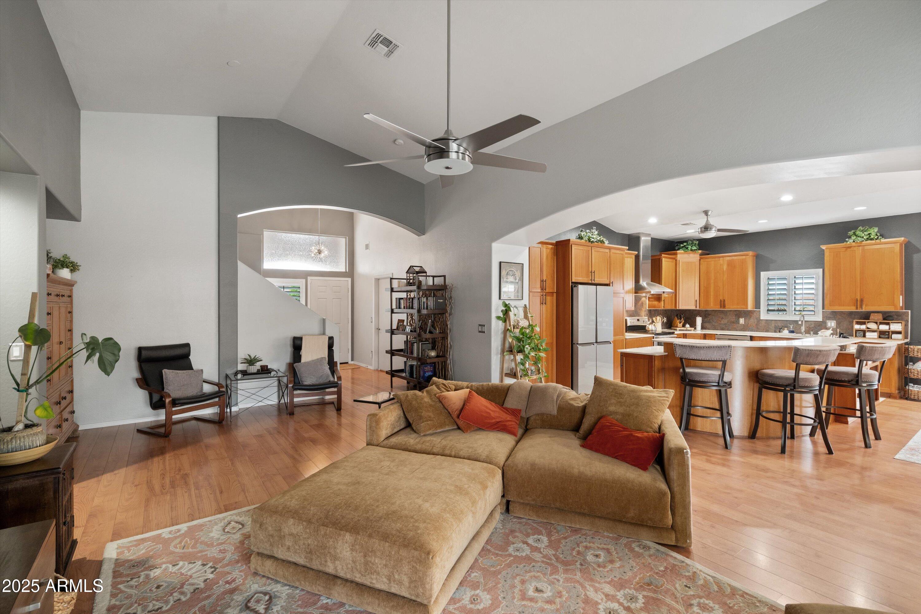 This 4-bedroom beauty boasts 2 master suites downstairs and 3.5 baths, with upgrades everywhere you look! Gorgeous tile and laminate flooring flow through the main living areas, accented by vaulted ceilings and wood shutters for a bright, open feel. The stunning kitchen features Silestone counters, stainless steel appliances, ample cabinetry, and a large breakfast bar. Step outside to your private oasis--an oversized backyard with a sparkling pool, multi-colored lighting, and a shaded retreat beneath a weeping willow tree and herb garden. Extras include a solar system (2 years left on lease), water softener, attic air purifier, and garage storage. Prime location near the I-10, 101, 303, and Luke AFB!