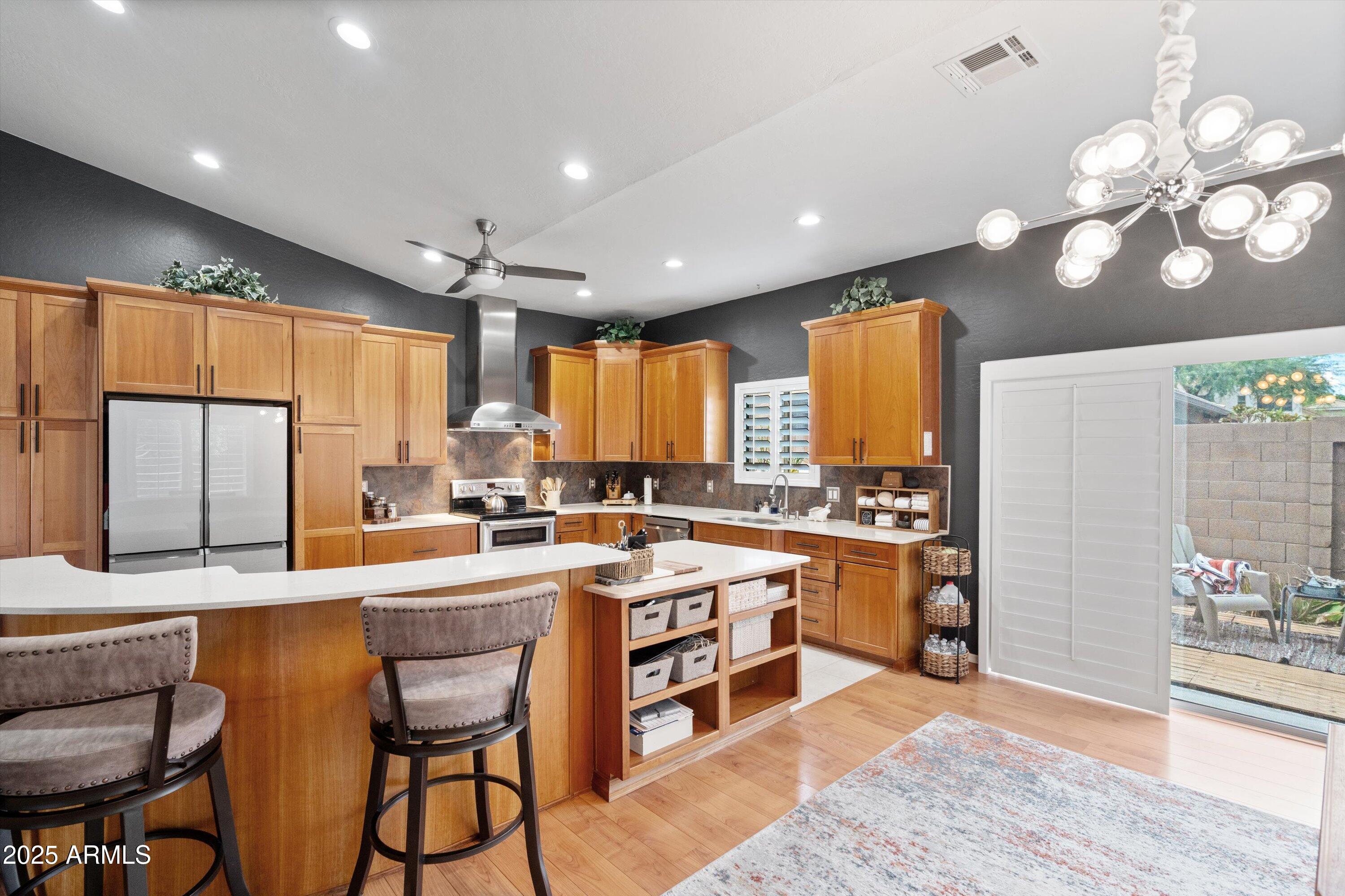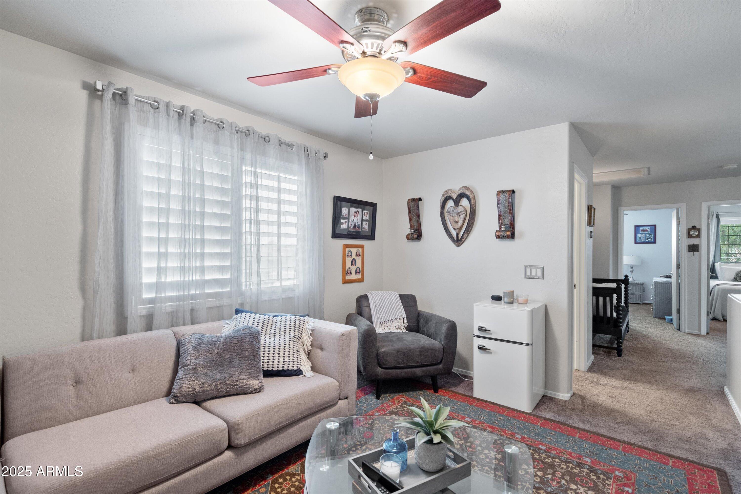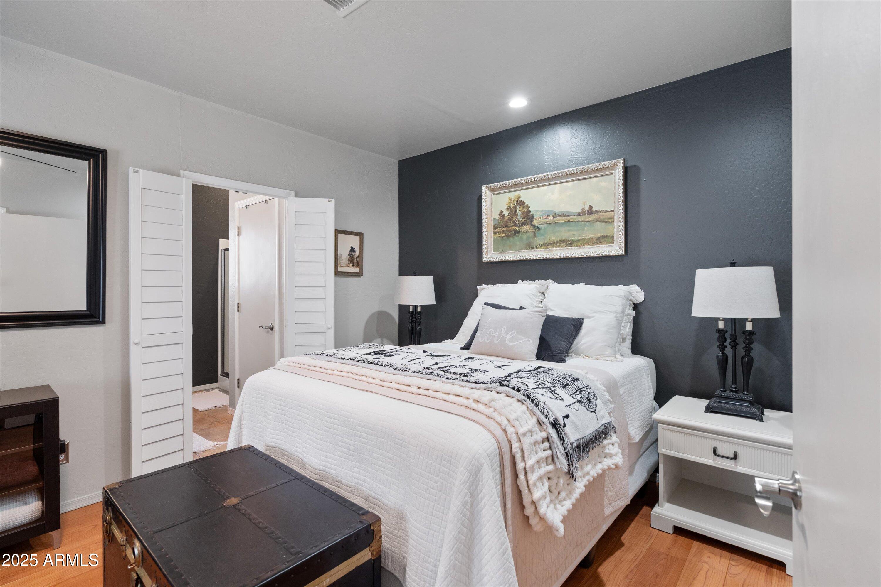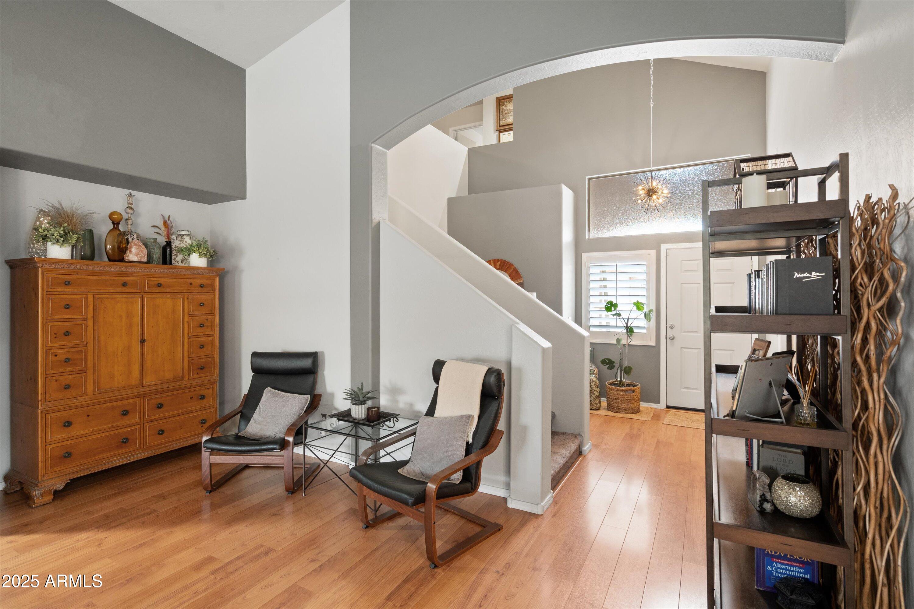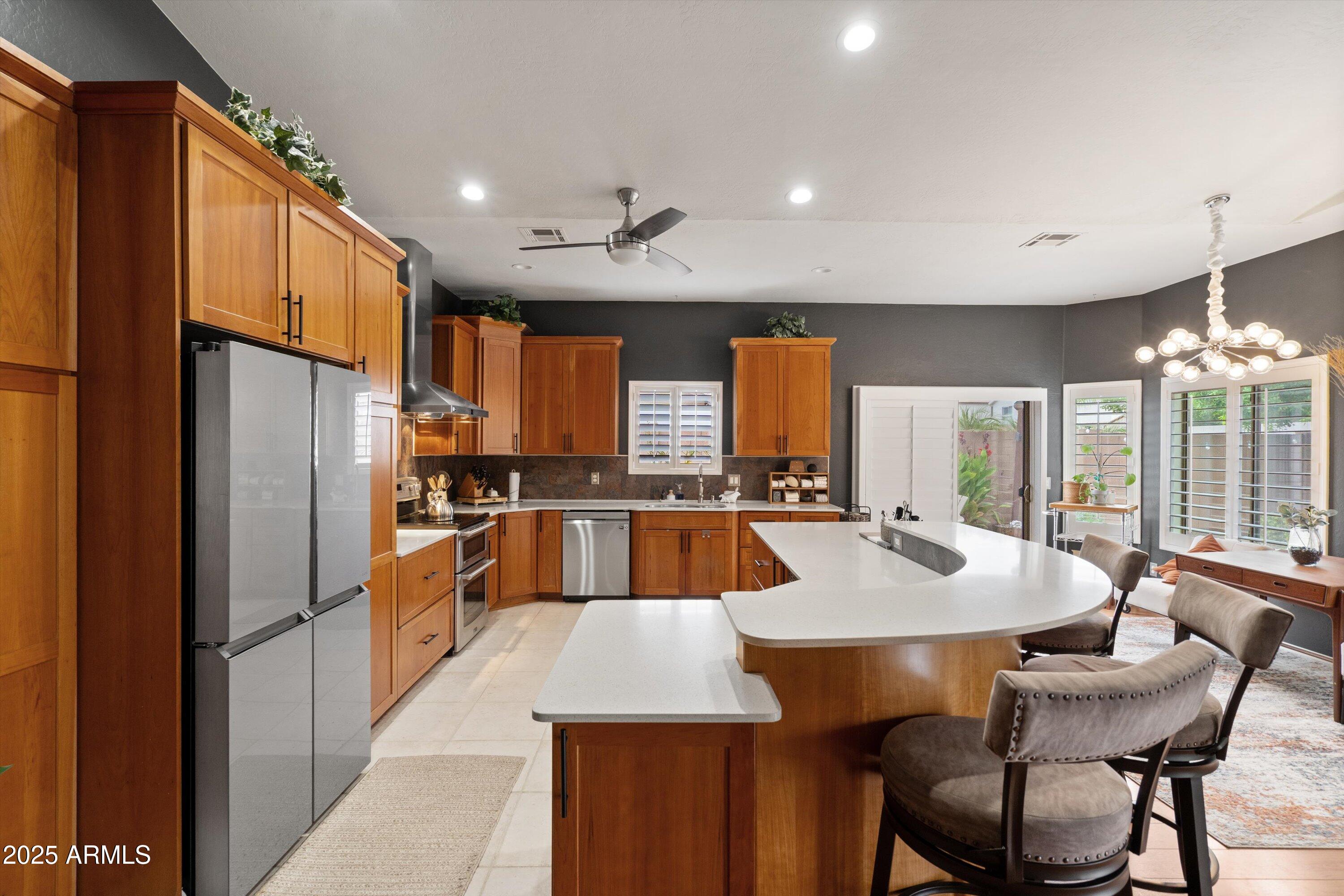 This 4-bedroom beauty boasts 2 master suites downstairs and 3.5 baths, with upgrades everywhere you look! Gorgeous tile and laminate flooring flow through the main living areas, accented by vaulted ceilings and wood shutters for a bright, open feel. The stunning kitchen features Silestone counters, stainless steel appliances, ample cabinetry, and a large breakfast bar. Step outside to your private oasis--an oversized backyard with a sparkling pool, multi-colored lighting, and a shaded retreat beneath a weeping willow tree and herb garden. Extras include a solar system (2 years left on lease), water softener, attic air purifier, and garage storage. Prime location near the I-10, 101, 303, and Luke AFB!