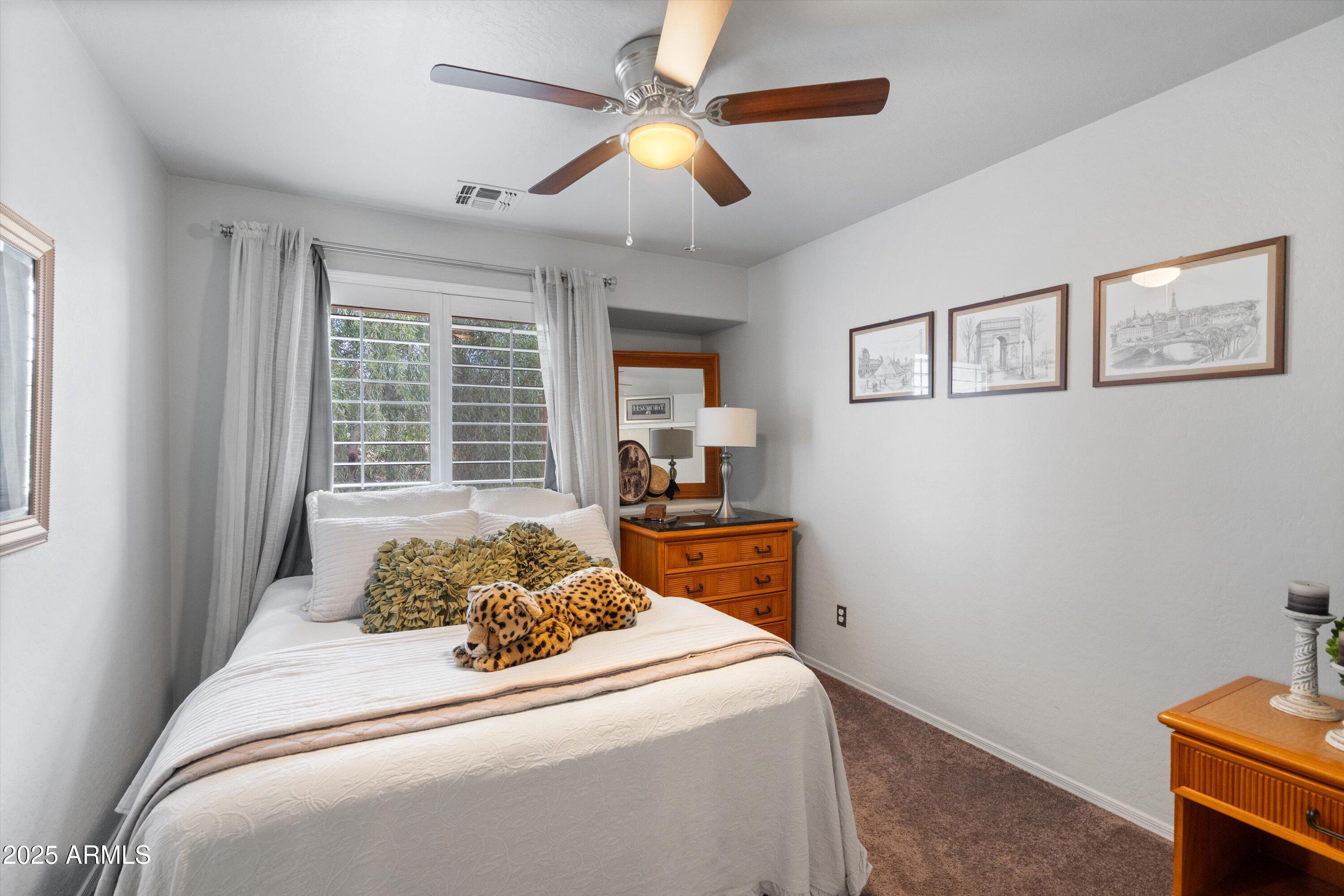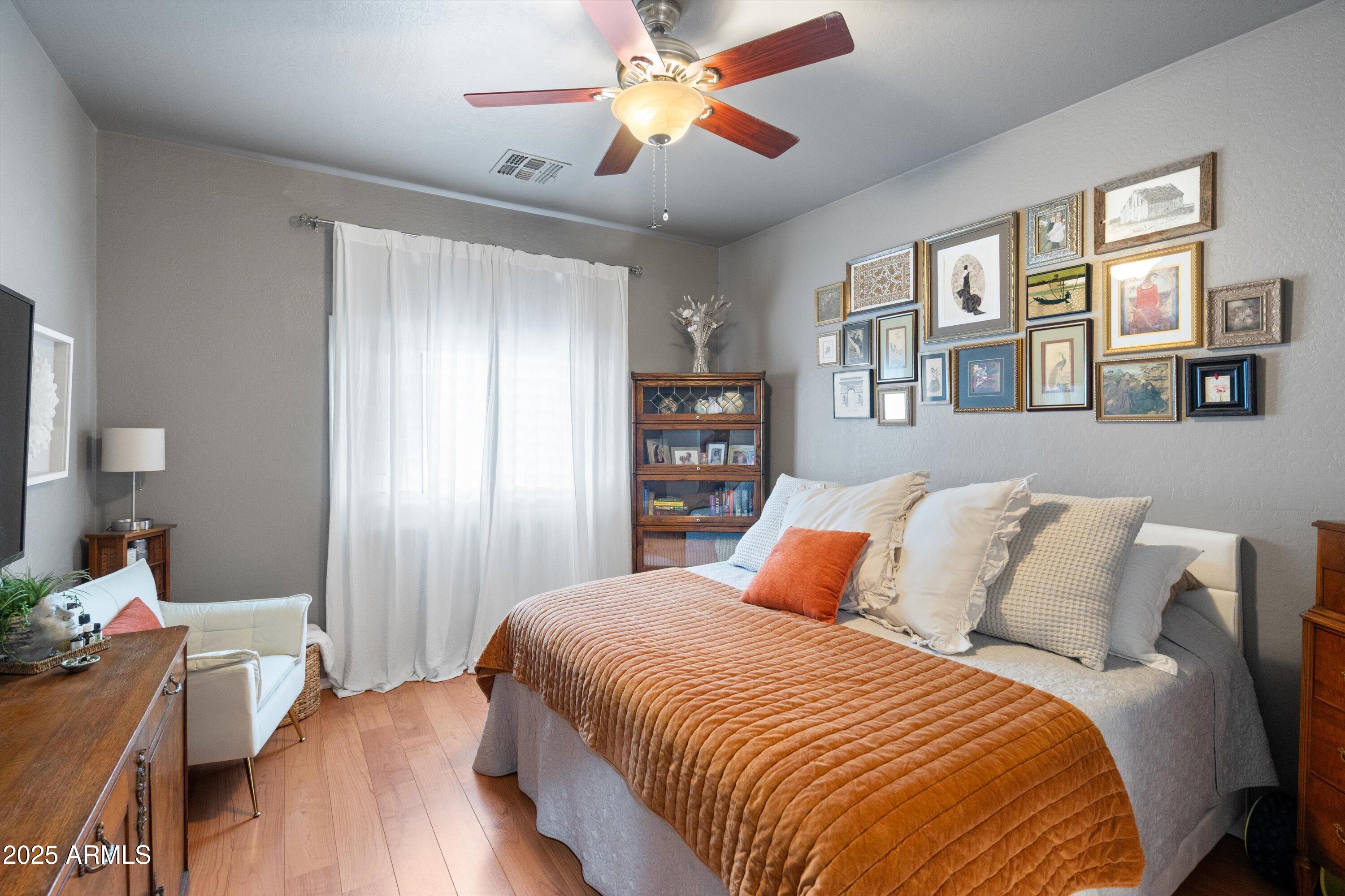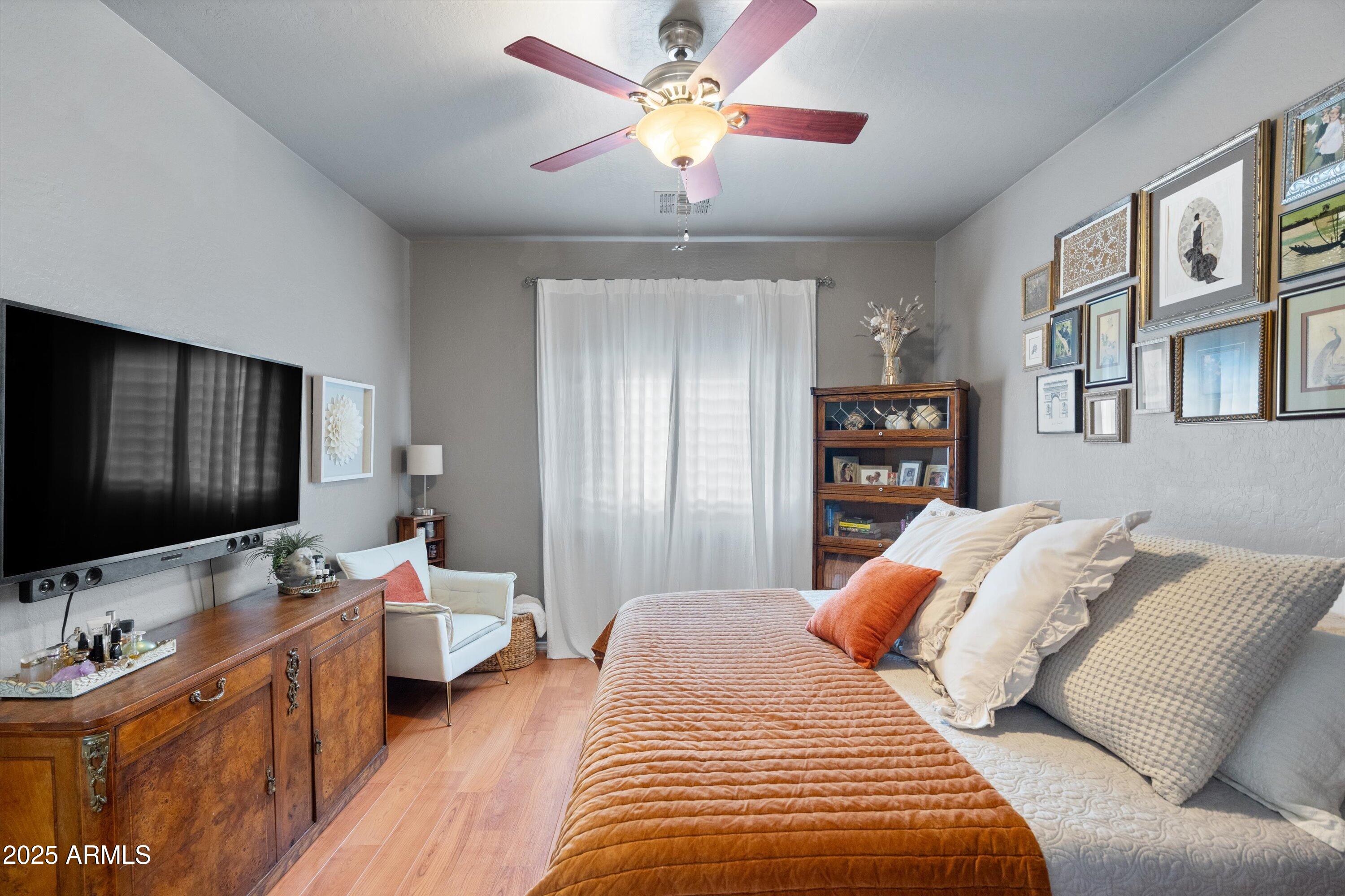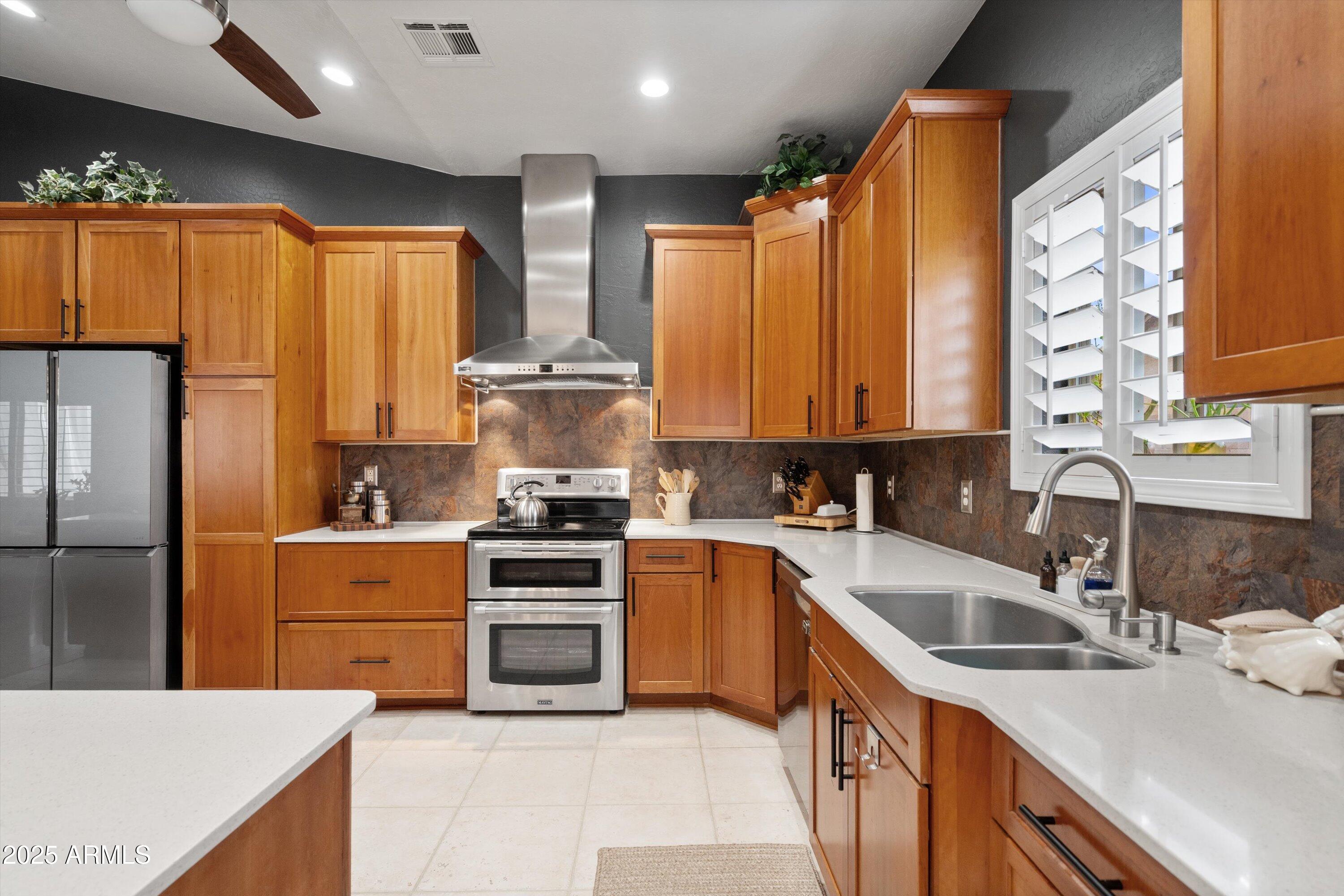 This 4-bedroom beauty boasts 2 master suites downstairs and 3.5 baths, with upgrades everywhere you look! Gorgeous tile and laminate flooring flow through the main living areas, accented by vaulted ceilings and wood shutters for a bright, open feel. The stunning kitchen features Silestone counters, stainless steel appliances, ample cabinetry, and a large breakfast bar. Step outside to your private oasis--an oversized backyard with a sparkling pool, multi-colored lighting, and a shaded retreat beneath a weeping willow tree and herb garden. Extras include a solar system (2 years left on lease), water softener, attic air purifier, and garage storage. Prime location near the I-10, 101, 303, and Luke AFB!